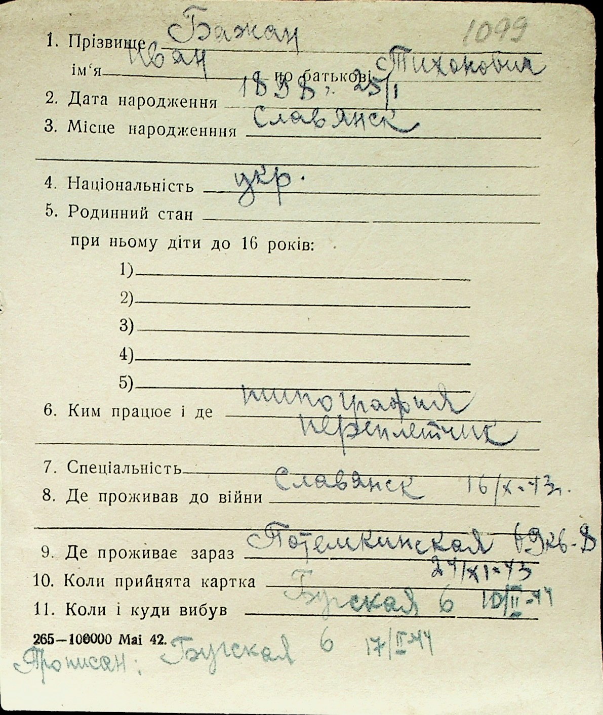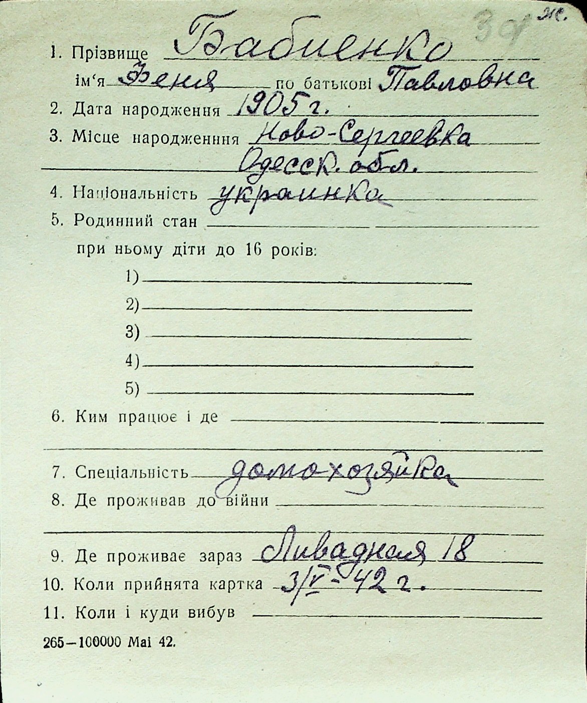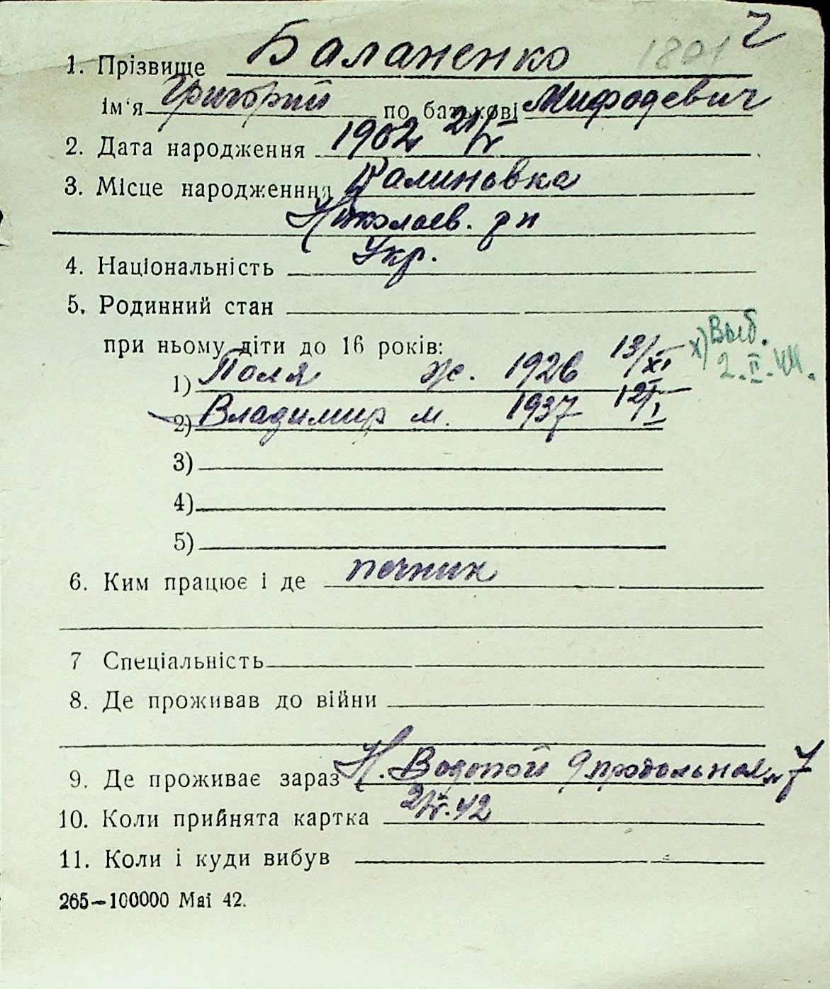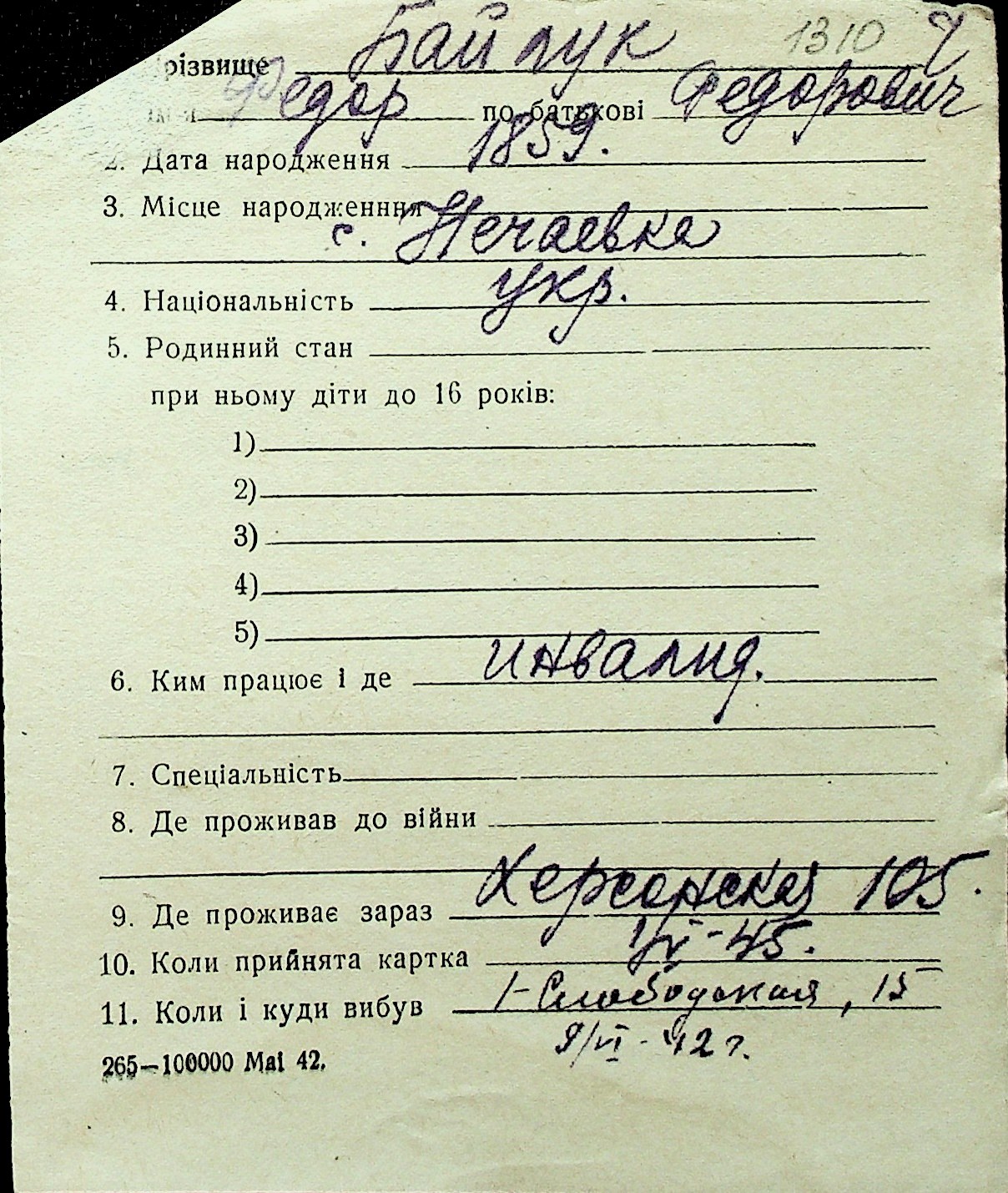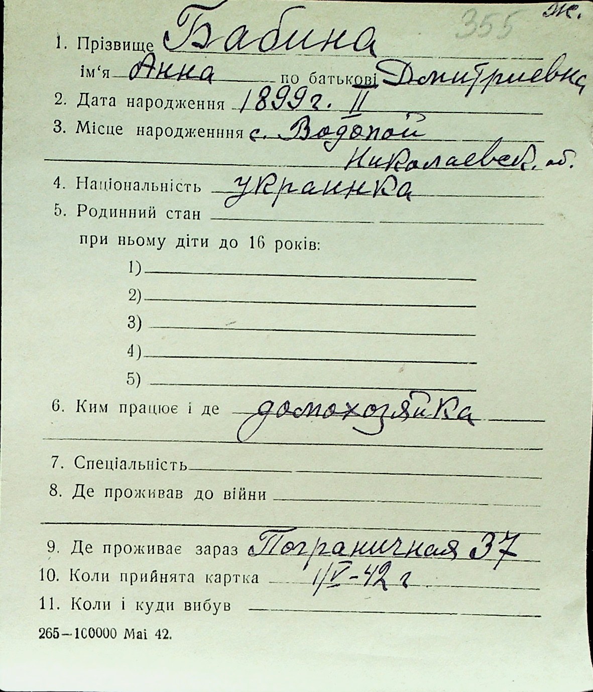 ◦ ◦ Перелік карток на осіб, які мешкали у м. Миколаїв у період окупації 1941–1944 років