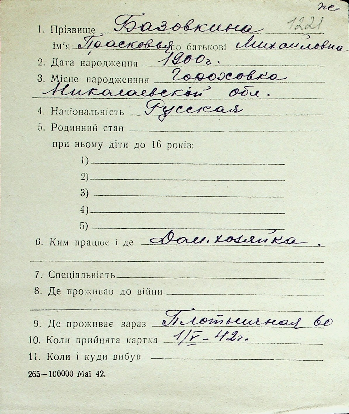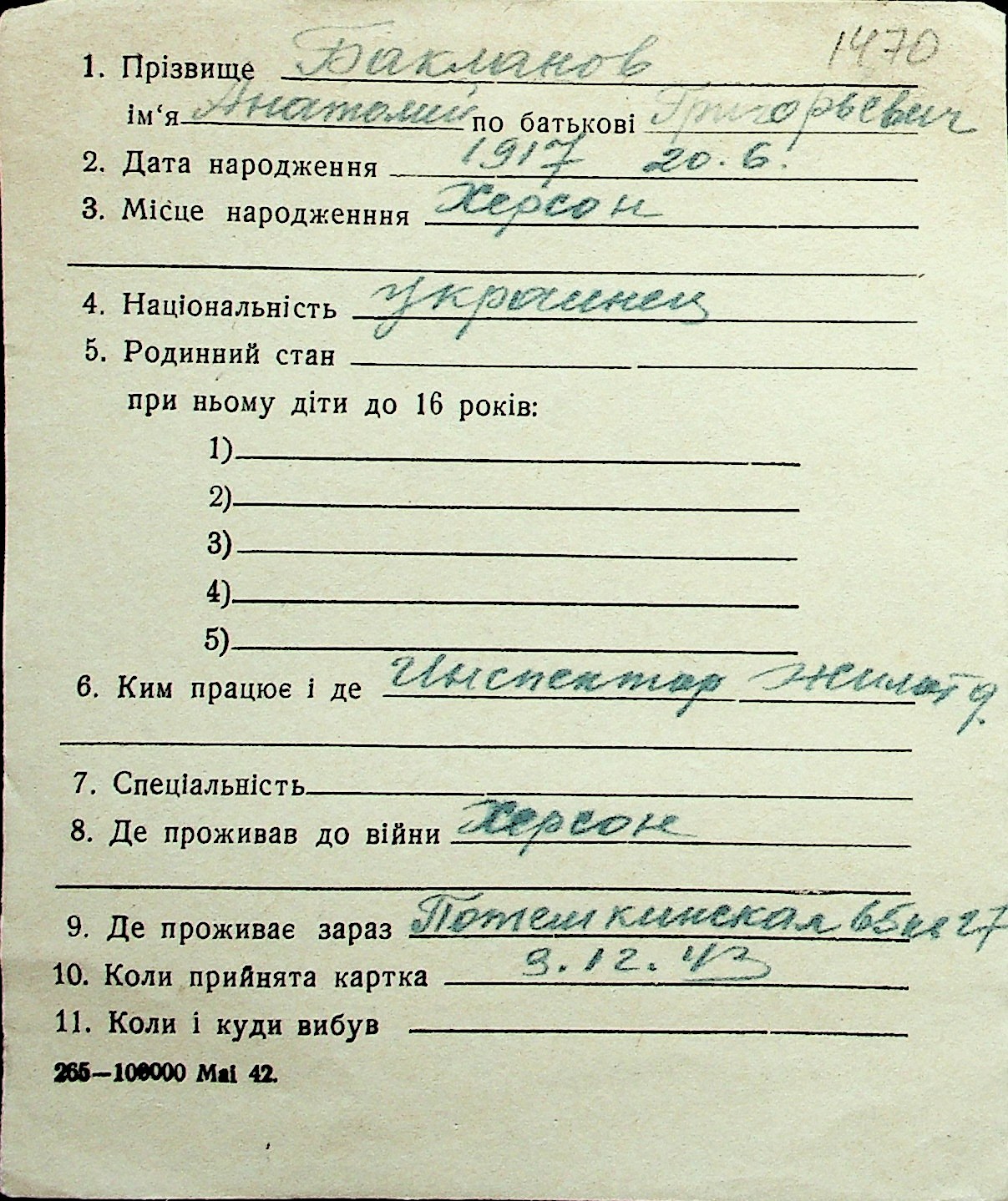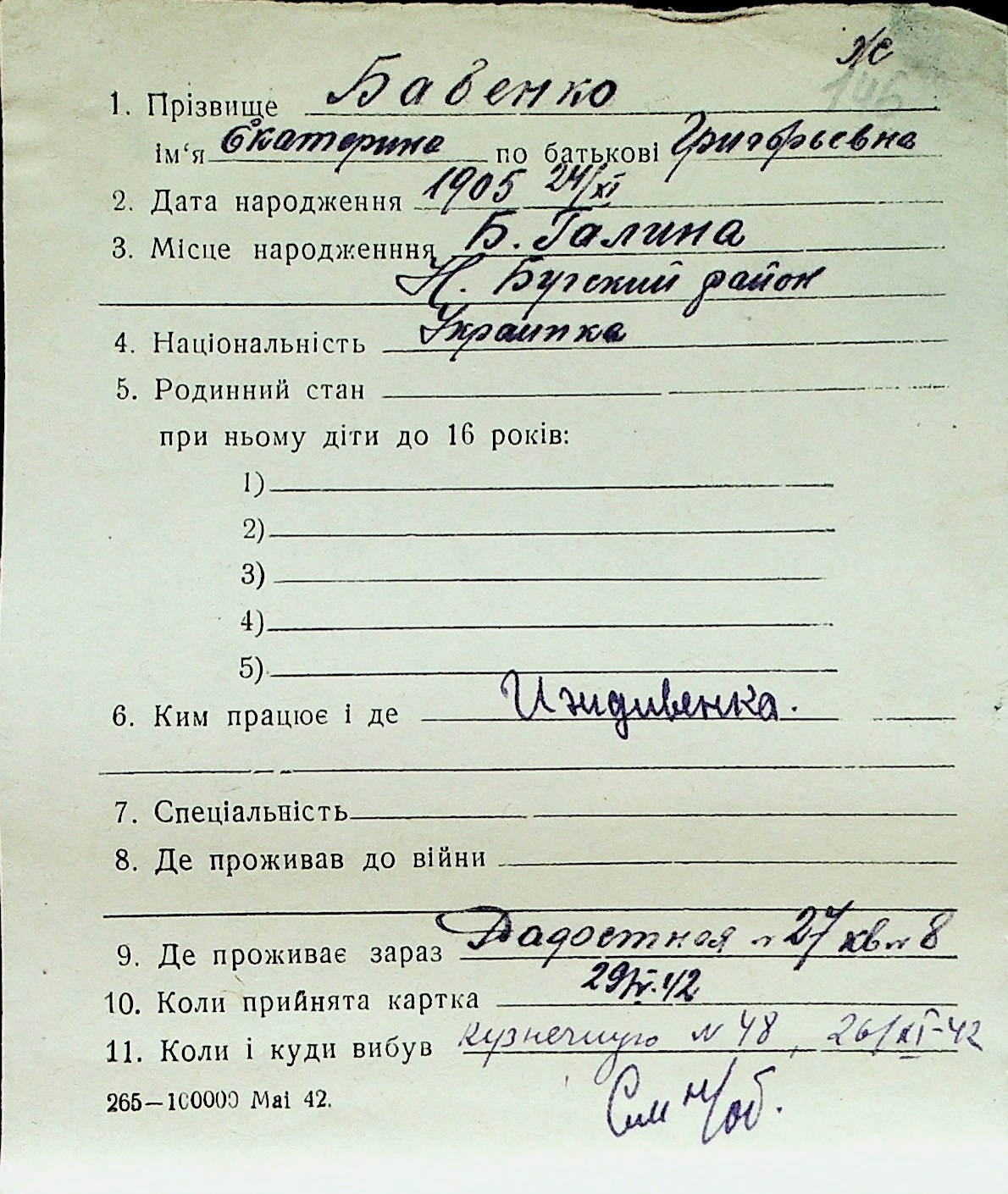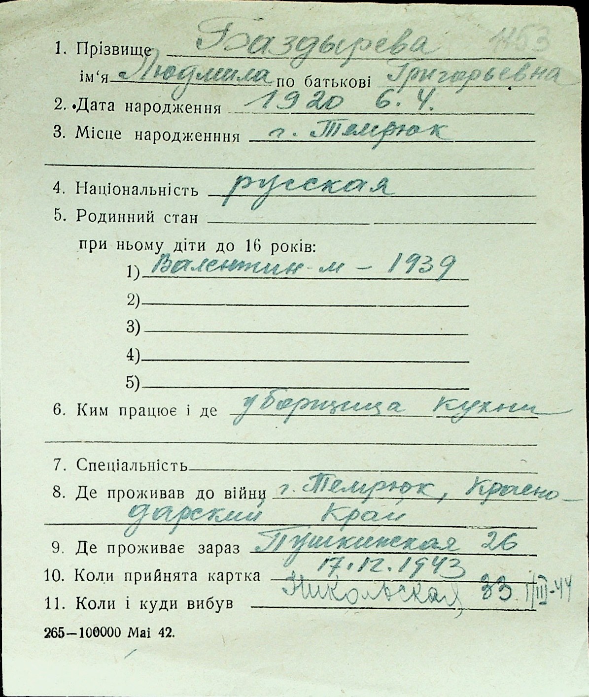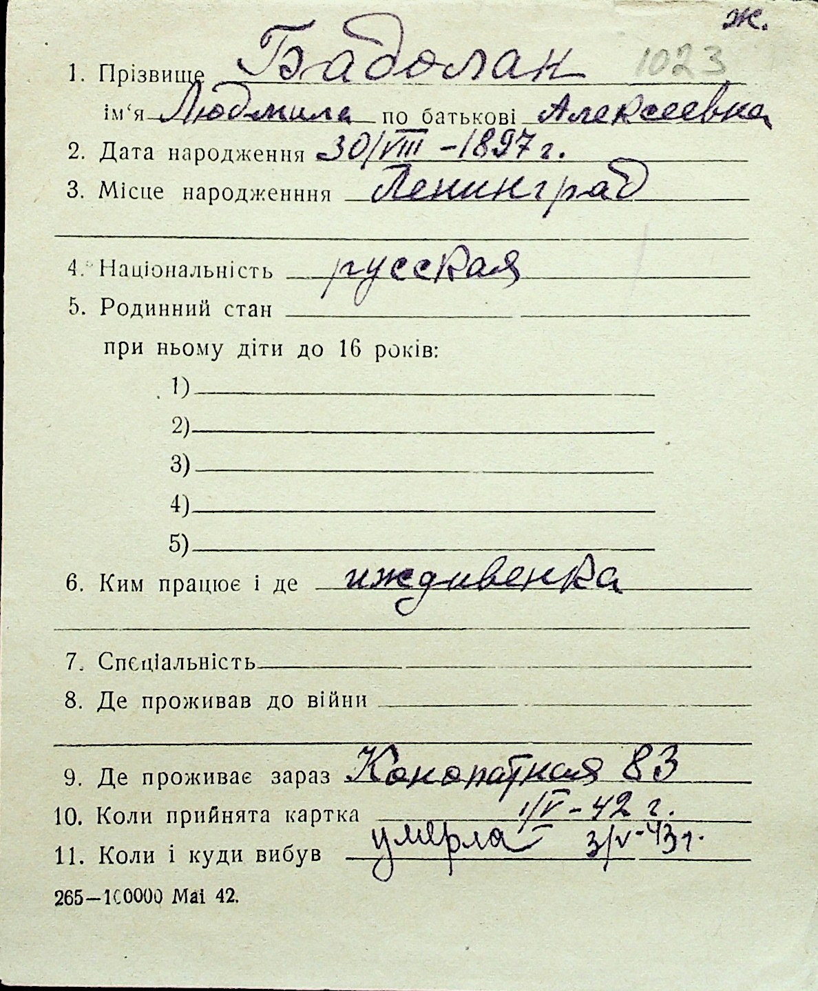 ◦ ◦ Перелік карток на осіб, які мешкали у м. Миколаїв у період окупації 1941–1944 років