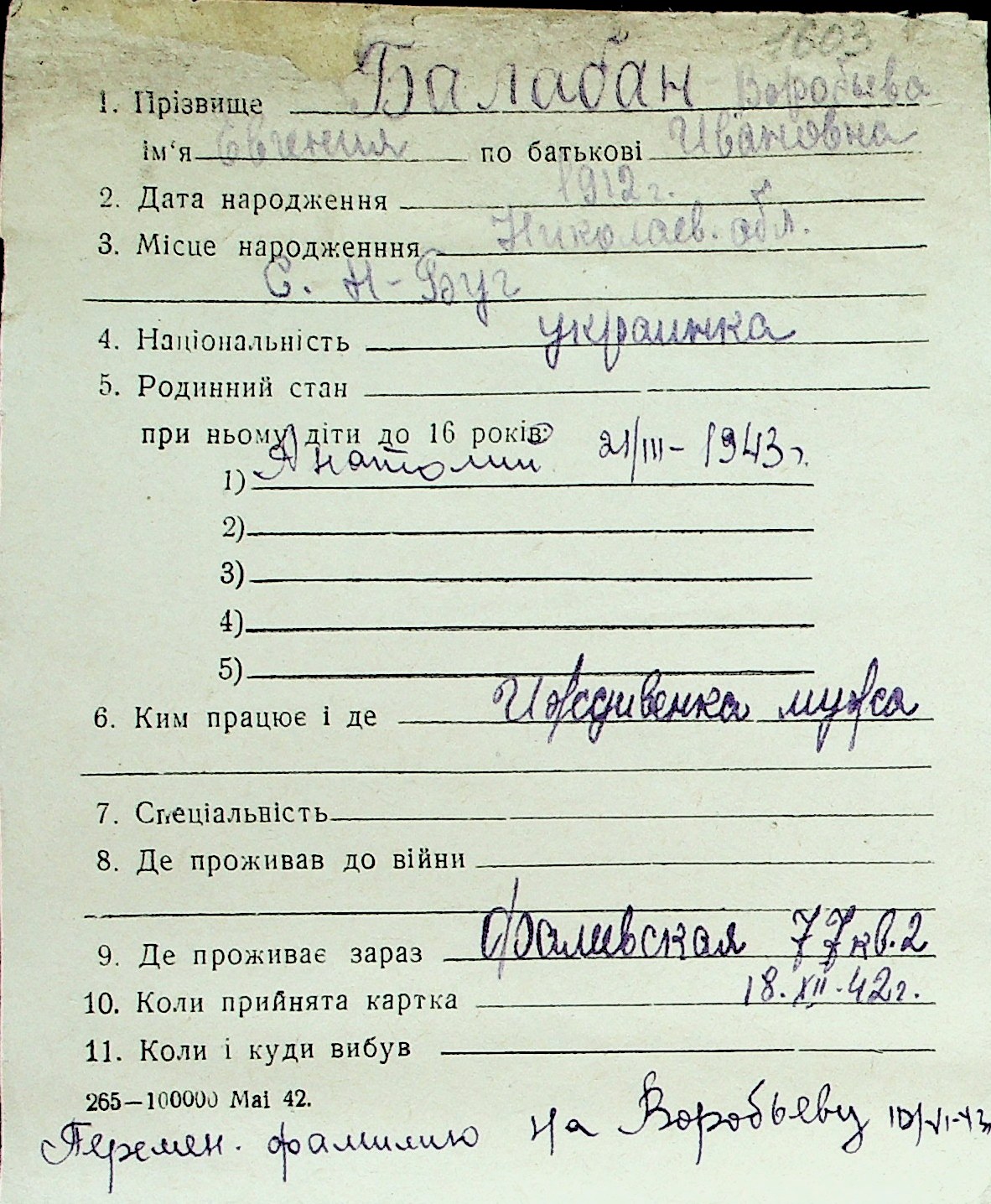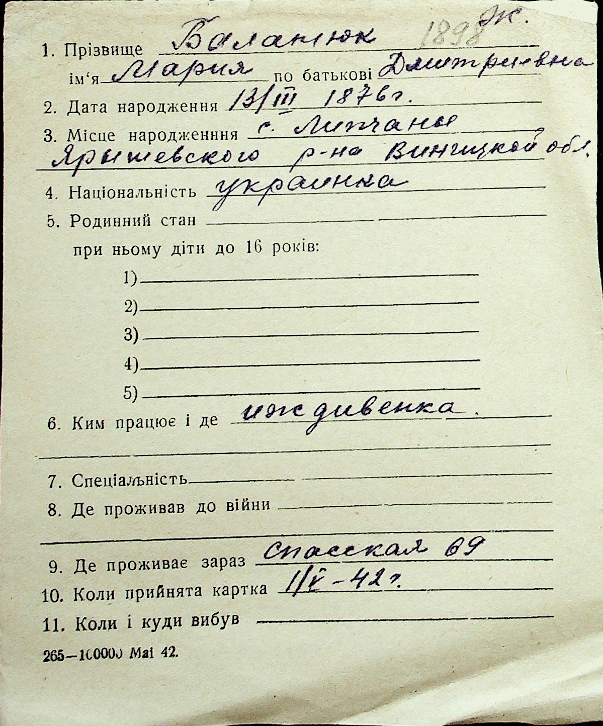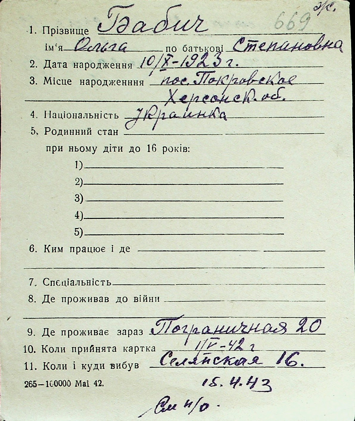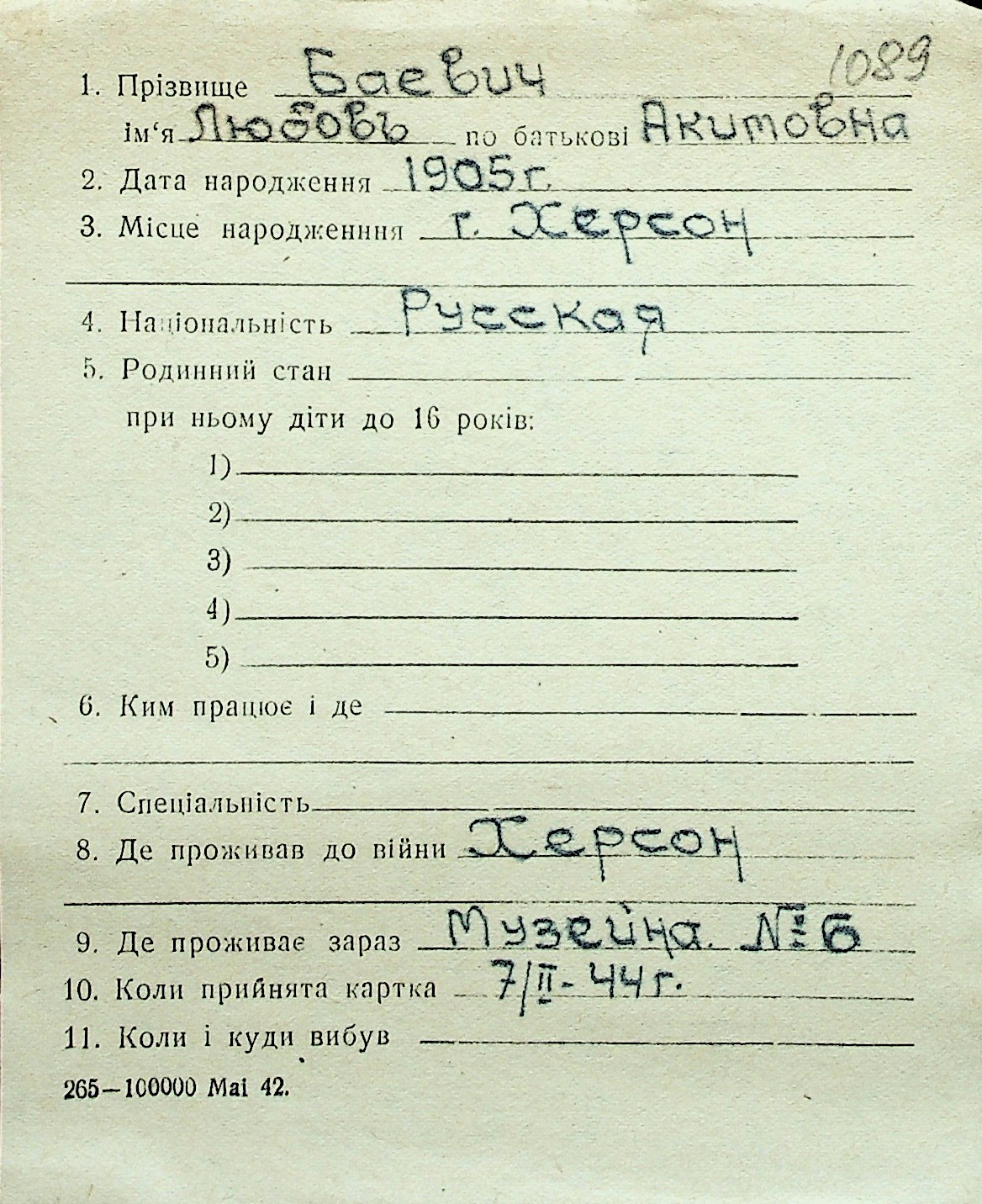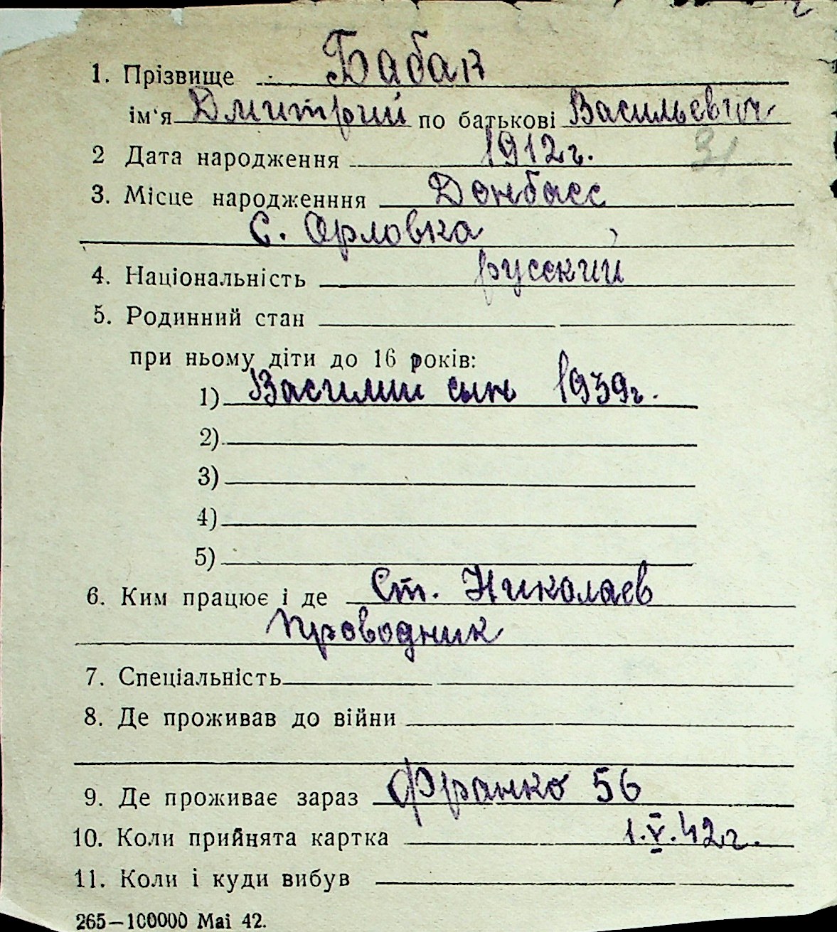 ◦ ◦ Перелік карток на осіб, які мешкали у м. Миколаїв у період окупації 1941–1944 років