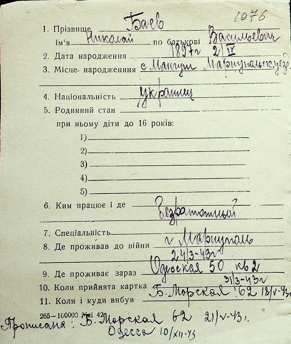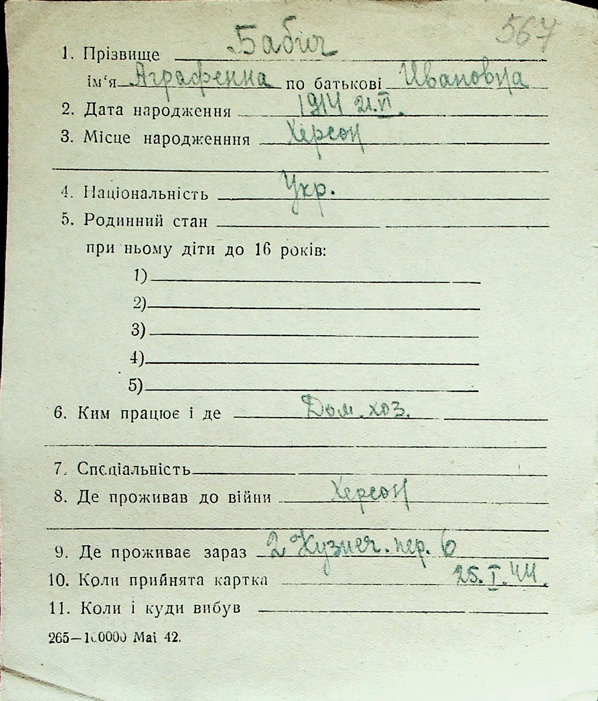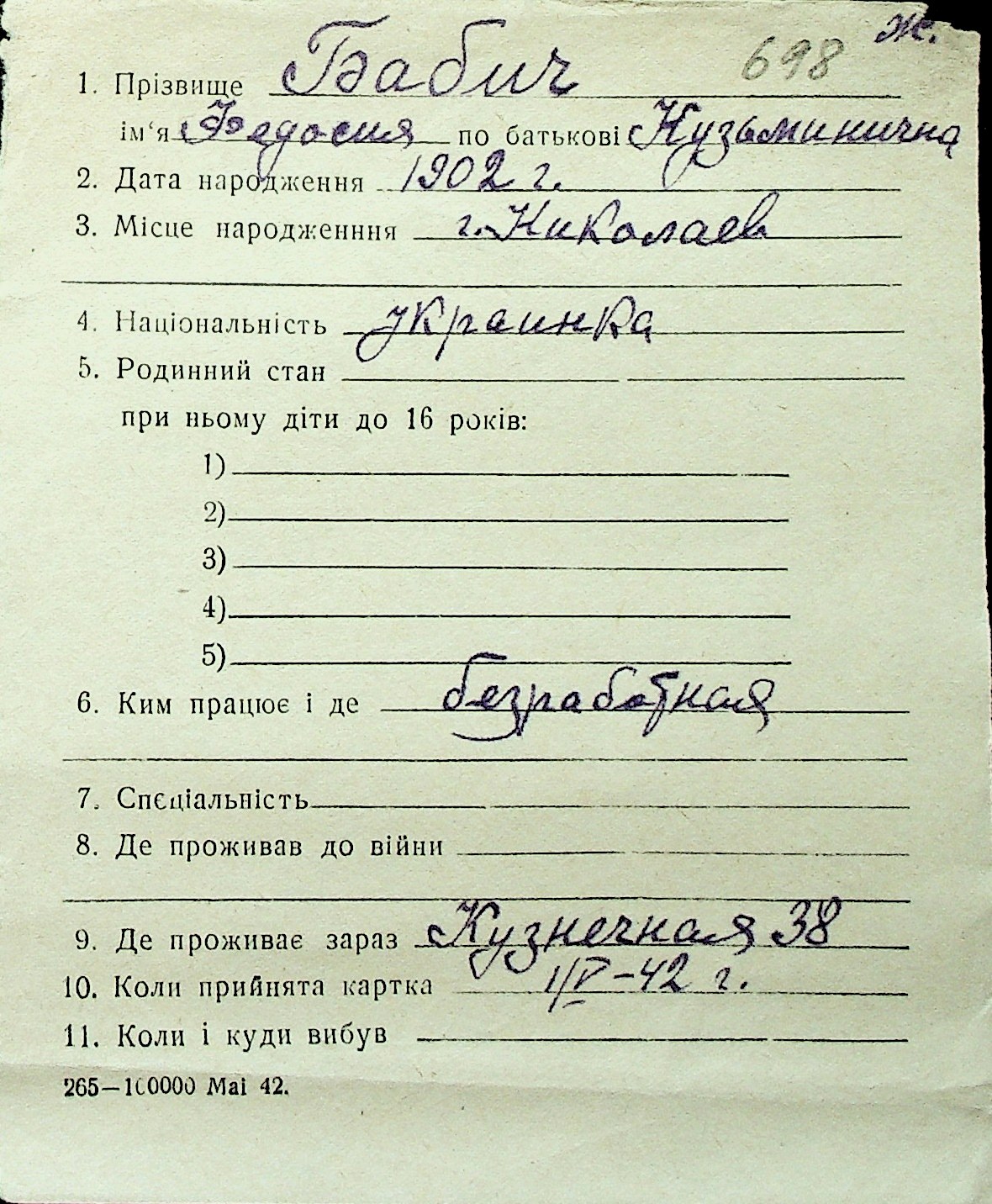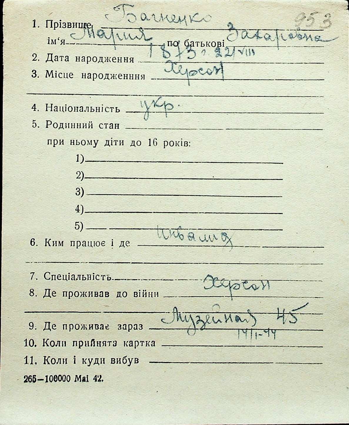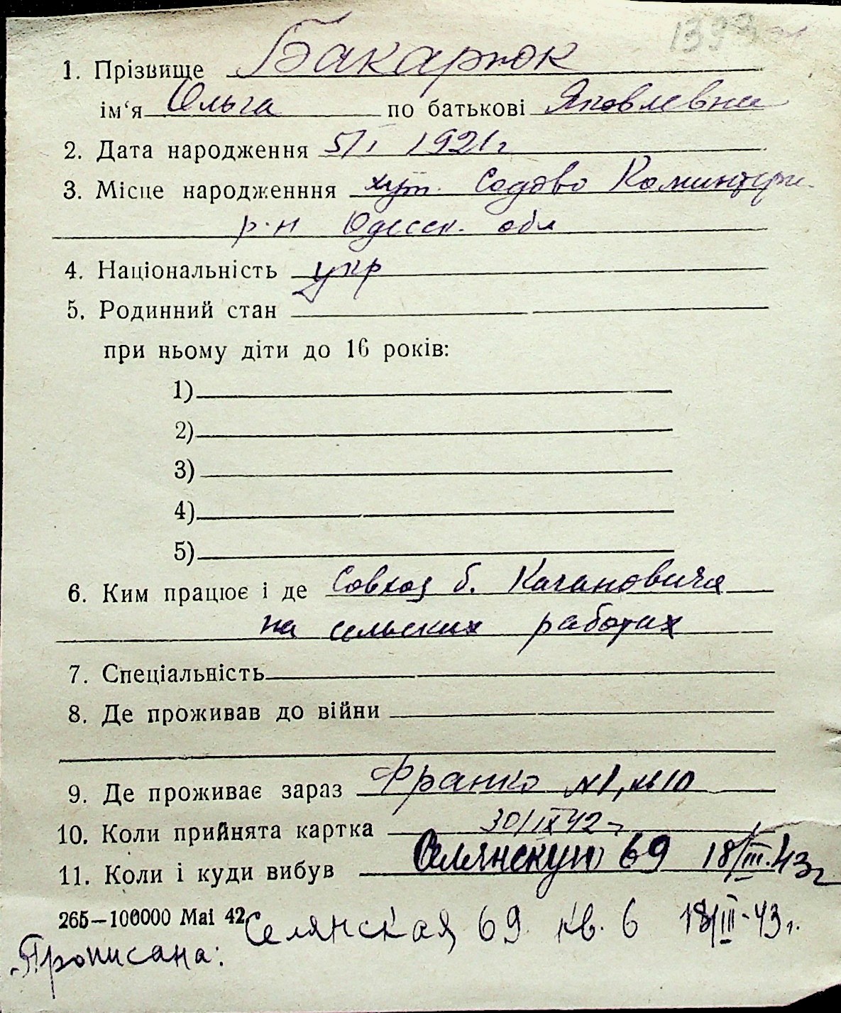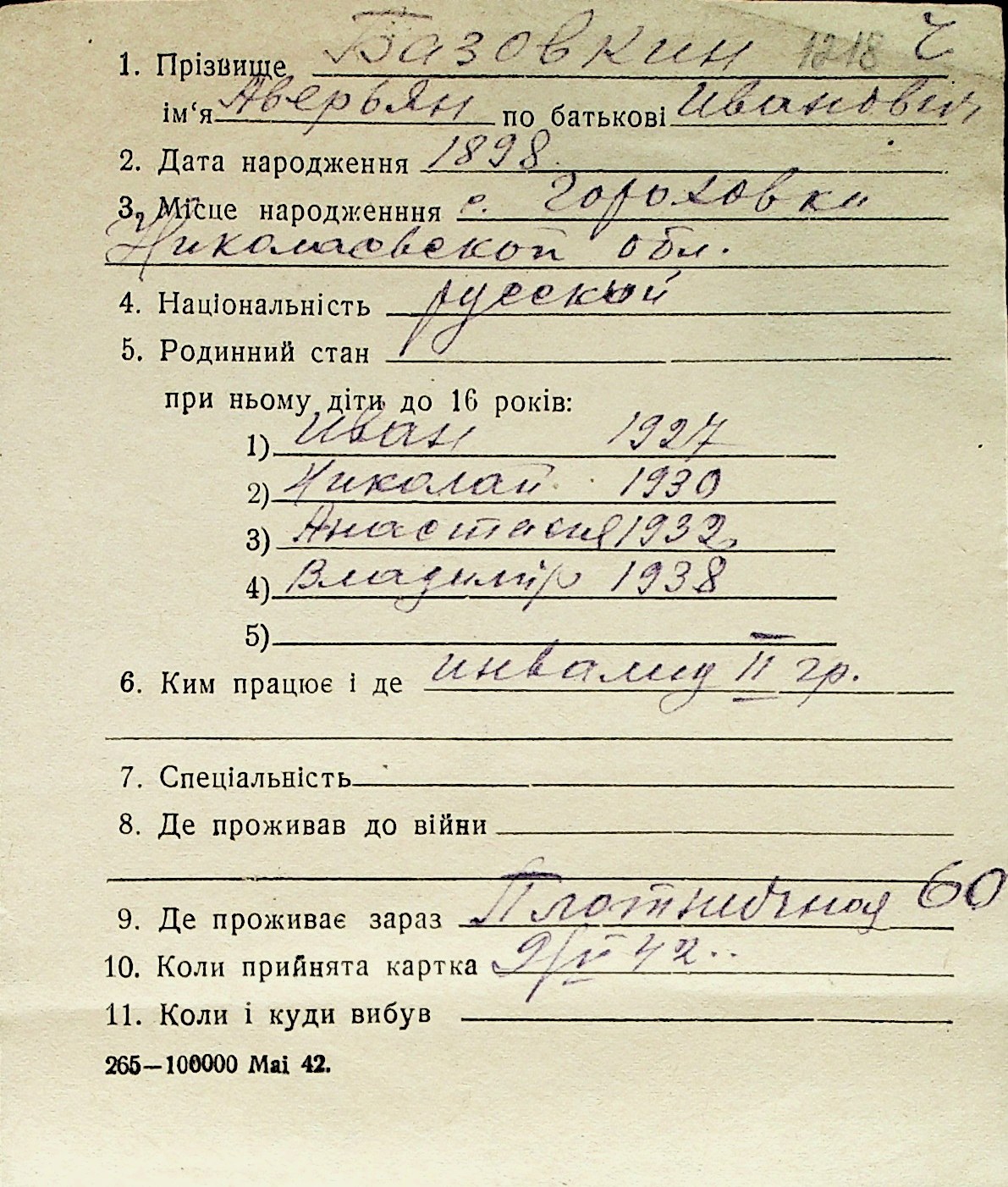 ◦ ◦ Перелік карток на осіб, які мешкали у м. Миколаїв у період окупації 1941–1944 років