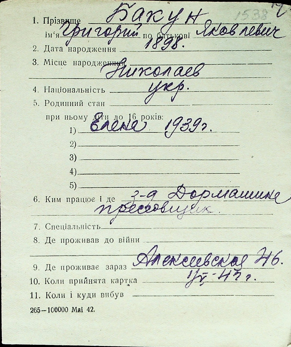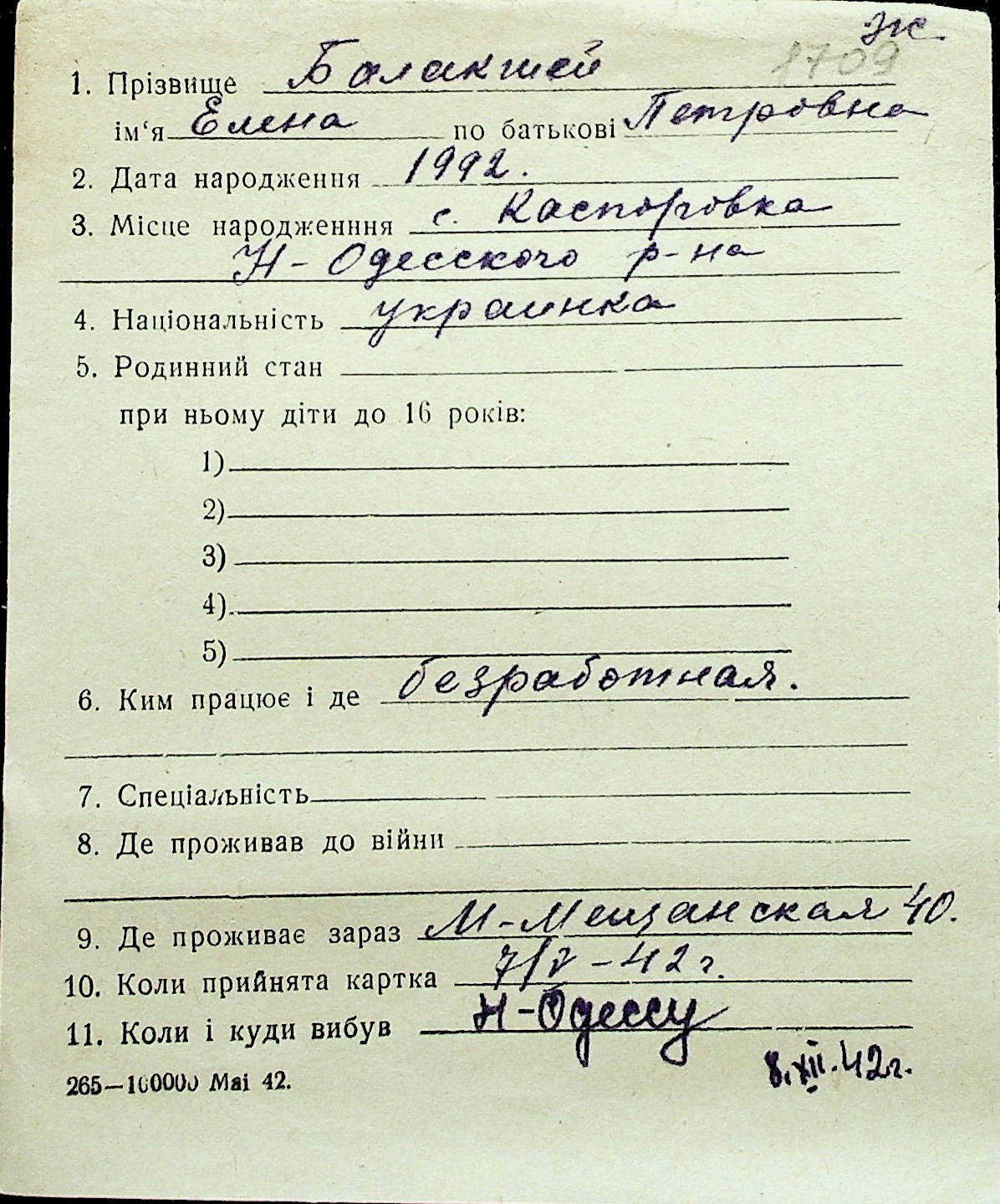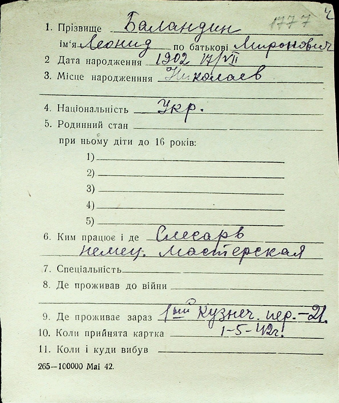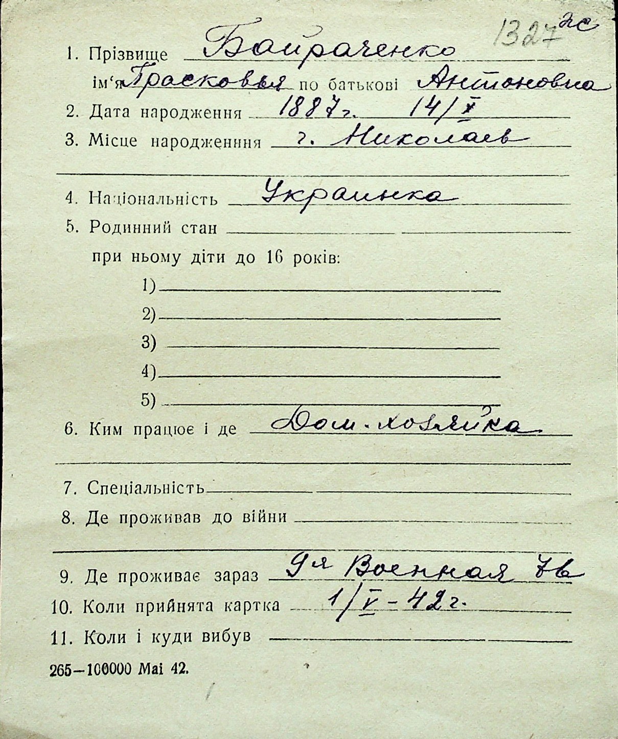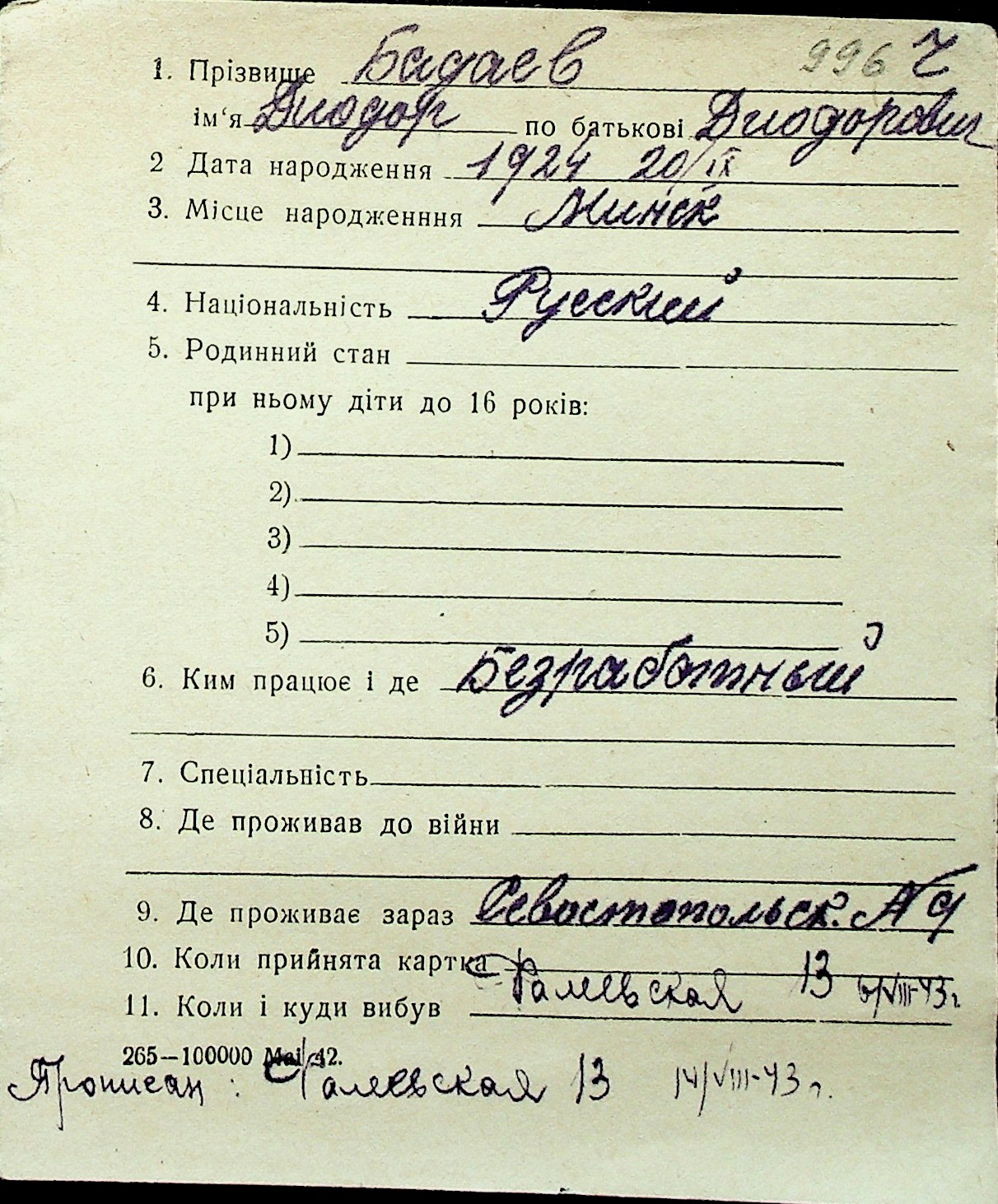 ◦ ◦ Перелік карток на осіб, які мешкали у м. Миколаїв у період окупації 1941–1944 років