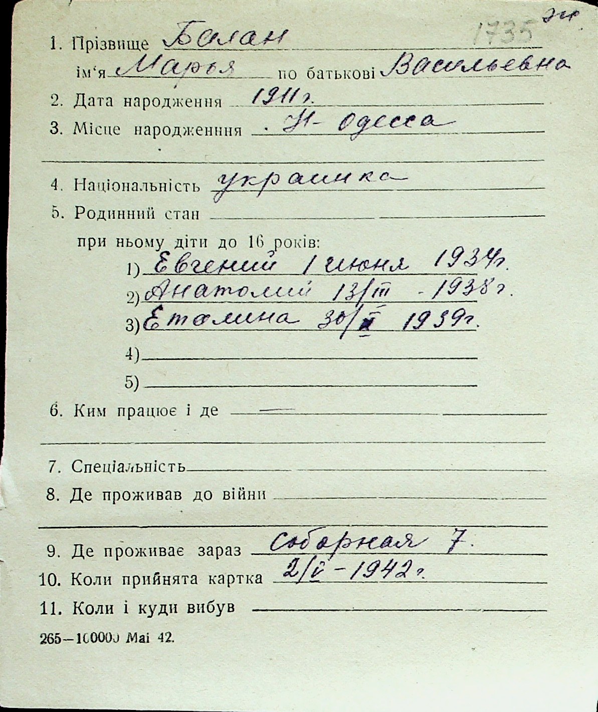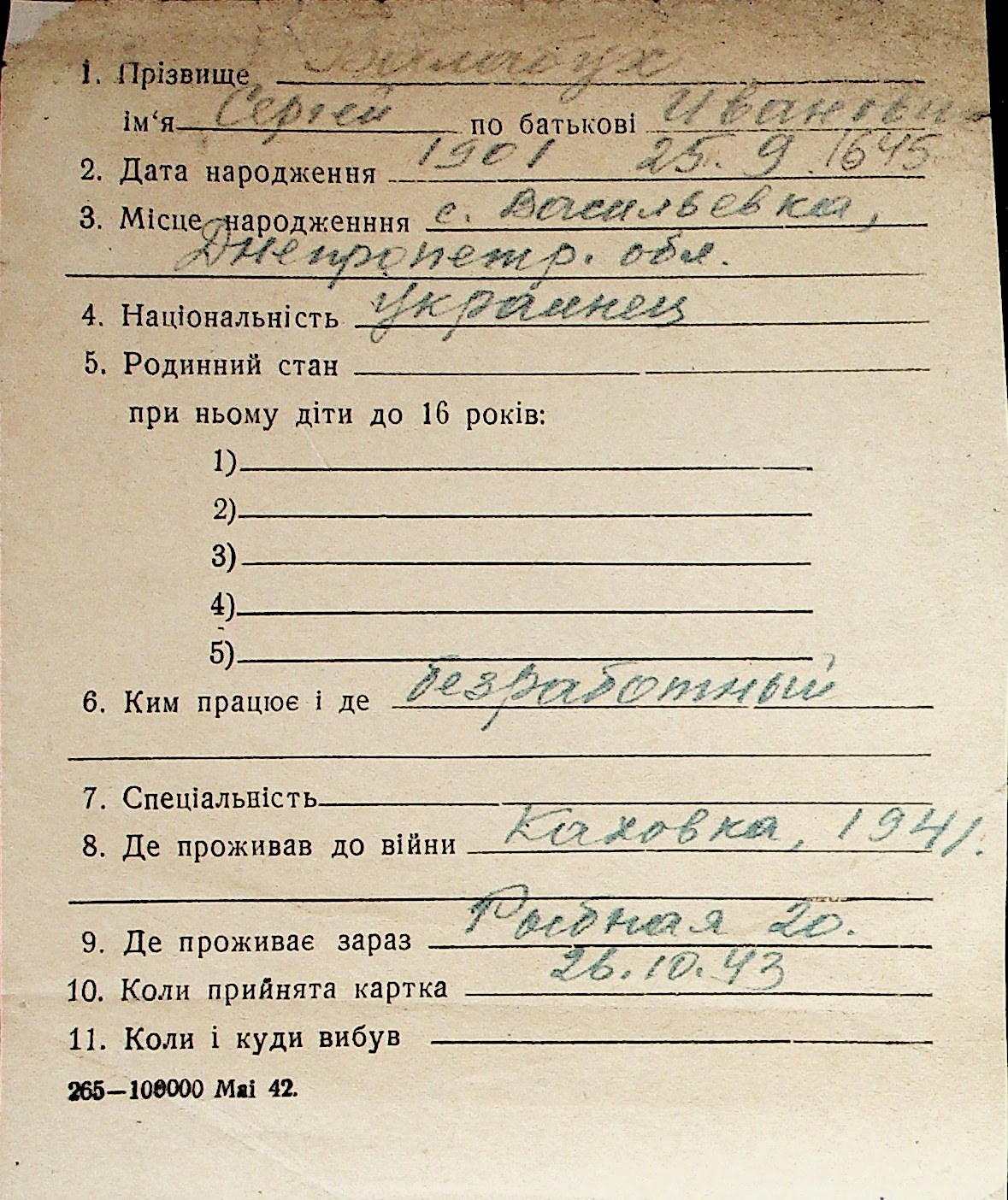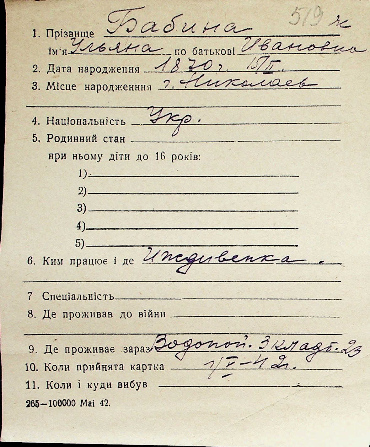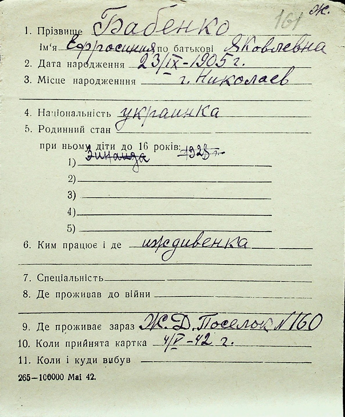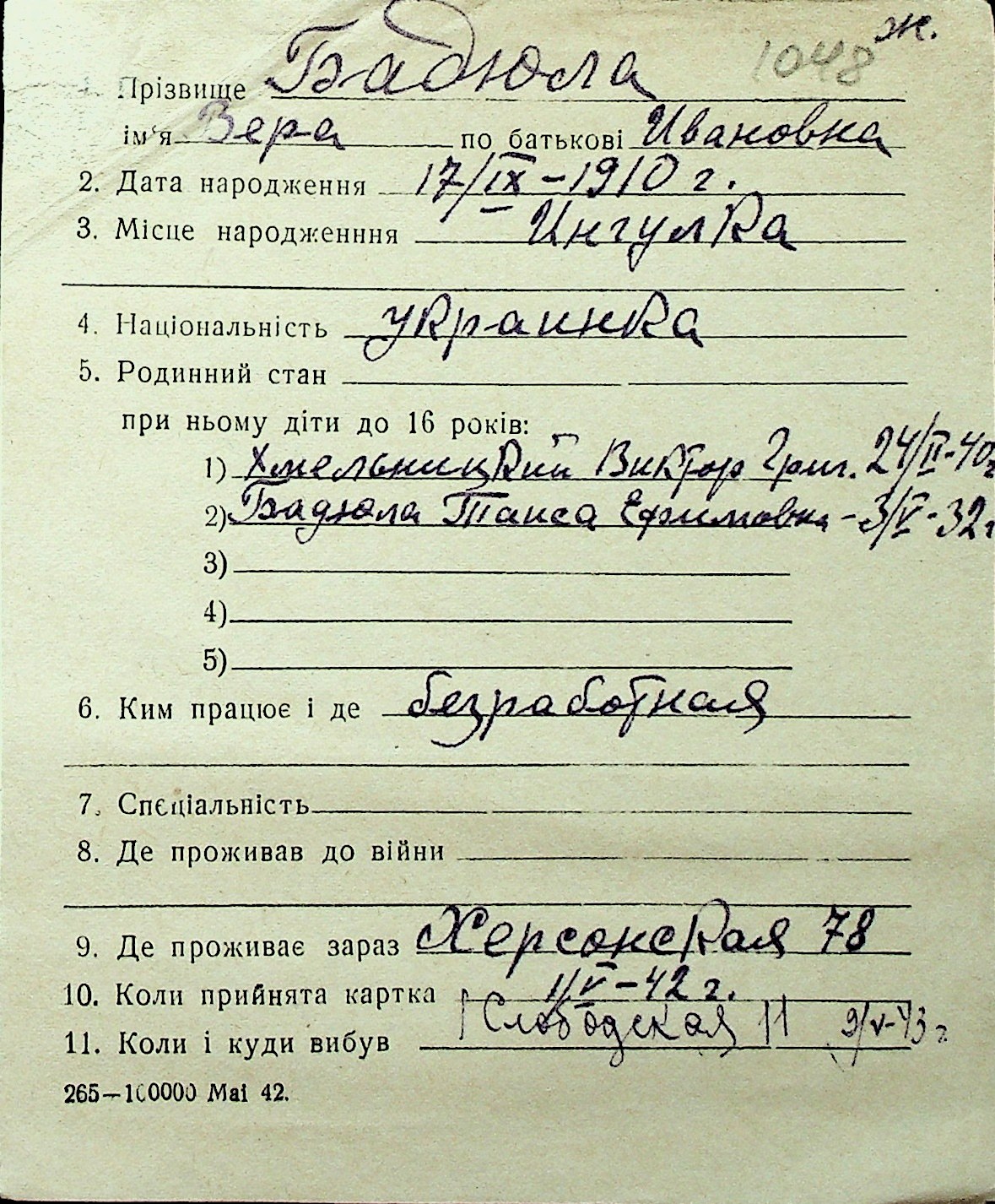◦ ◦ Перелік карток на осіб, які мешкали у м. Миколаїв у період окупації 1941–1944 років