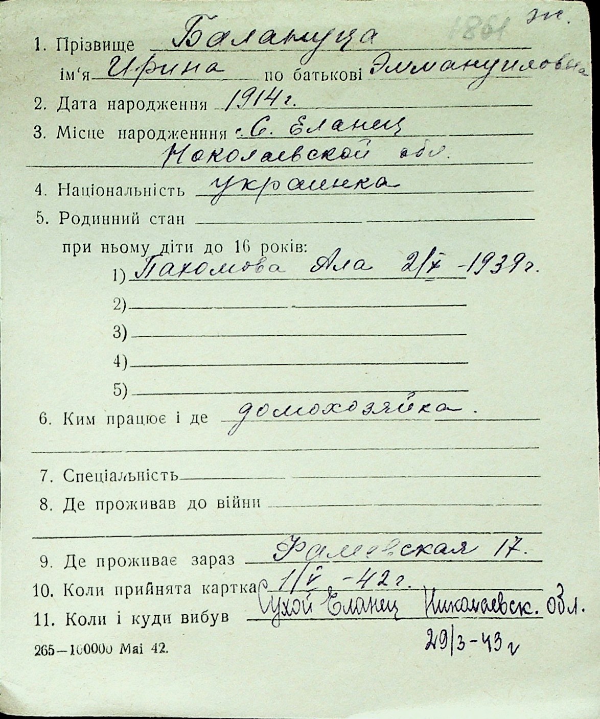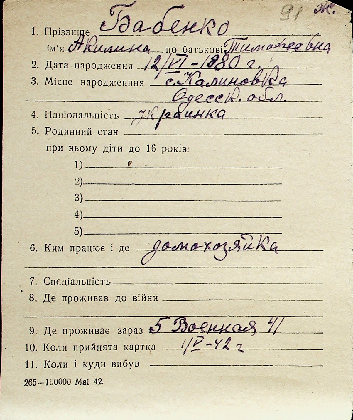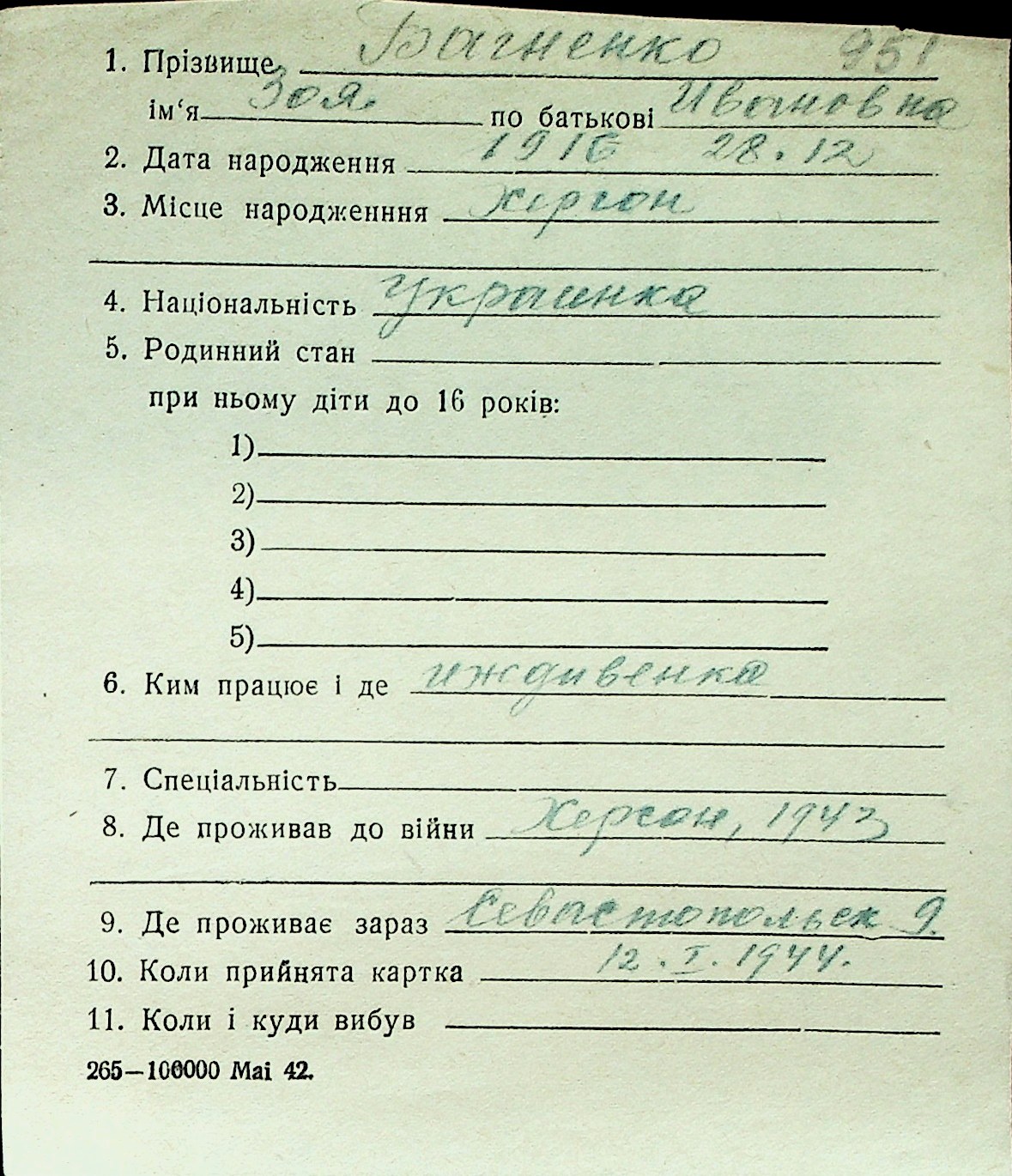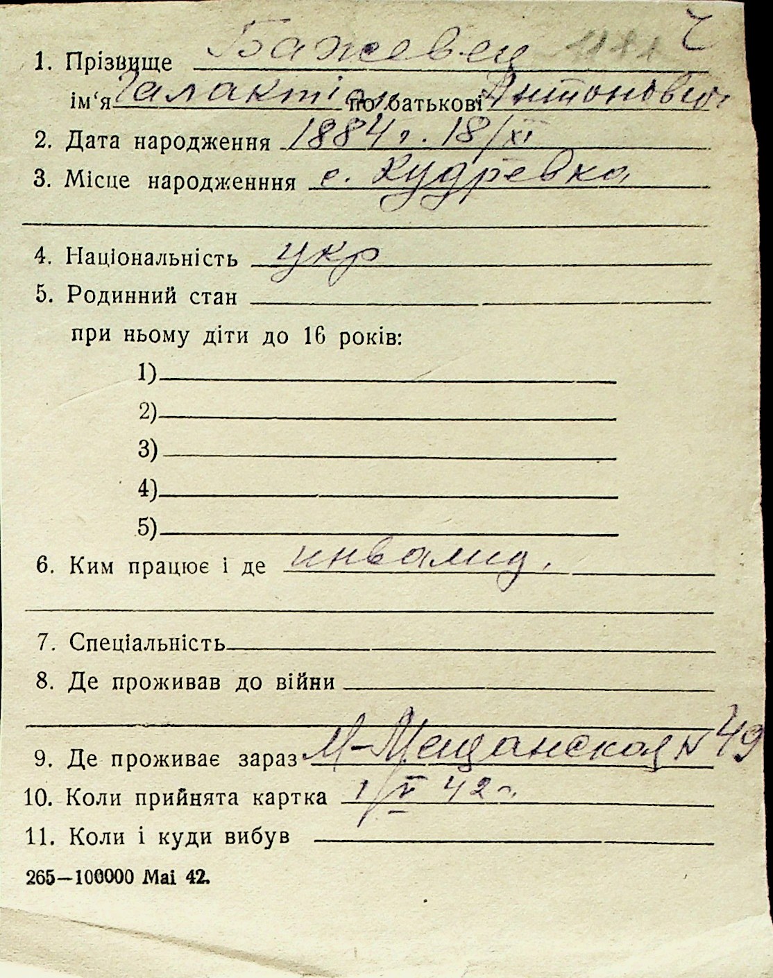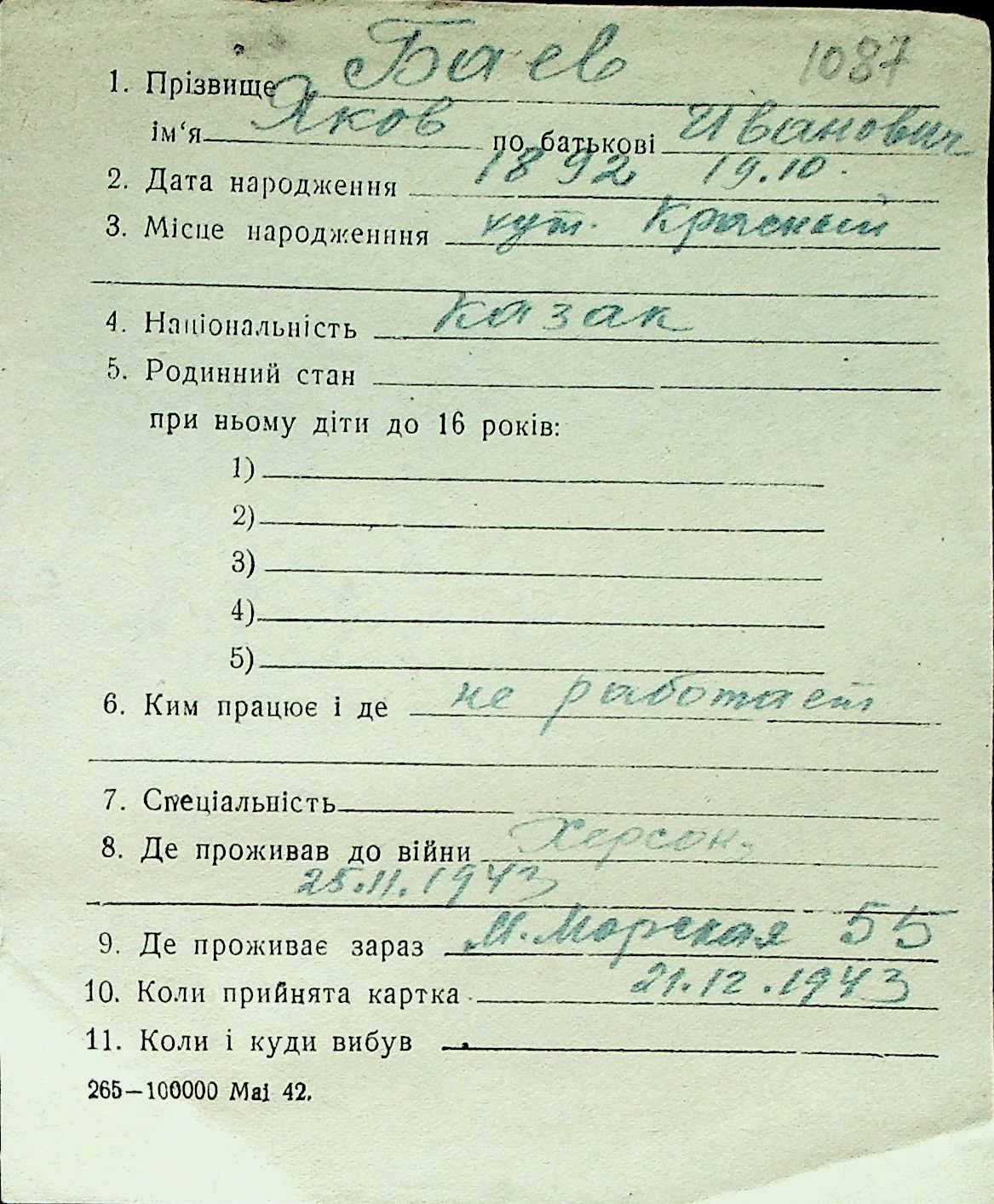 ◦ ◦ Перелік карток на осіб, які мешкали у м. Миколаїв у період окупації 1941–1944 років
