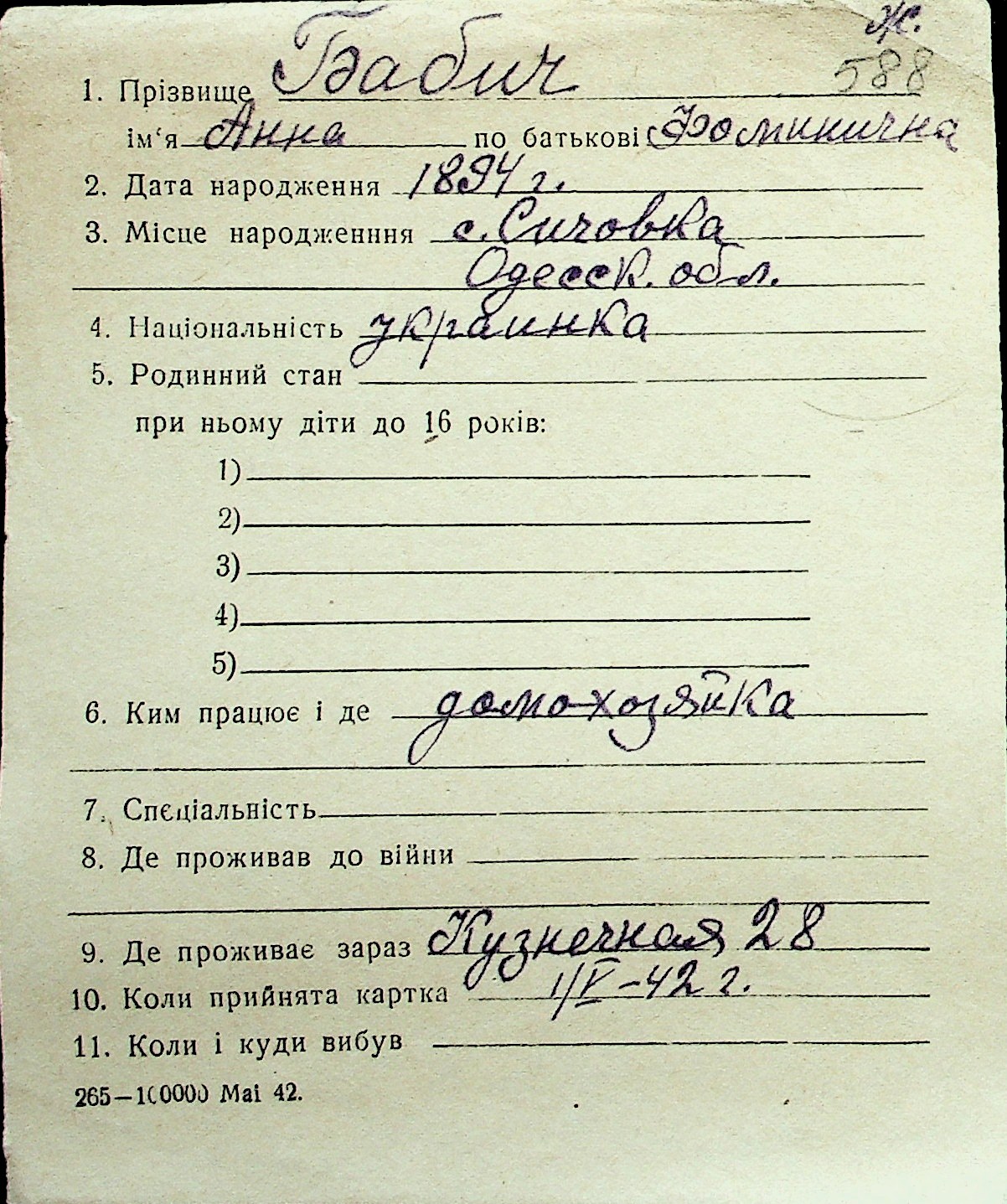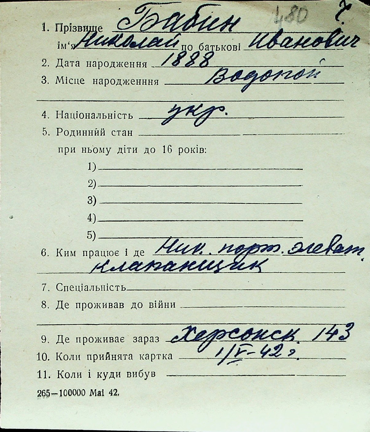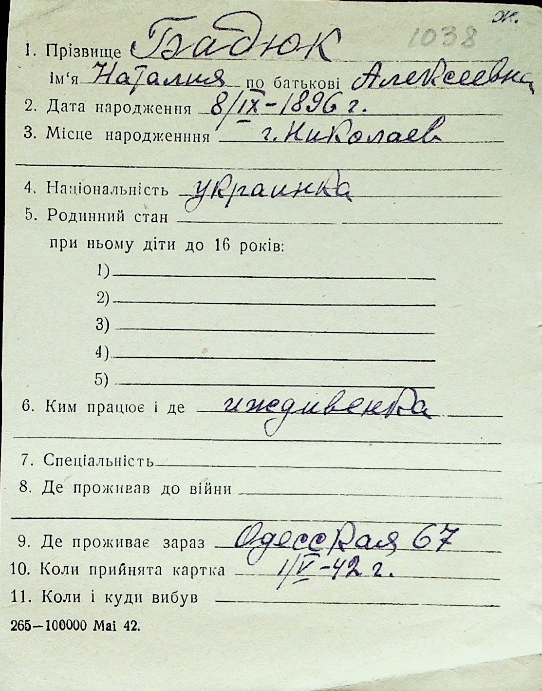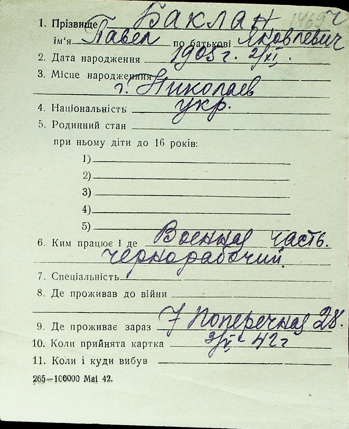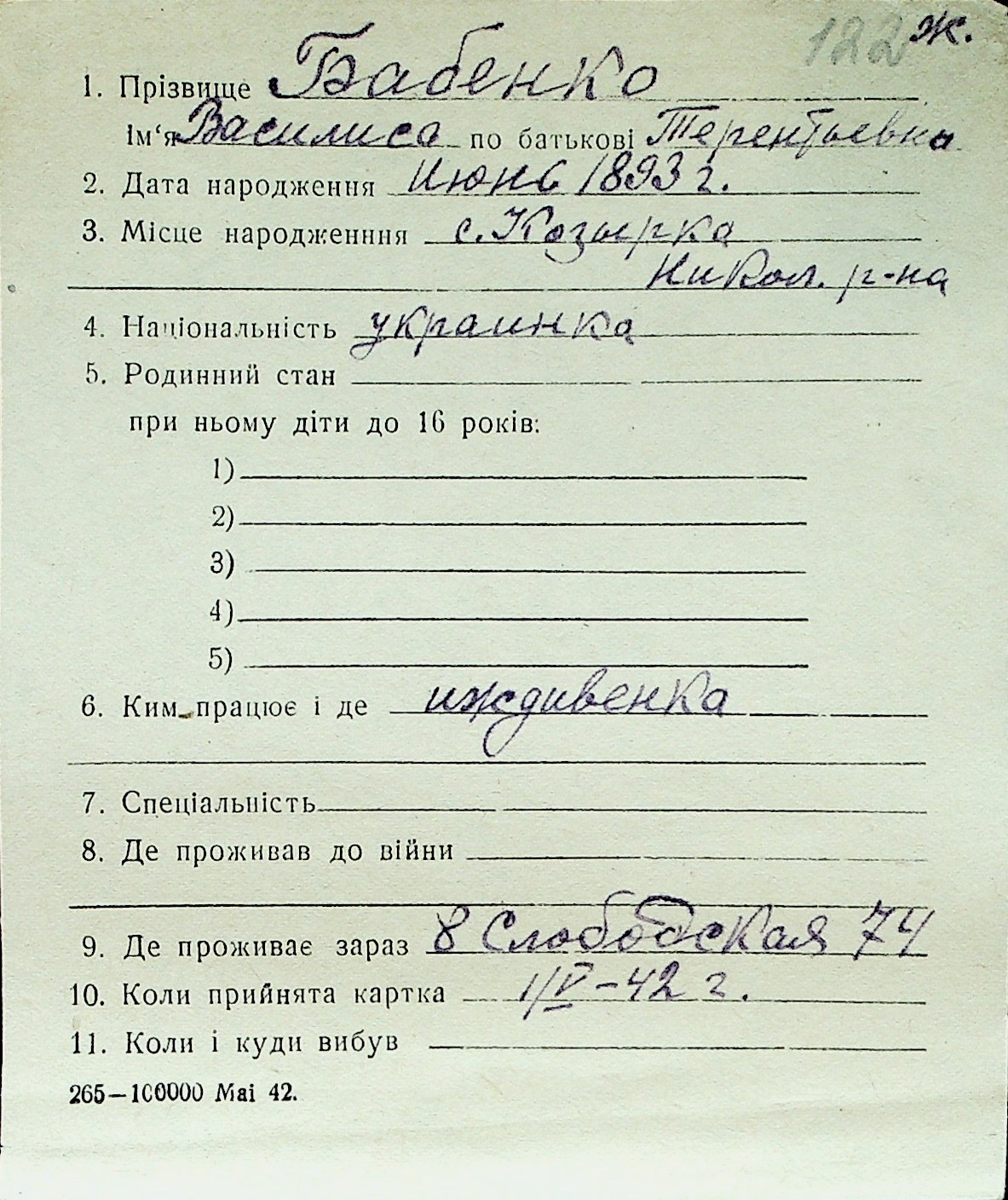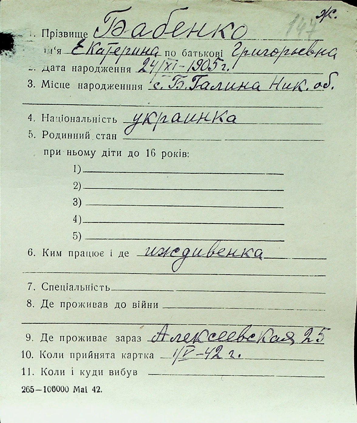 ◦ ◦ Перелік карток на осіб, які мешкали у м. Миколаїв у період окупації 1941–1944 років