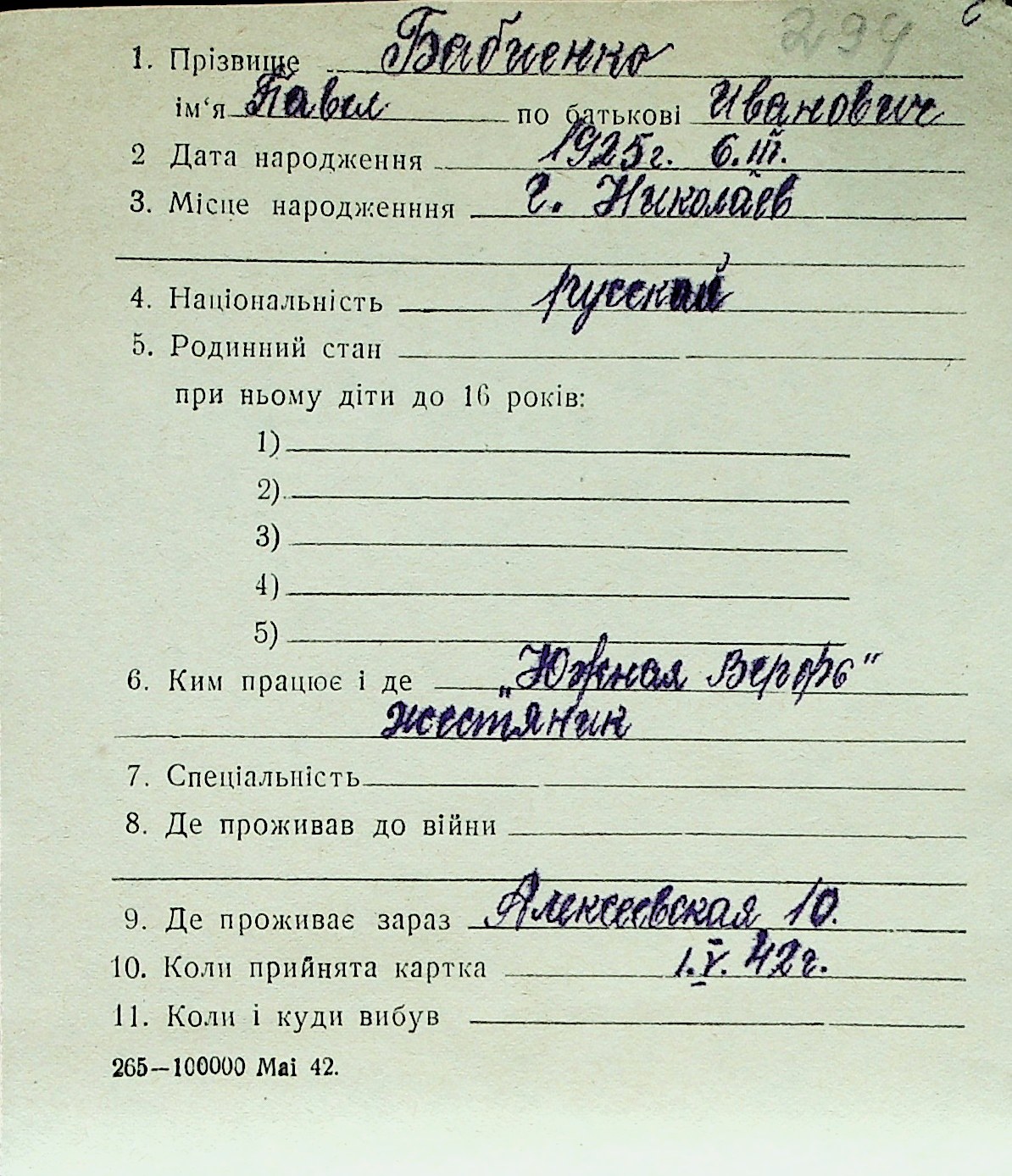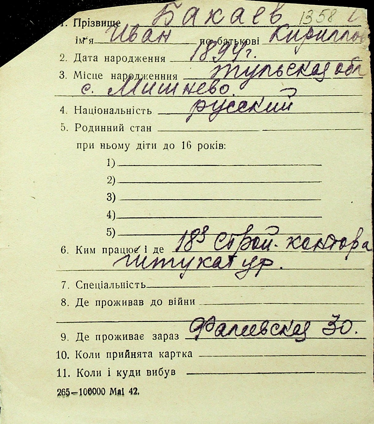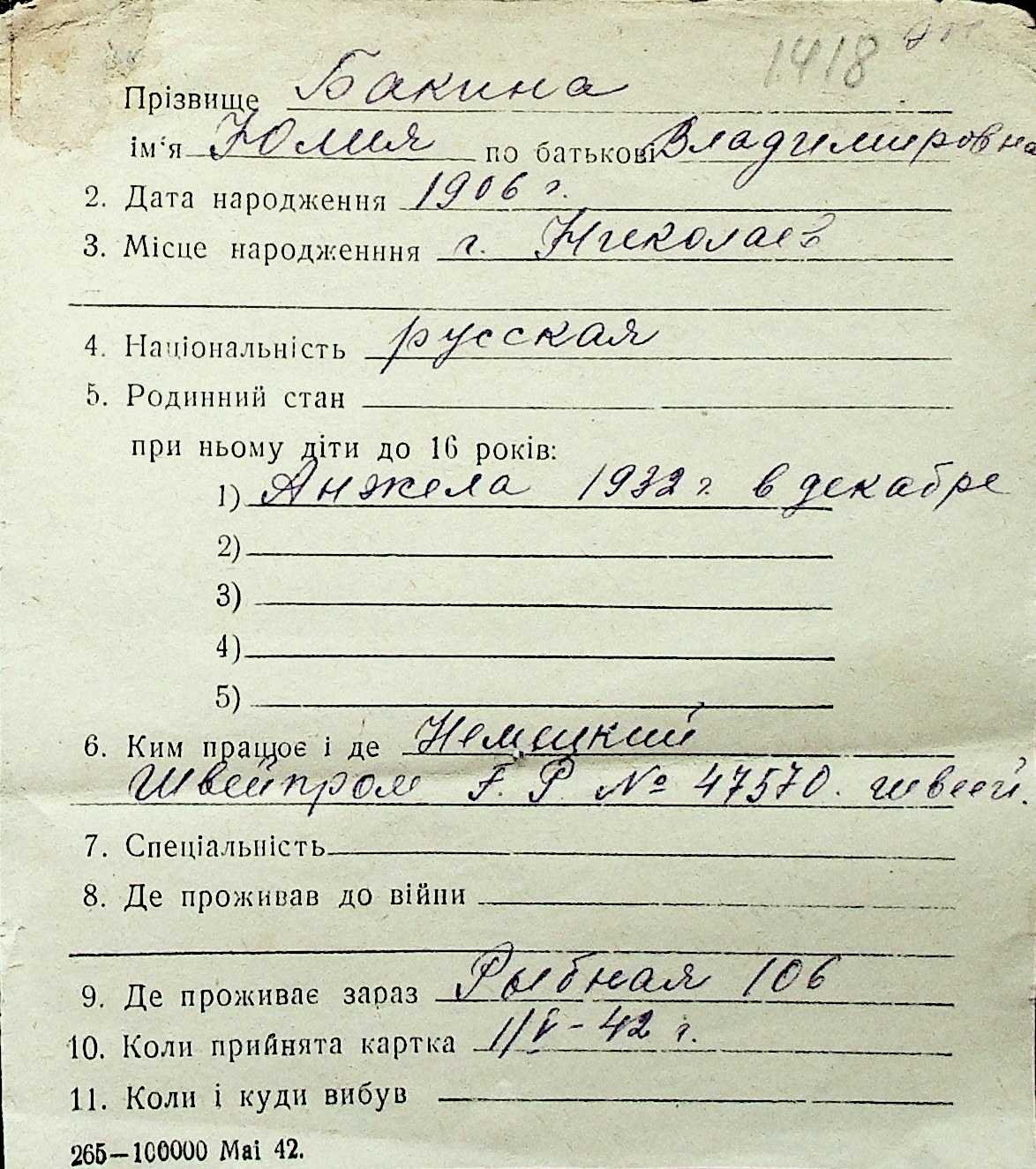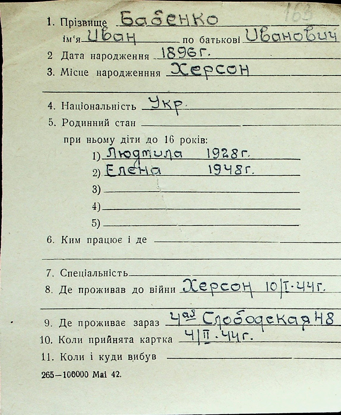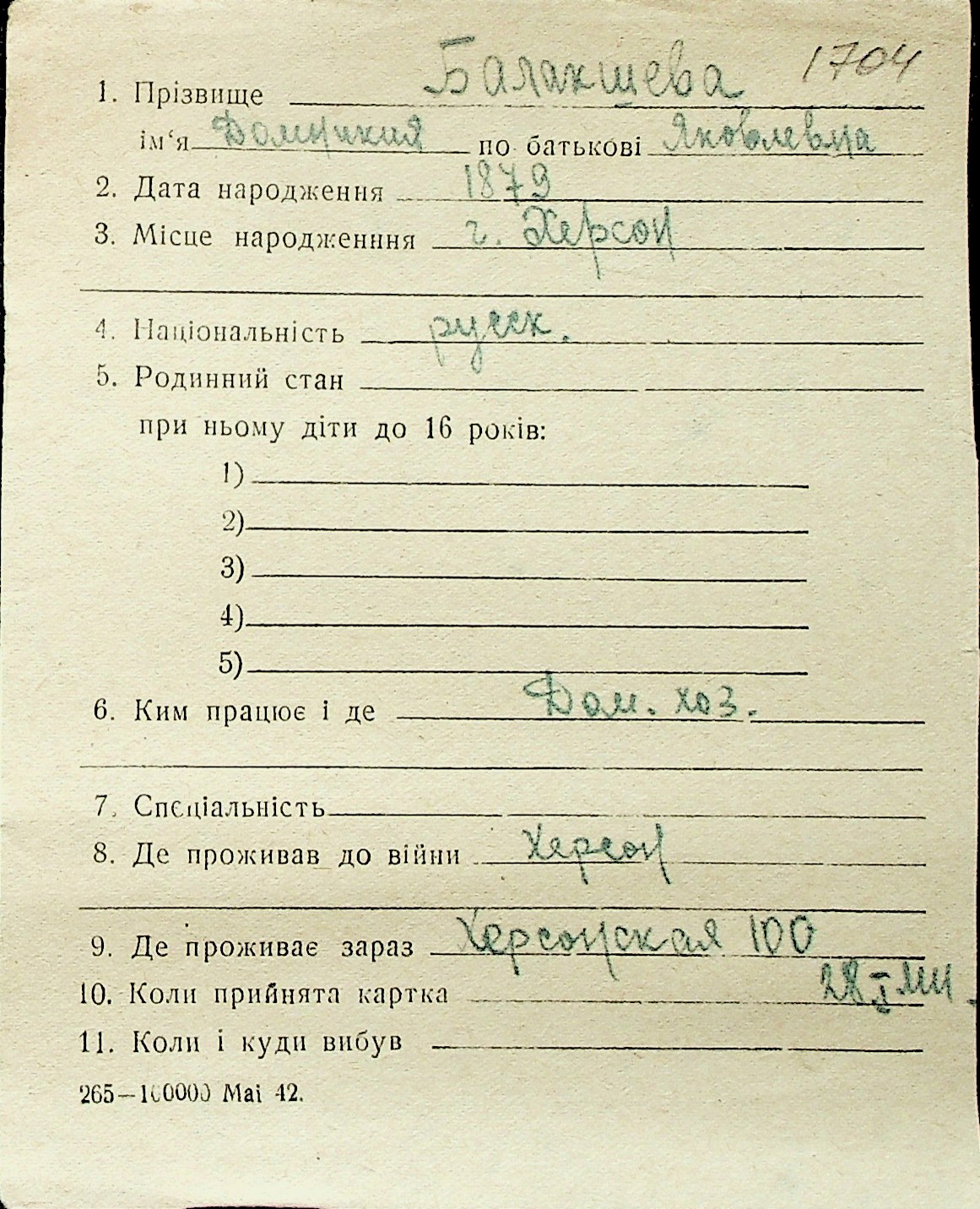 ◦ ◦ Перелік карток на осіб, які мешкали у м. Миколаїв у період окупації 1941–1944 років