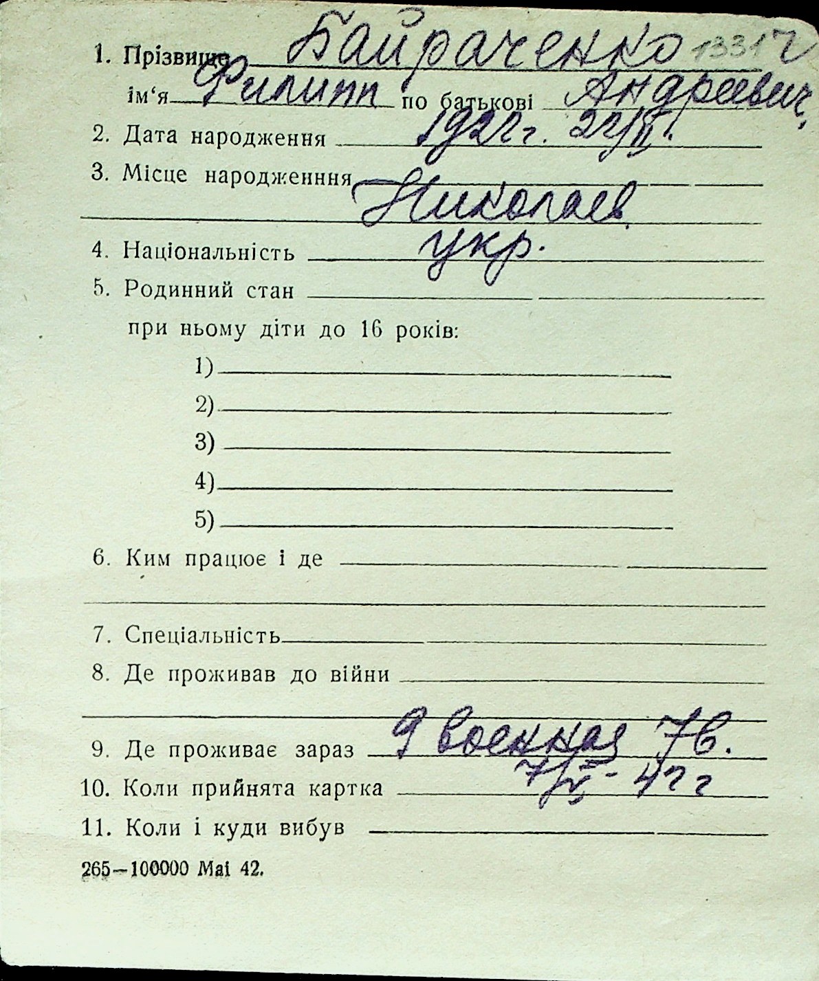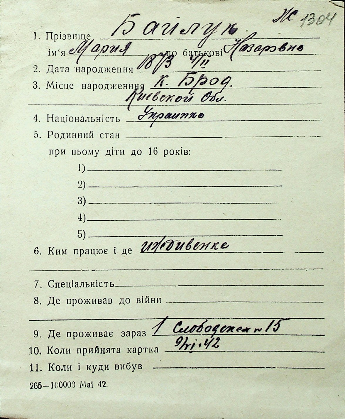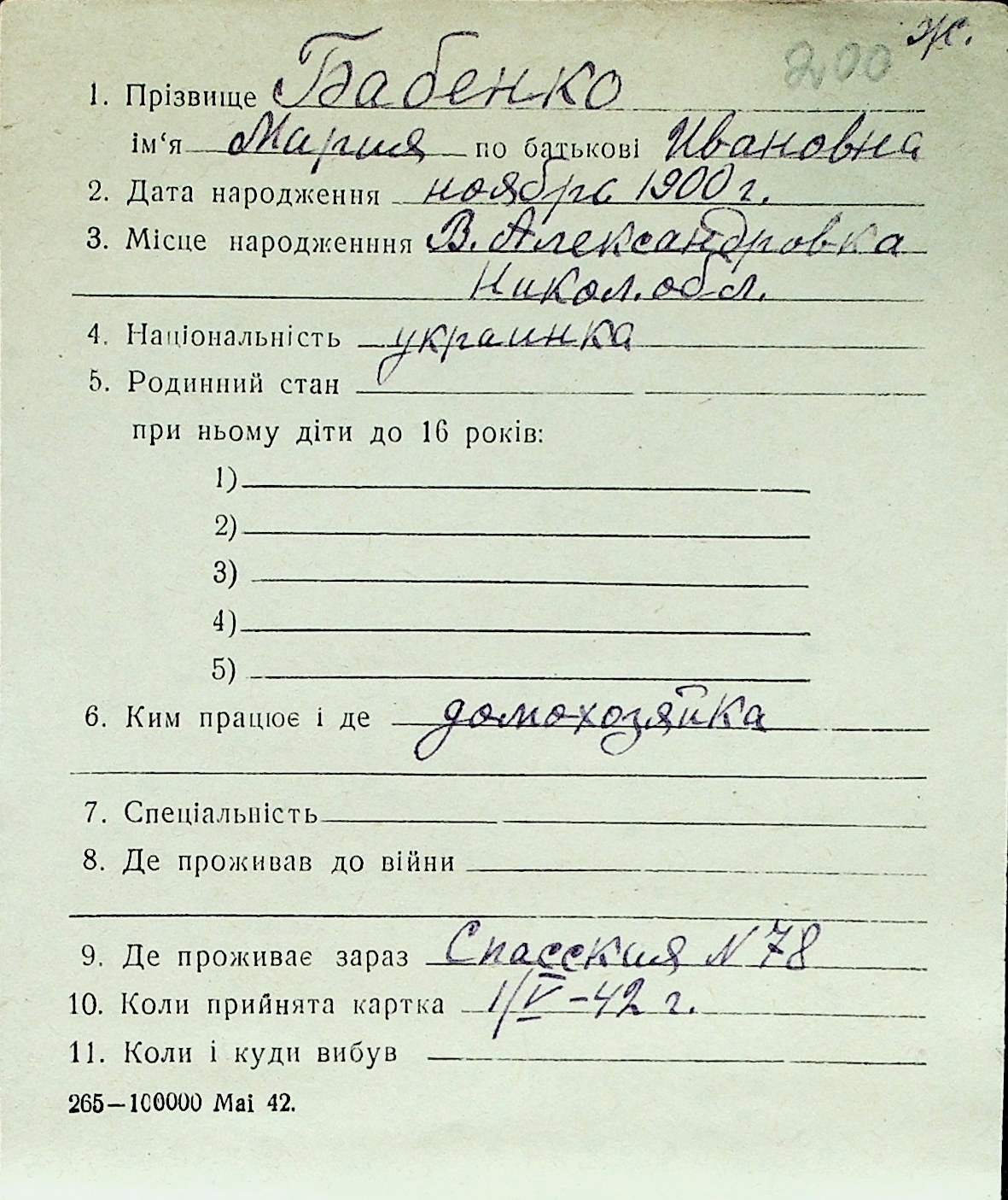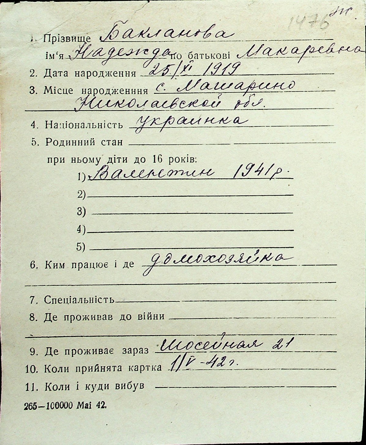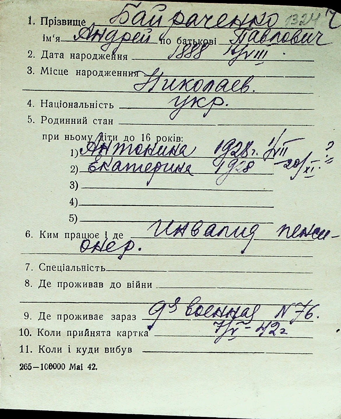 ◦ ◦ Перелік карток на осіб, які мешкали у м. Миколаїв у період окупації 1941–1944 років