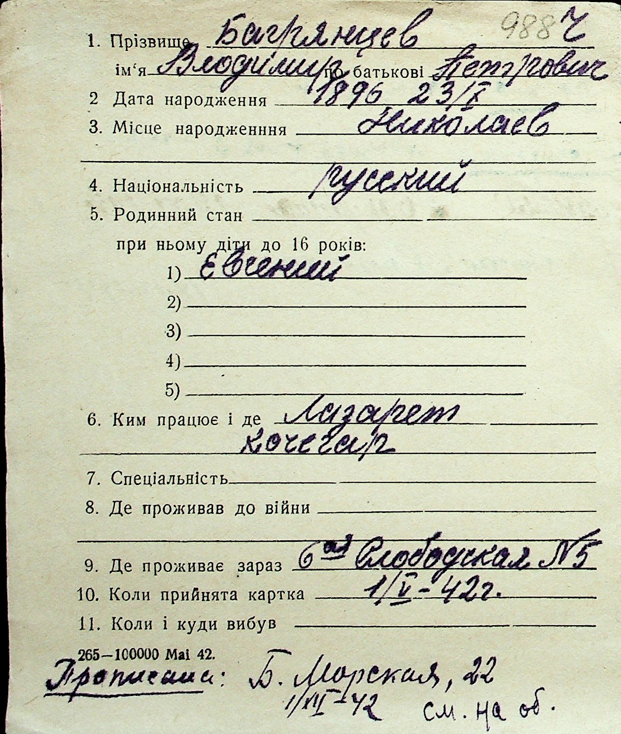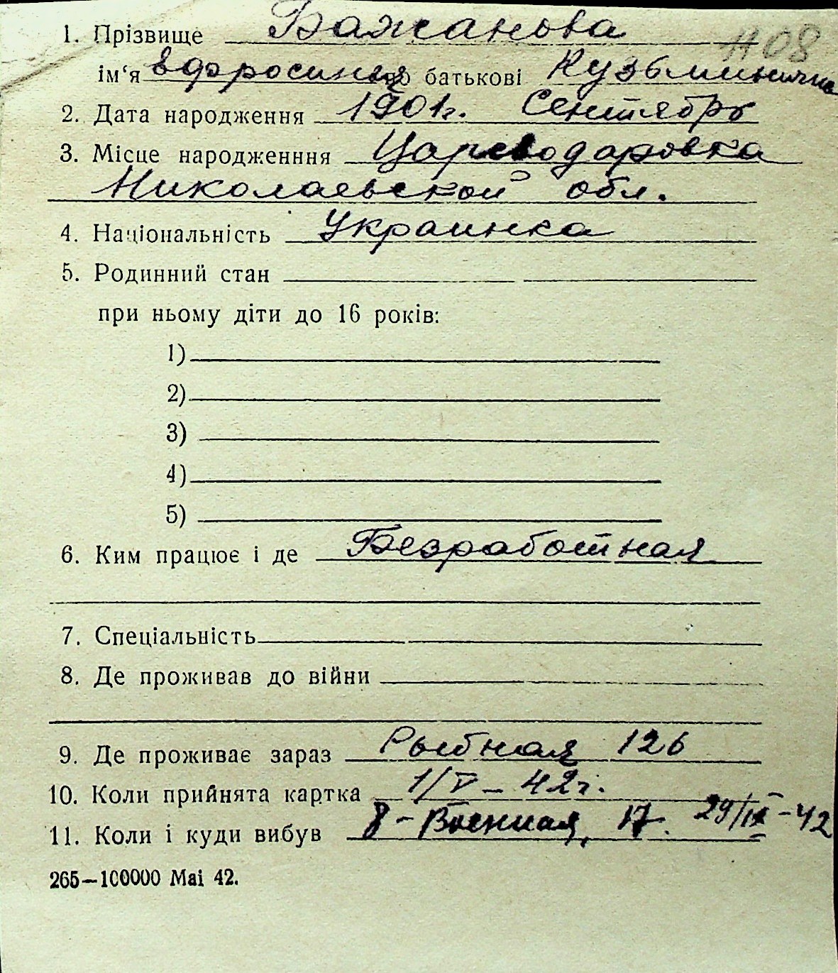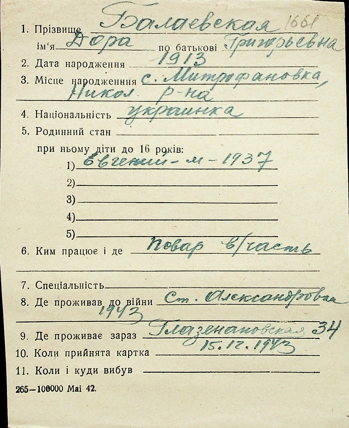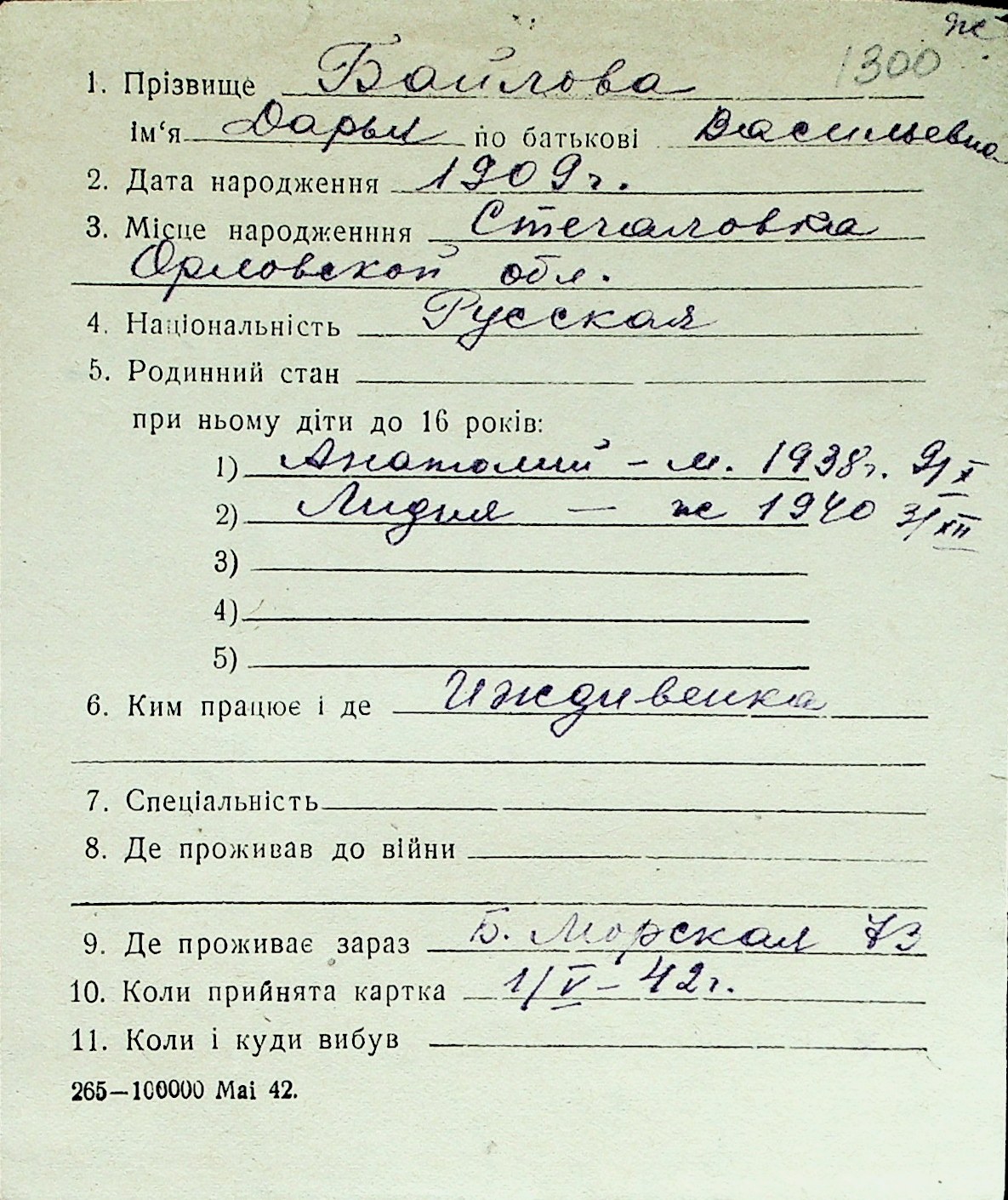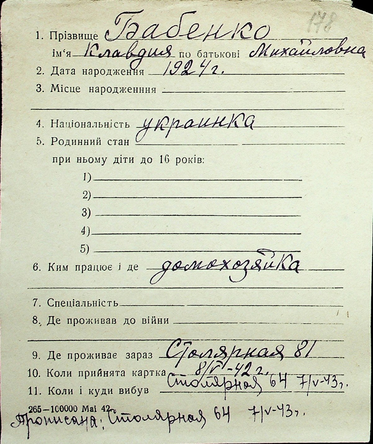 ◦ ◦ Перелік карток на осіб, які мешкали у м. Миколаїв у період окупації 1941–1944 років