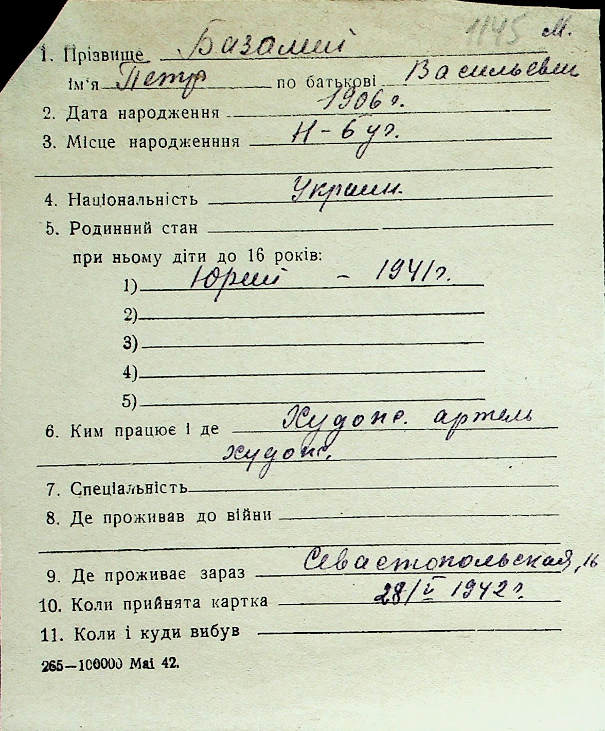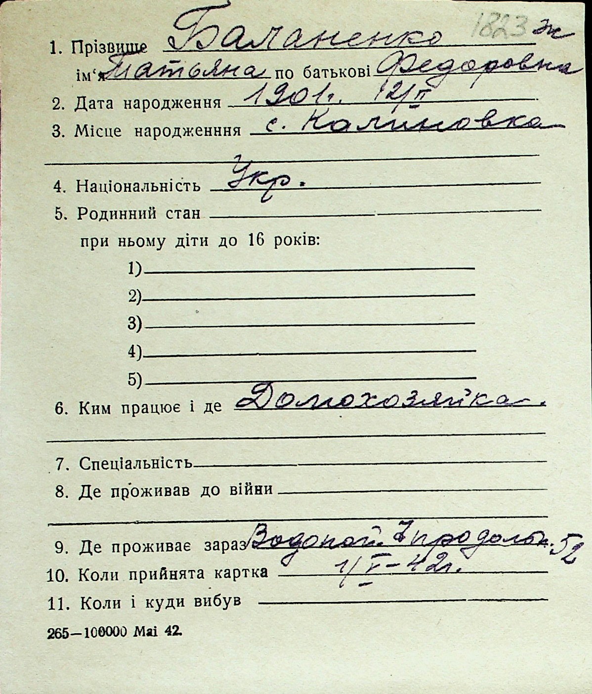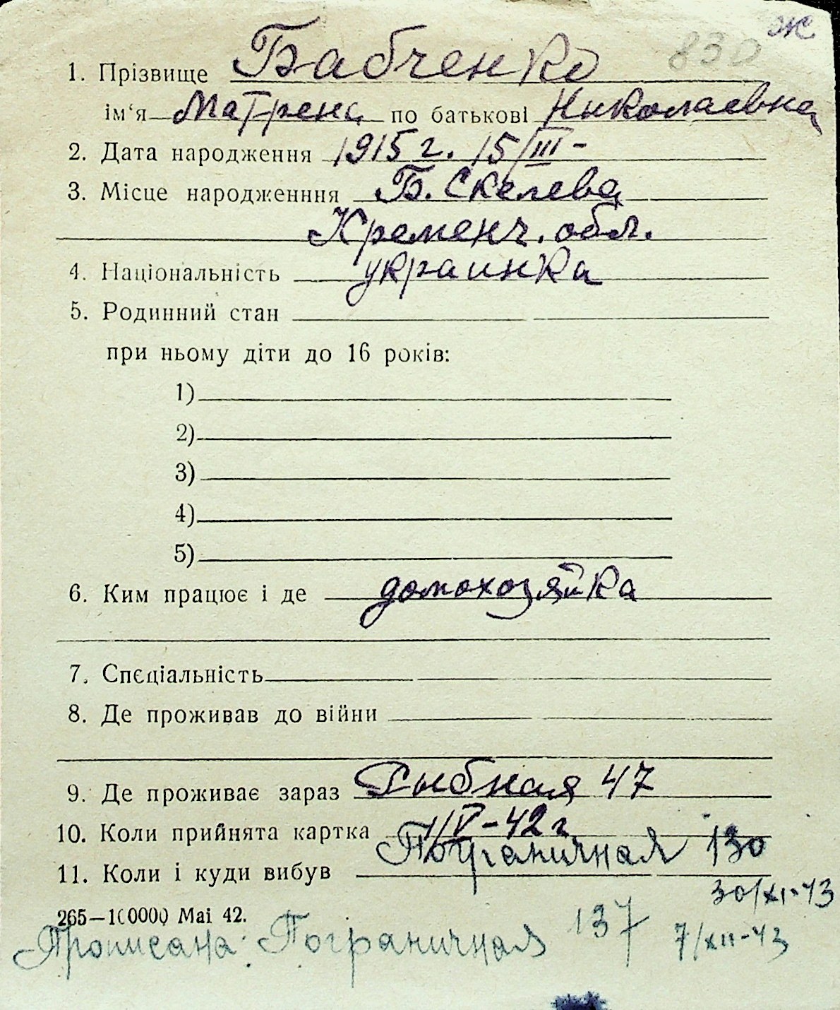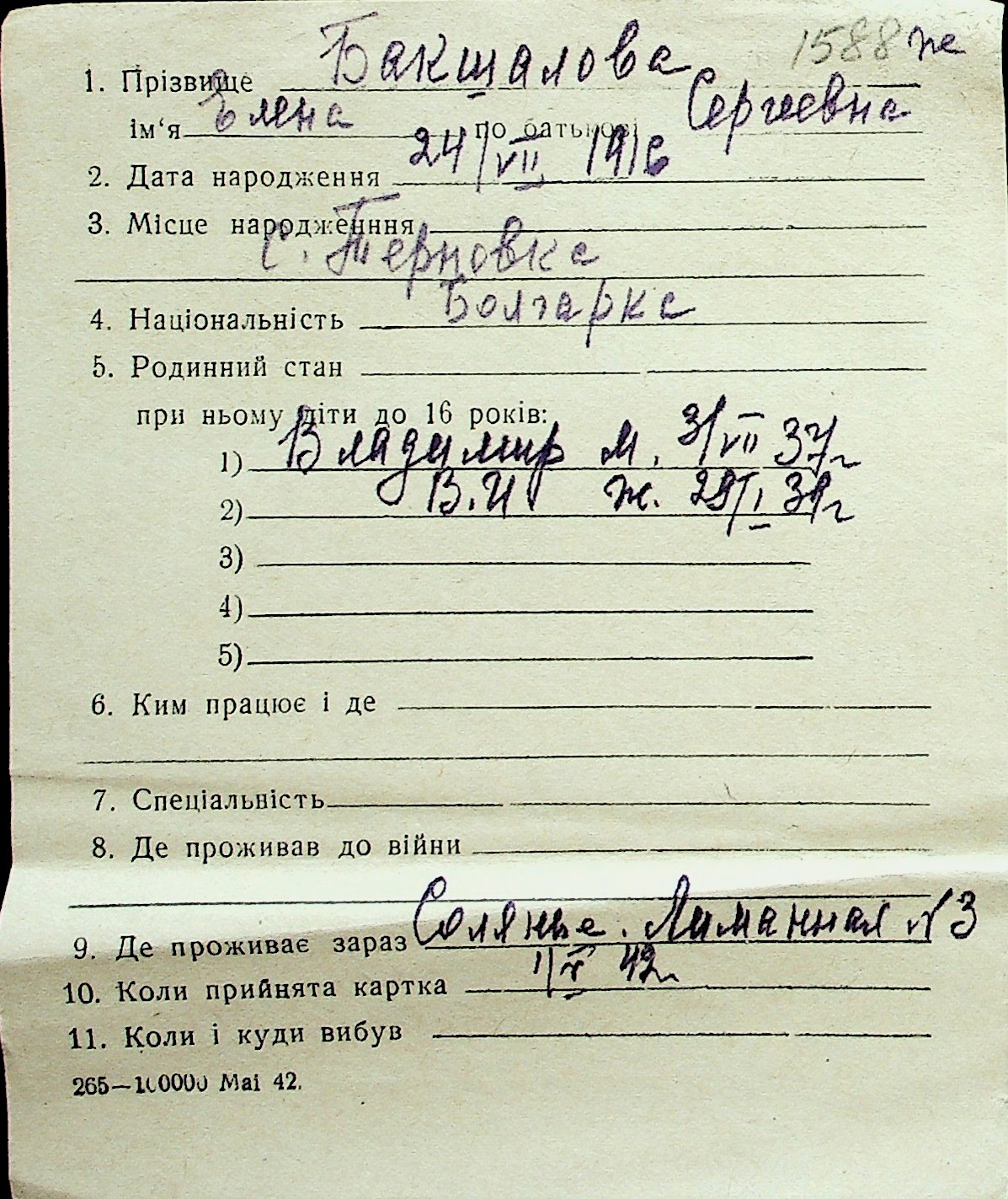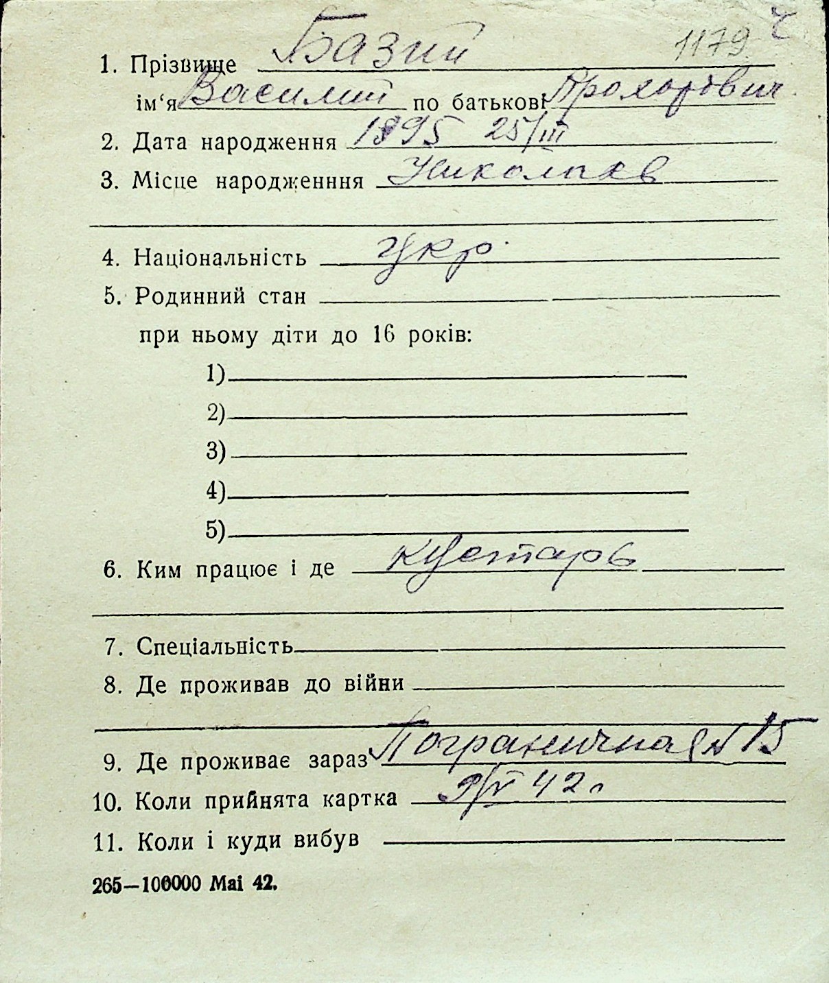 ◦ ◦ Перелік карток на осіб, які мешкали у м. Миколаїв у період окупації 1941–1944 років