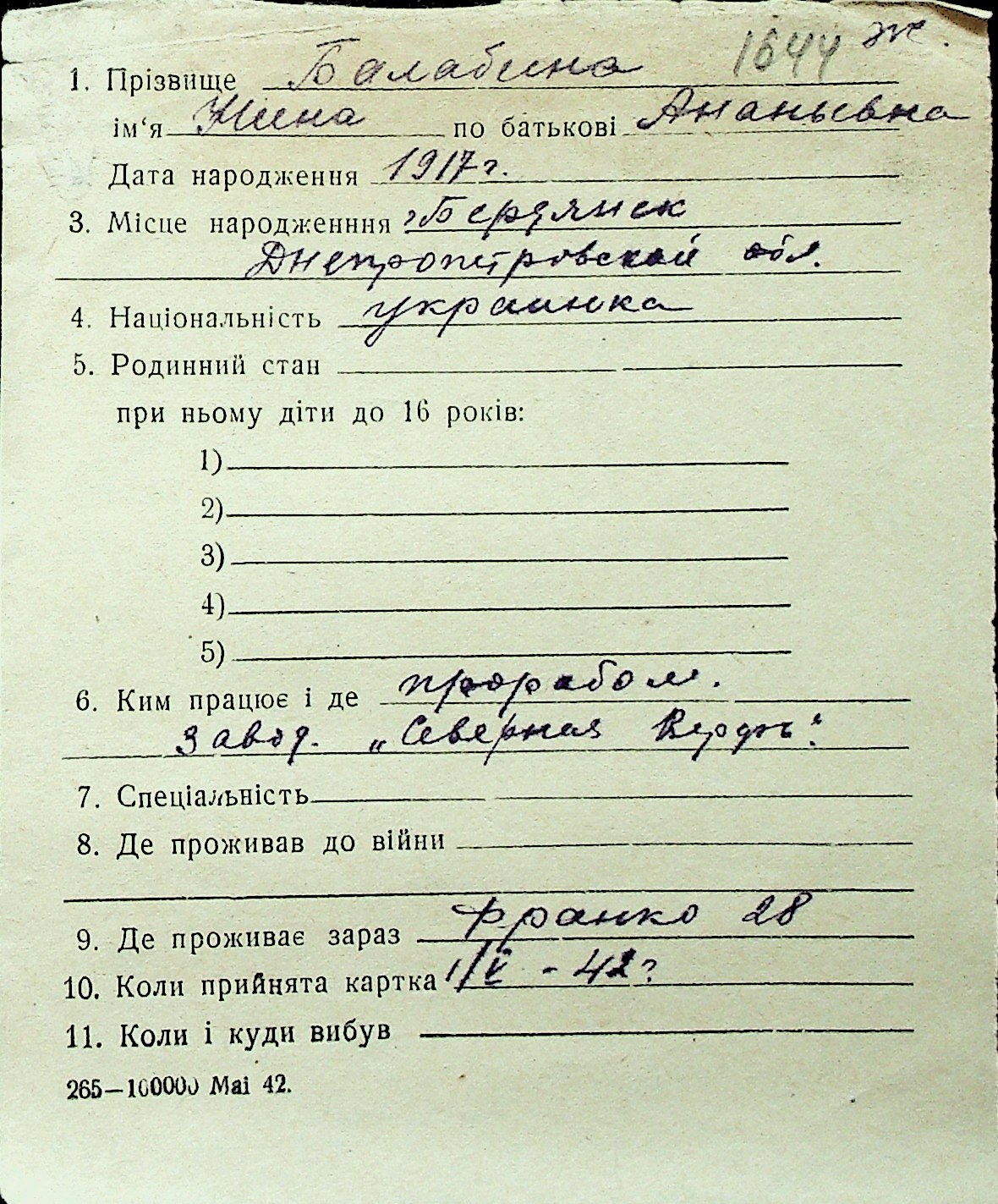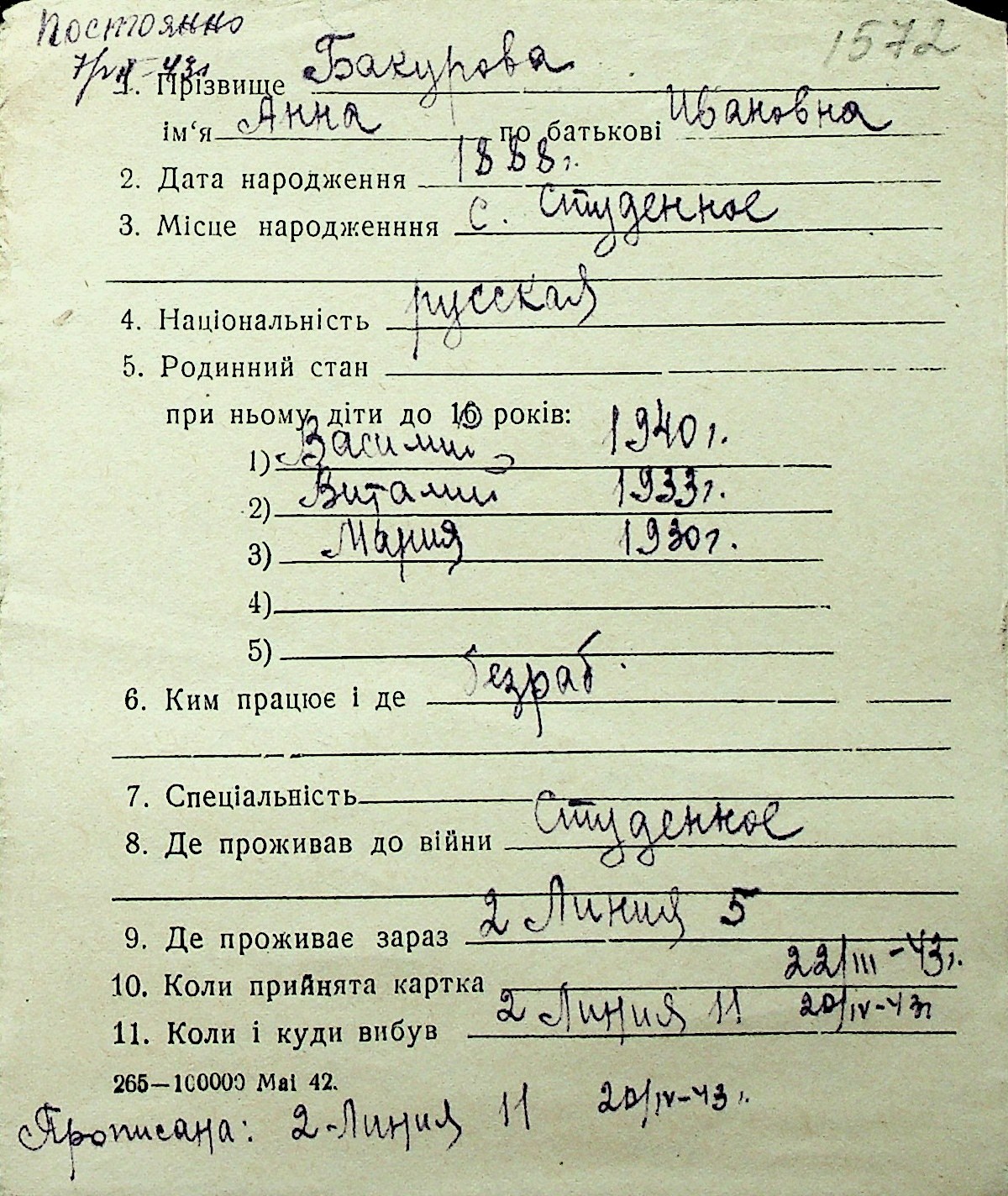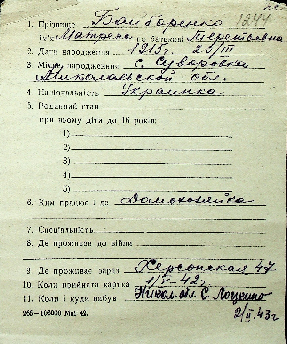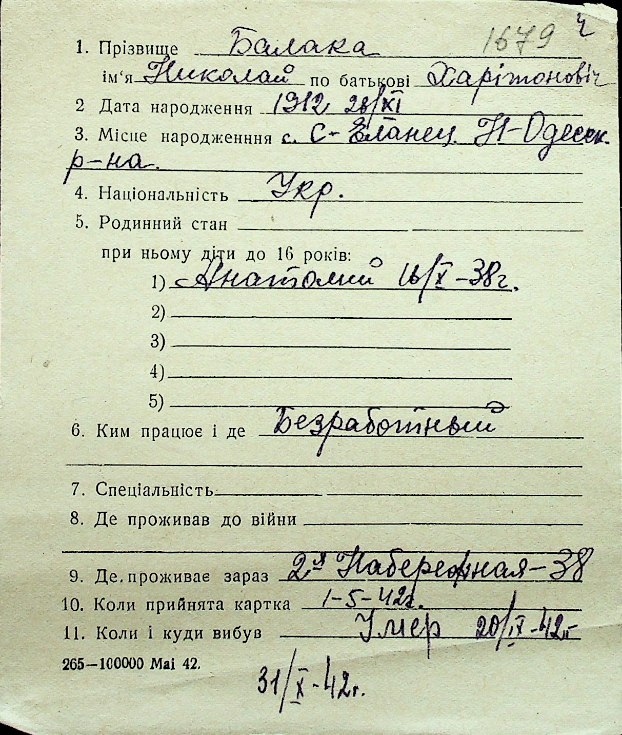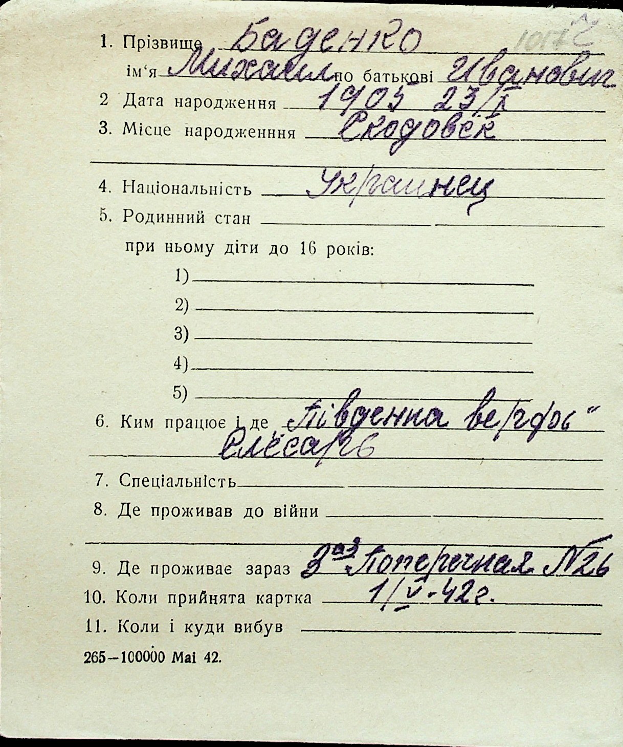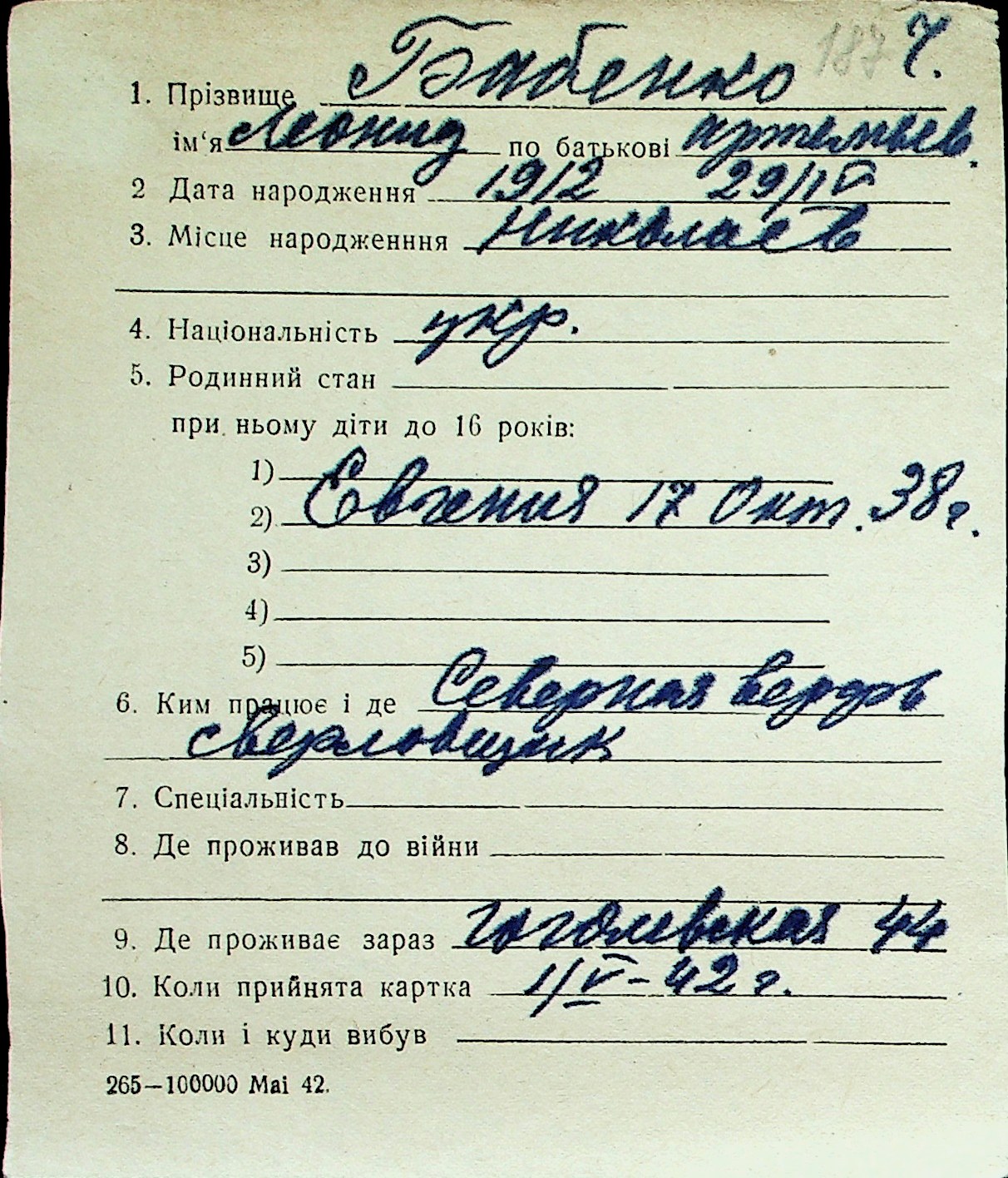 ◦ ◦ Перелік карток на осіб, які мешкали у м. Миколаїв у період окупації 1941–1944 років