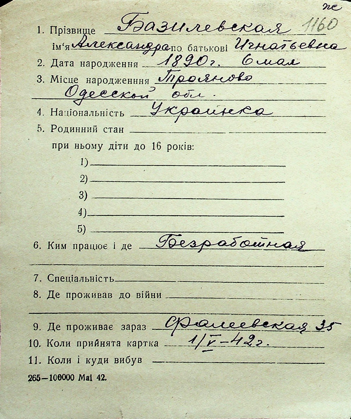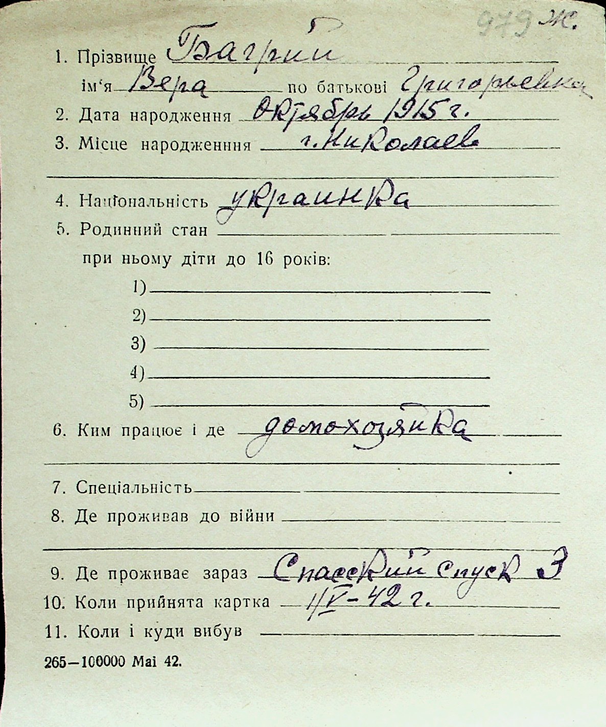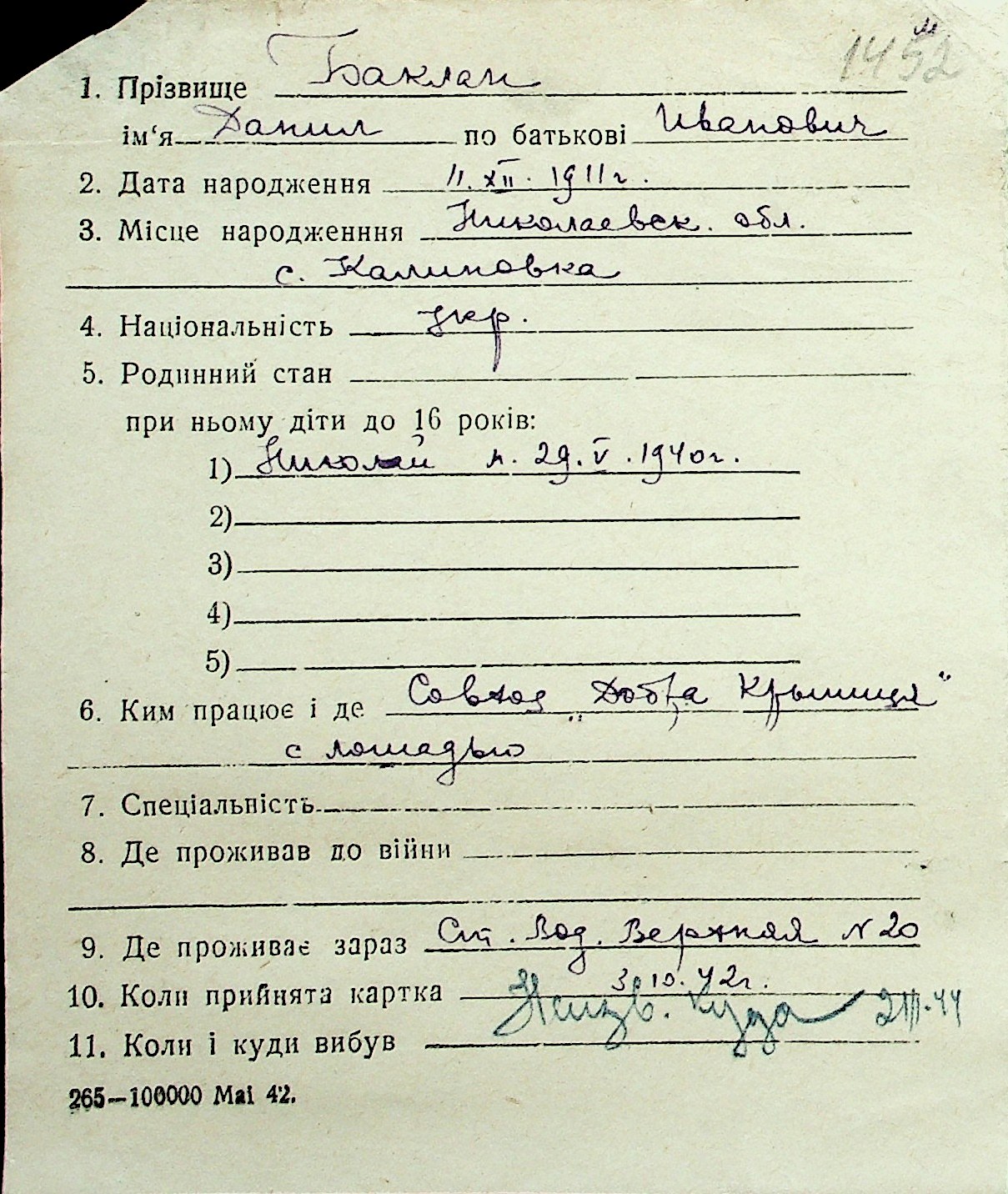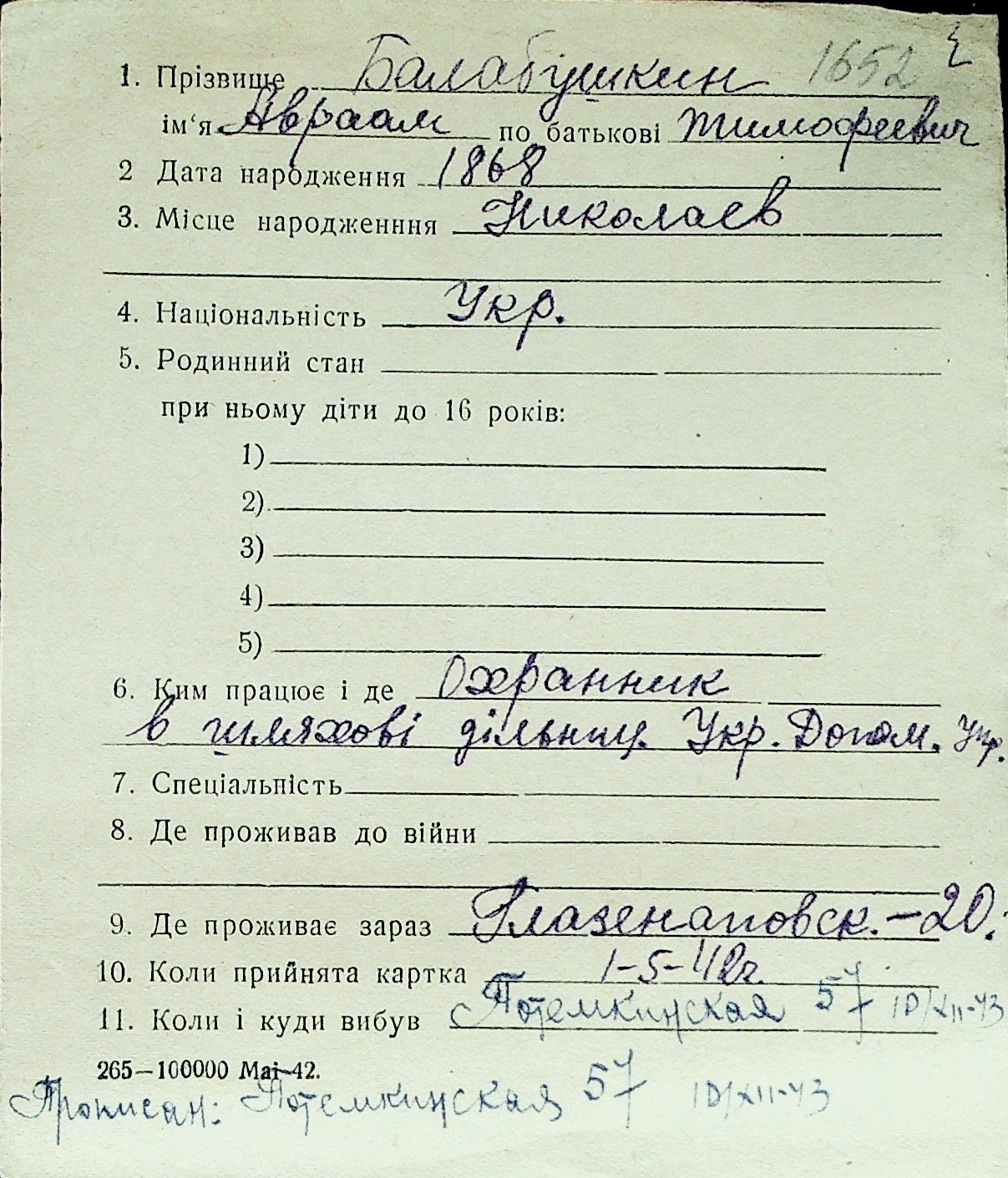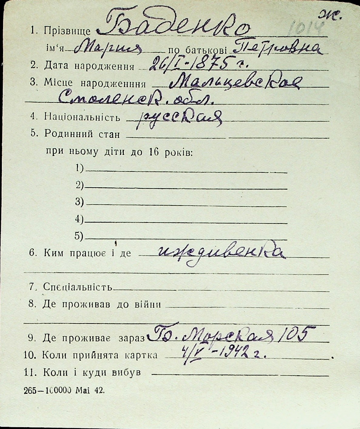 ◦ ◦ Перелік карток на осіб, які мешкали у м. Миколаїв у період окупації 1941–1944 років