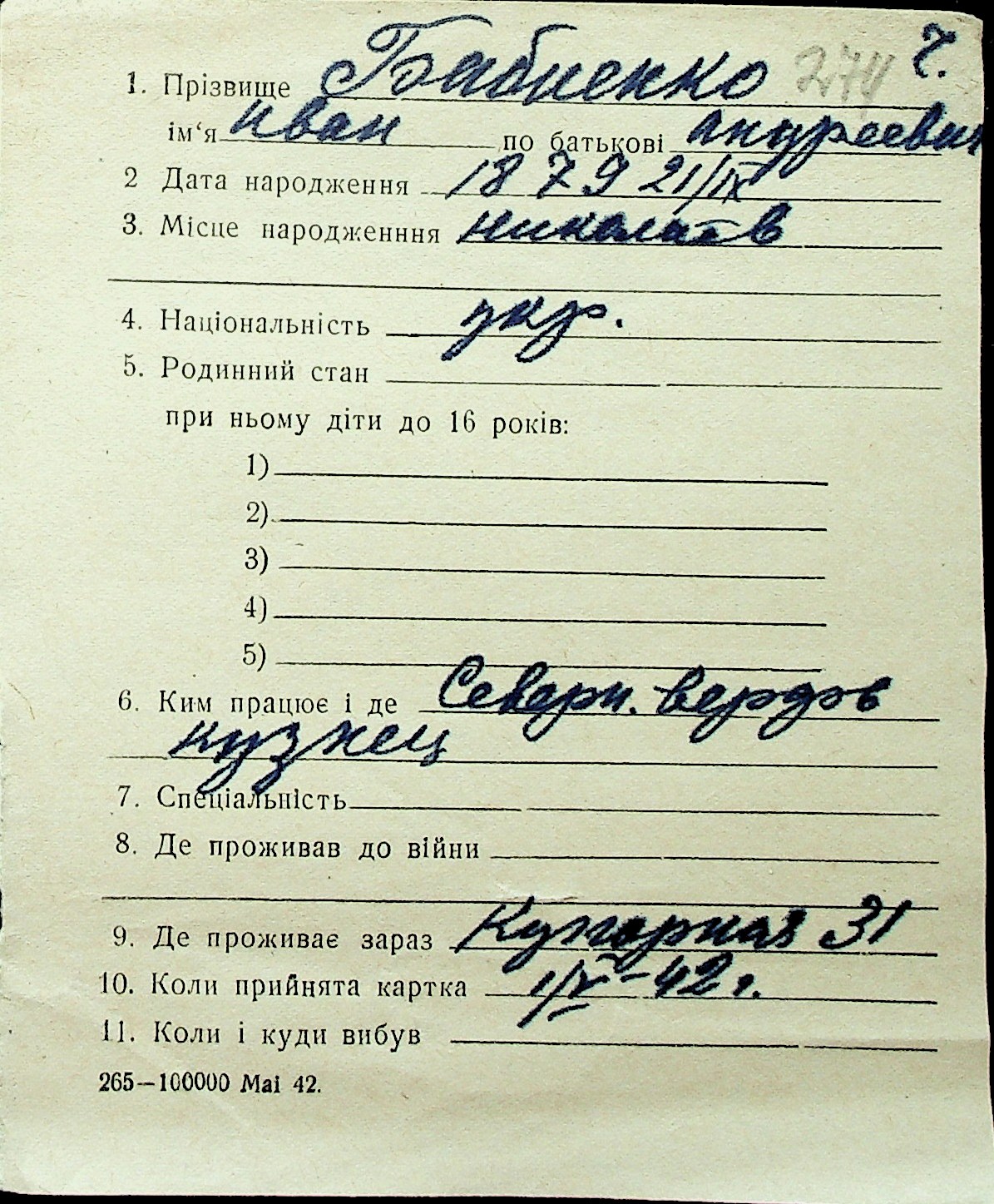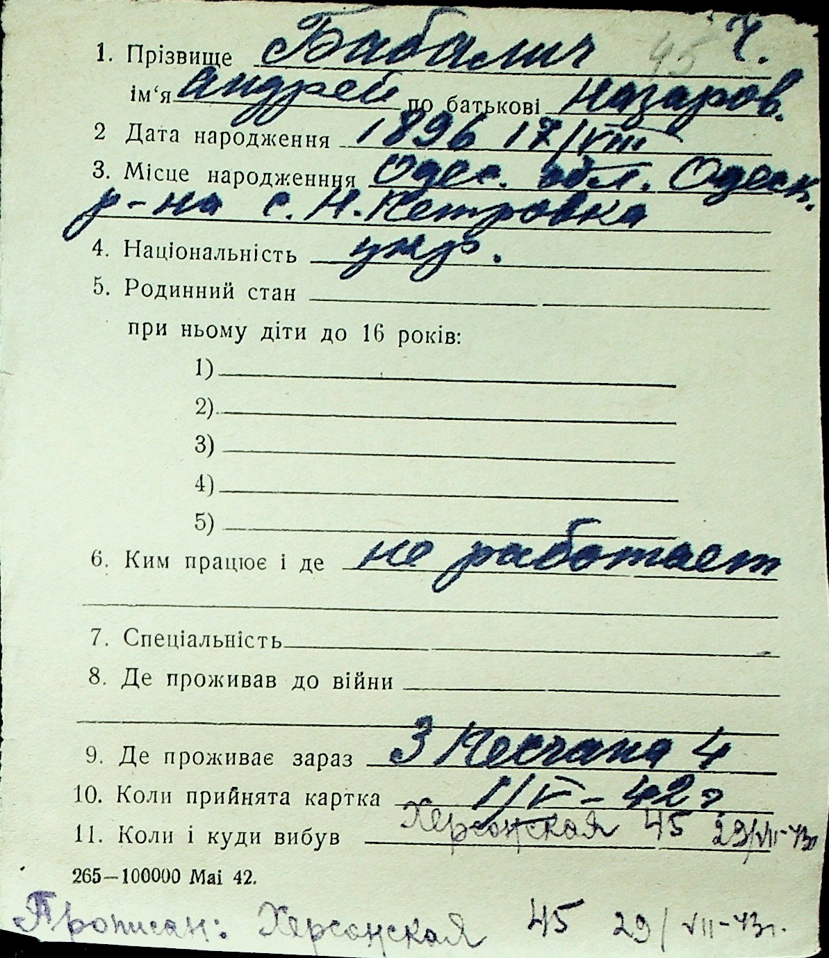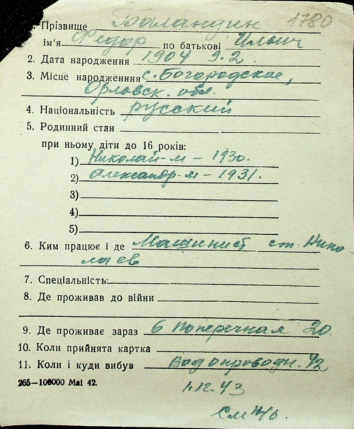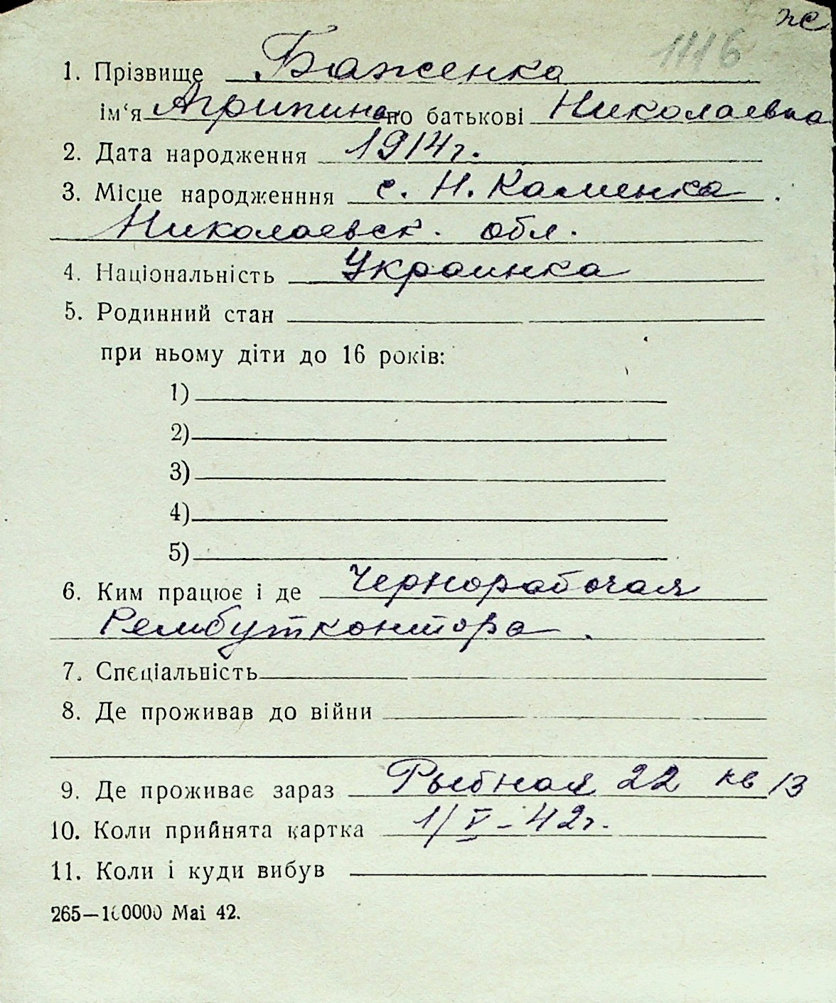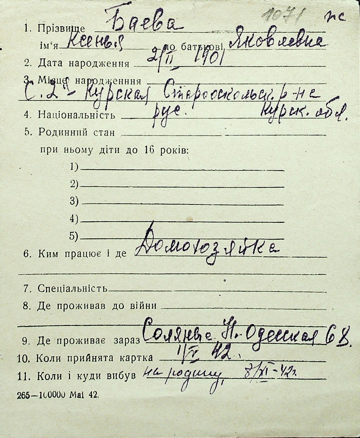 ◦ ◦ Перелік карток на осіб, які мешкали у м. Миколаїв у період окупації 1941–1944 років