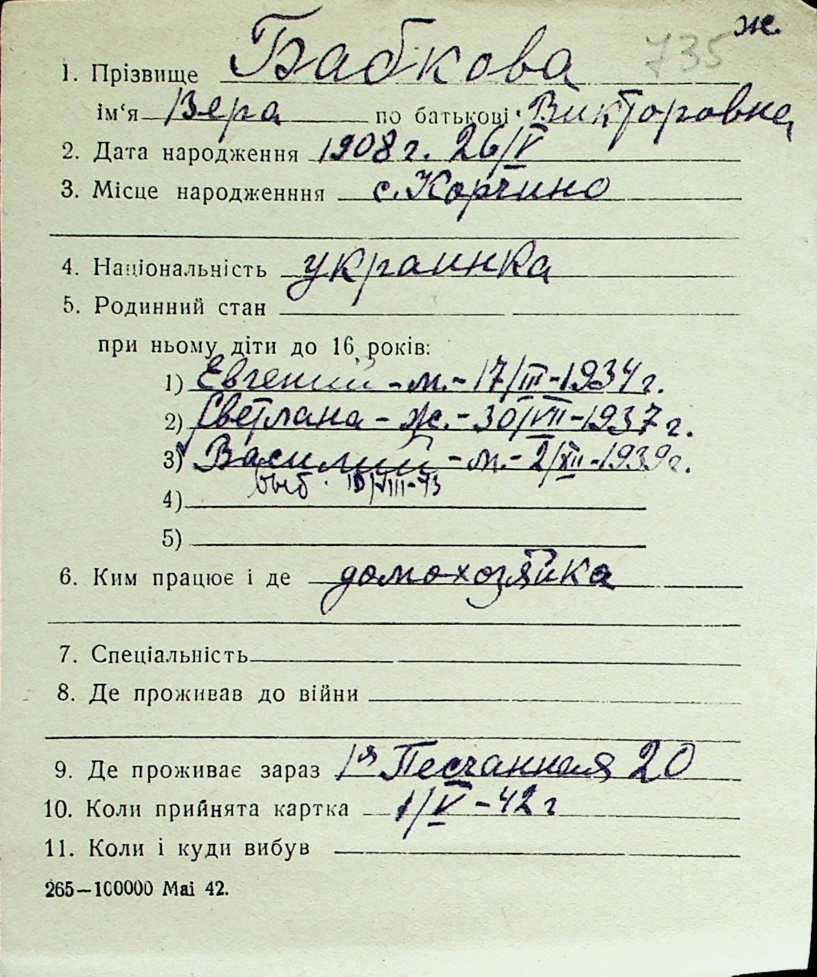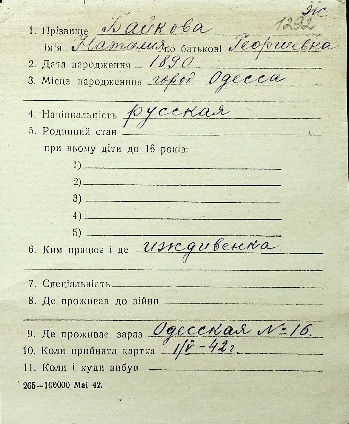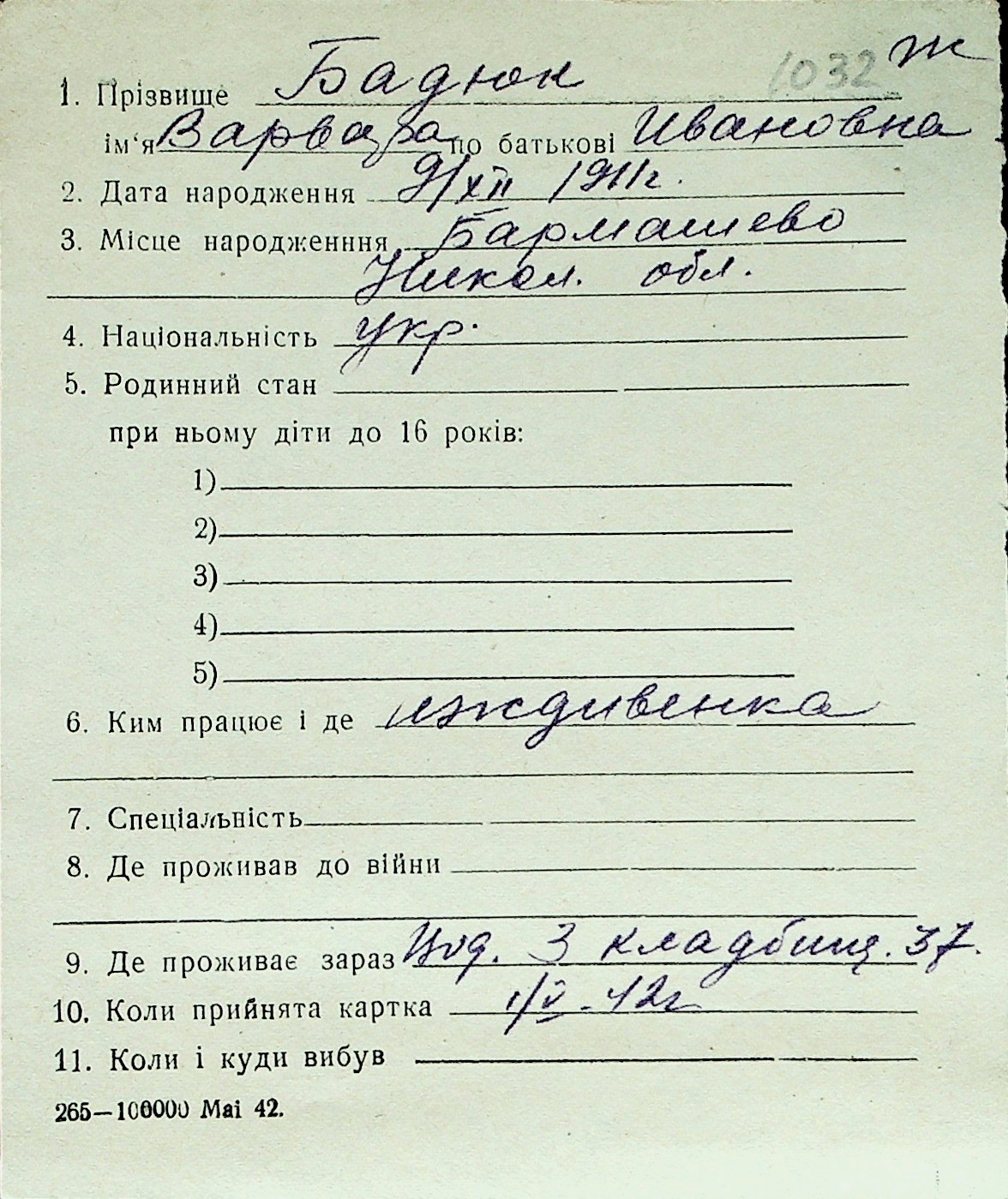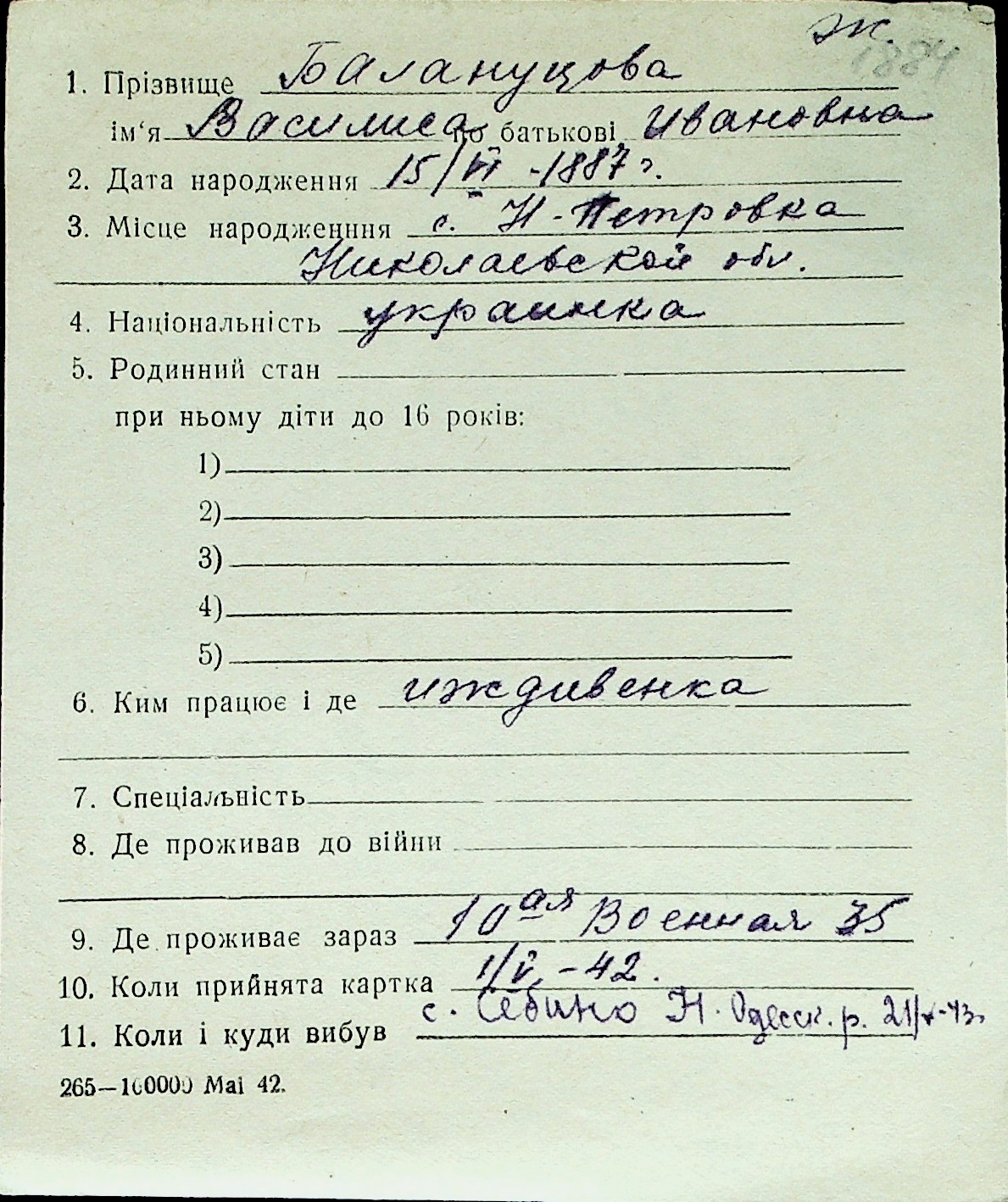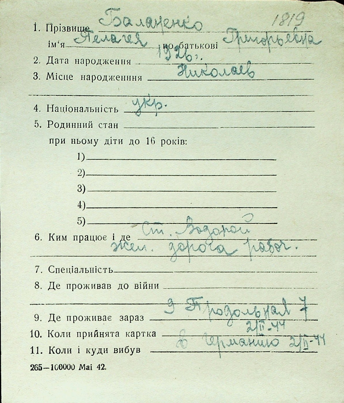 ◦ ◦ Перелік карток на осіб, які мешкали у м. Миколаїв у період окупації 1941–1944 років
