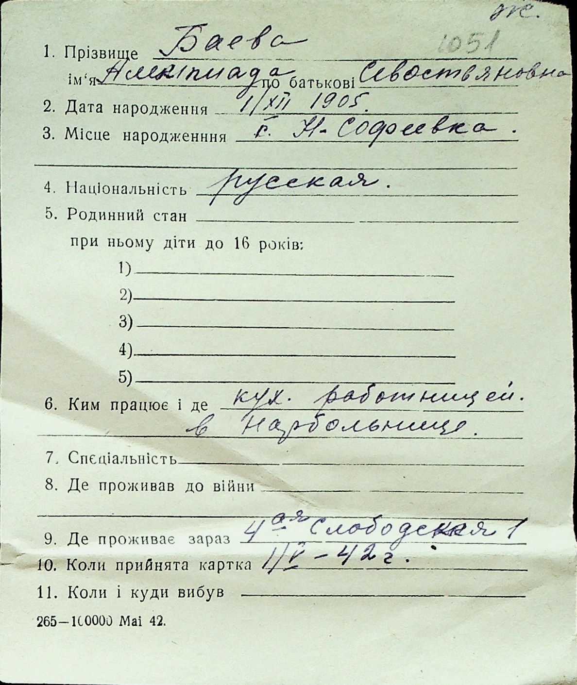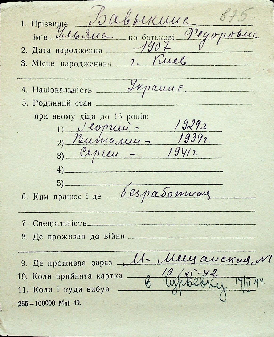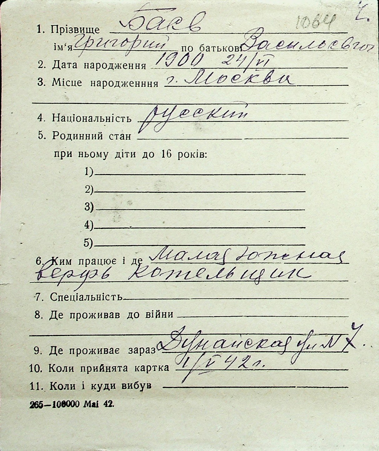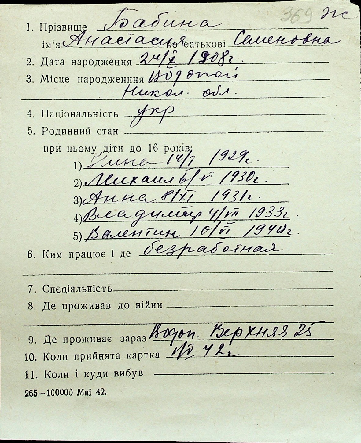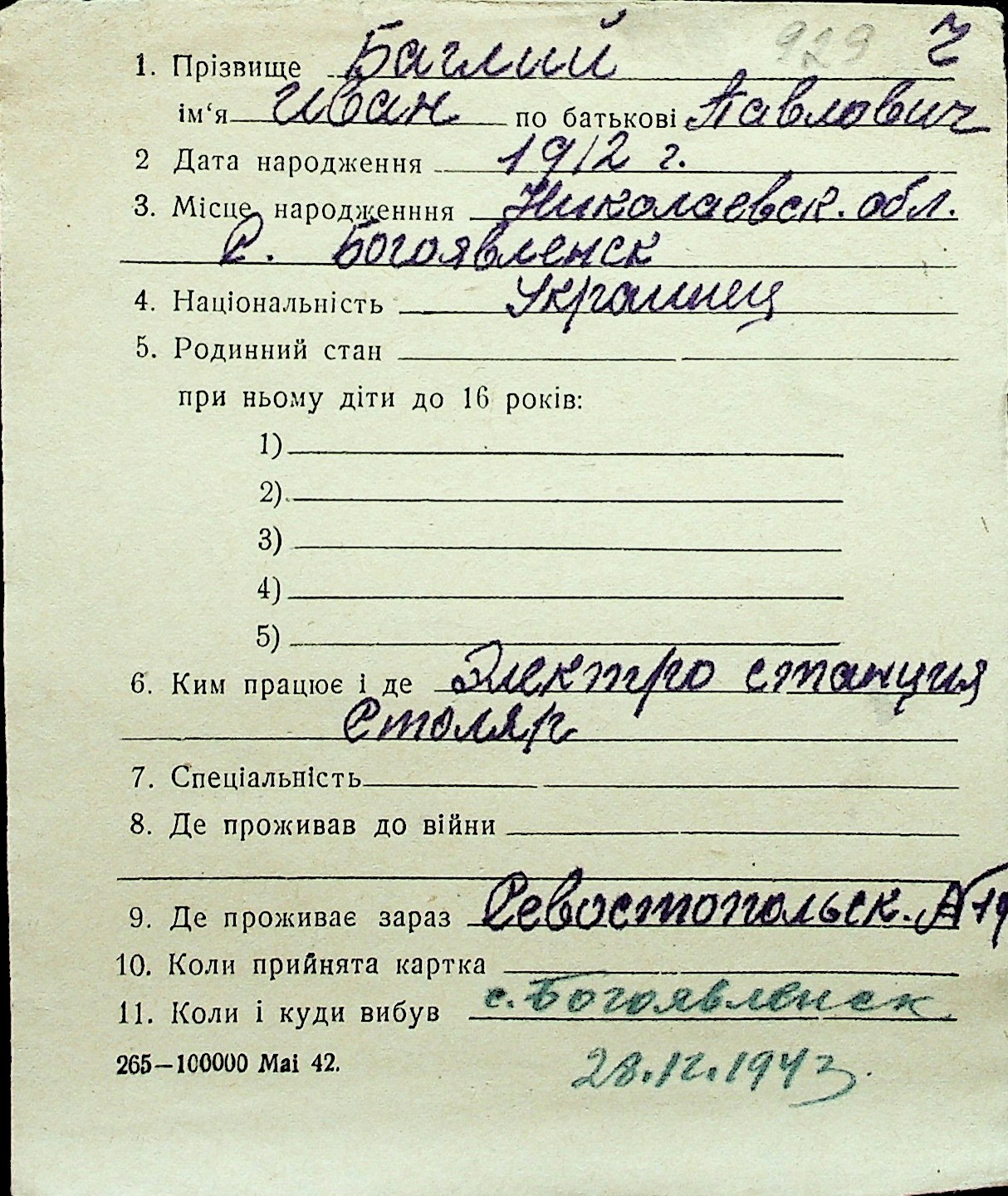◦ ◦ Перелік карток на осіб, які мешкали у м. Миколаїв у період окупації 1941–1944 років