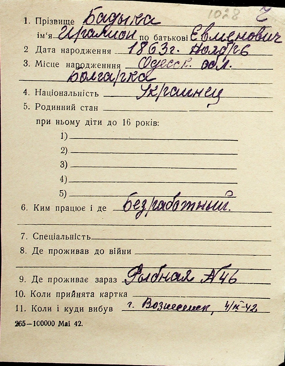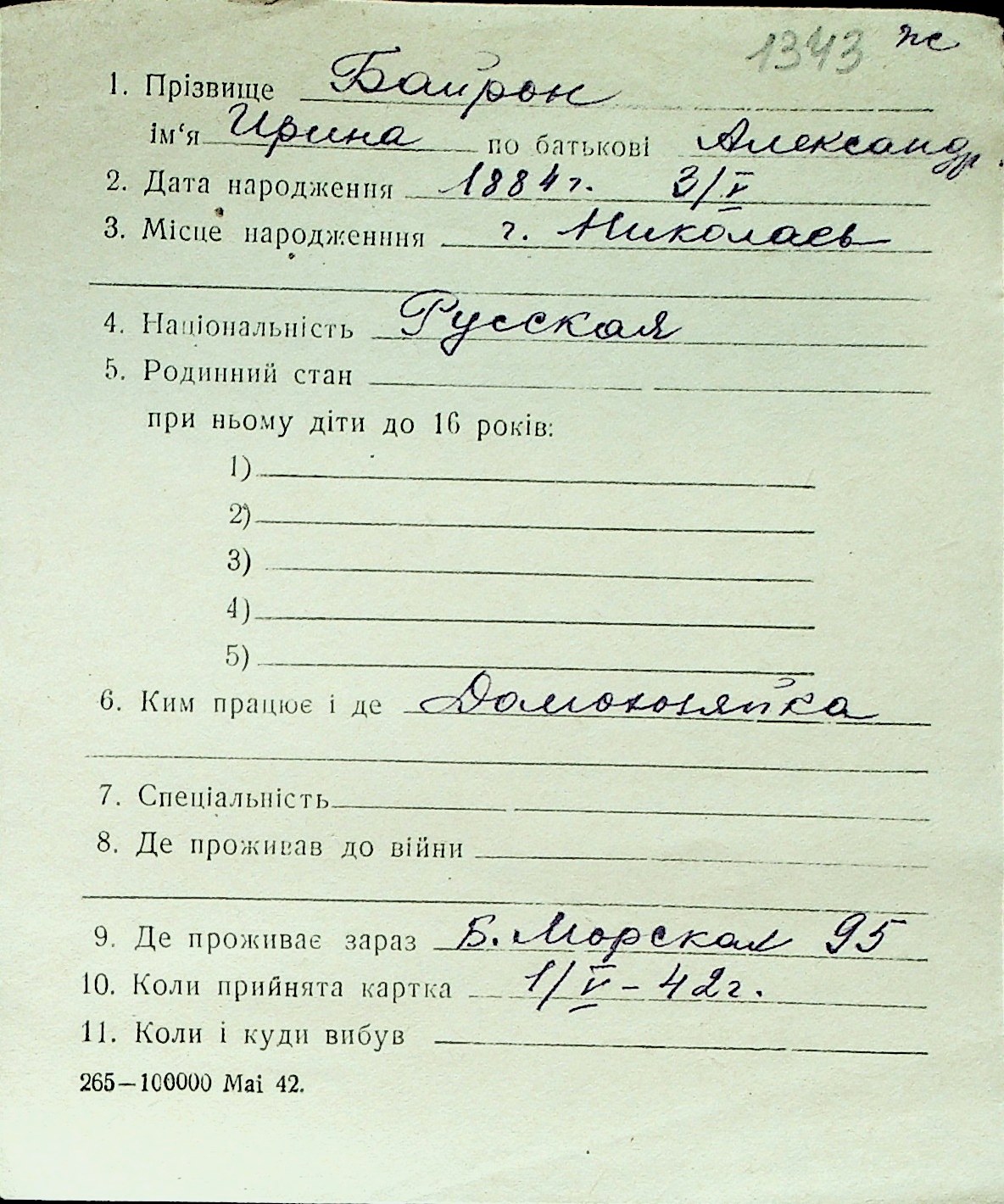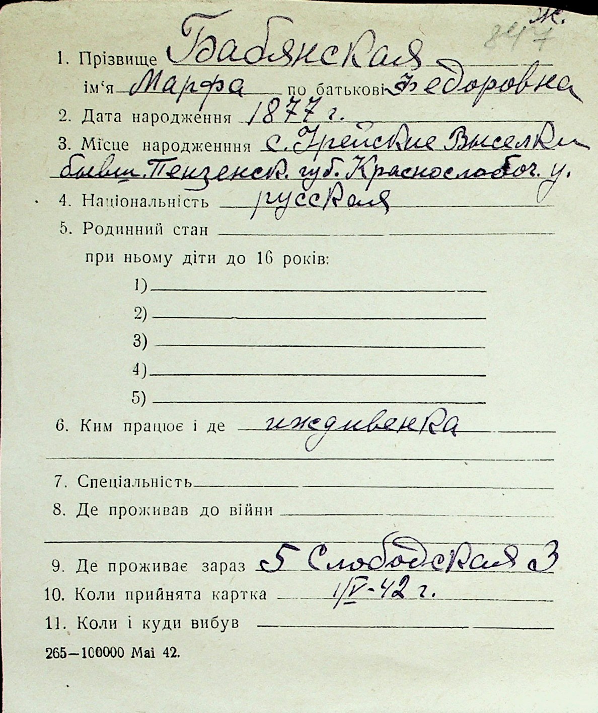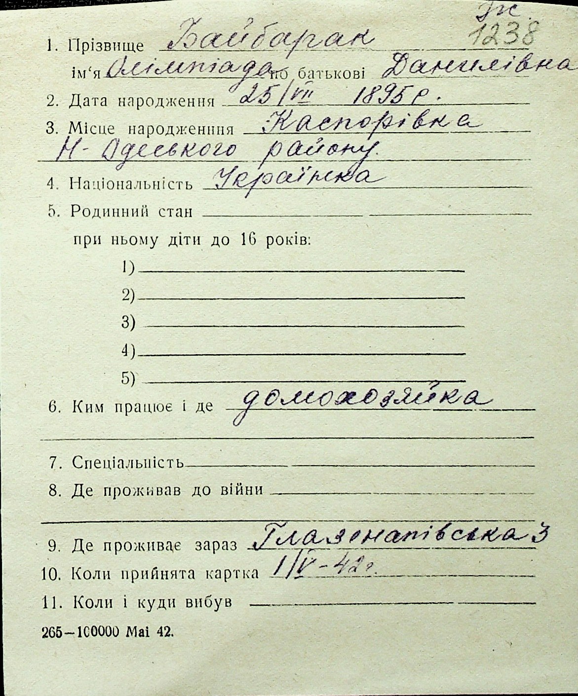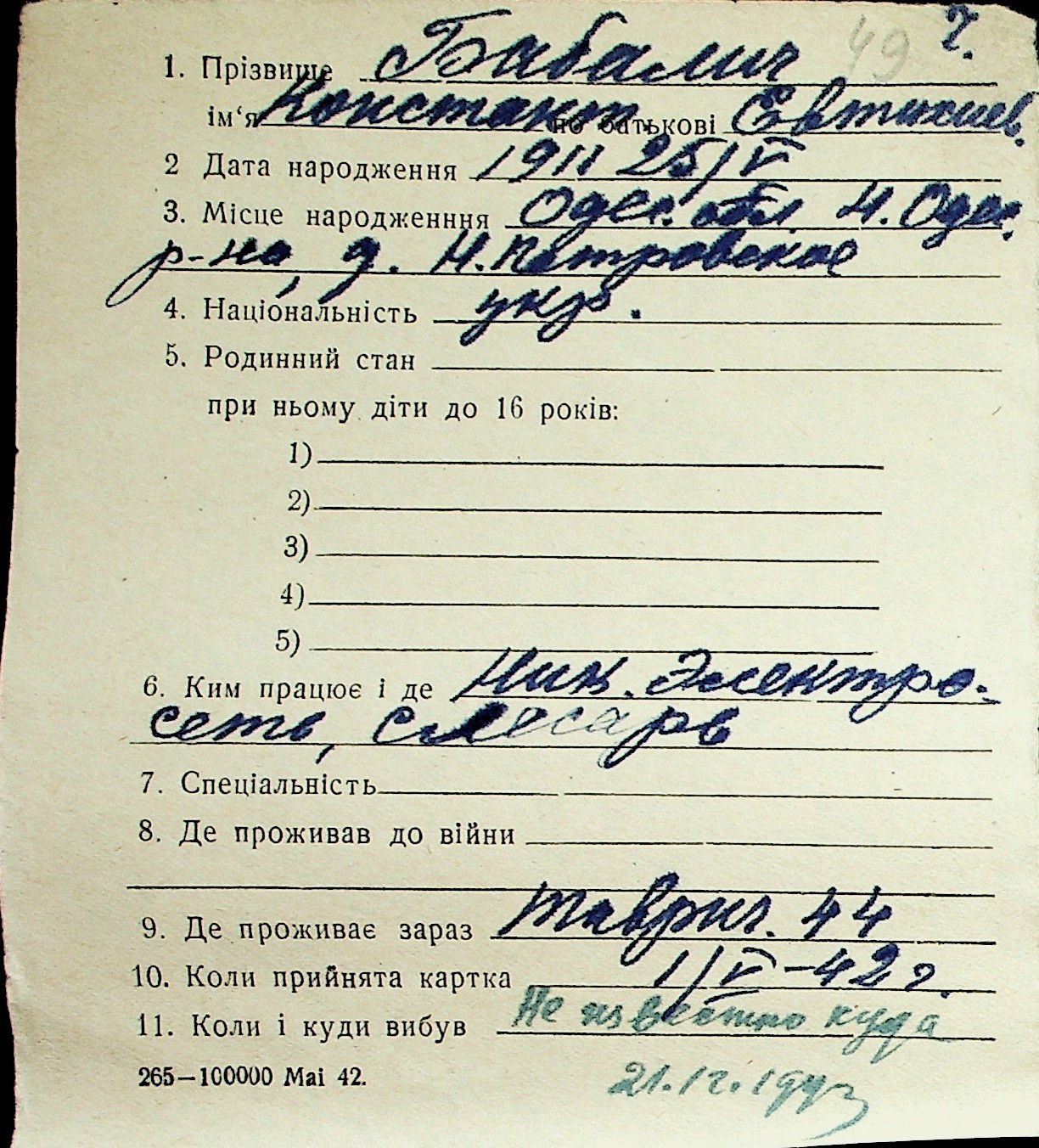 ◦ ◦ Перелік карток на осіб, які мешкали у м. Миколаїв у період окупації 1941–1944 років