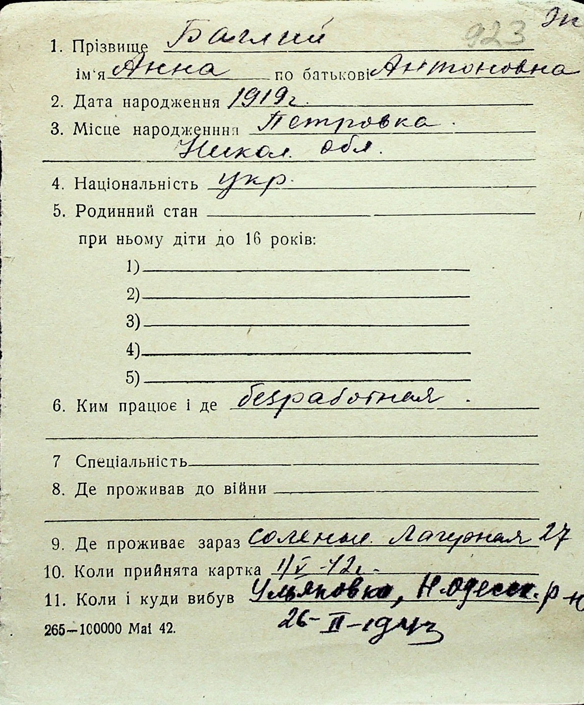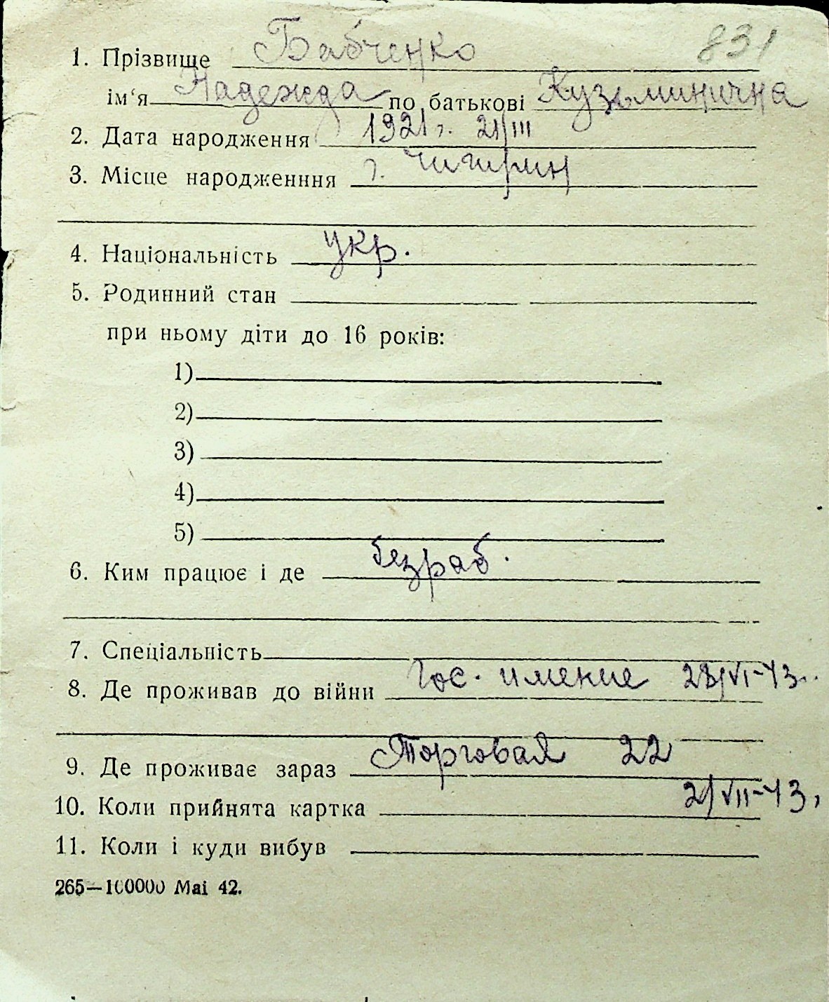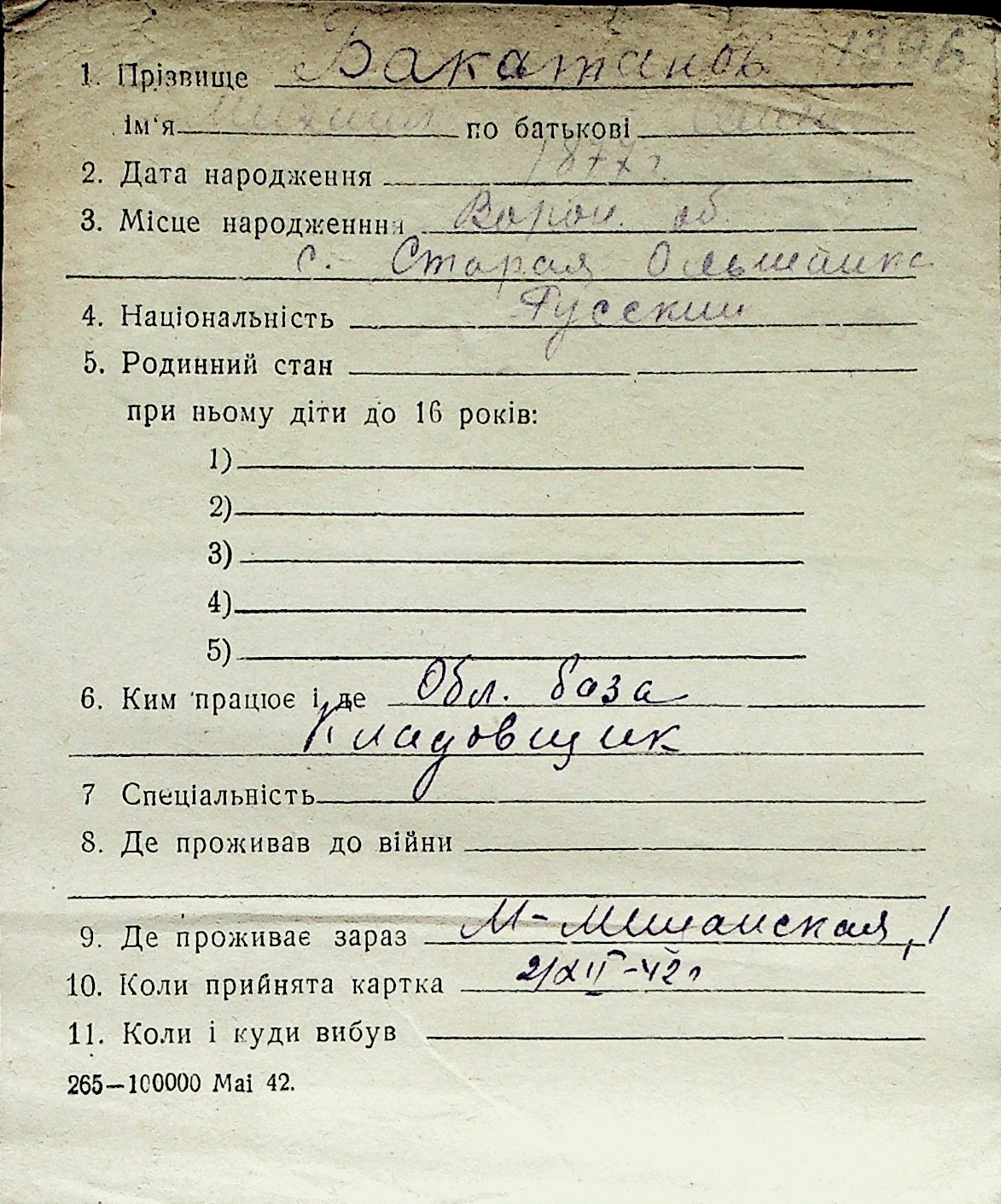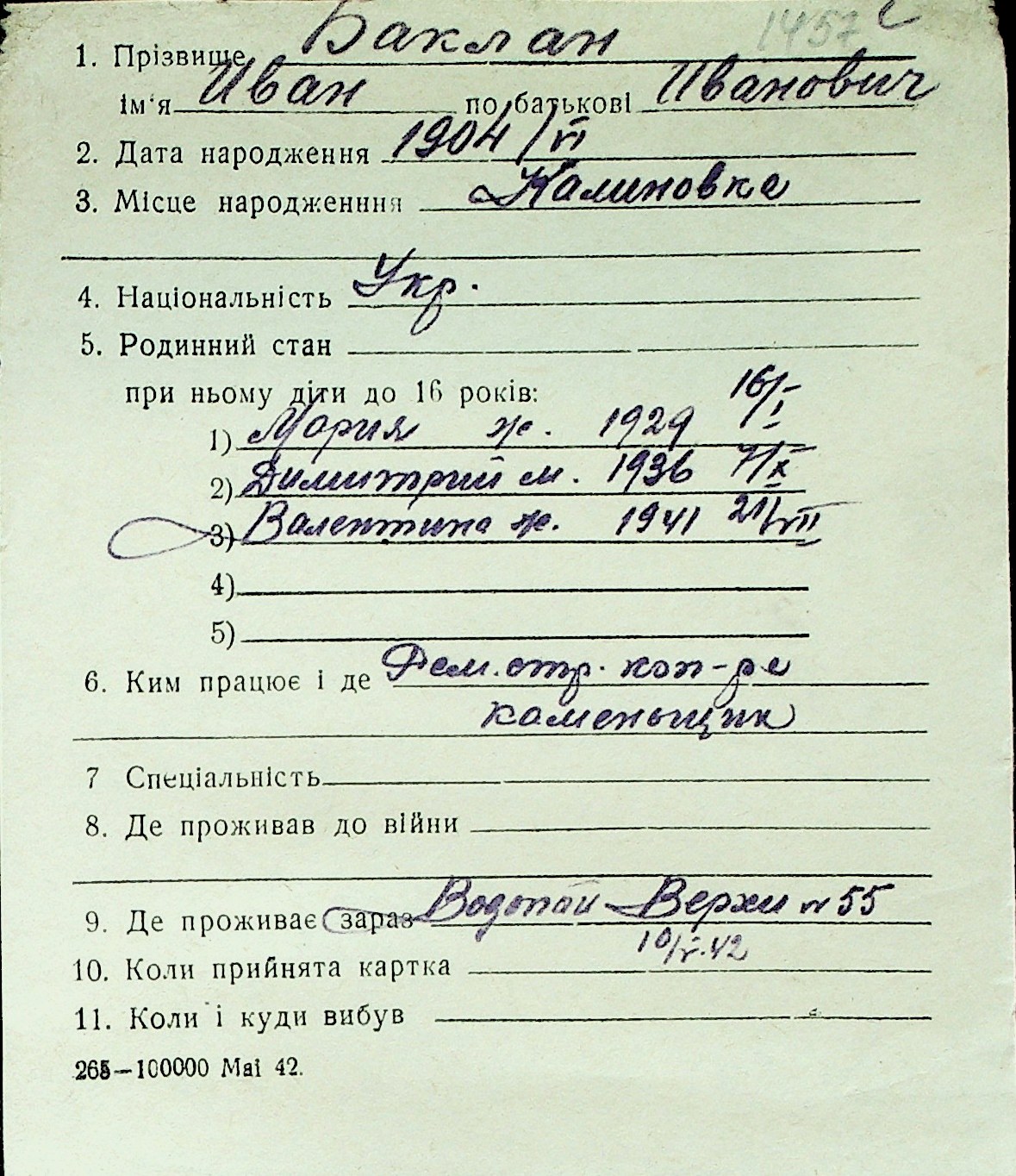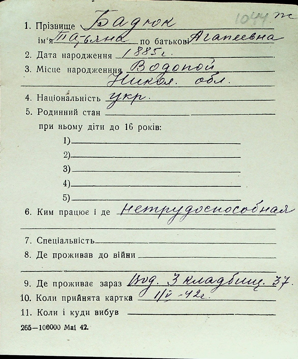 ◦ ◦ Перелік карток на осіб, які мешкали у м. Миколаїв у період окупації 1941–1944 років