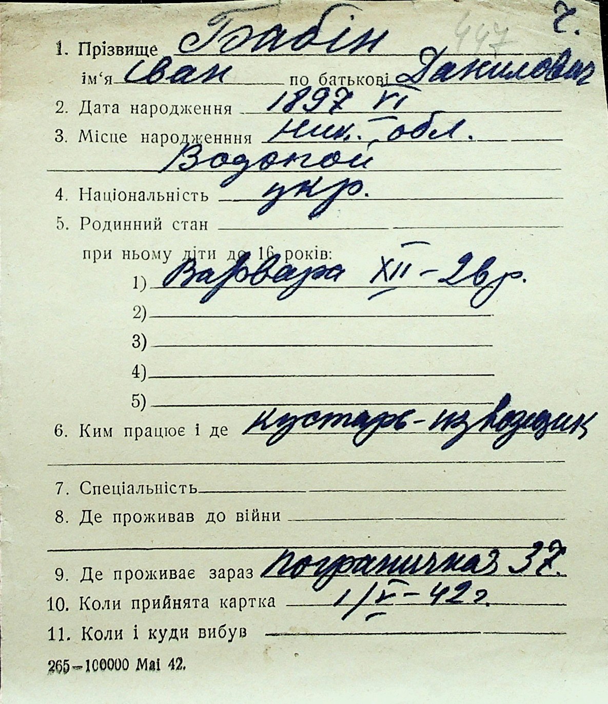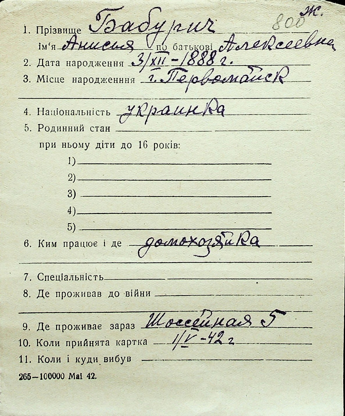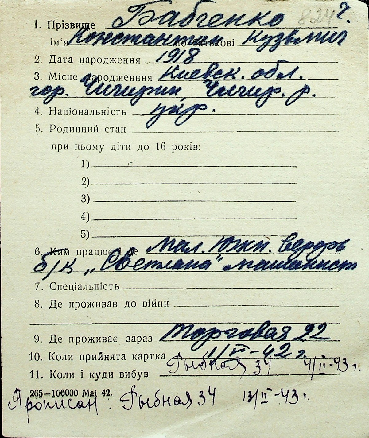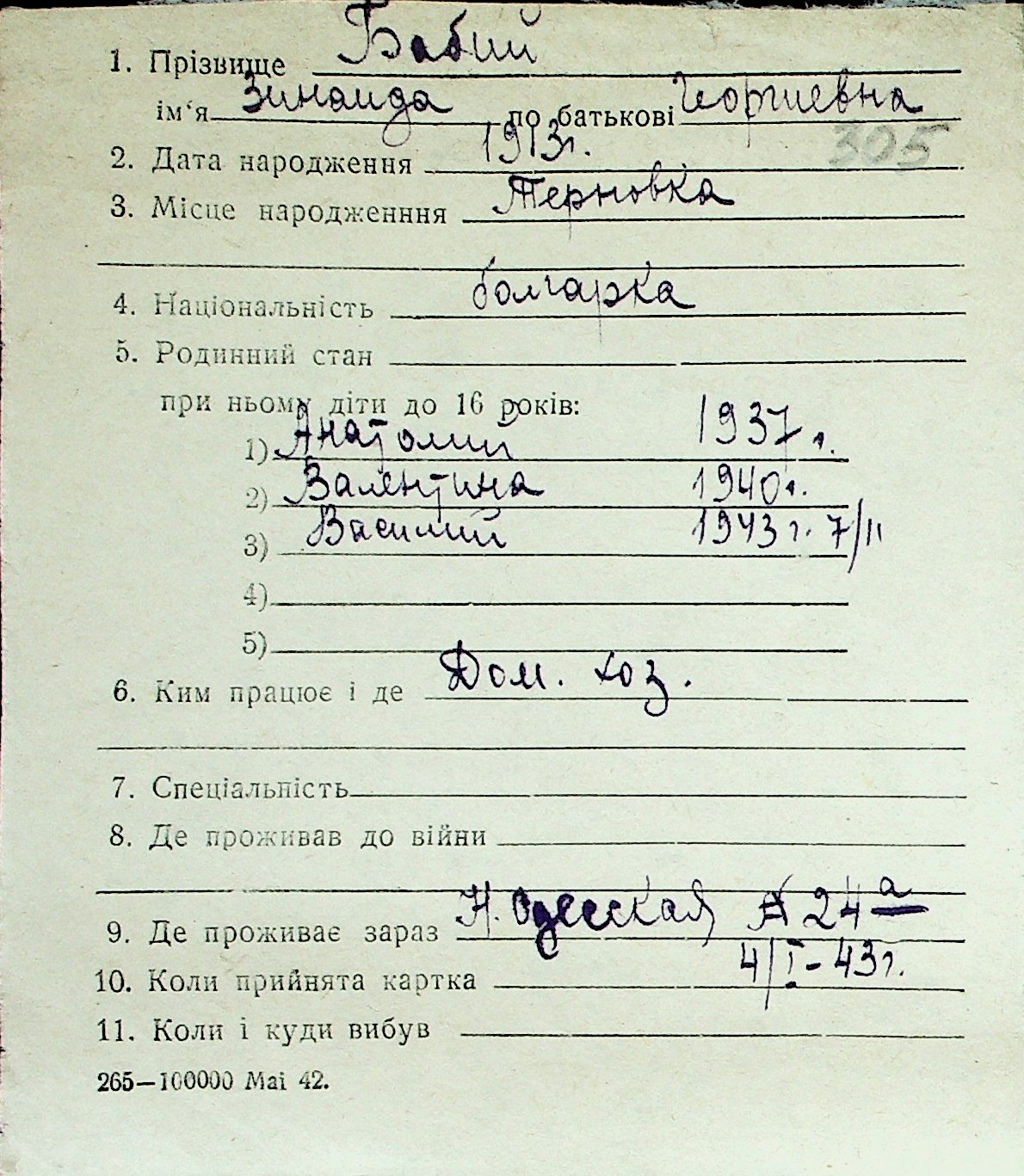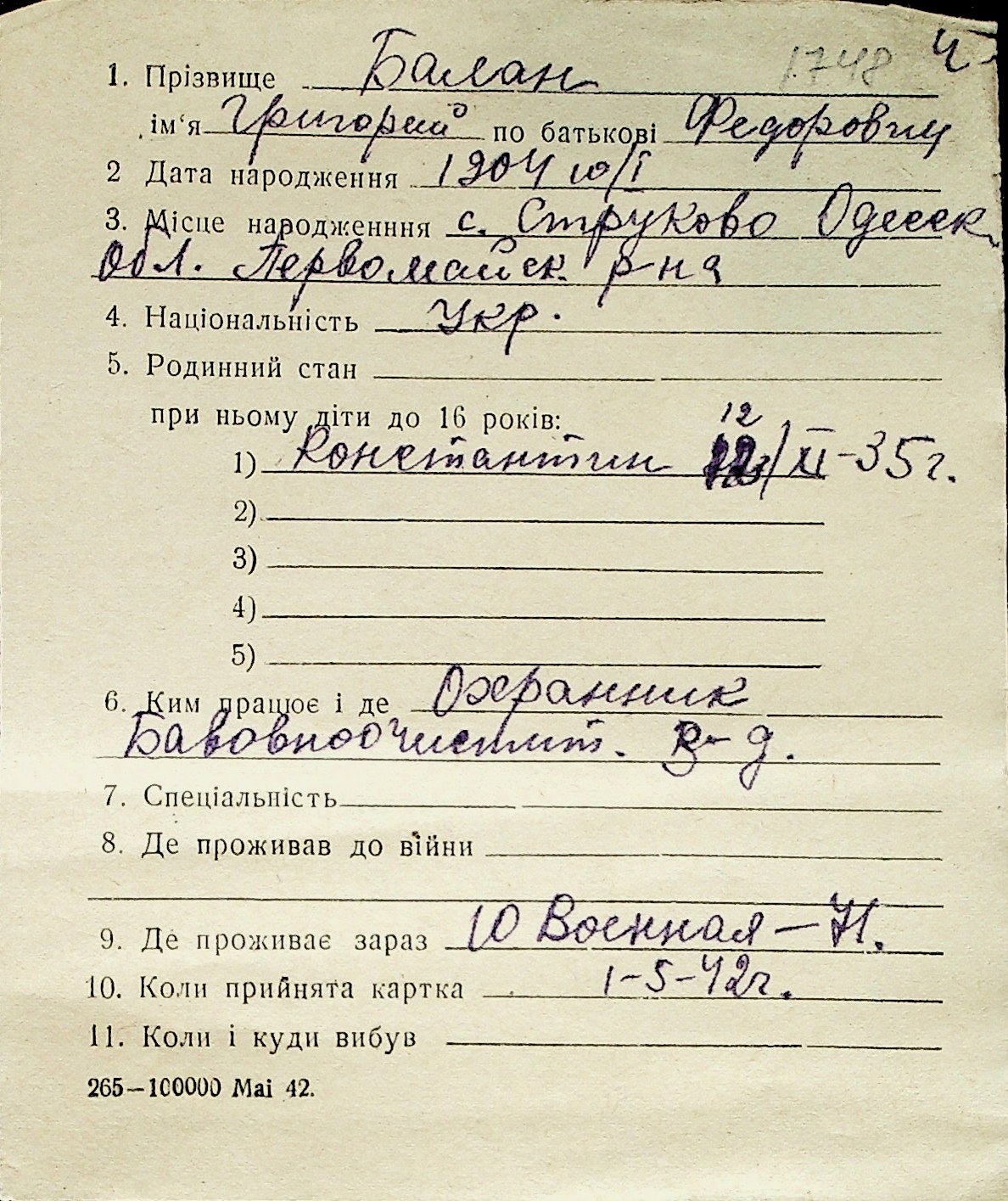◦ ◦ Перелік карток на осіб, які мешкали у м. Миколаїв у період окупації 1941–1944 років