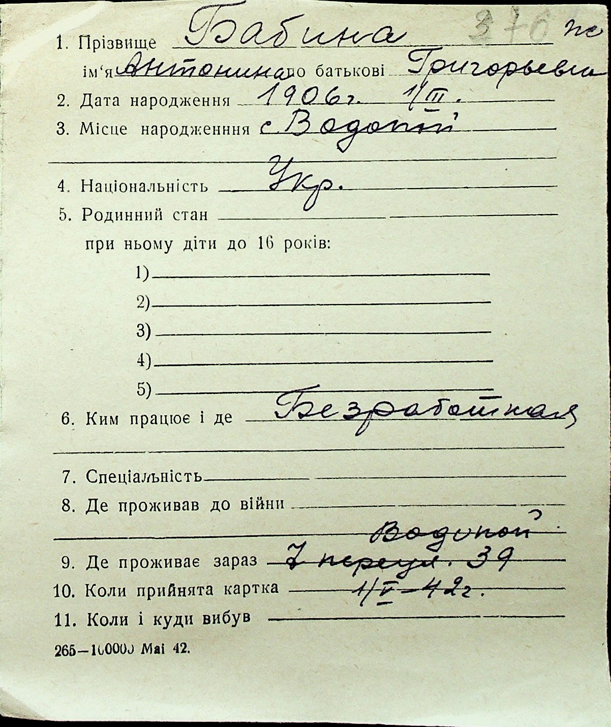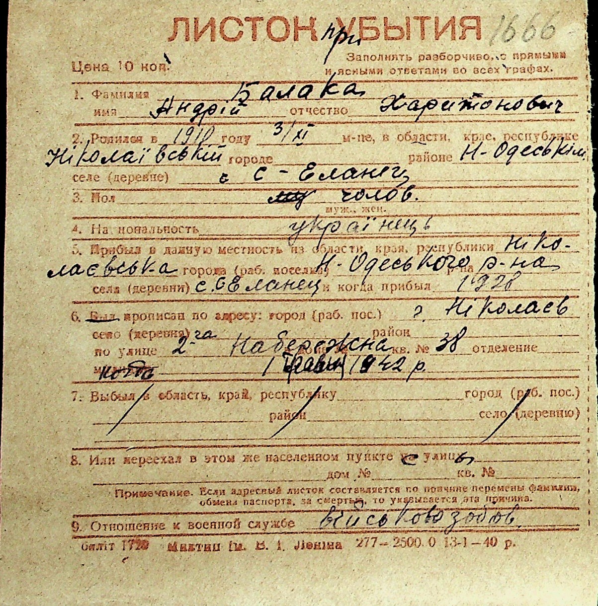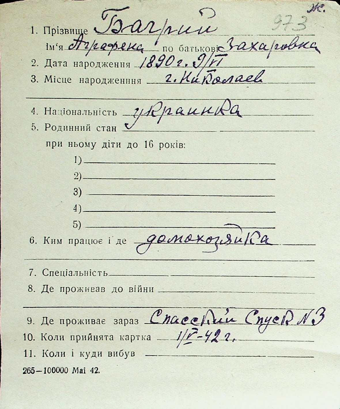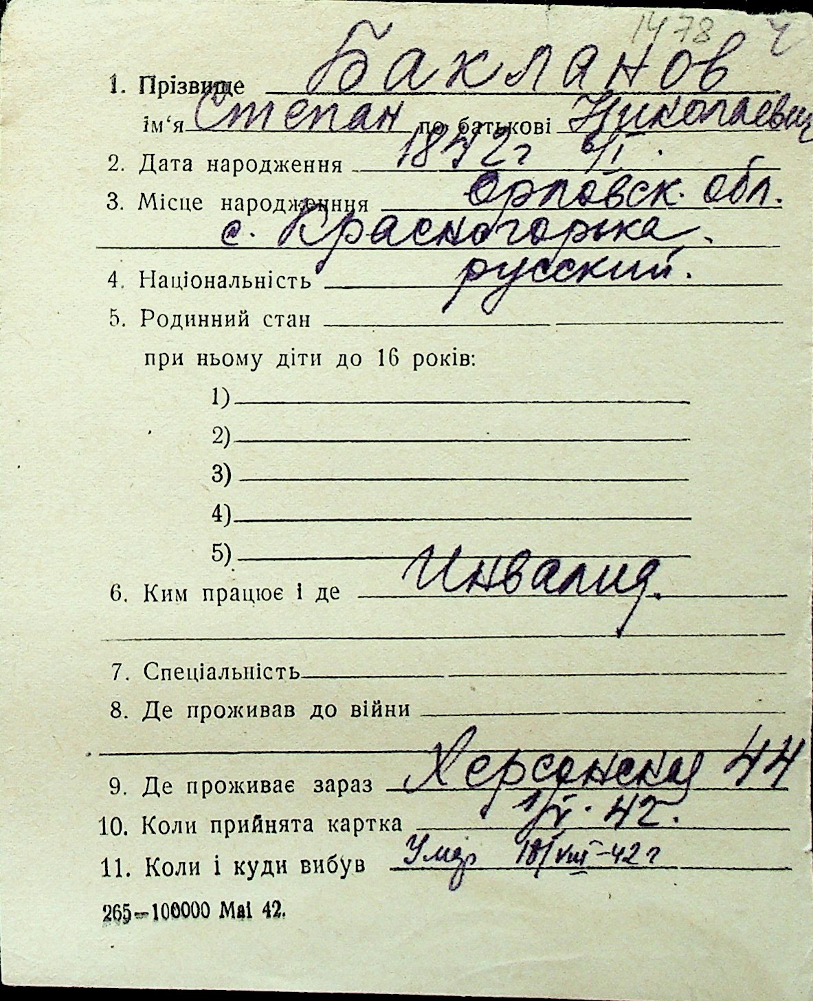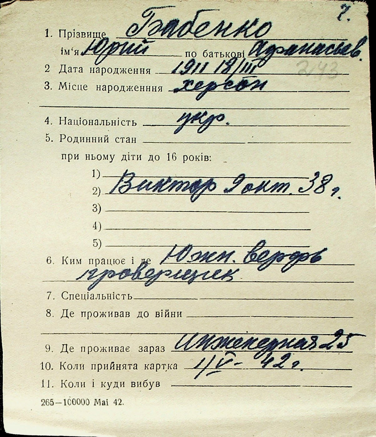 ◦ ◦ Перелік карток на осіб, які мешкали у м. Миколаїв у період окупації 1941–1944 років