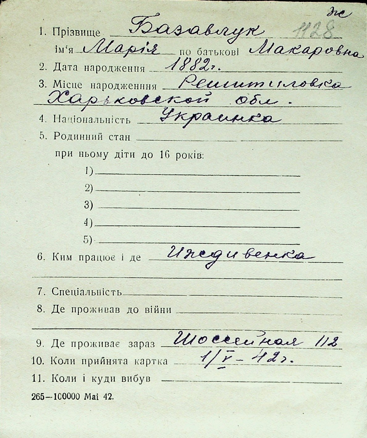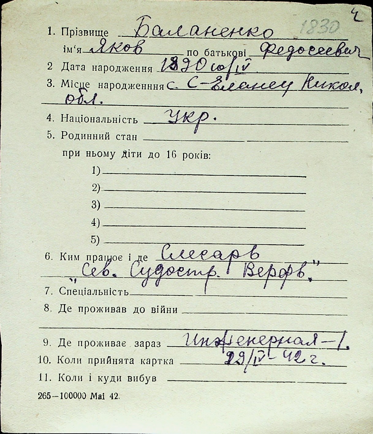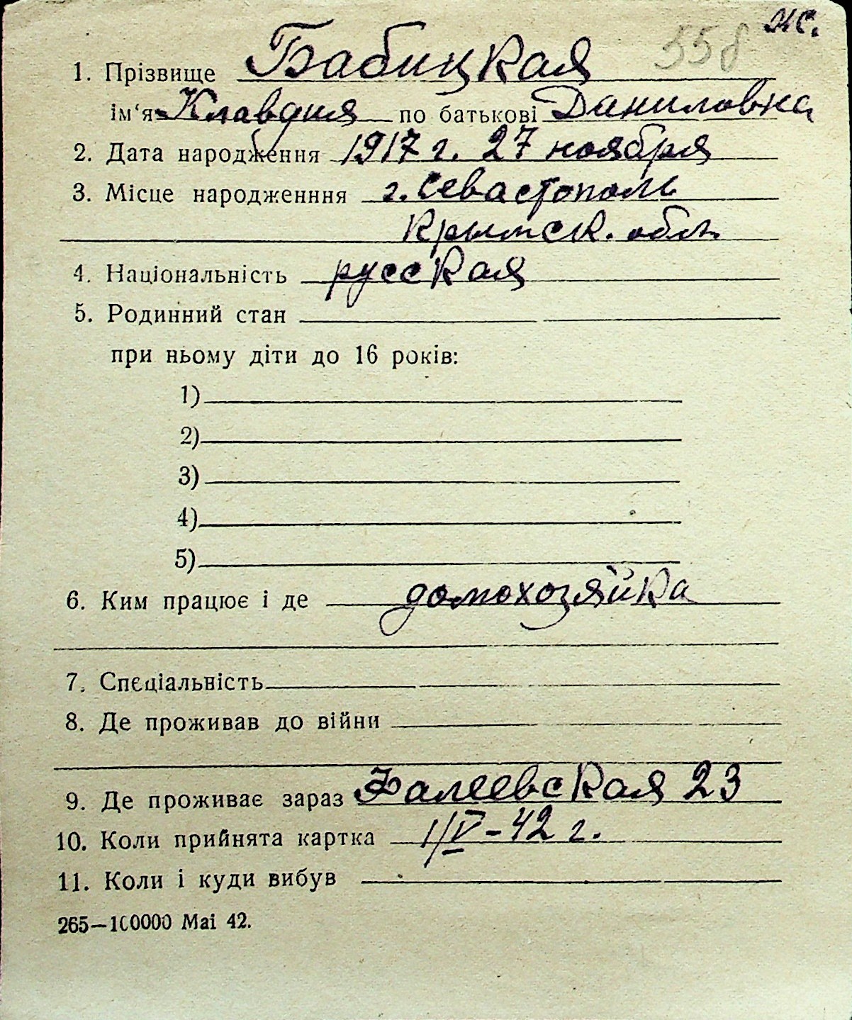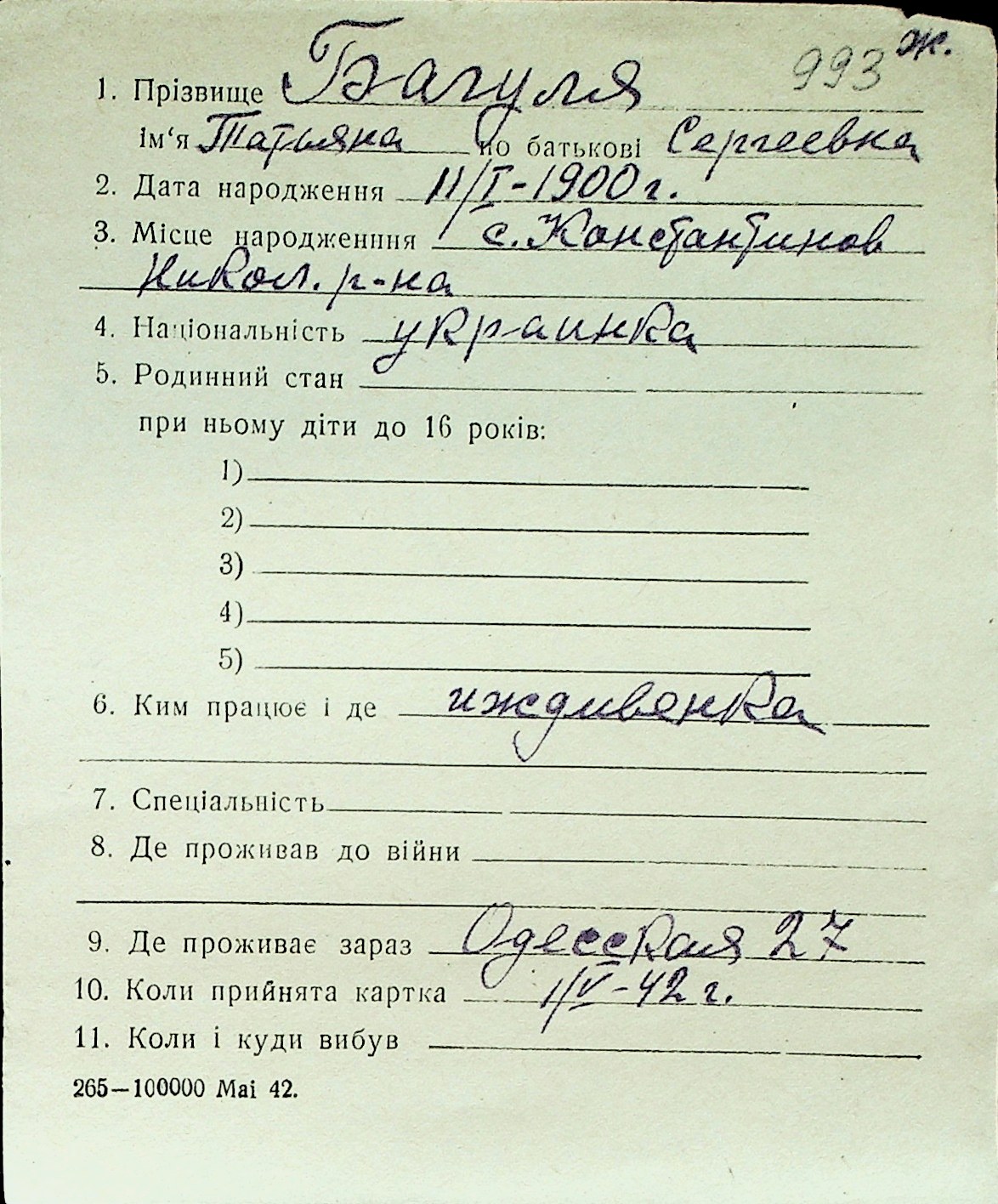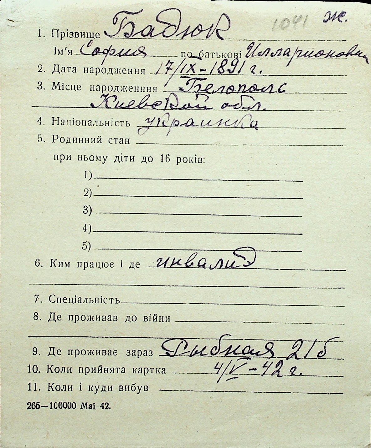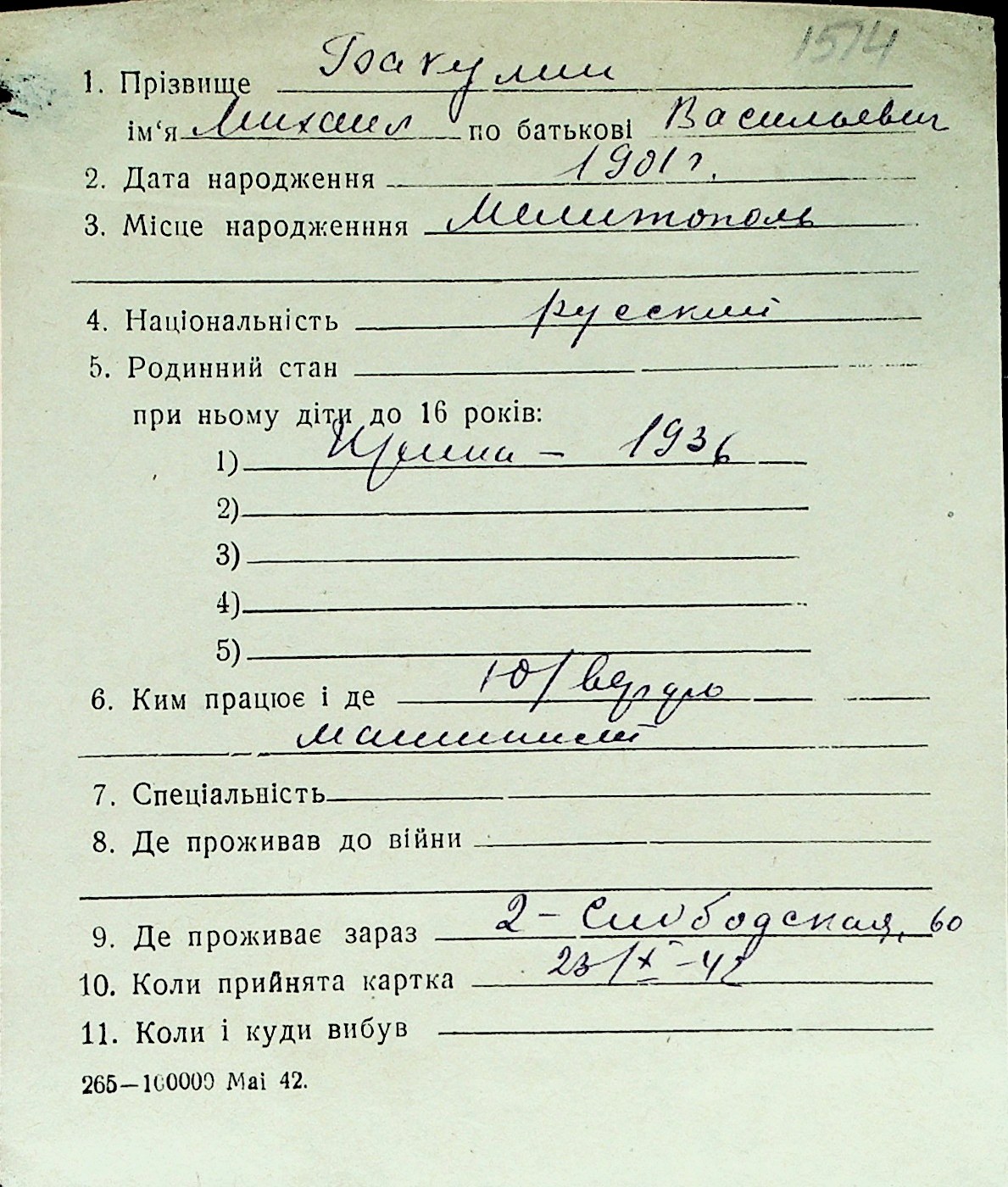 ◦ ◦ Перелік карток на осіб, які мешкали у м. Миколаїв у період окупації 1941–1944 років