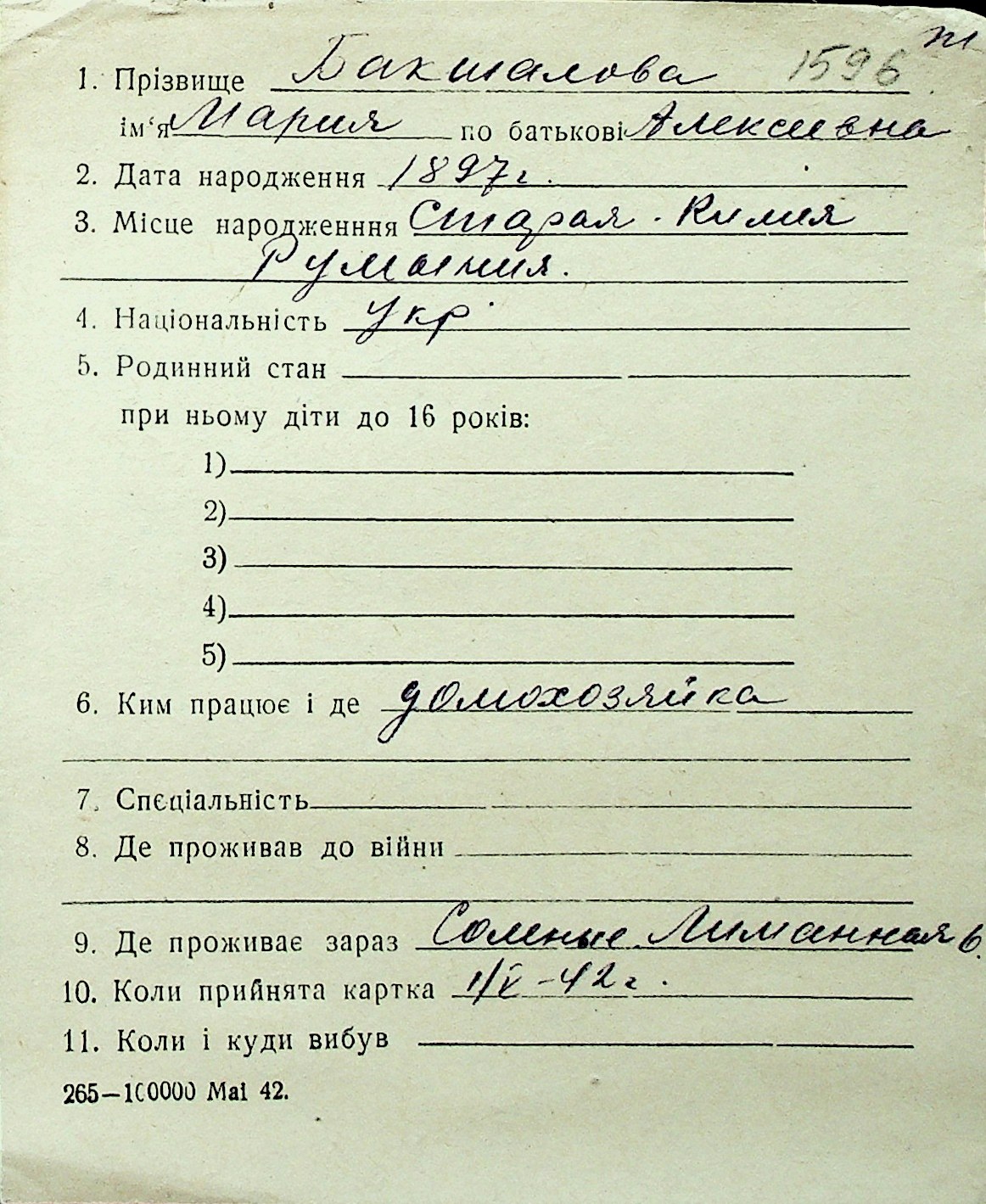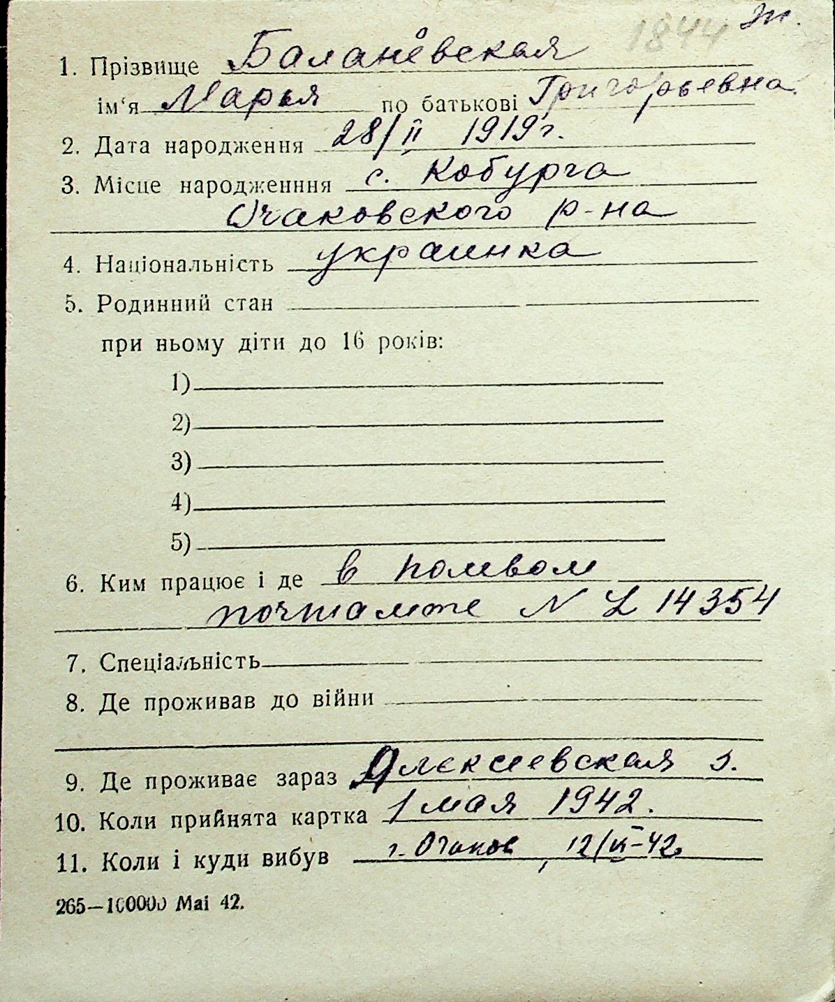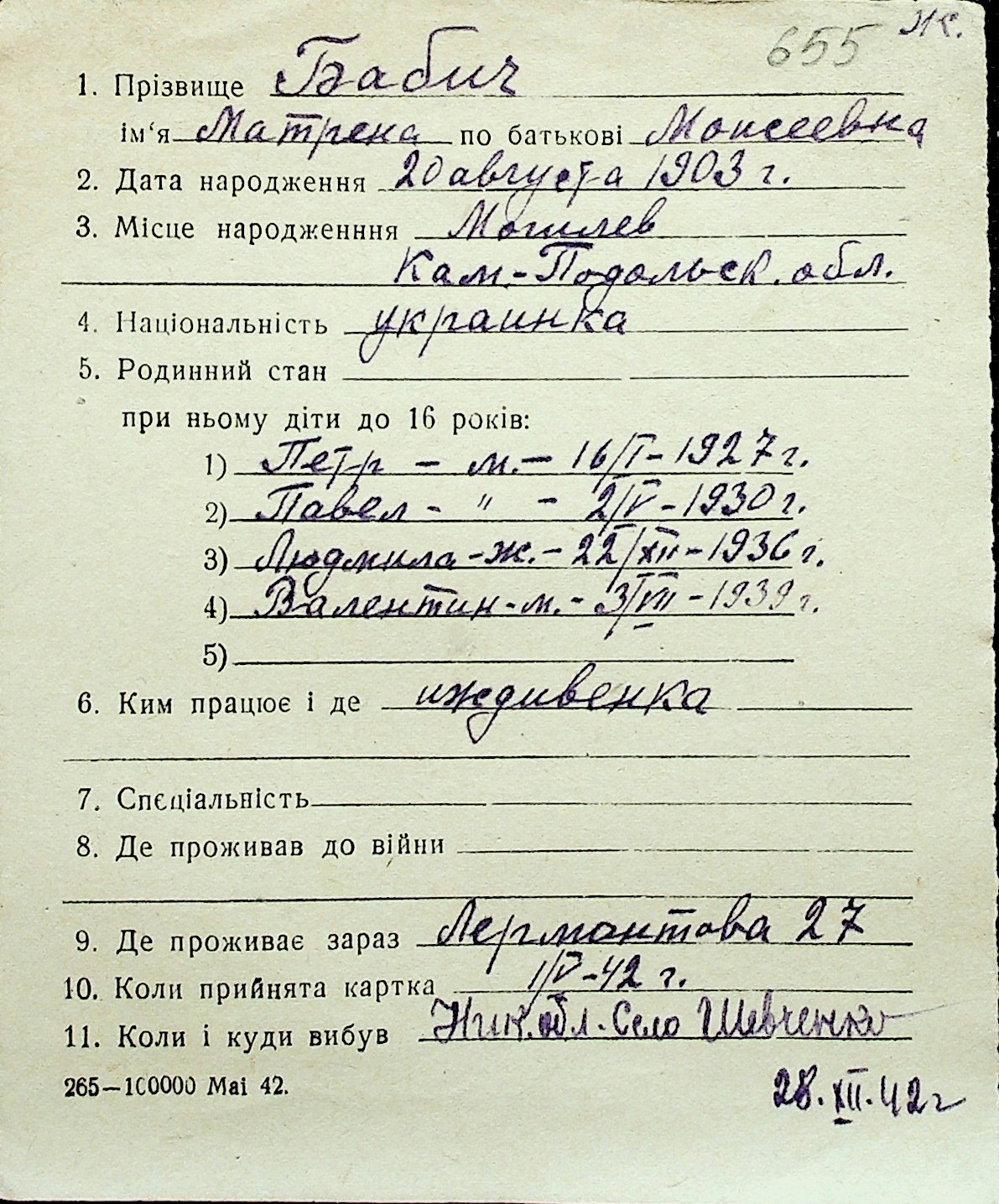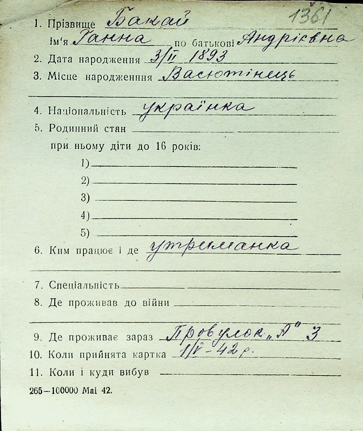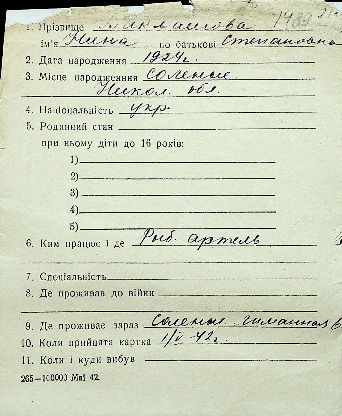 ◦ ◦ Перелік карток на осіб, які мешкали у м. Миколаїв у період окупації 1941–1944 років