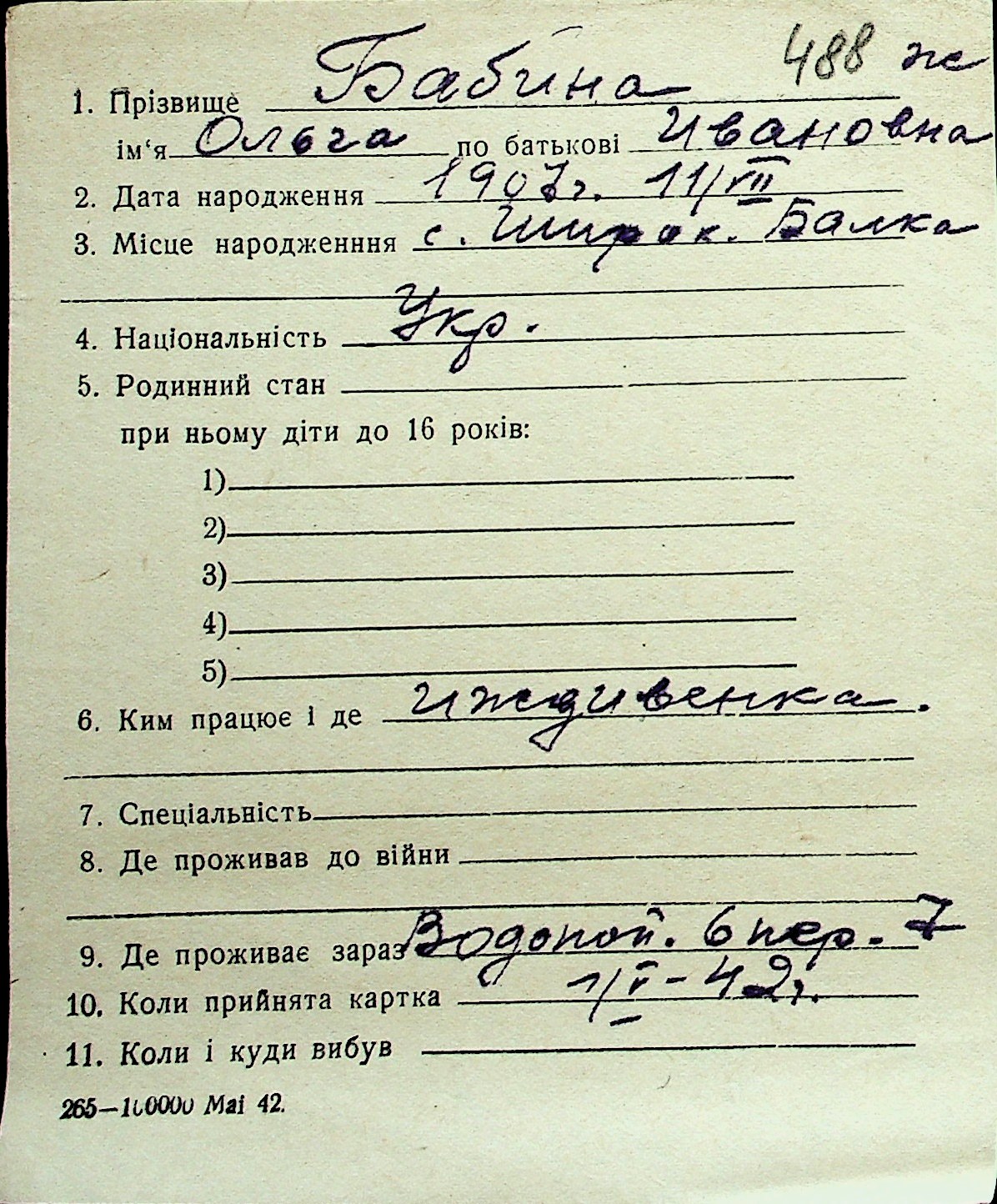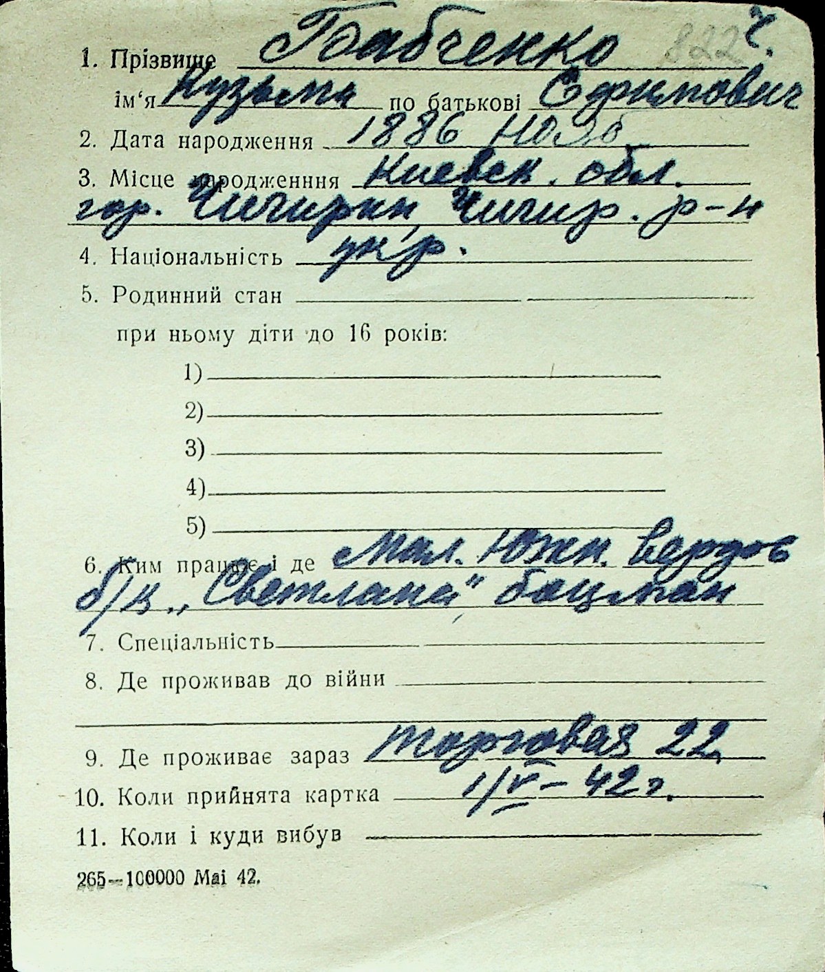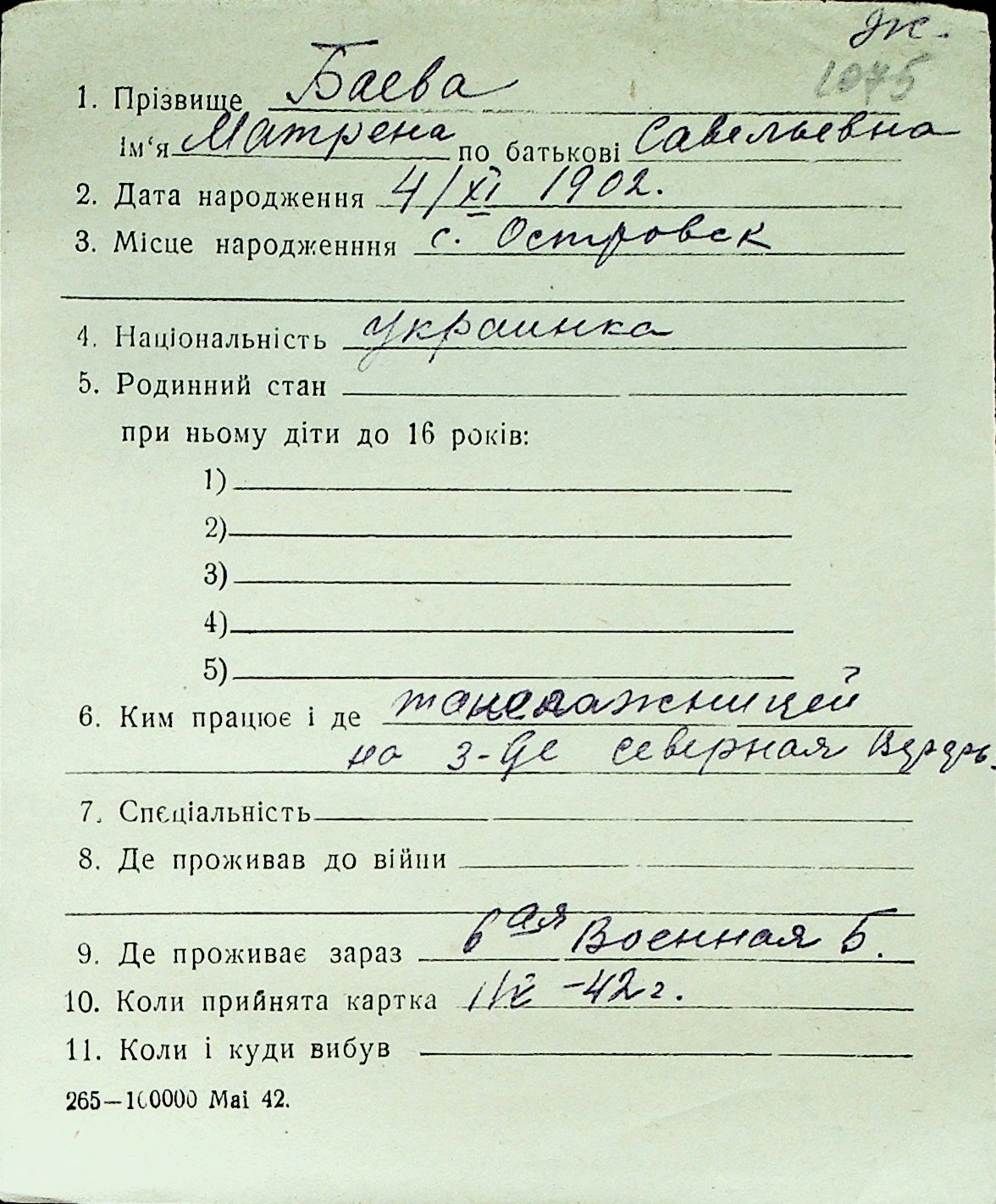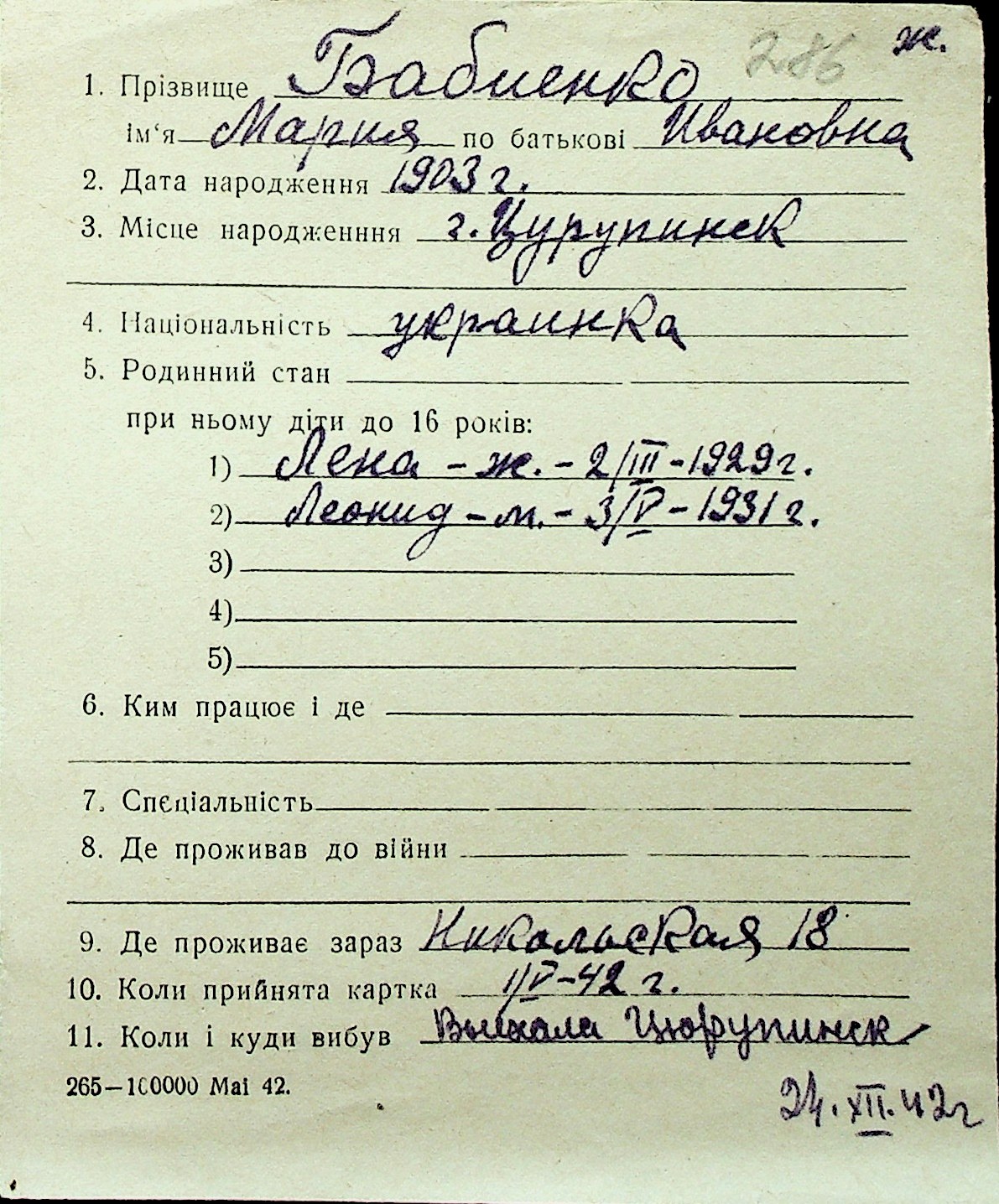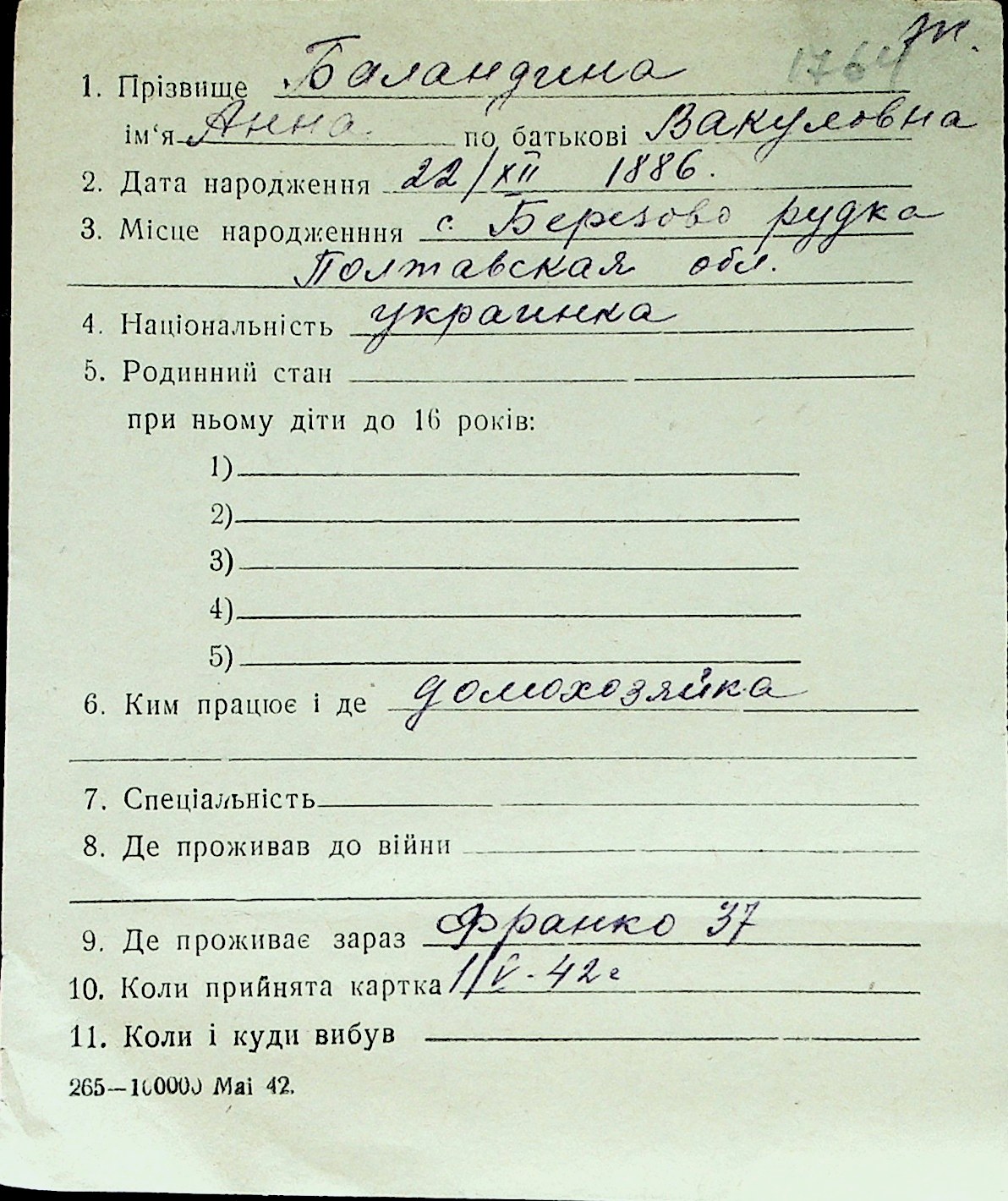 ◦ ◦ Перелік карток на осіб, які мешкали у м. Миколаїв у період окупації 1941–1944 років