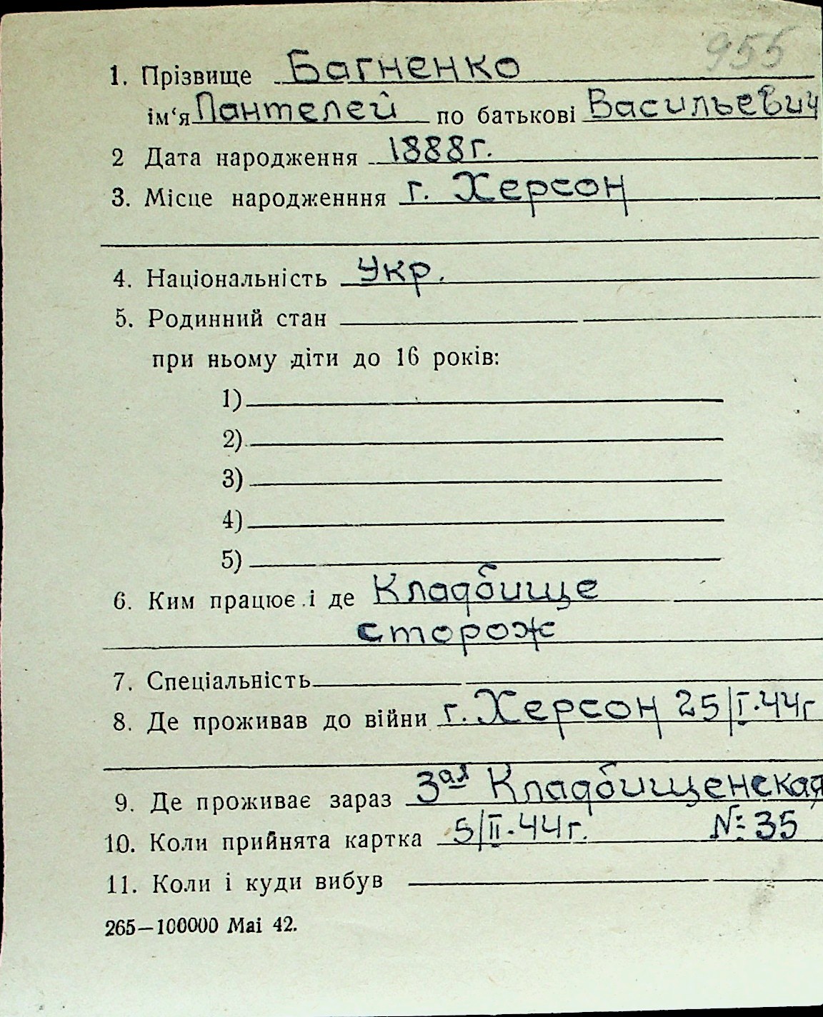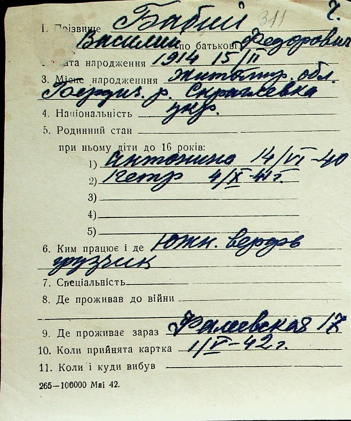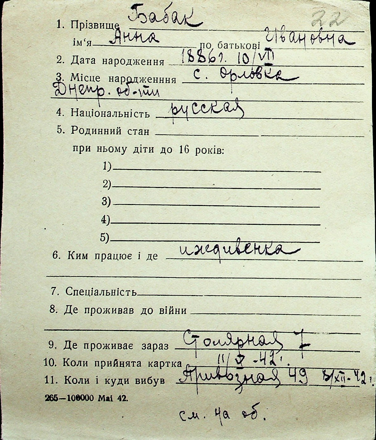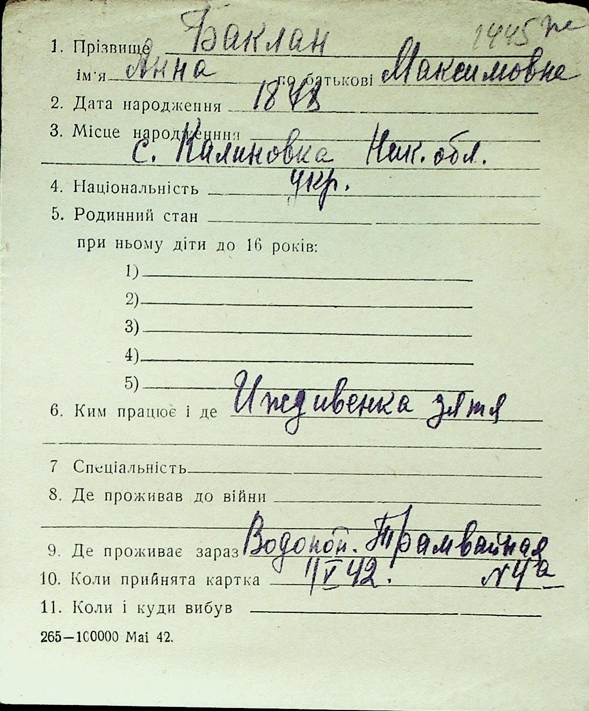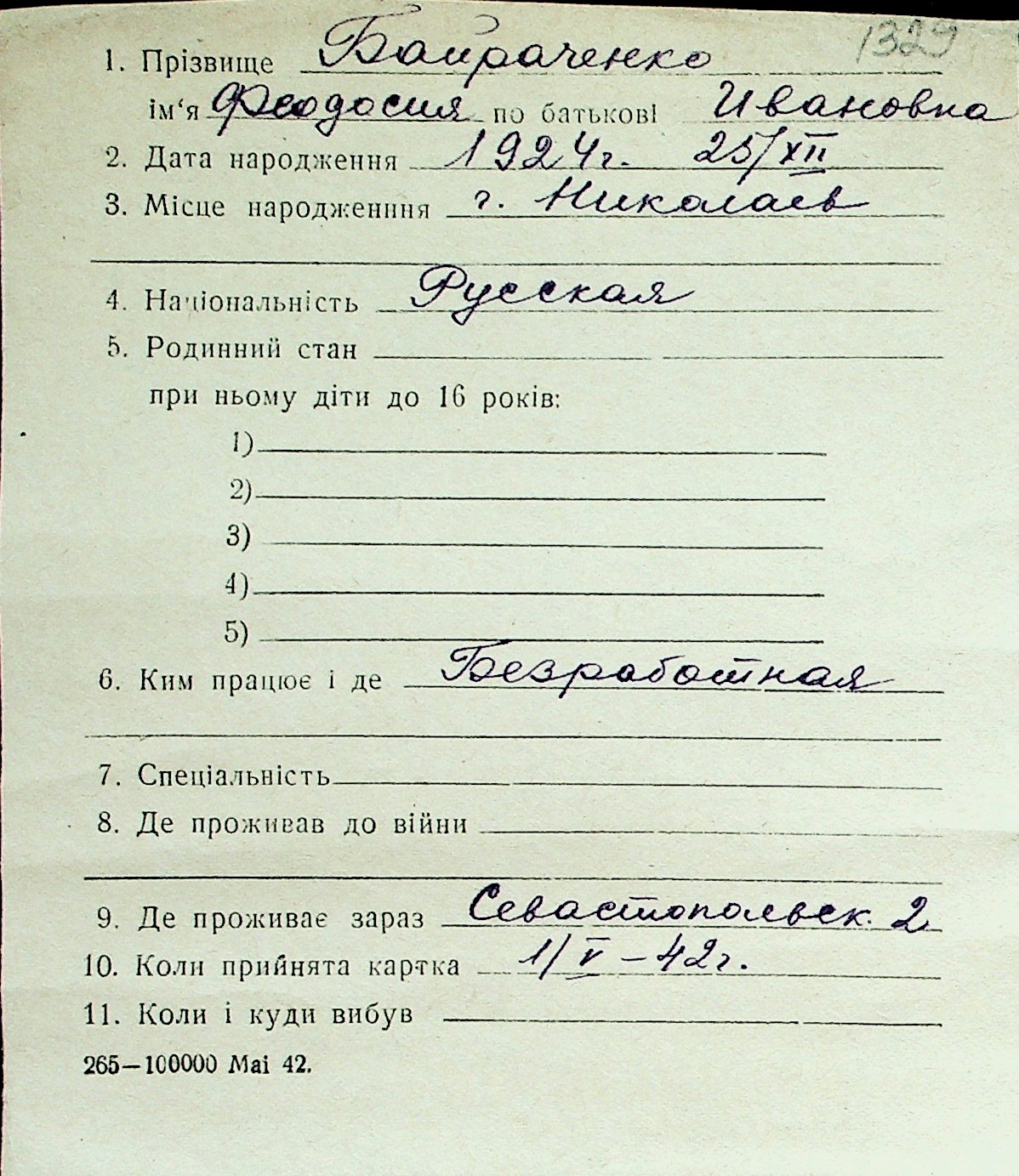 ◦ ◦ Перелік карток на осіб, які мешкали у м. Миколаїв у період окупації 1941–1944 років
