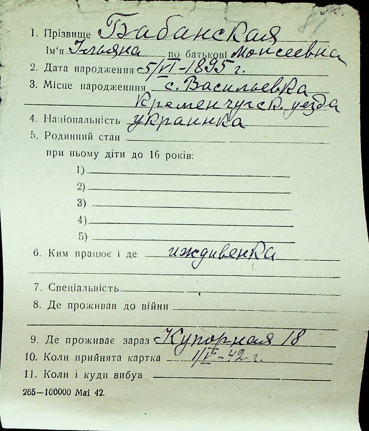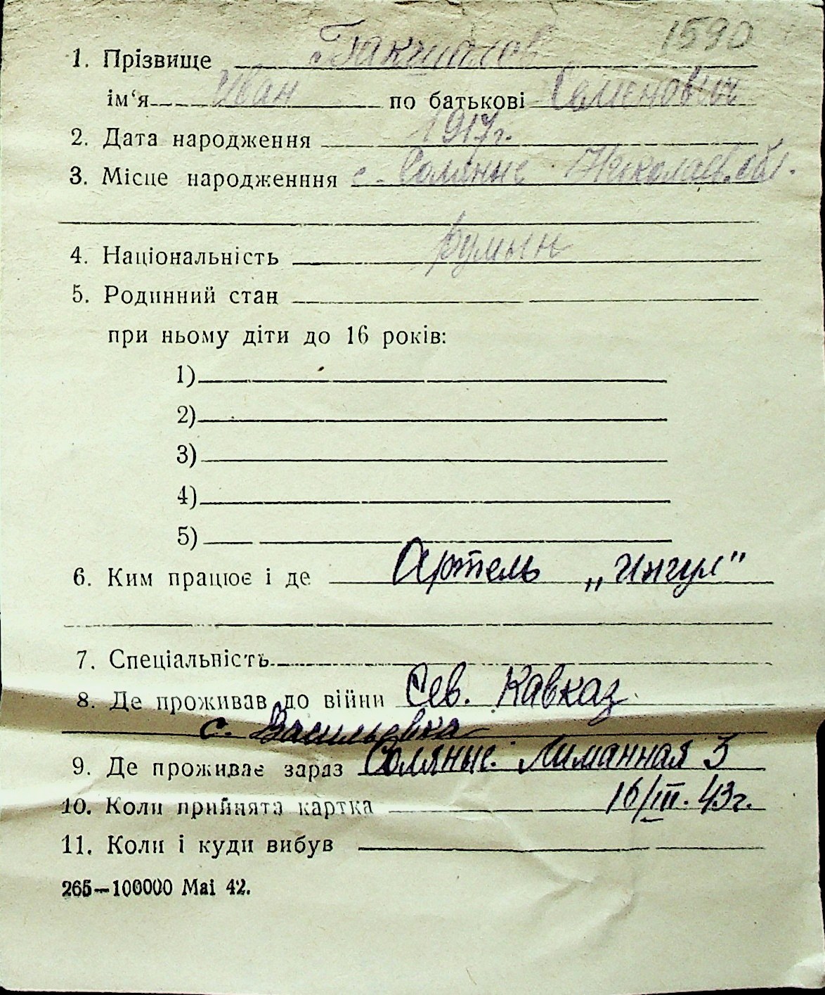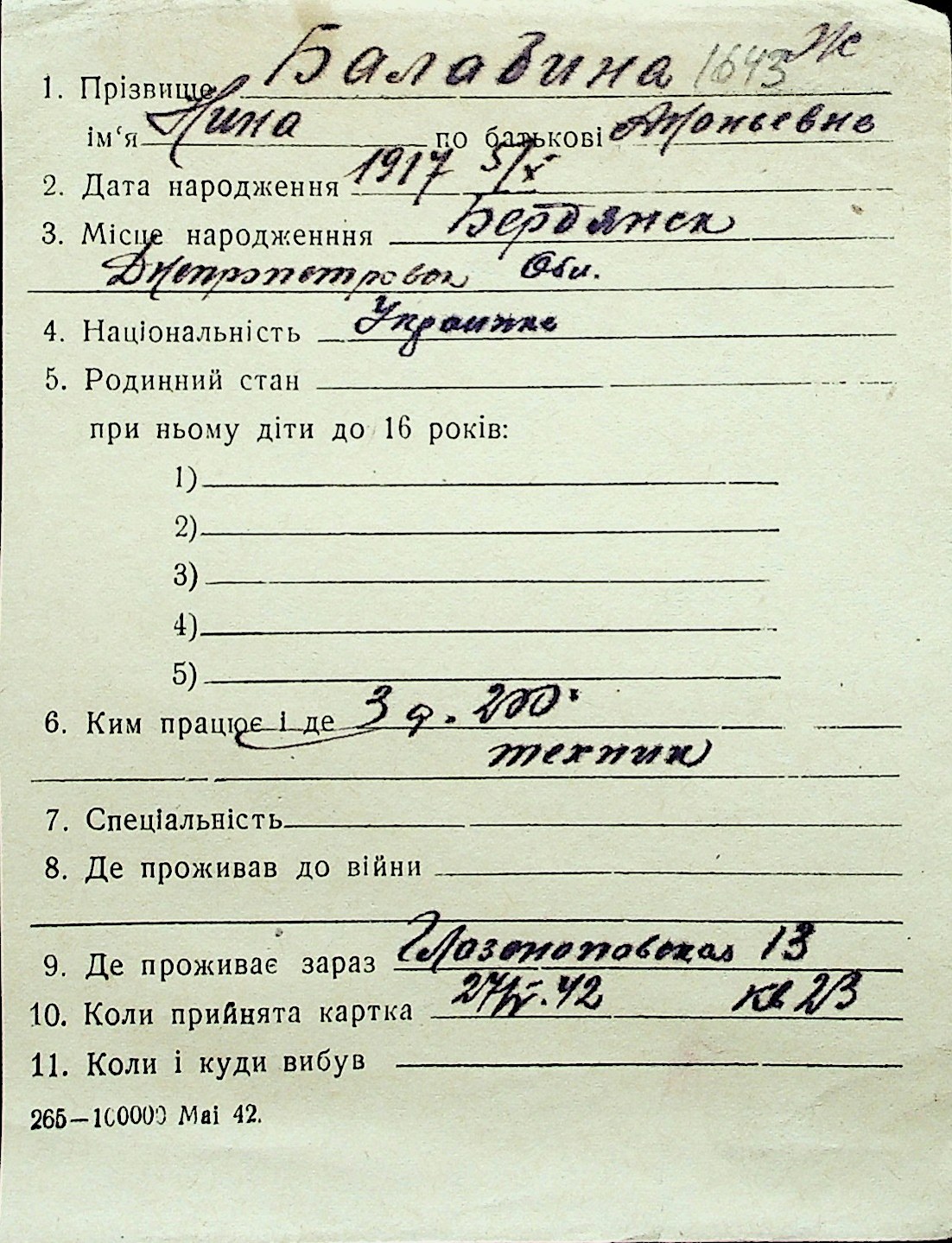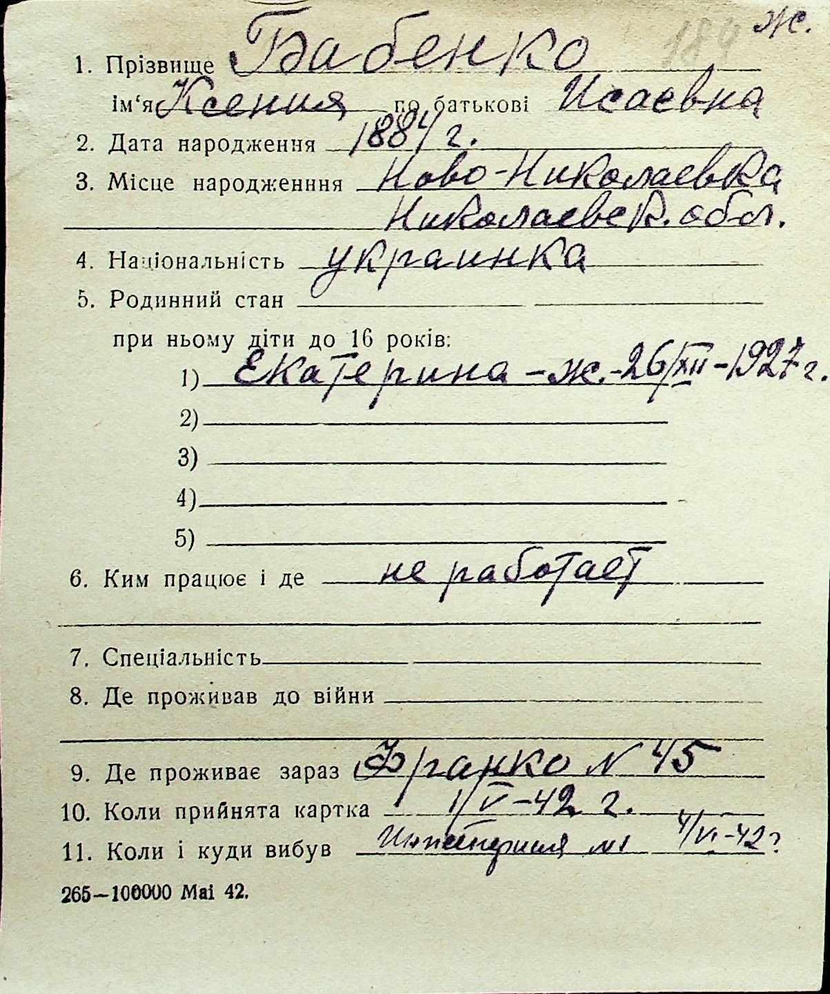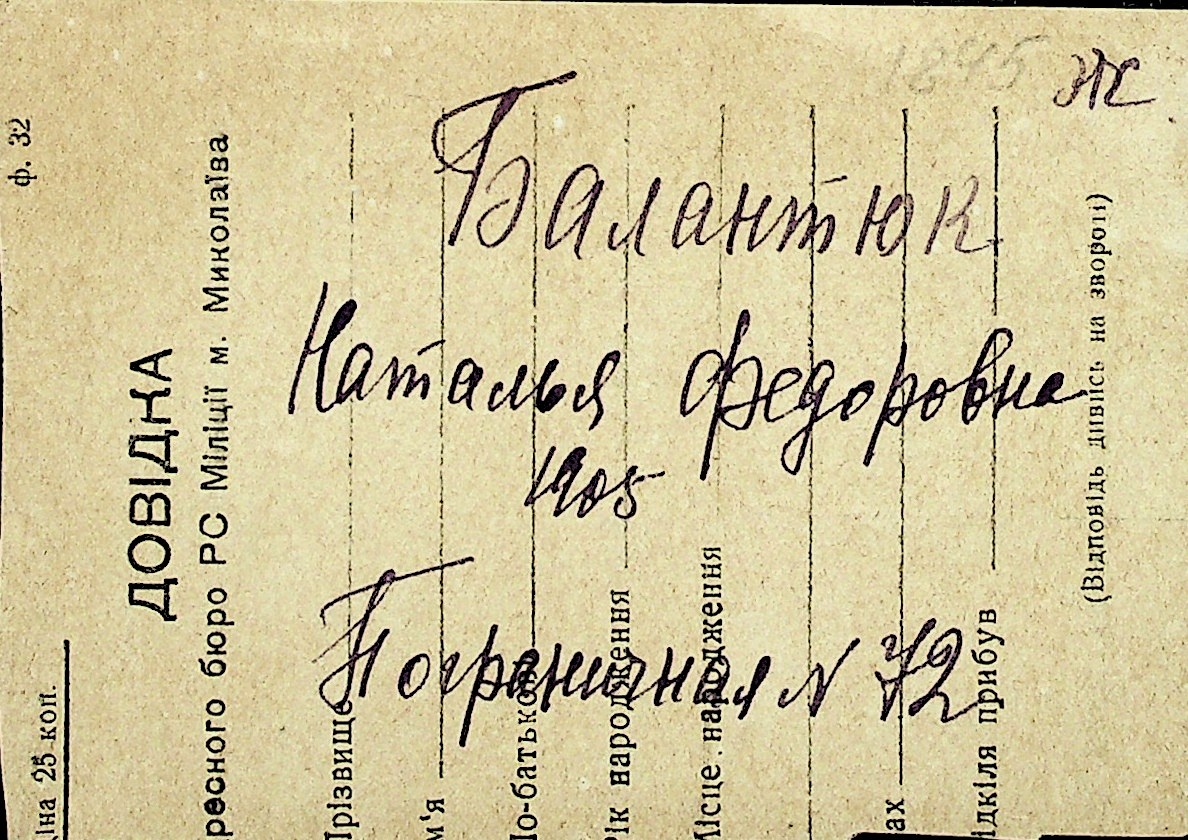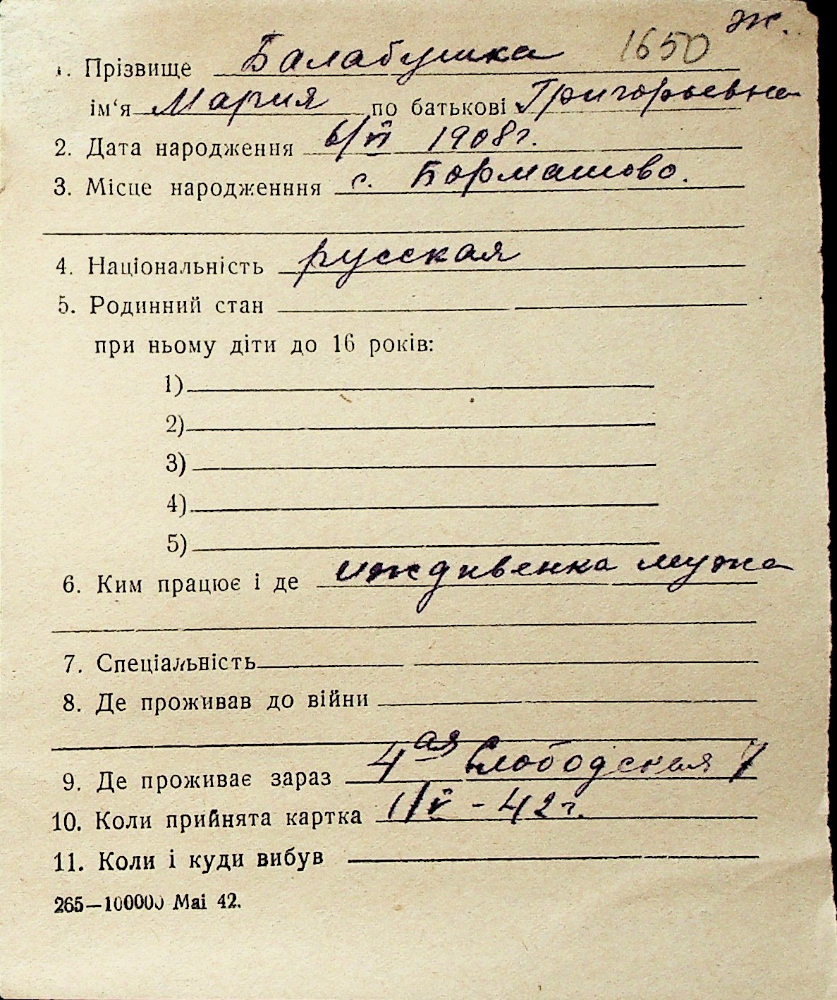 ◦ ◦ Перелік карток на осіб, які мешкали у м. Миколаїв у період окупації 1941–1944 років