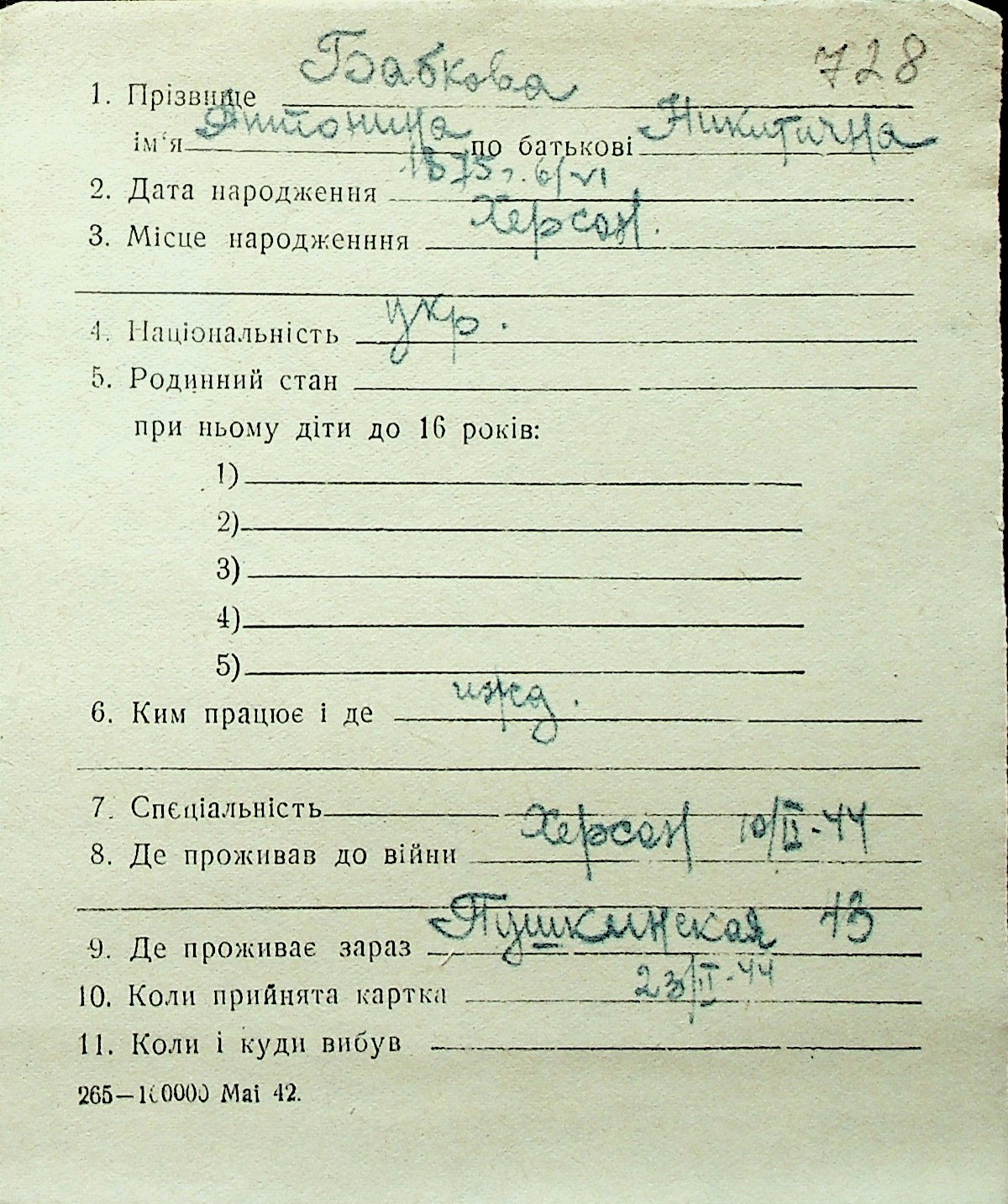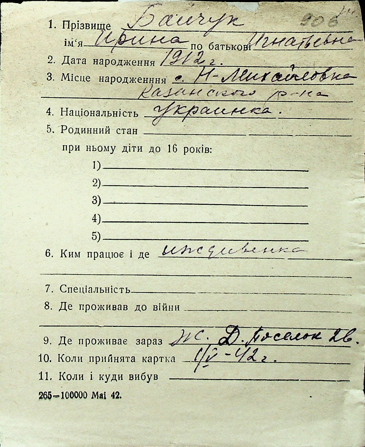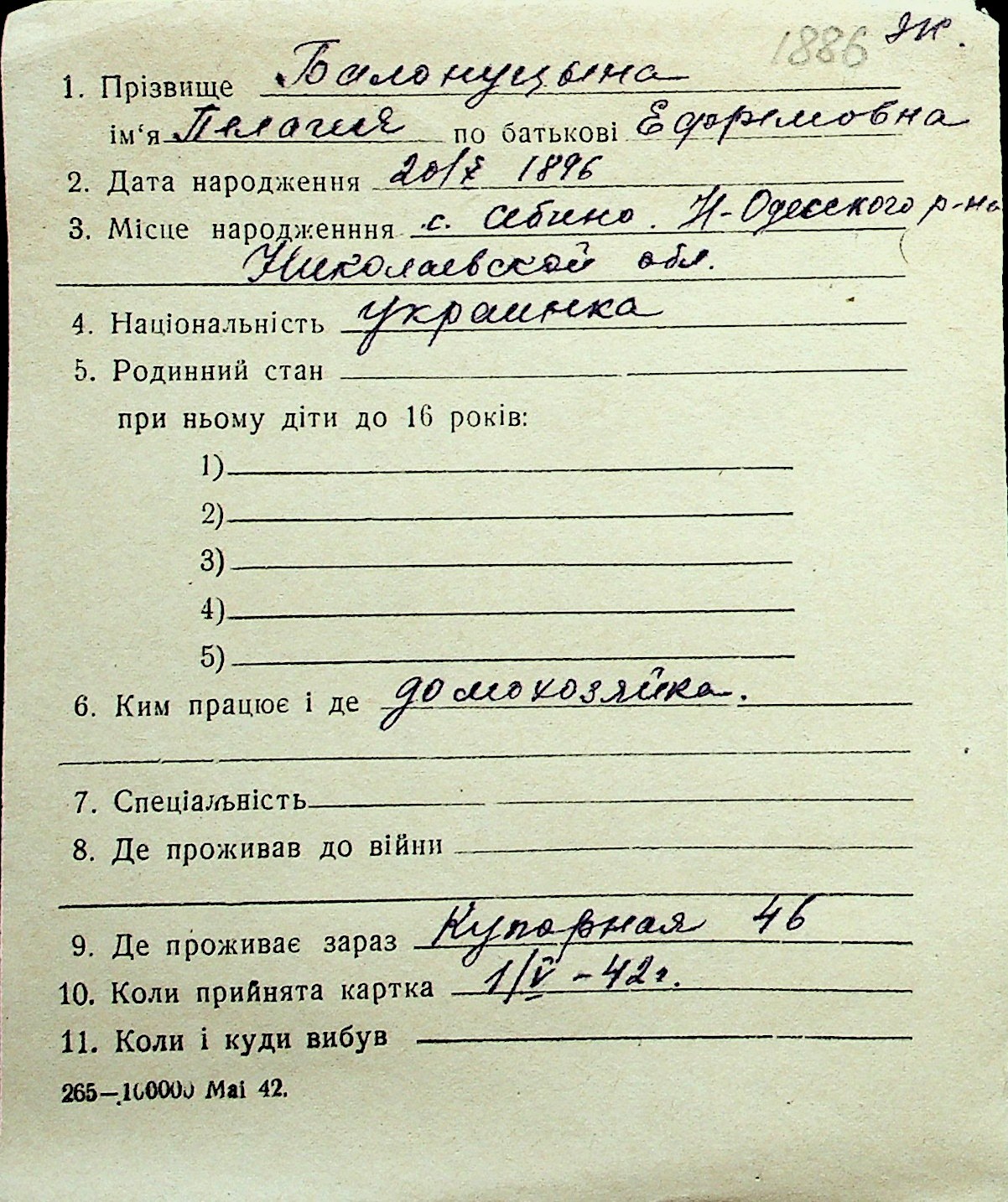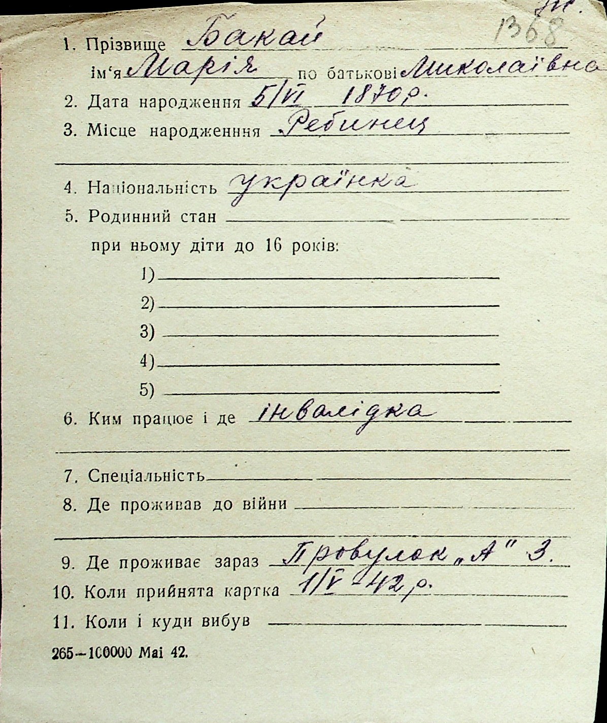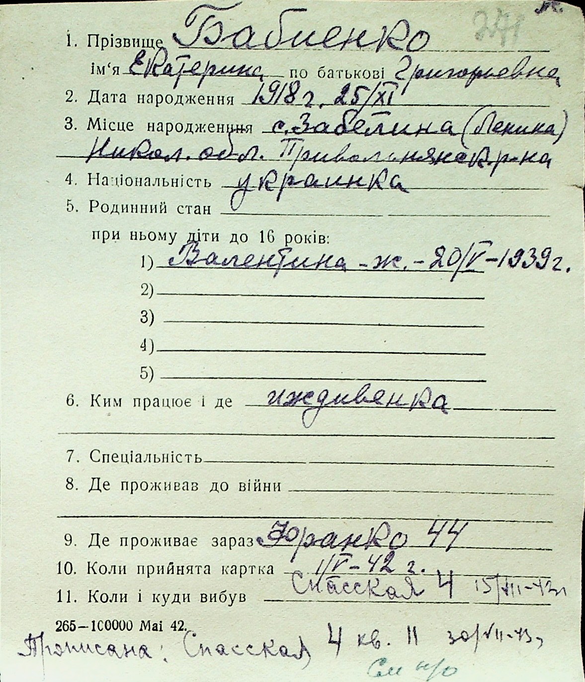 ◦ ◦ Перелік карток на осіб, які мешкали у м. Миколаїв у період окупації 1941–1944 років