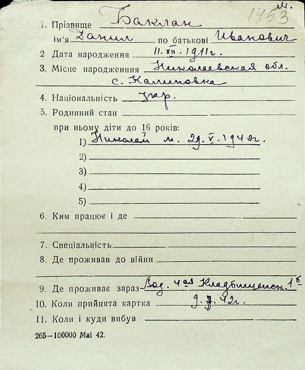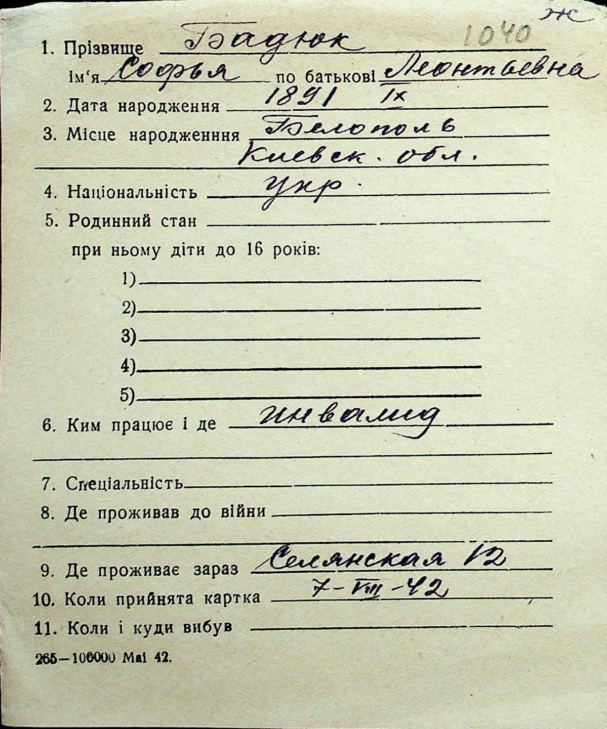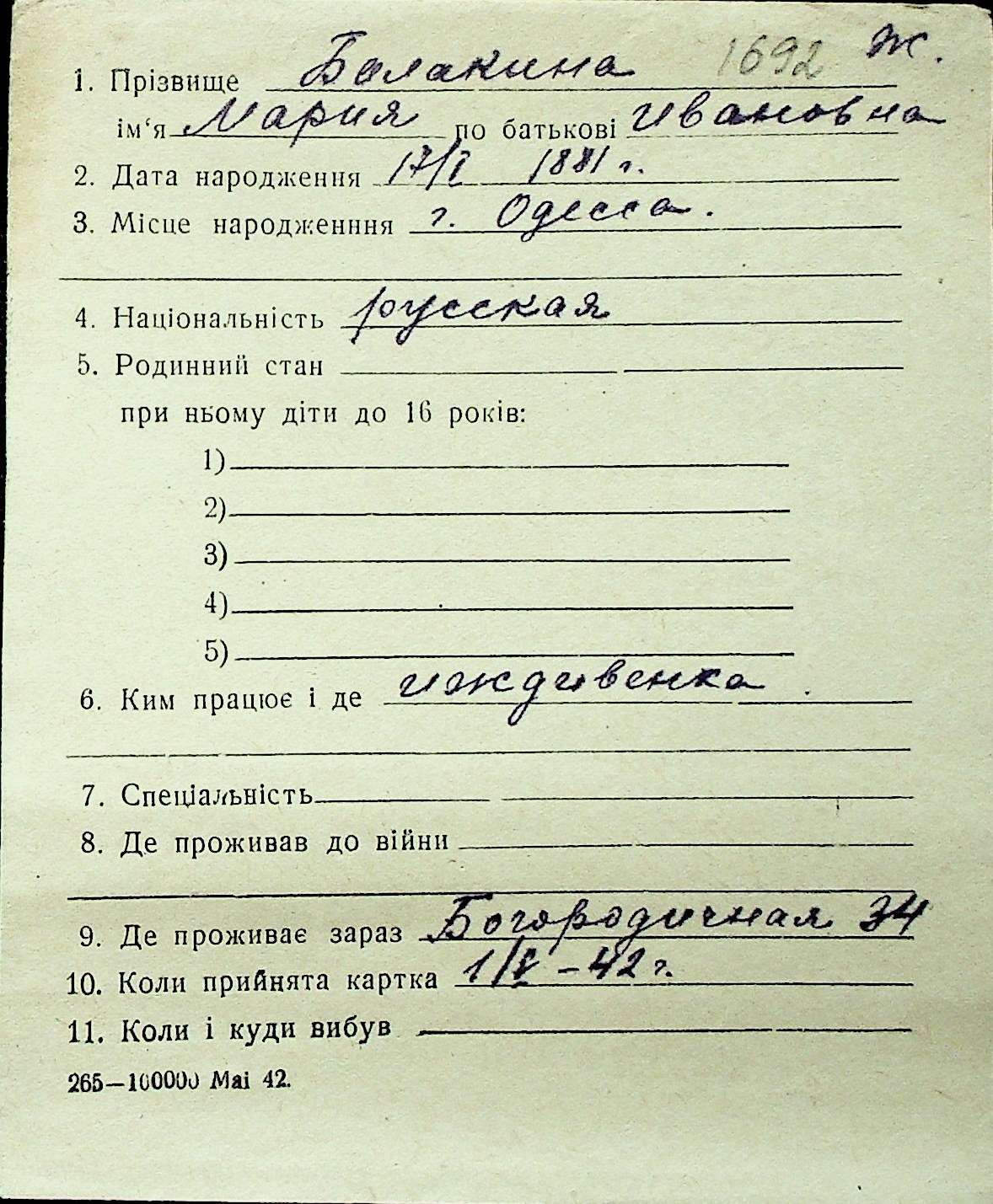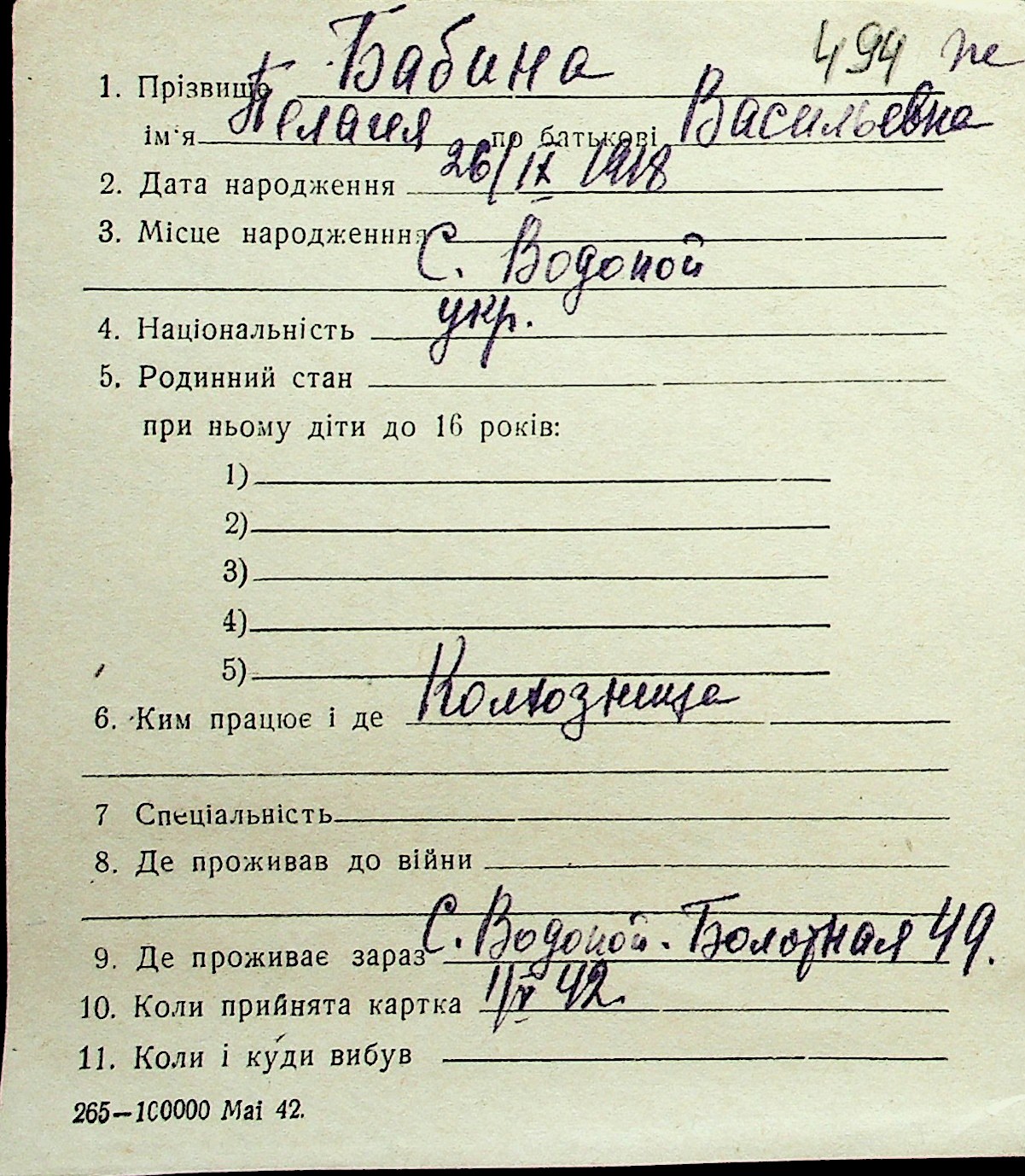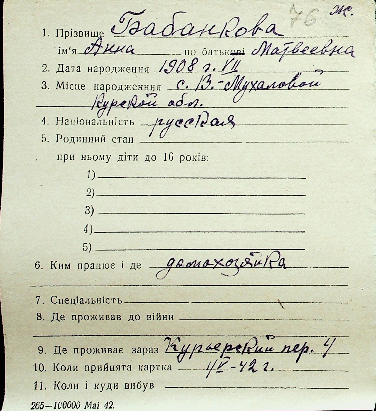 ◦ ◦ Перелік карток на осіб, які мешкали у м. Миколаїв у період окупації 1941–1944 років