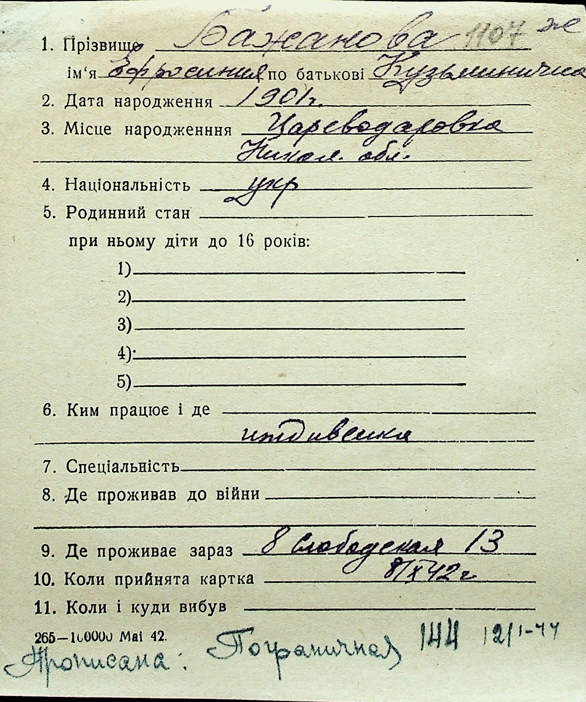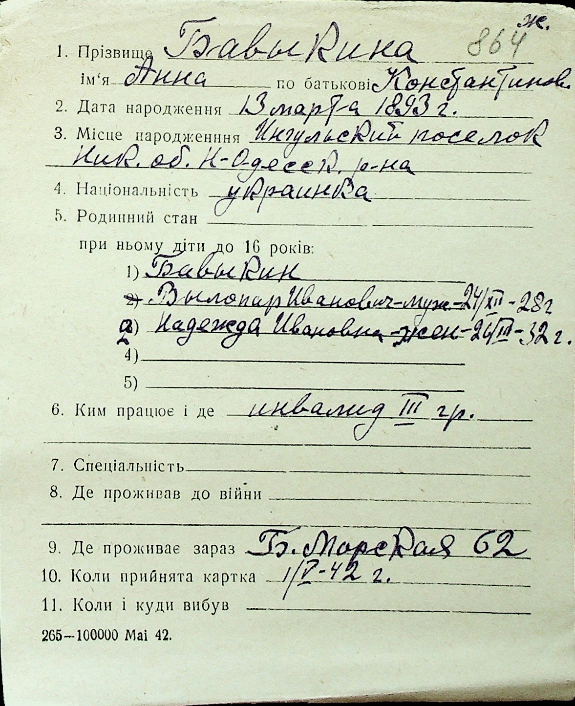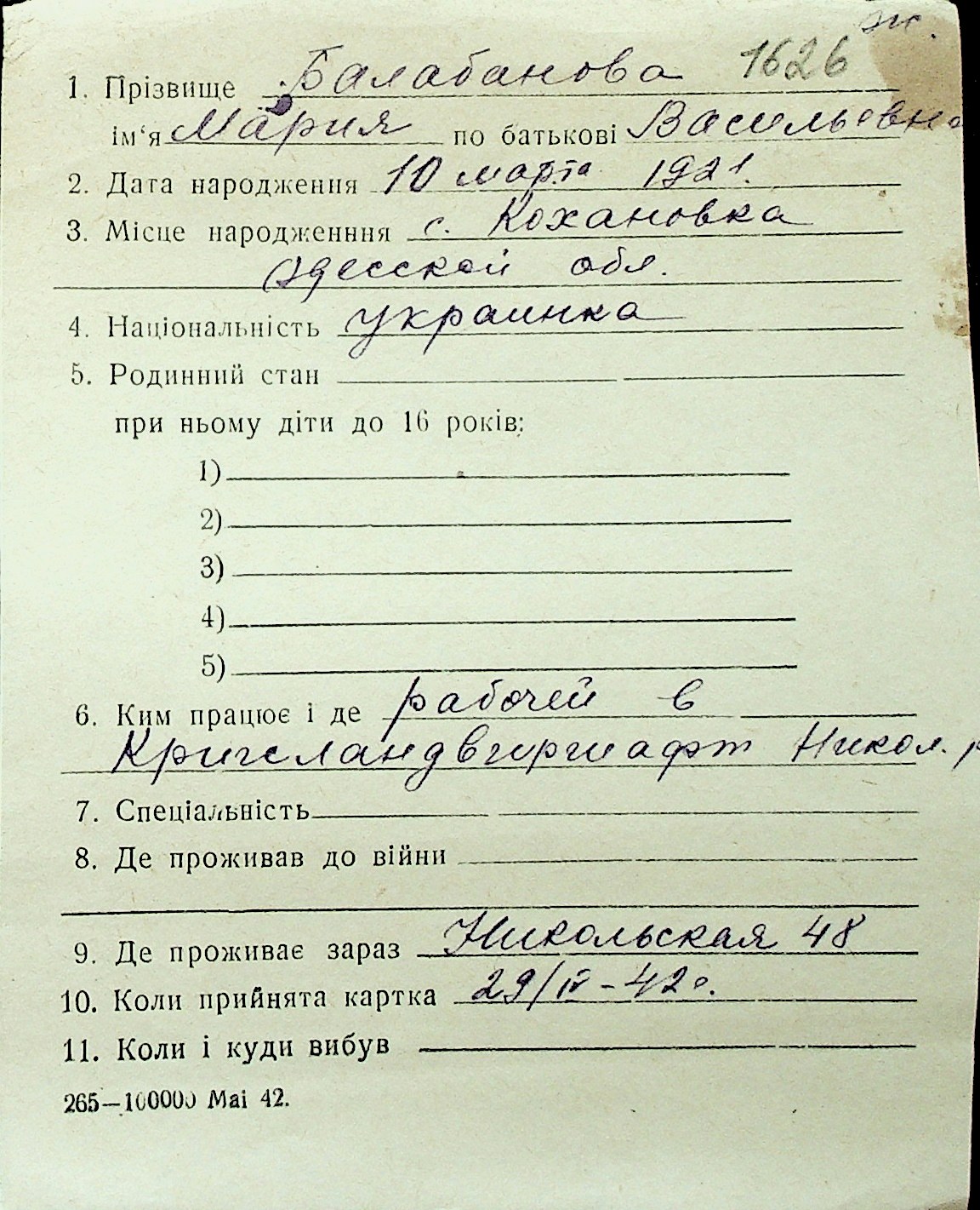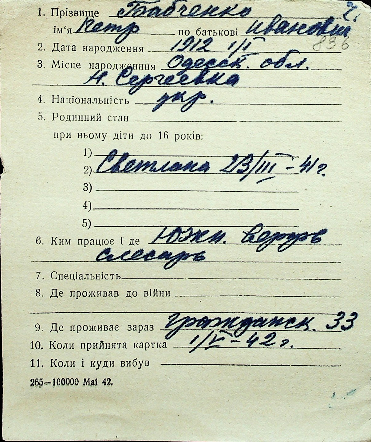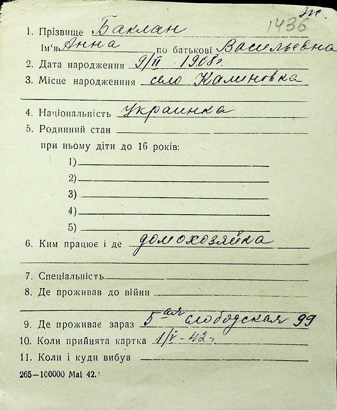 ◦ ◦ Перелік карток на осіб, які мешкали у м. Миколаїв у період окупації 1941–1944 років