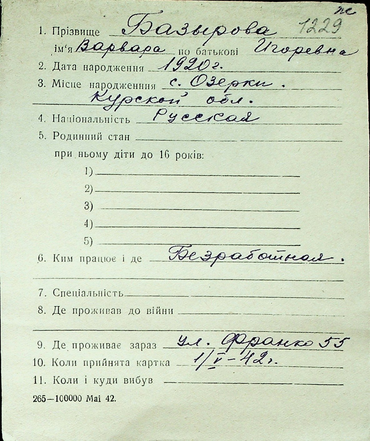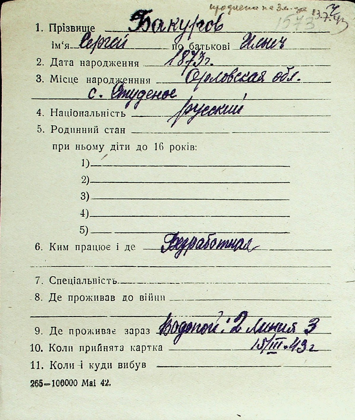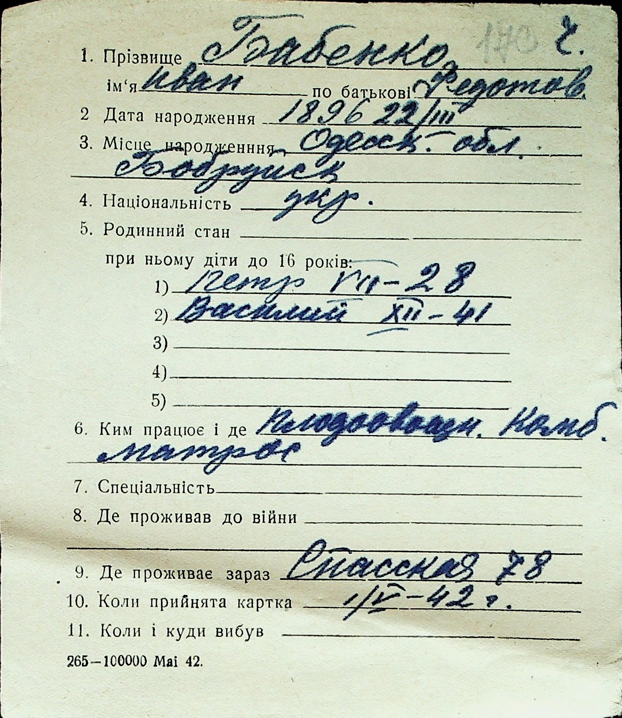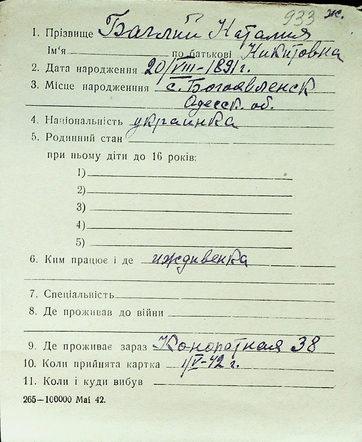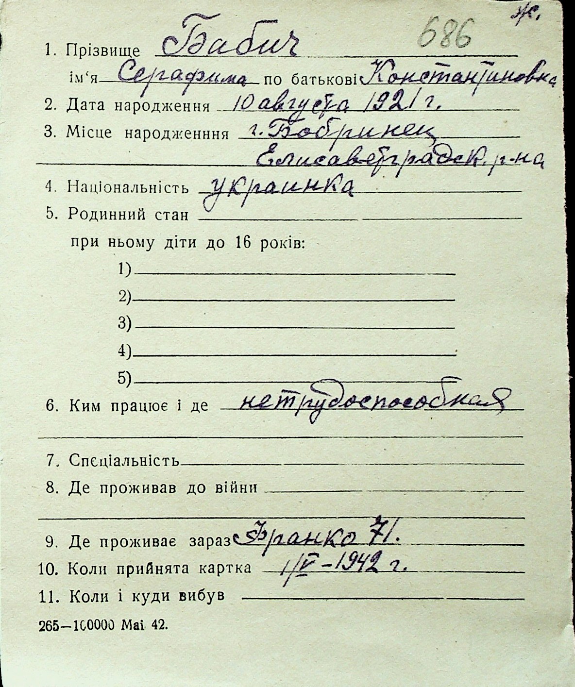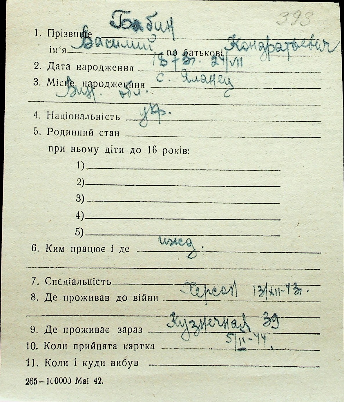 ◦ ◦ Перелік карток на осіб, які мешкали у м. Миколаїв у період окупації 1941–1944 років