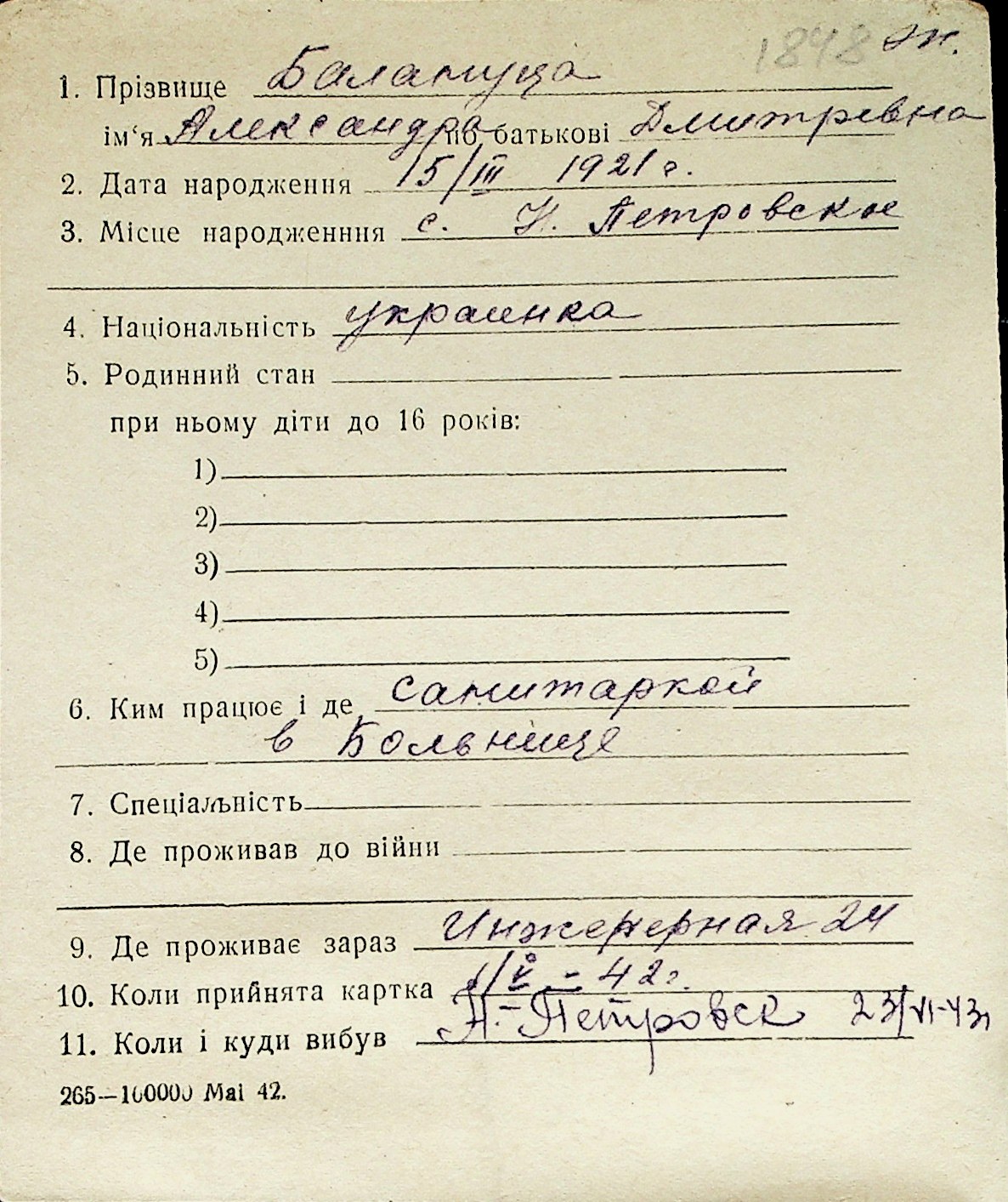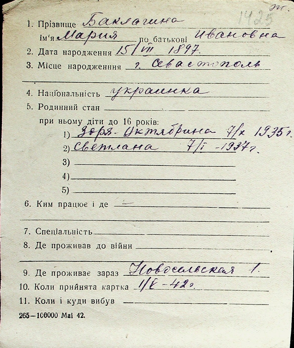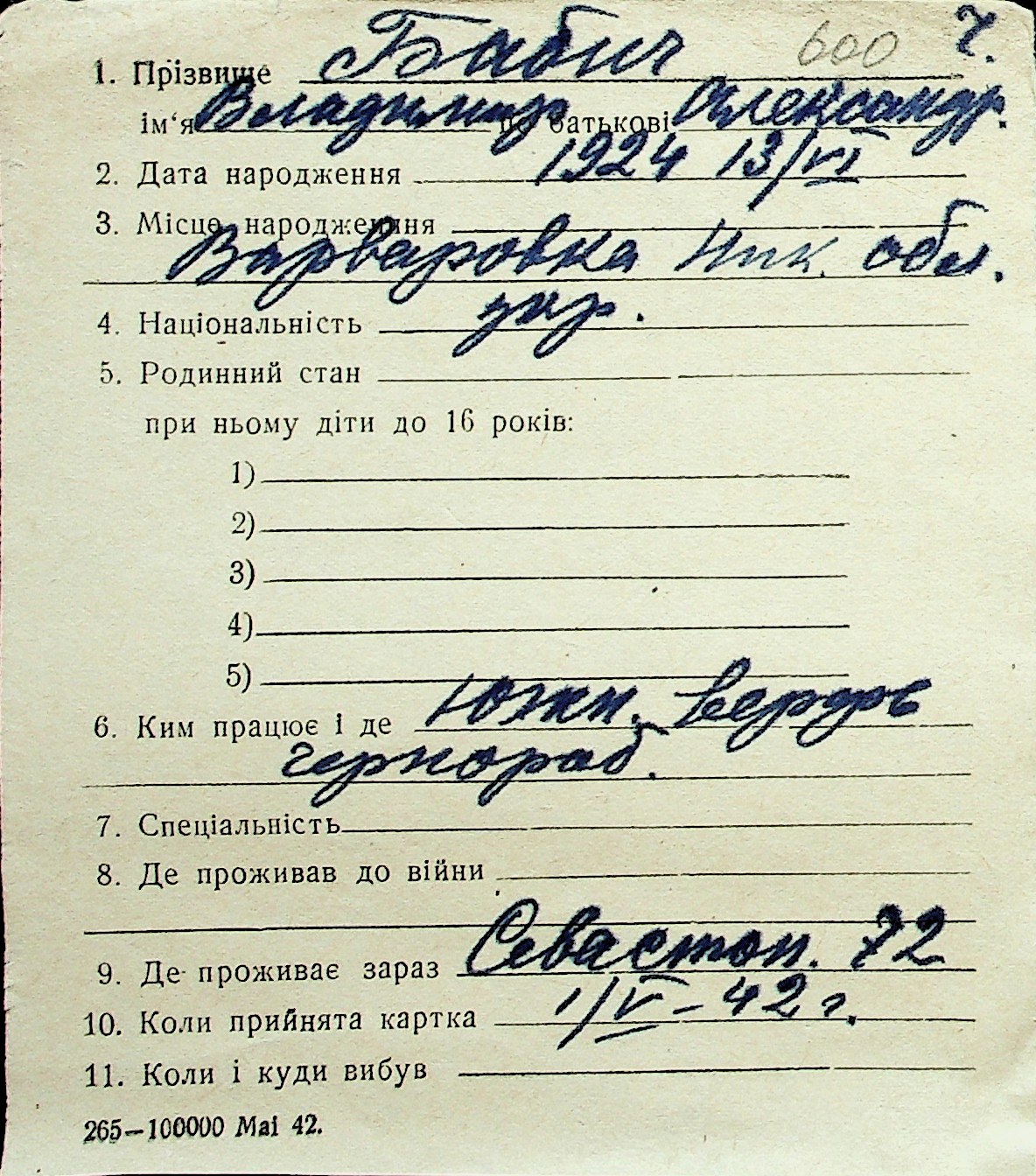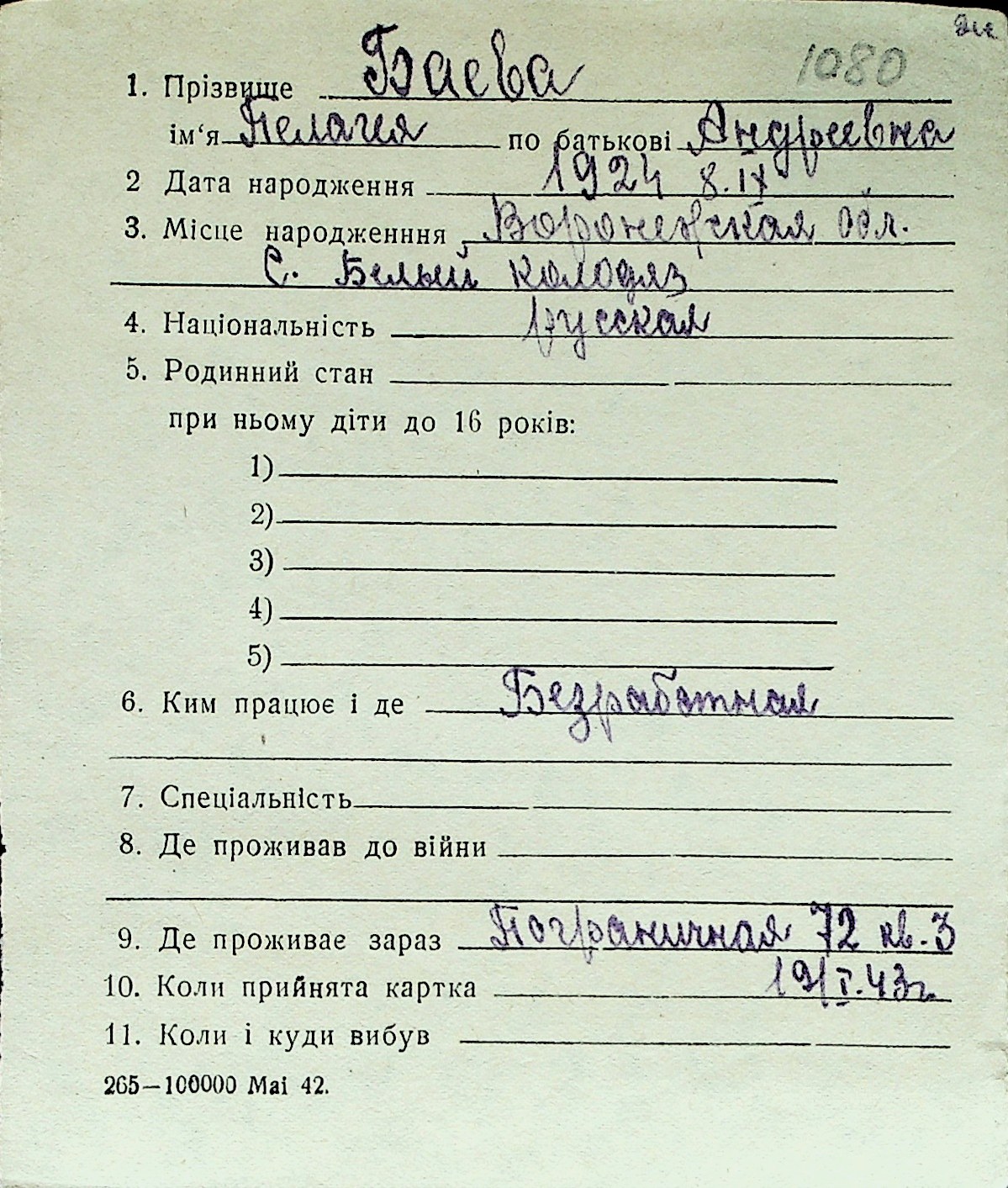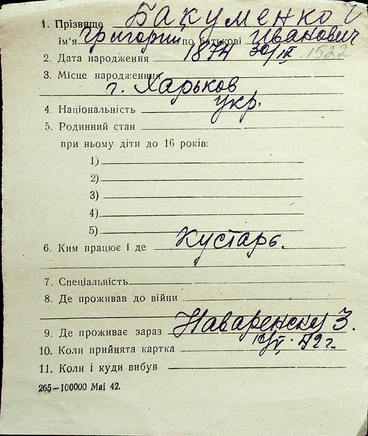 ◦ ◦ Перелік карток на осіб, які мешкали у м. Миколаїв у період окупації 1941–1944 років
