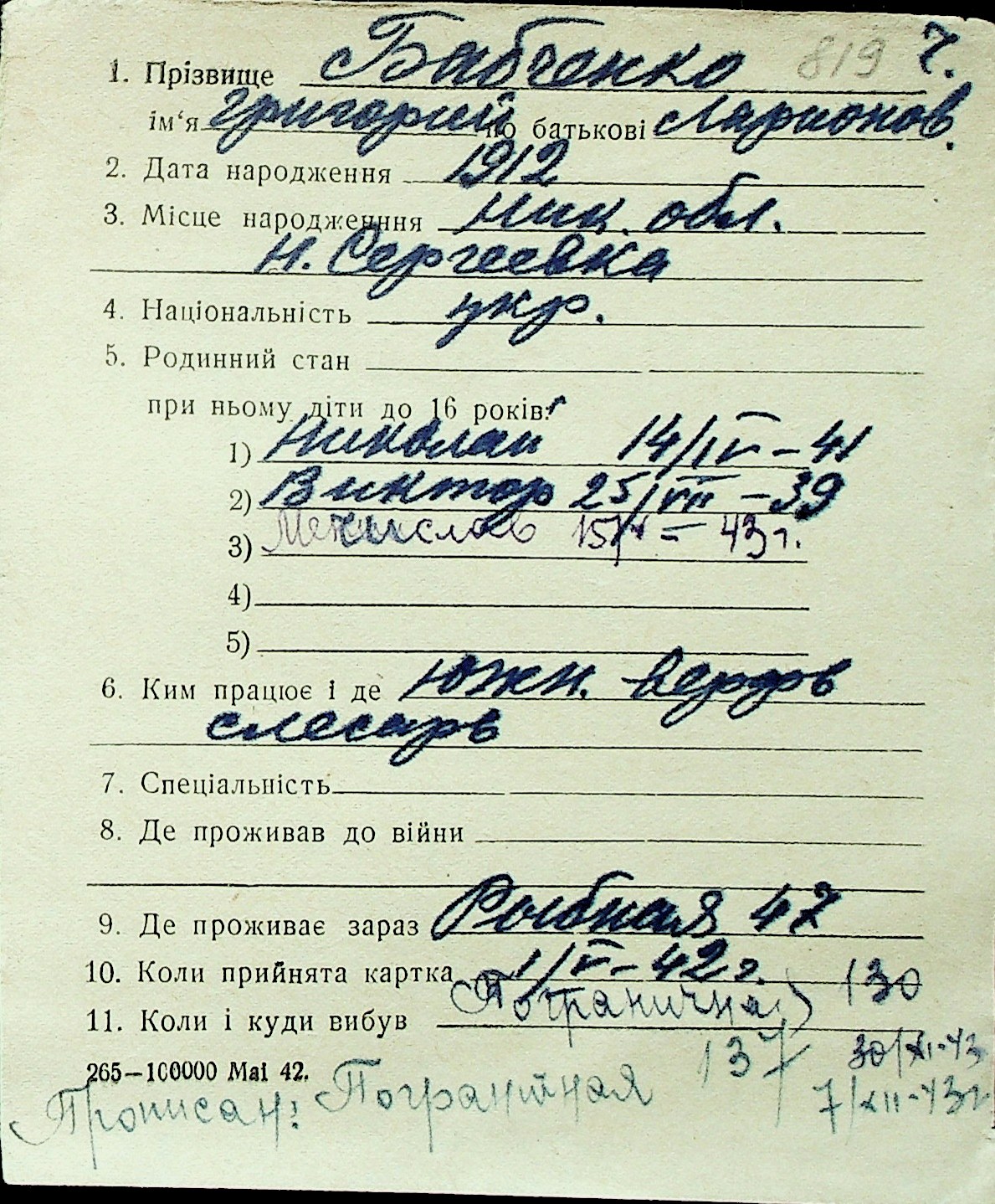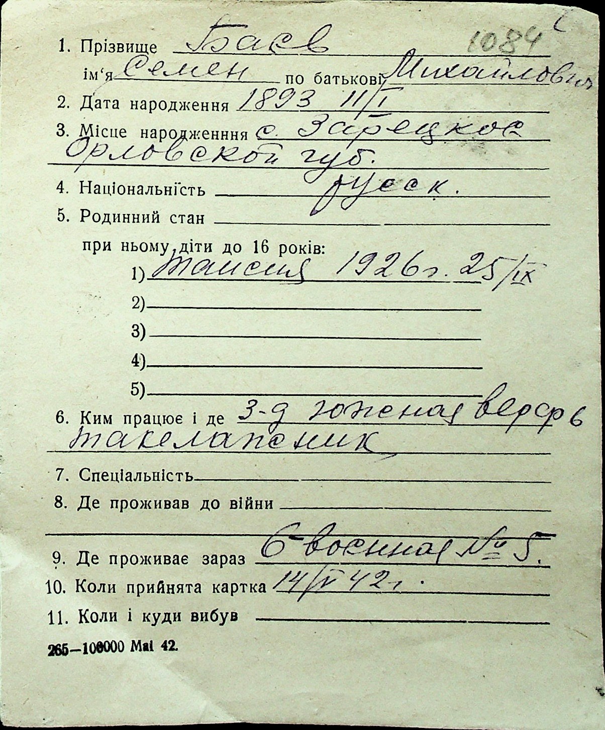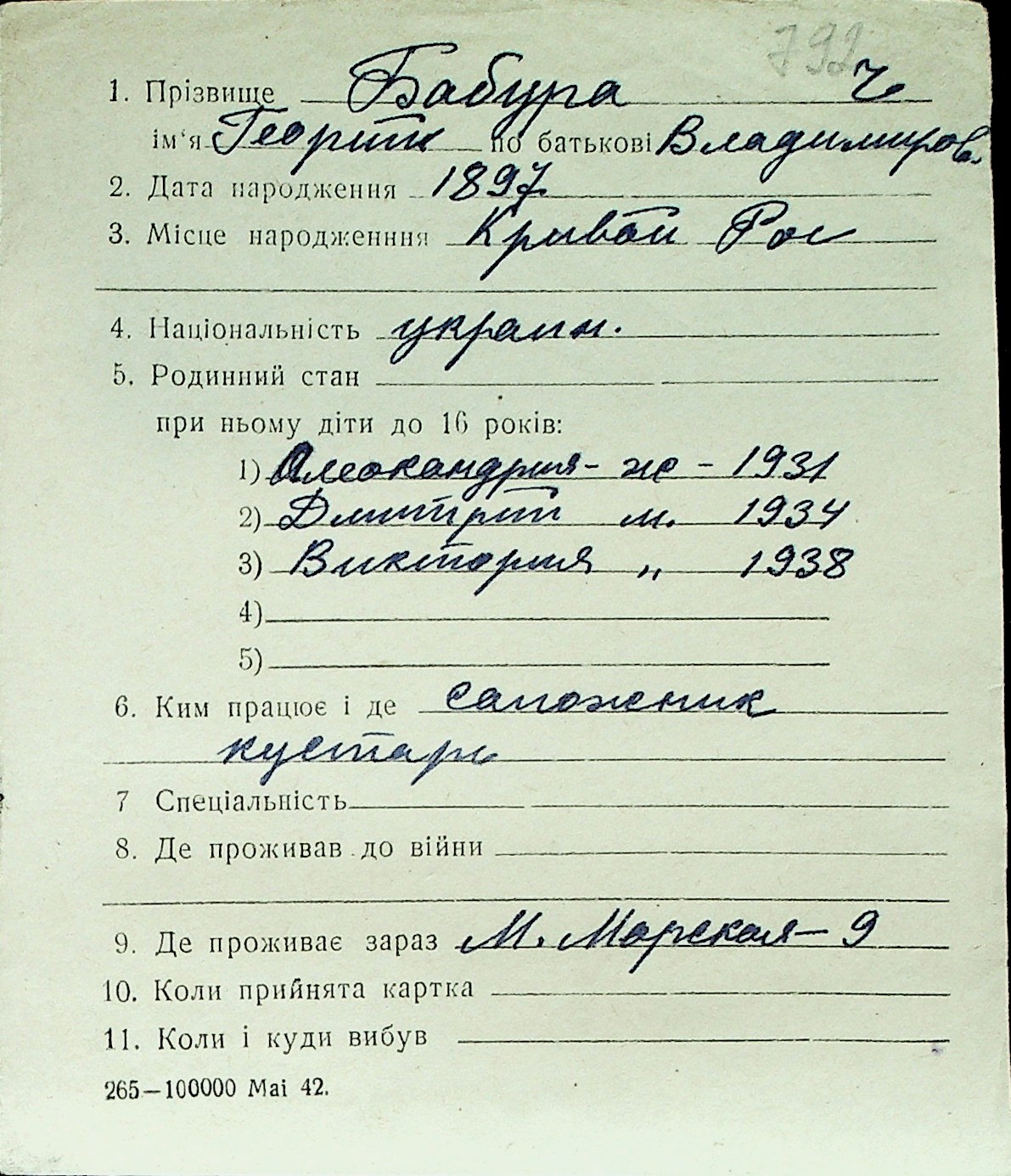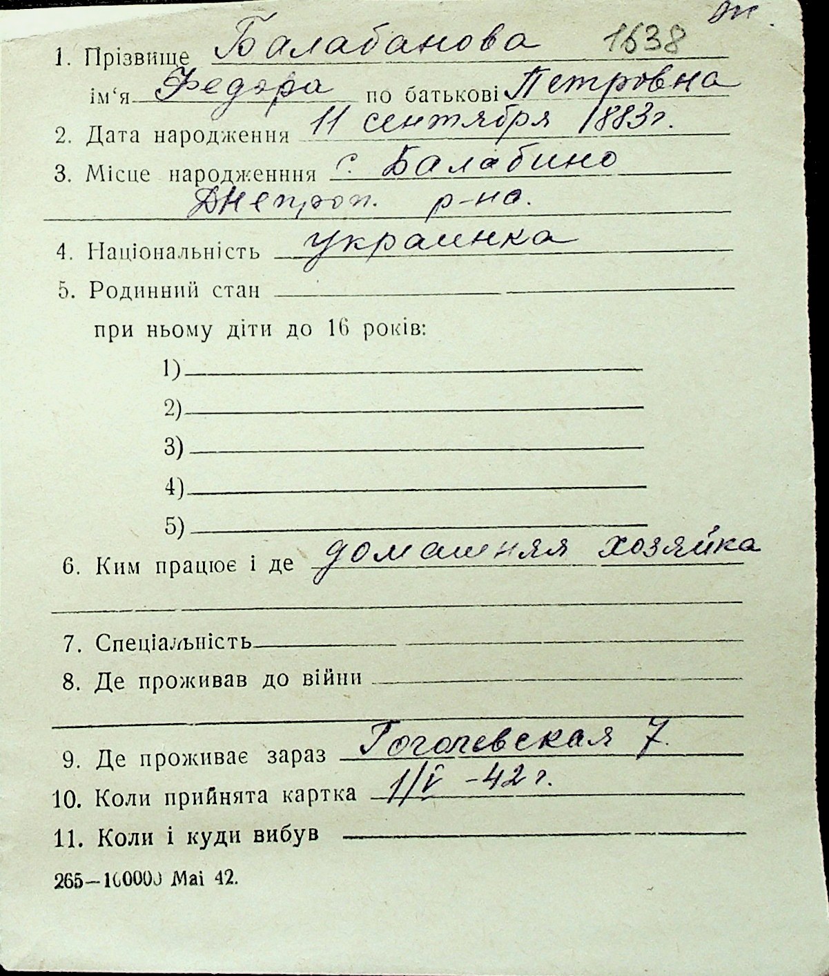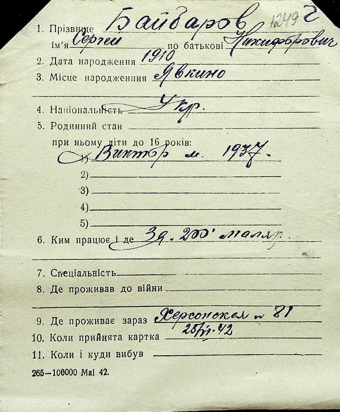 ◦ ◦ Перелік карток на осіб, які мешкали у м. Миколаїв у період окупації 1941–1944 років