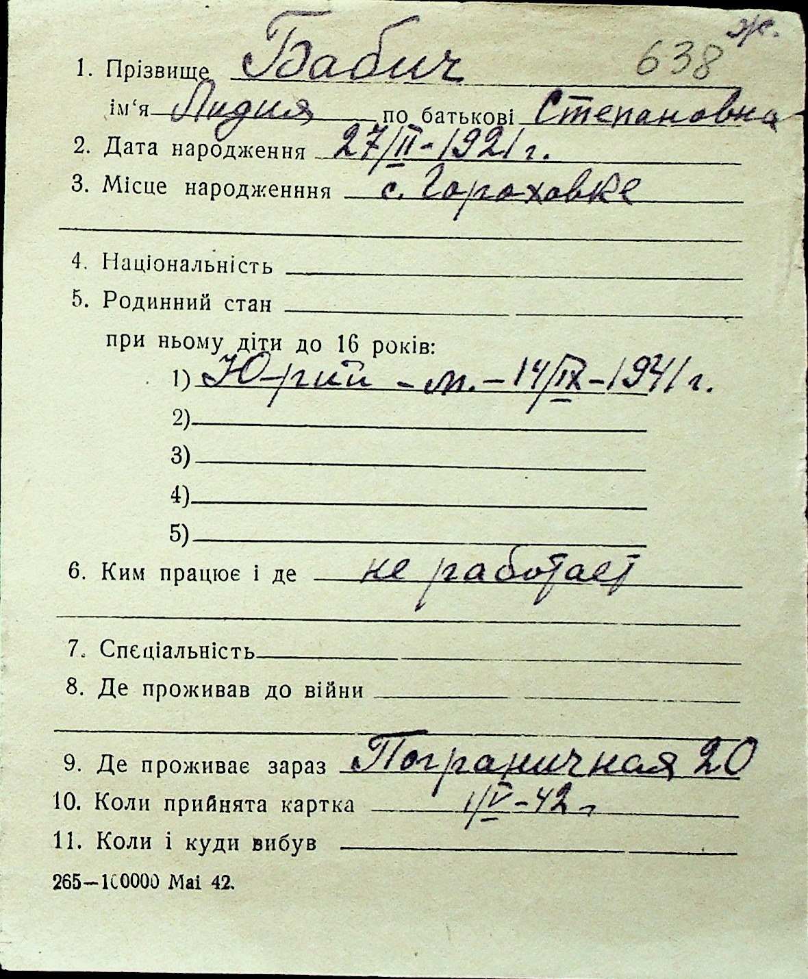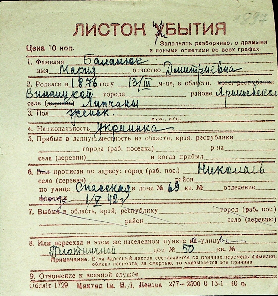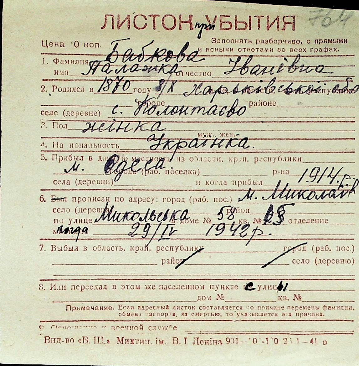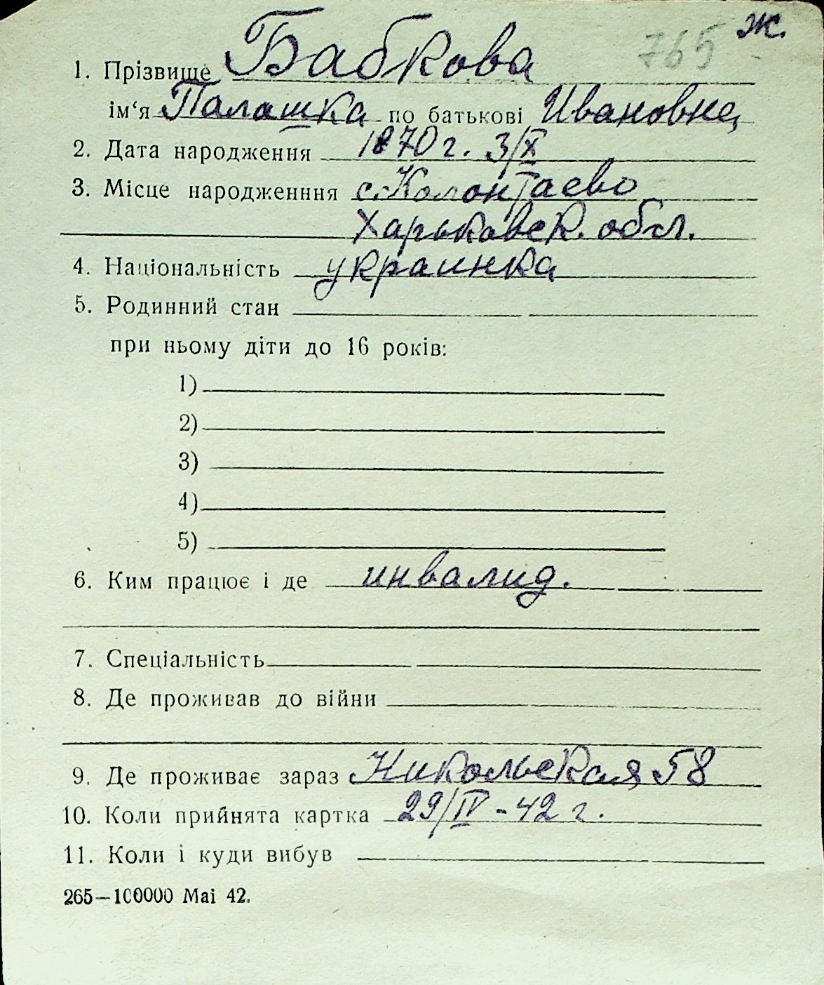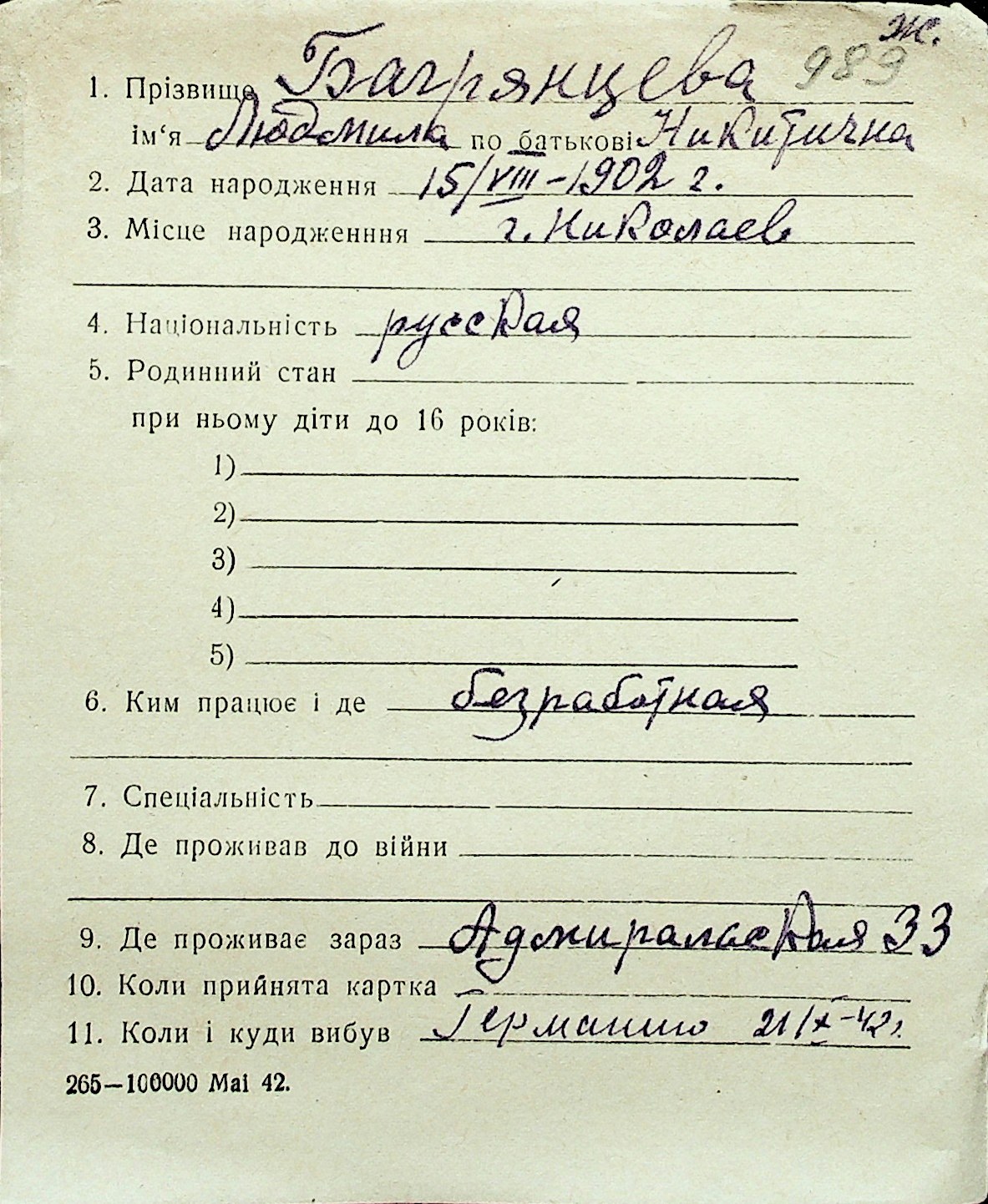 ◦ ◦ Перелік карток на осіб, які мешкали у м. Миколаїв у період окупації 1941–1944 років