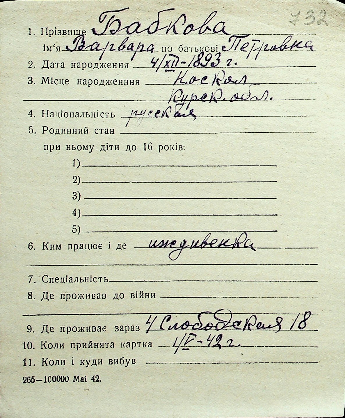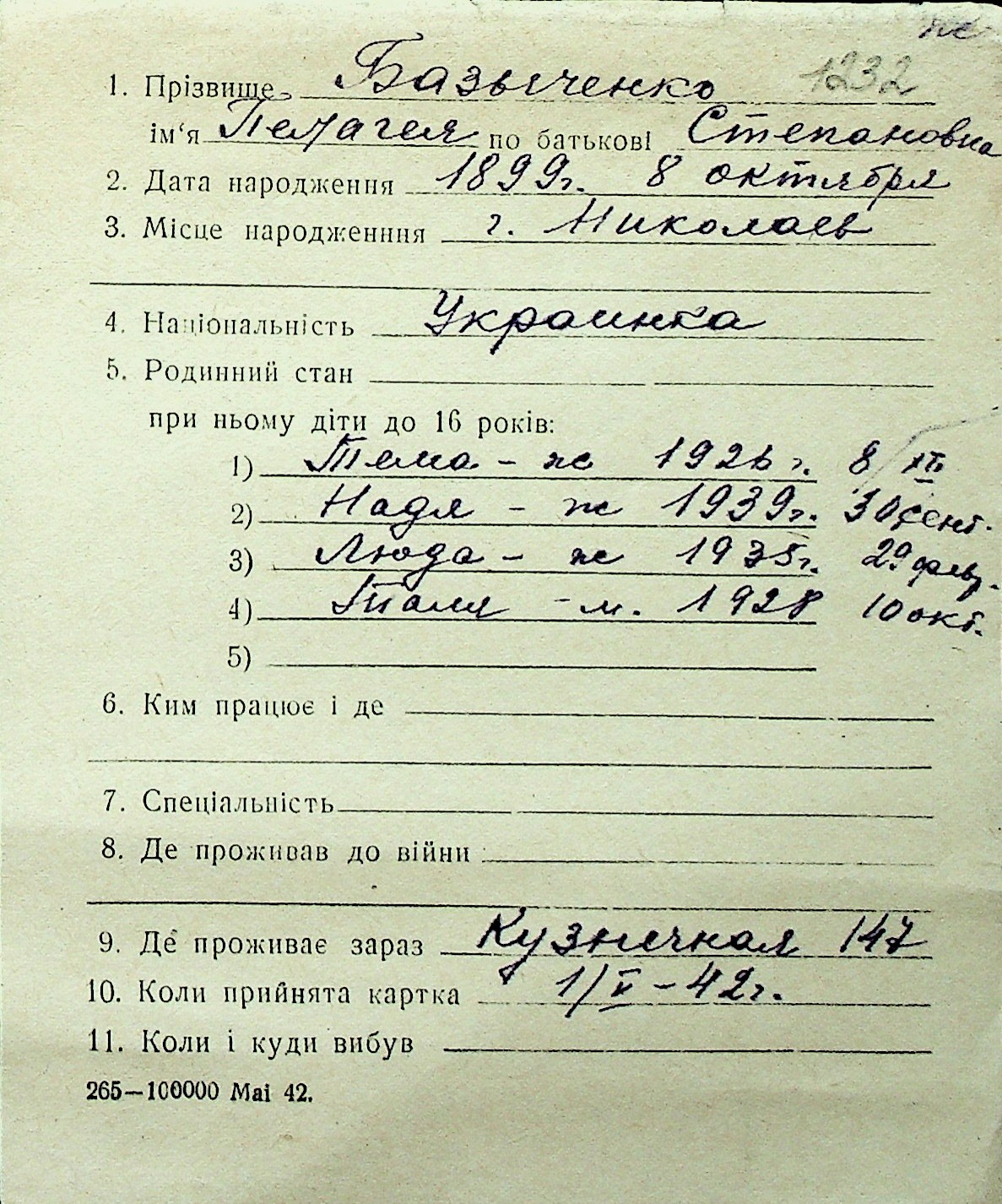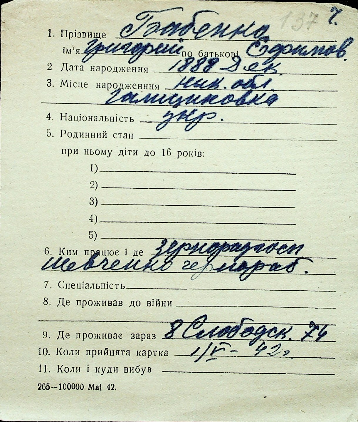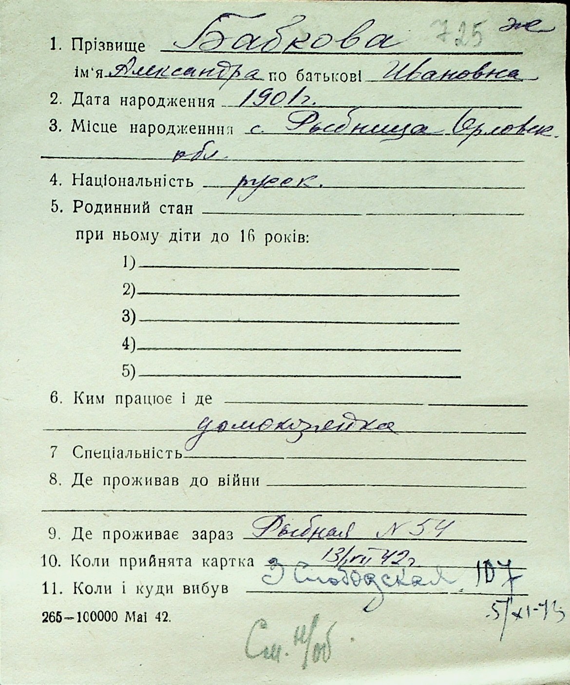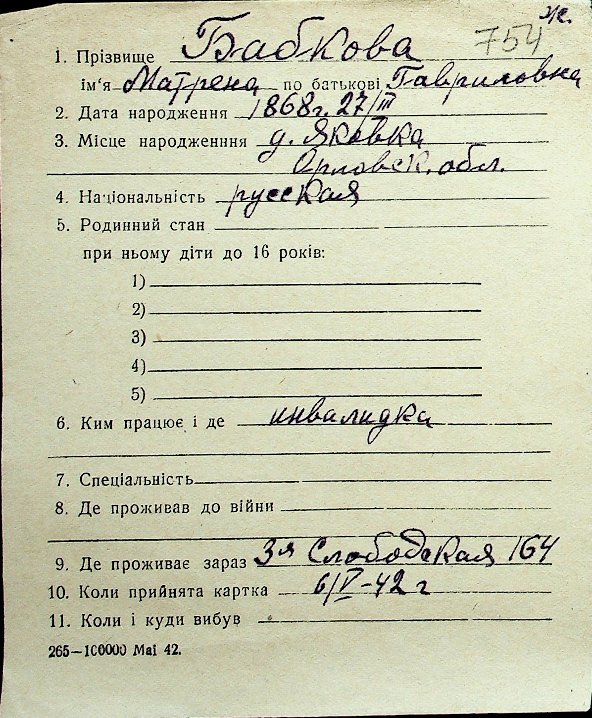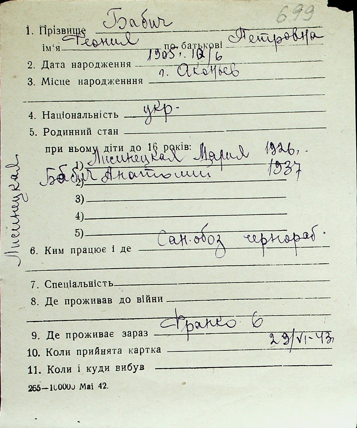 ◦ ◦ Перелік карток на осіб, які мешкали у м. Миколаїв у період окупації 1941–1944 років