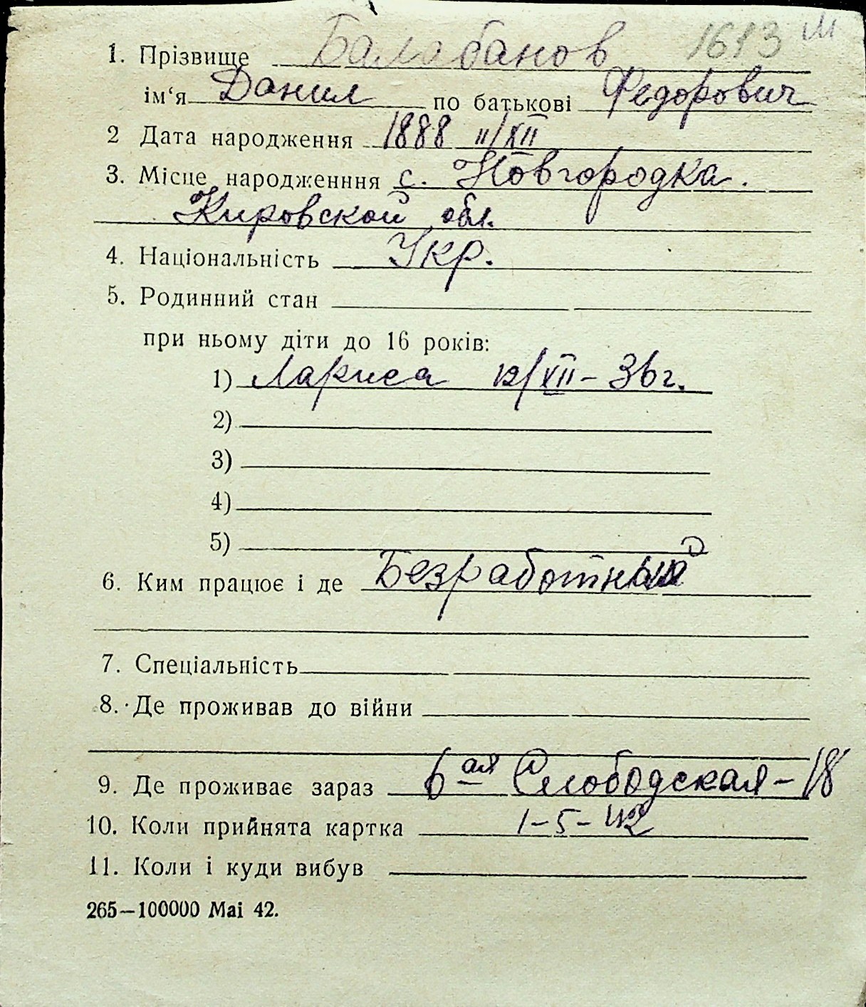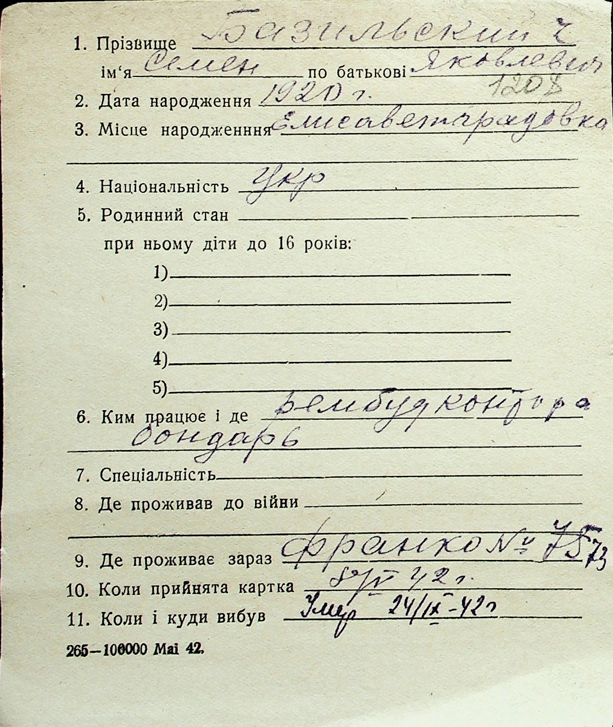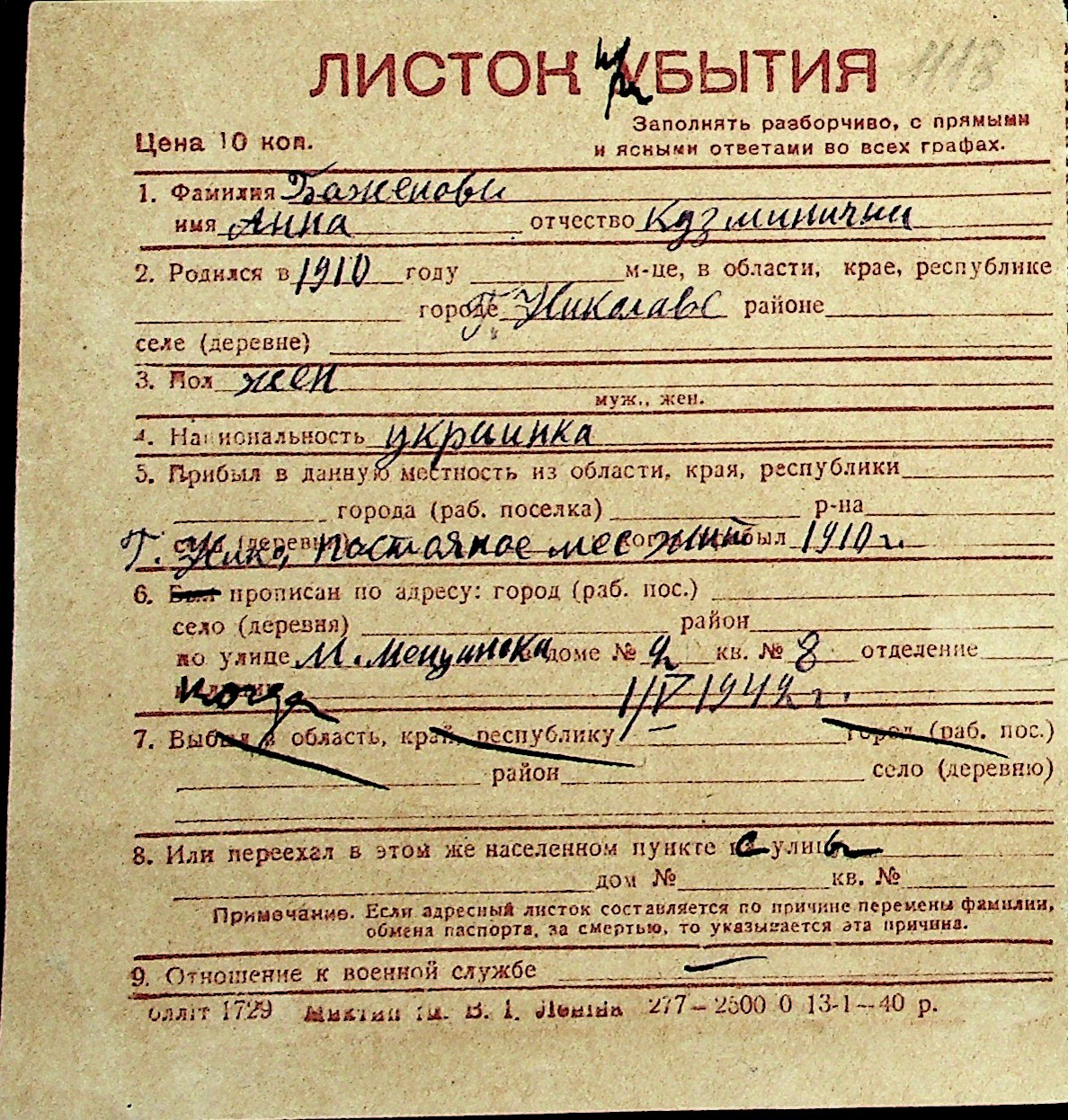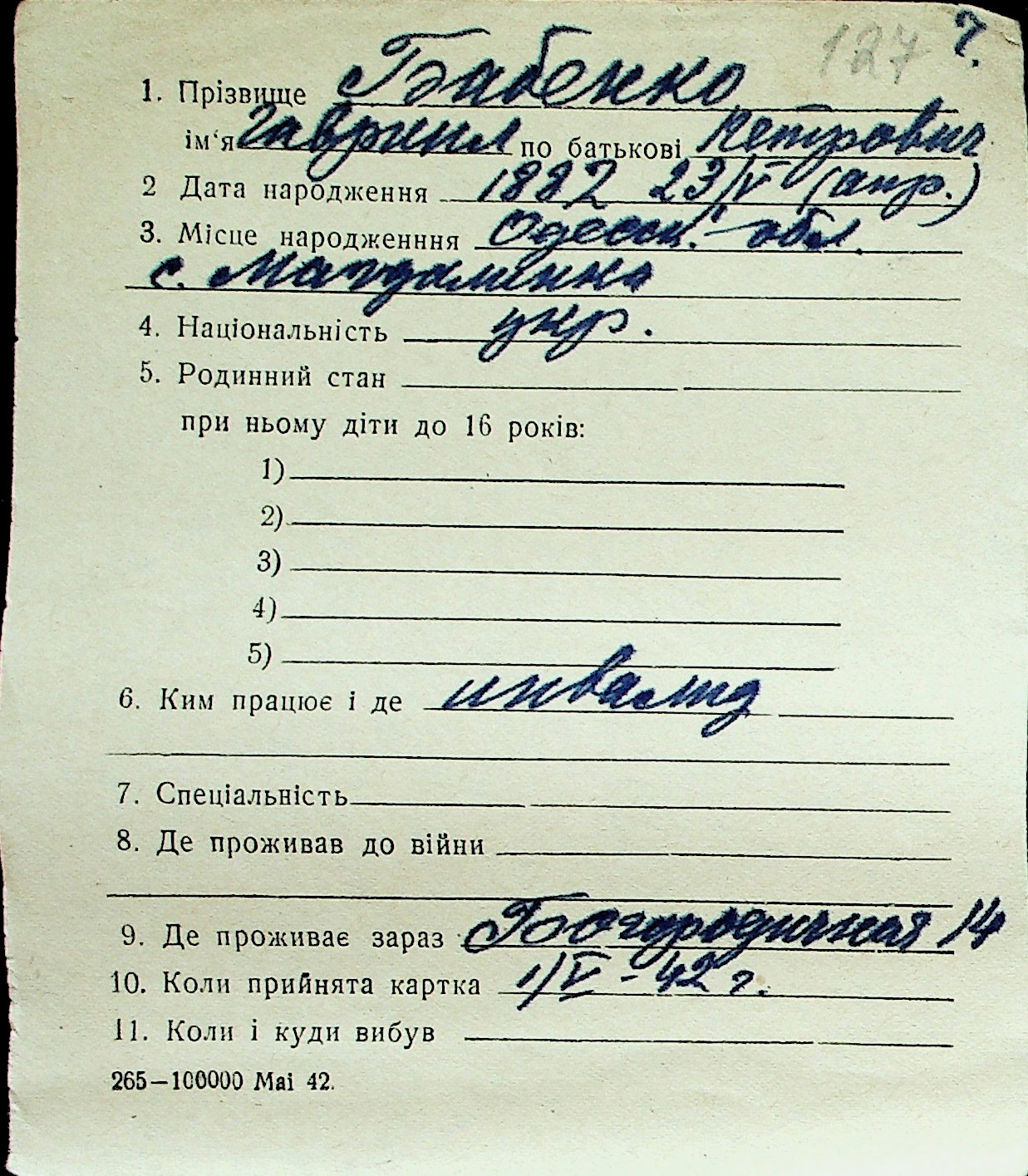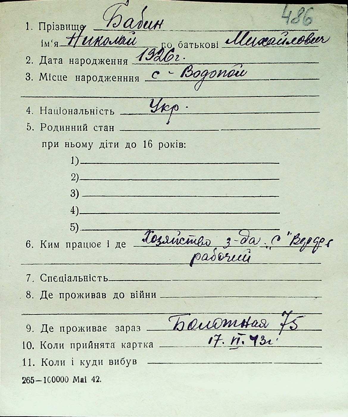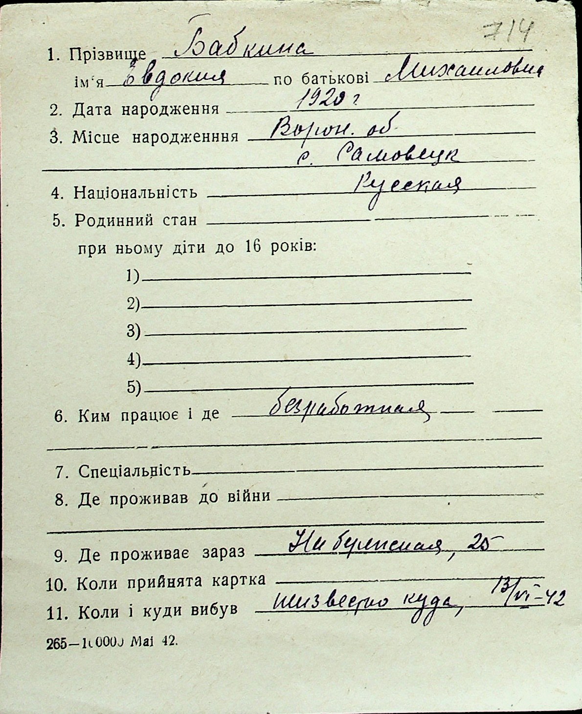 ◦ ◦ Перелік карток на осіб, які мешкали у м. Миколаїв у період окупації 1941–1944 років