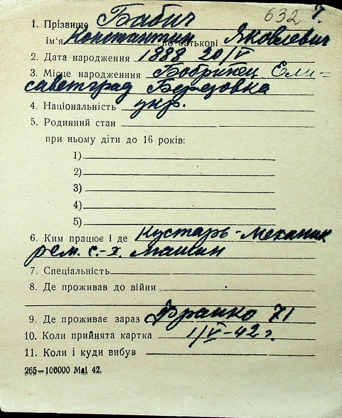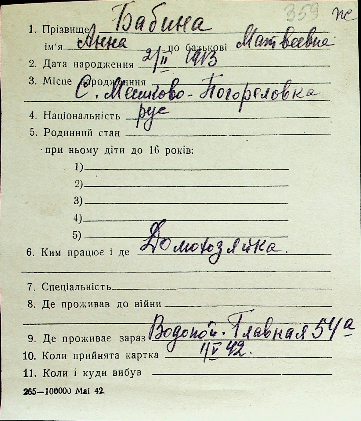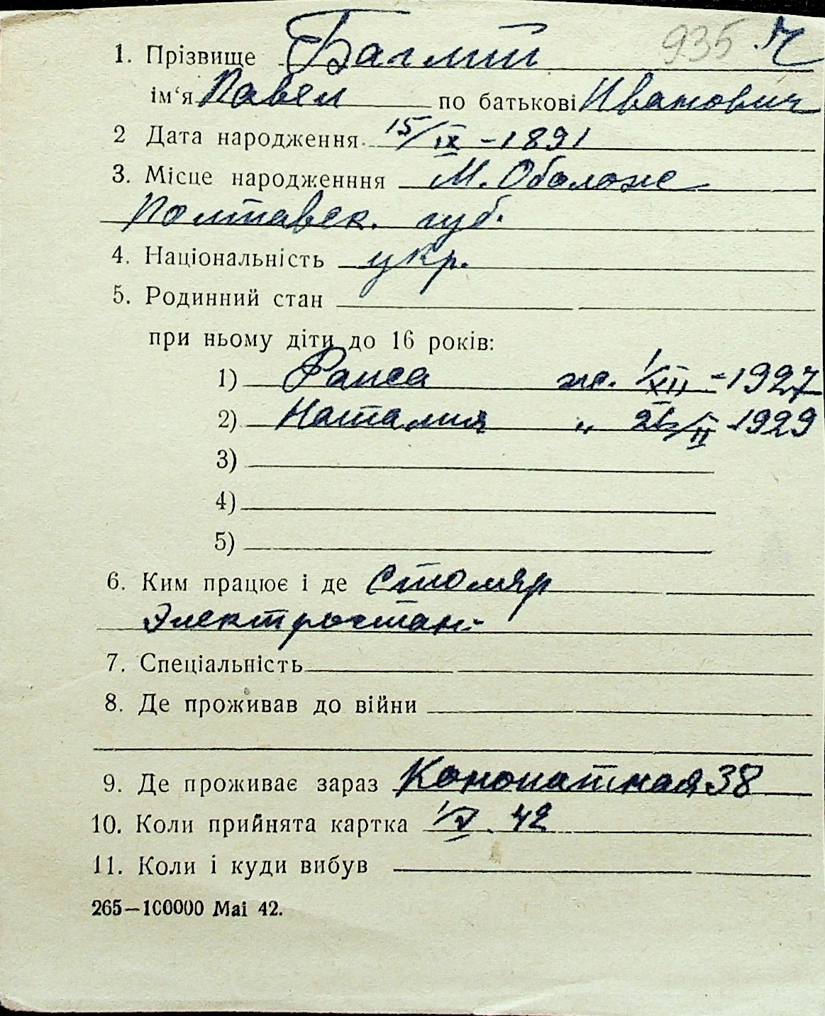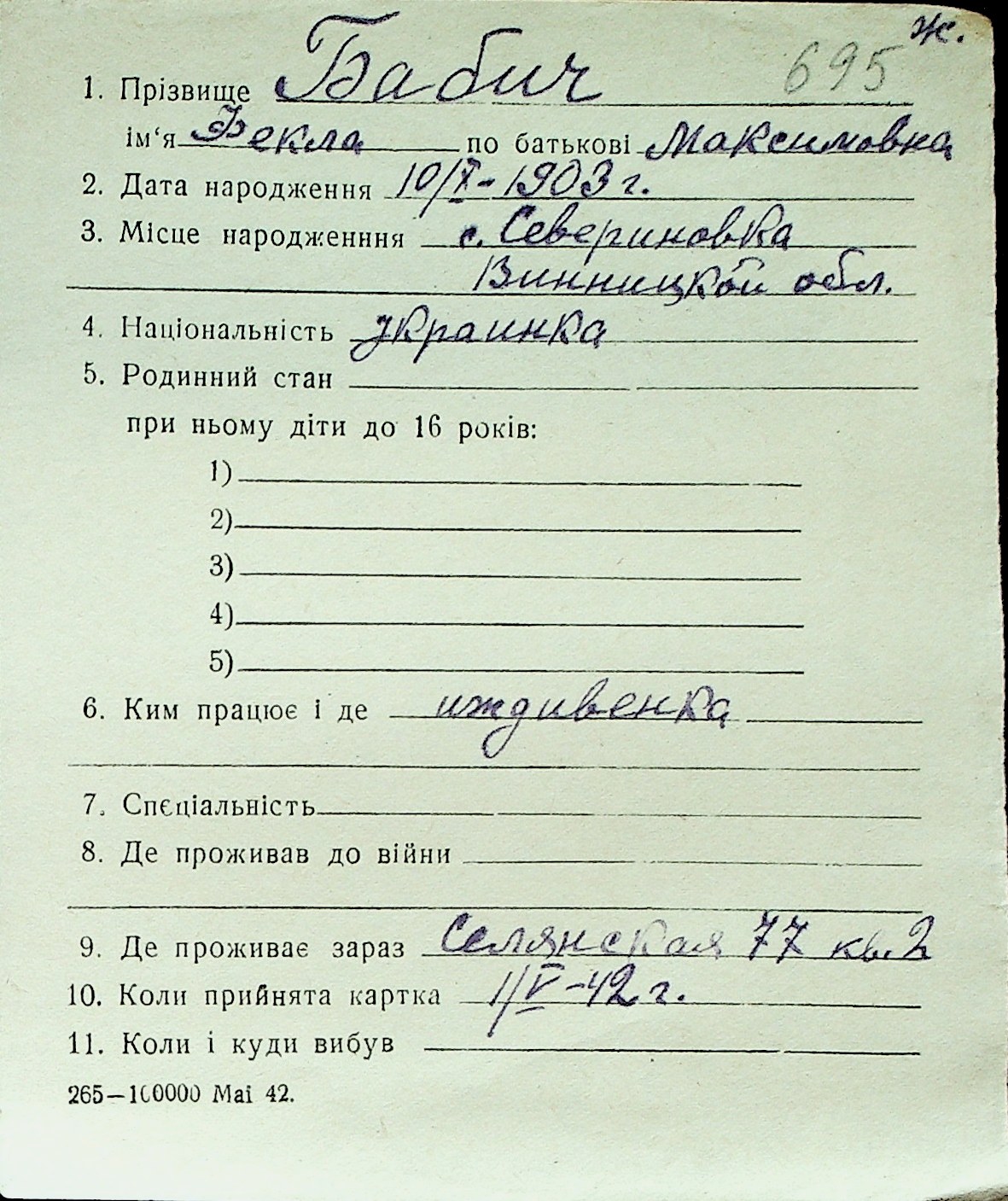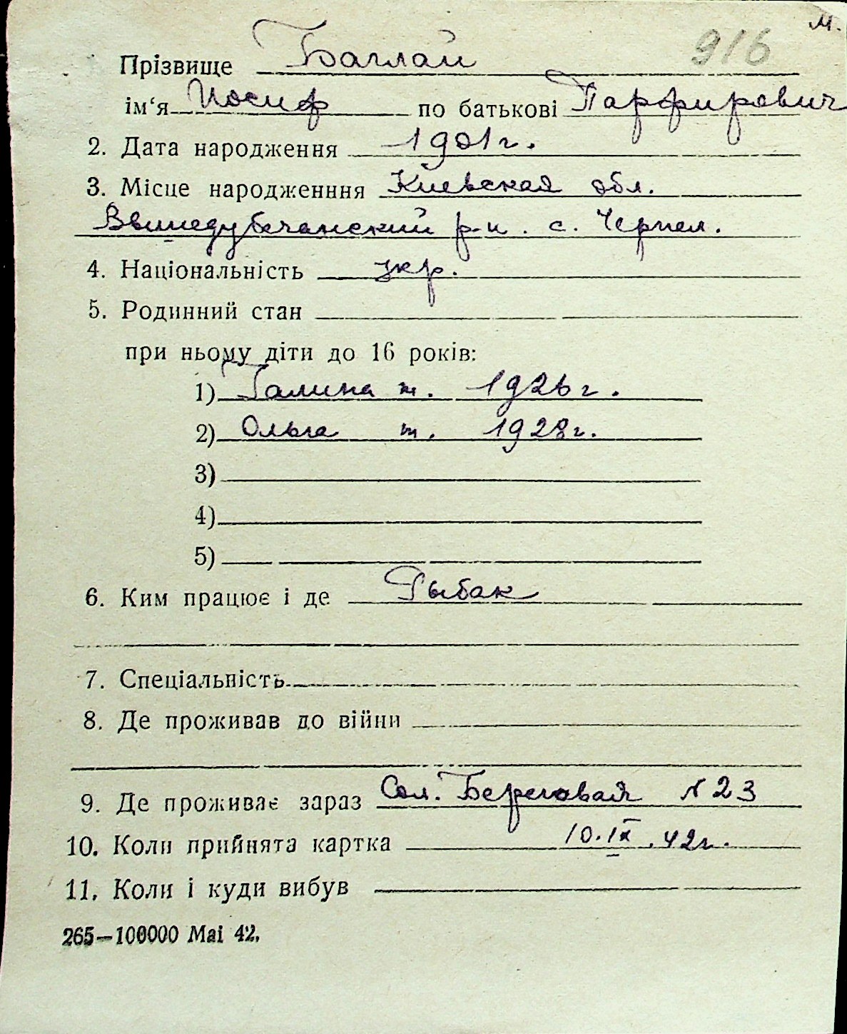 ◦ ◦ Перелік карток на осіб, які мешкали у м. Миколаїв у період окупації 1941–1944 років