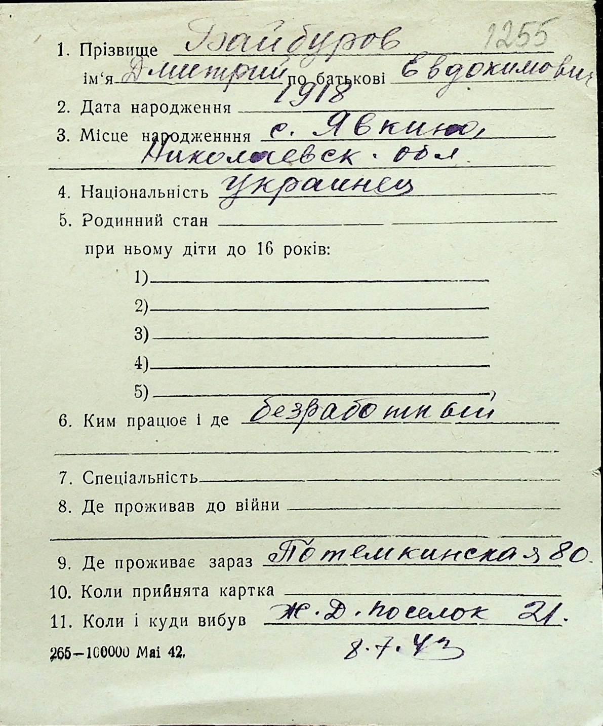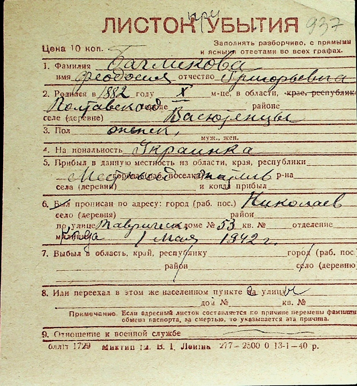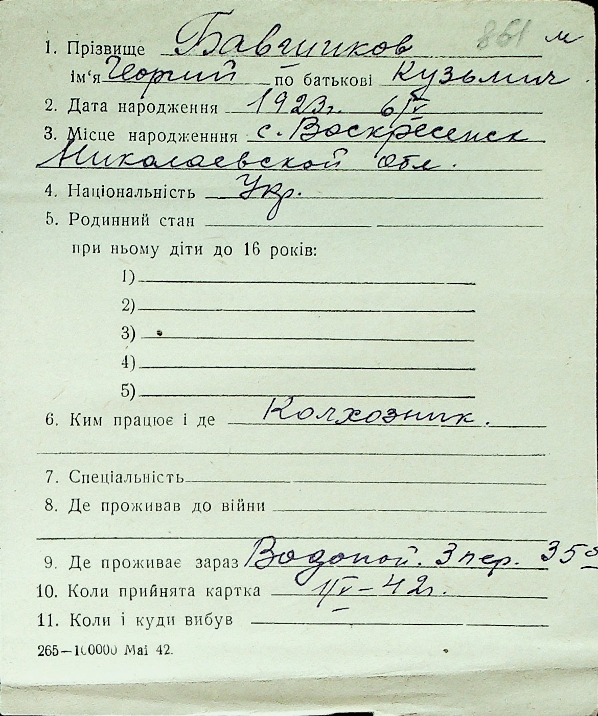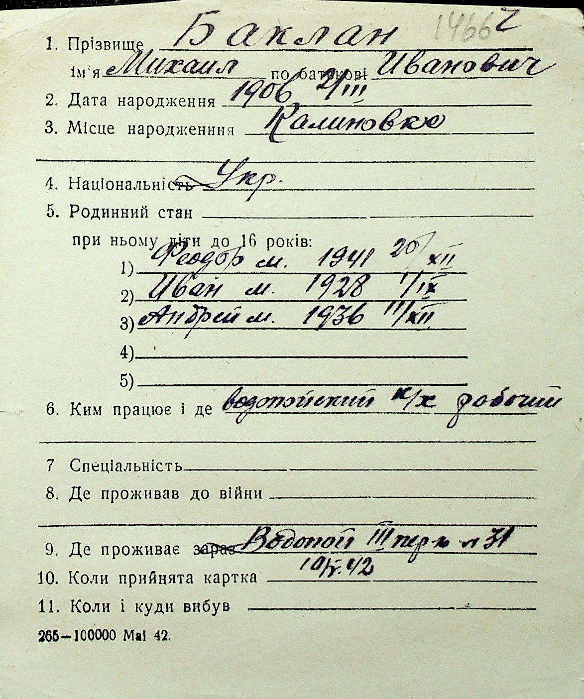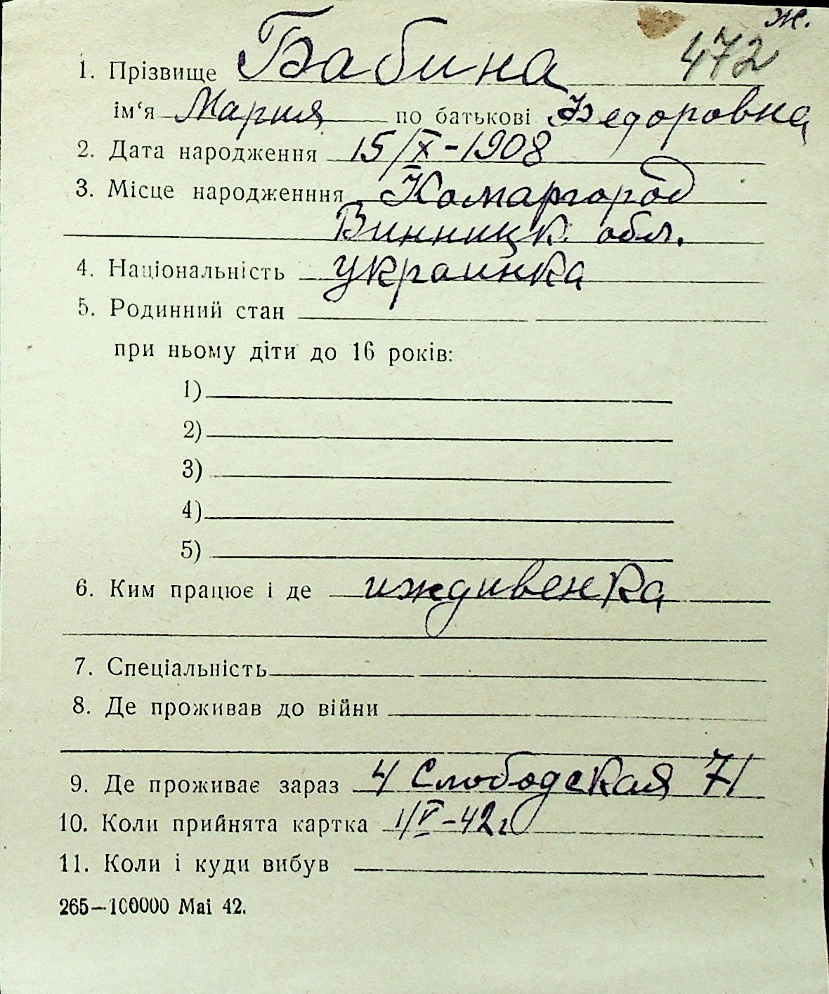 ◦ ◦ Перелік карток на осіб, які мешкали у м. Миколаїв у період окупації 1941–1944 років