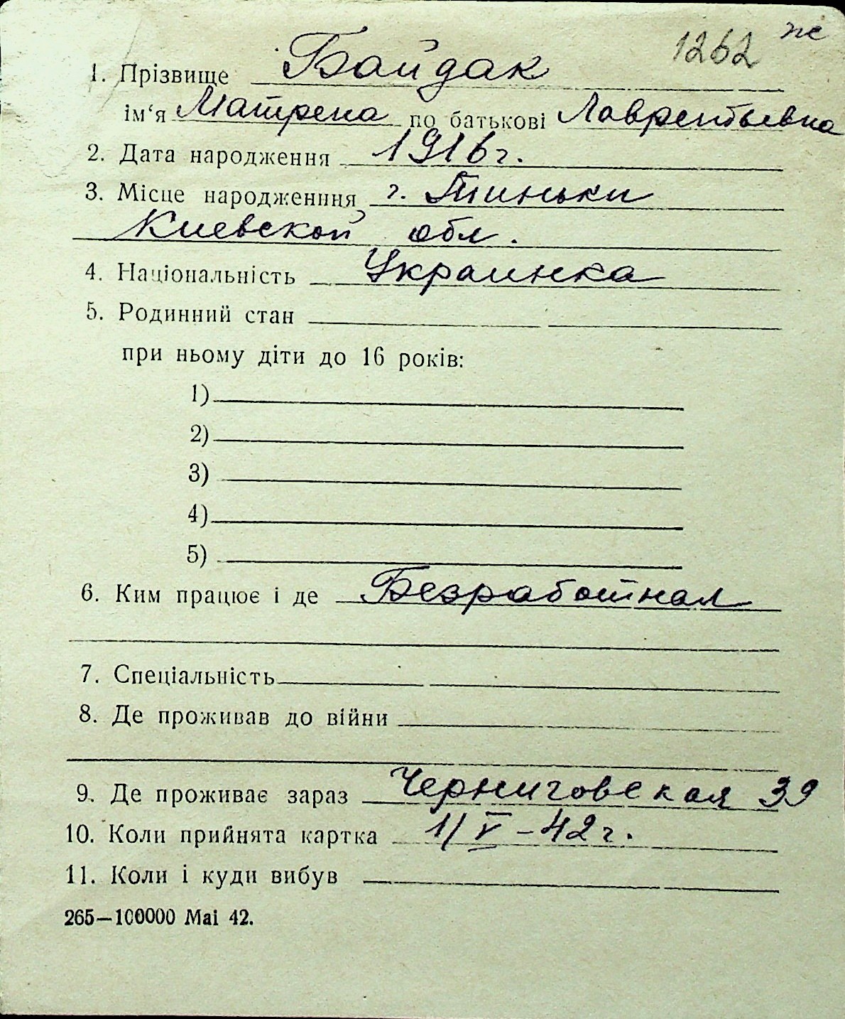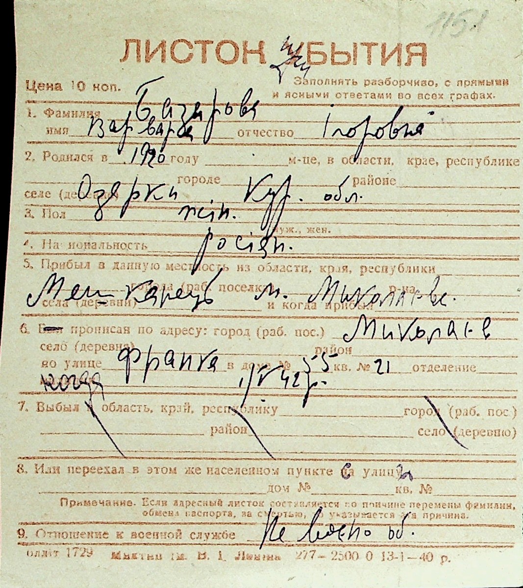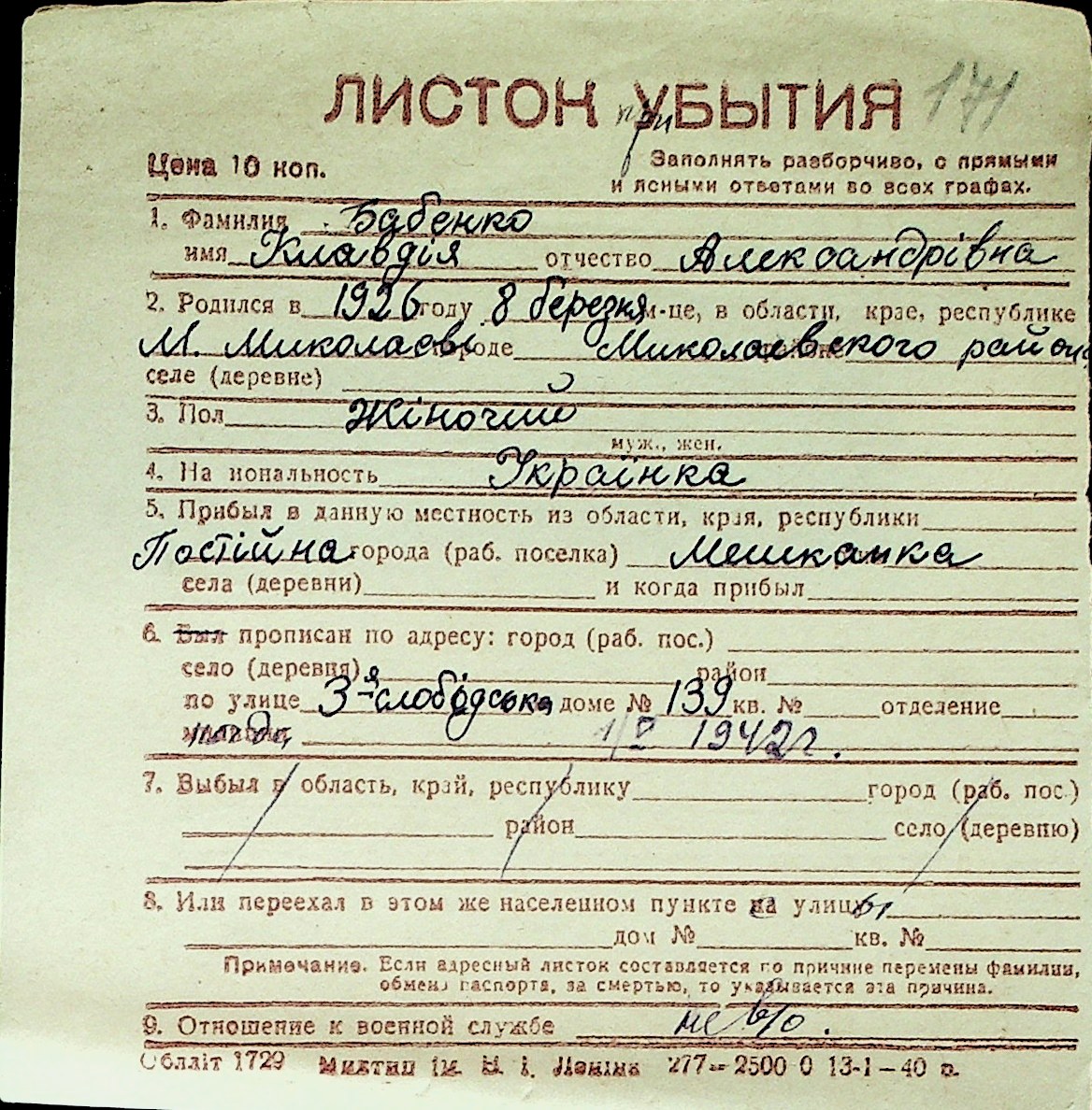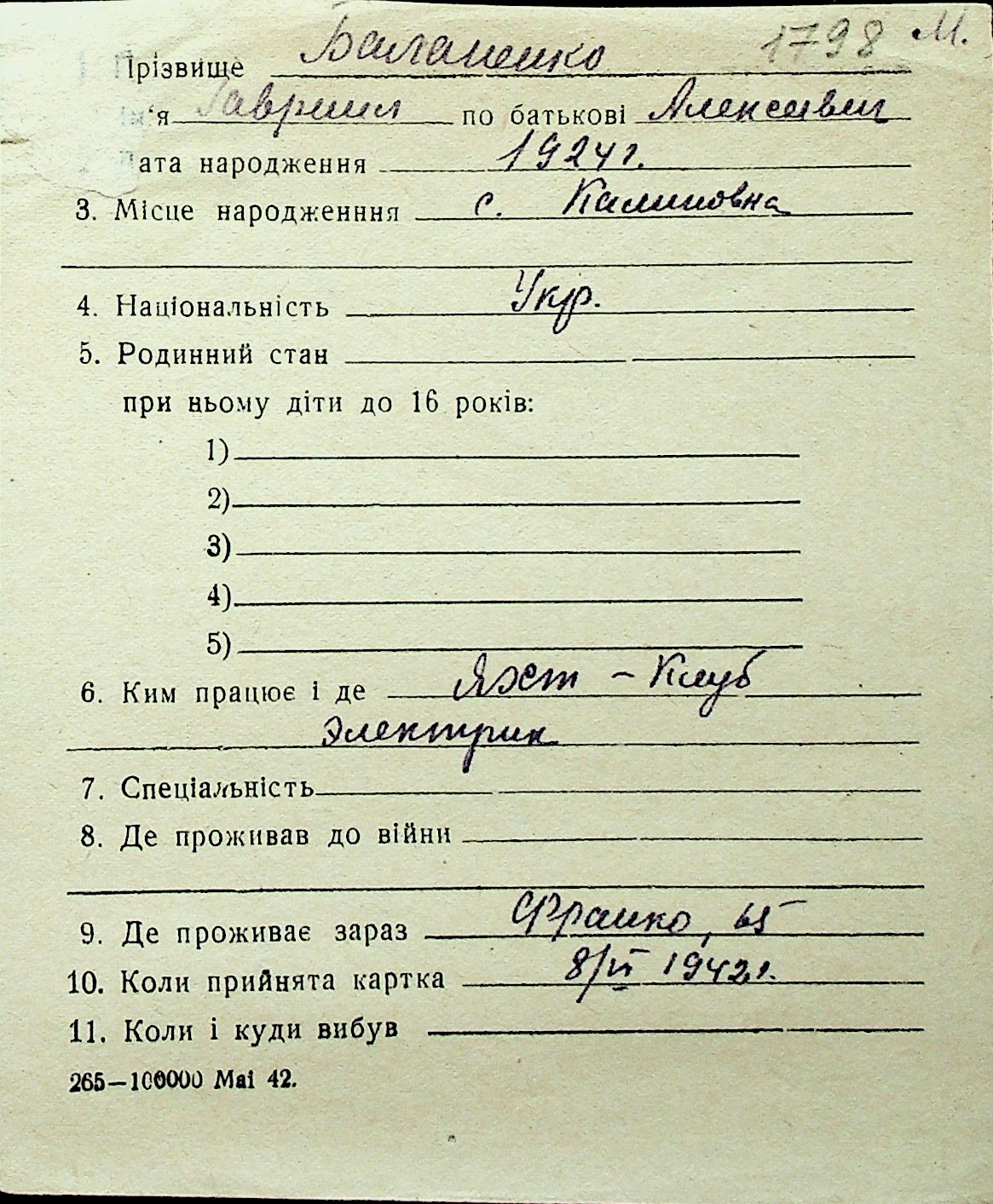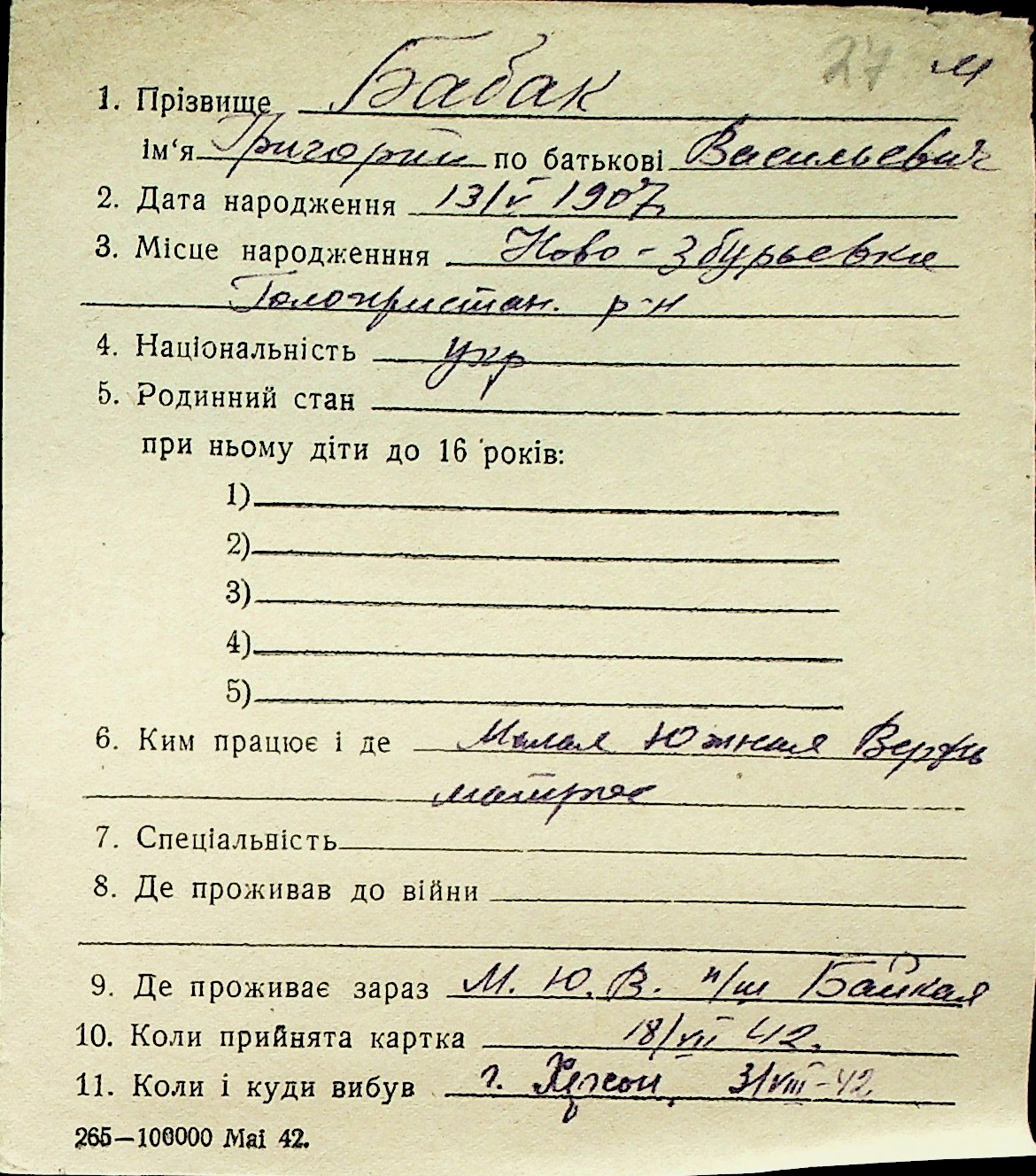 ◦ ◦ Перелік карток на осіб, які мешкали у м. Миколаїв у період окупації 1941–1944 років
