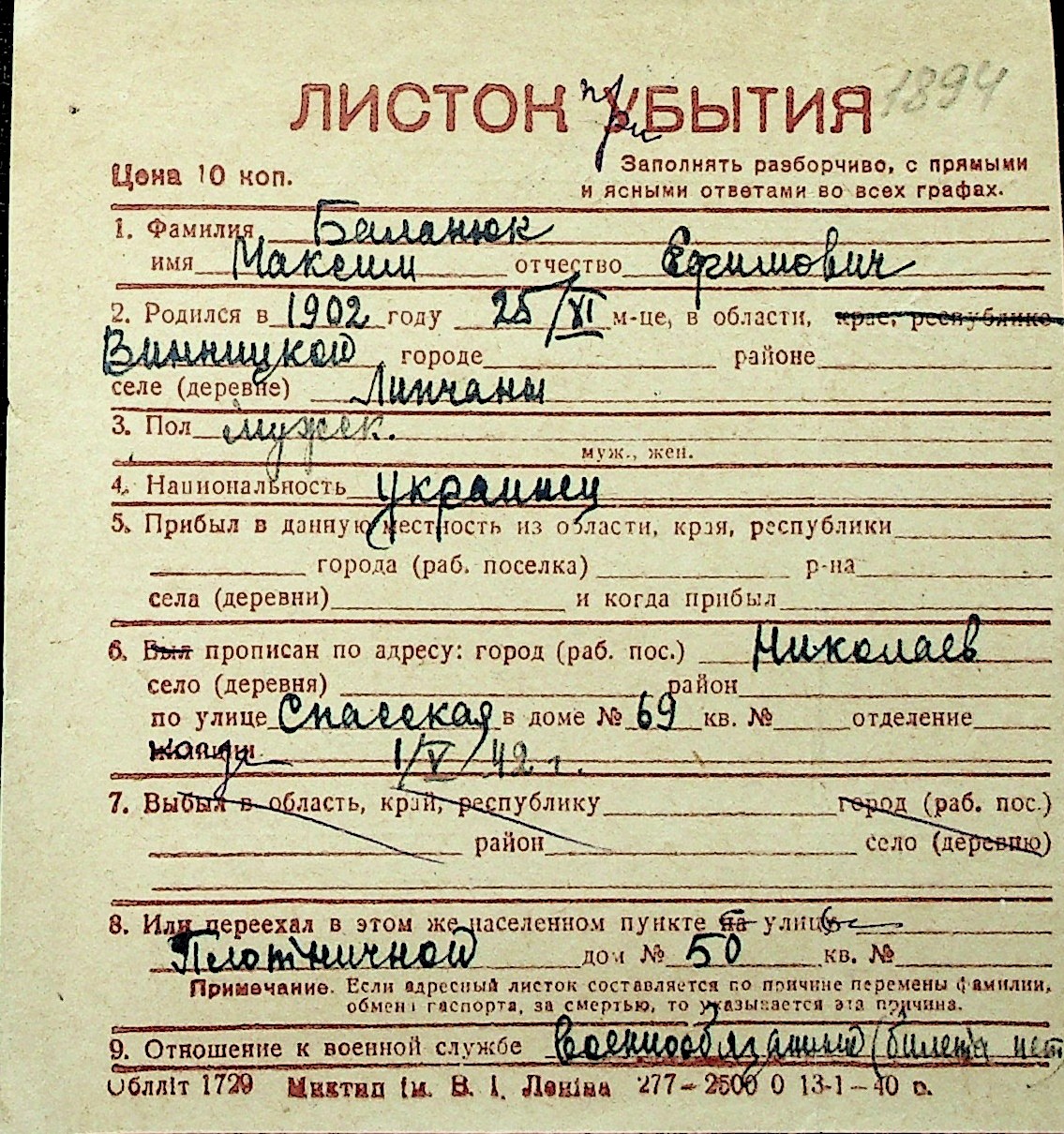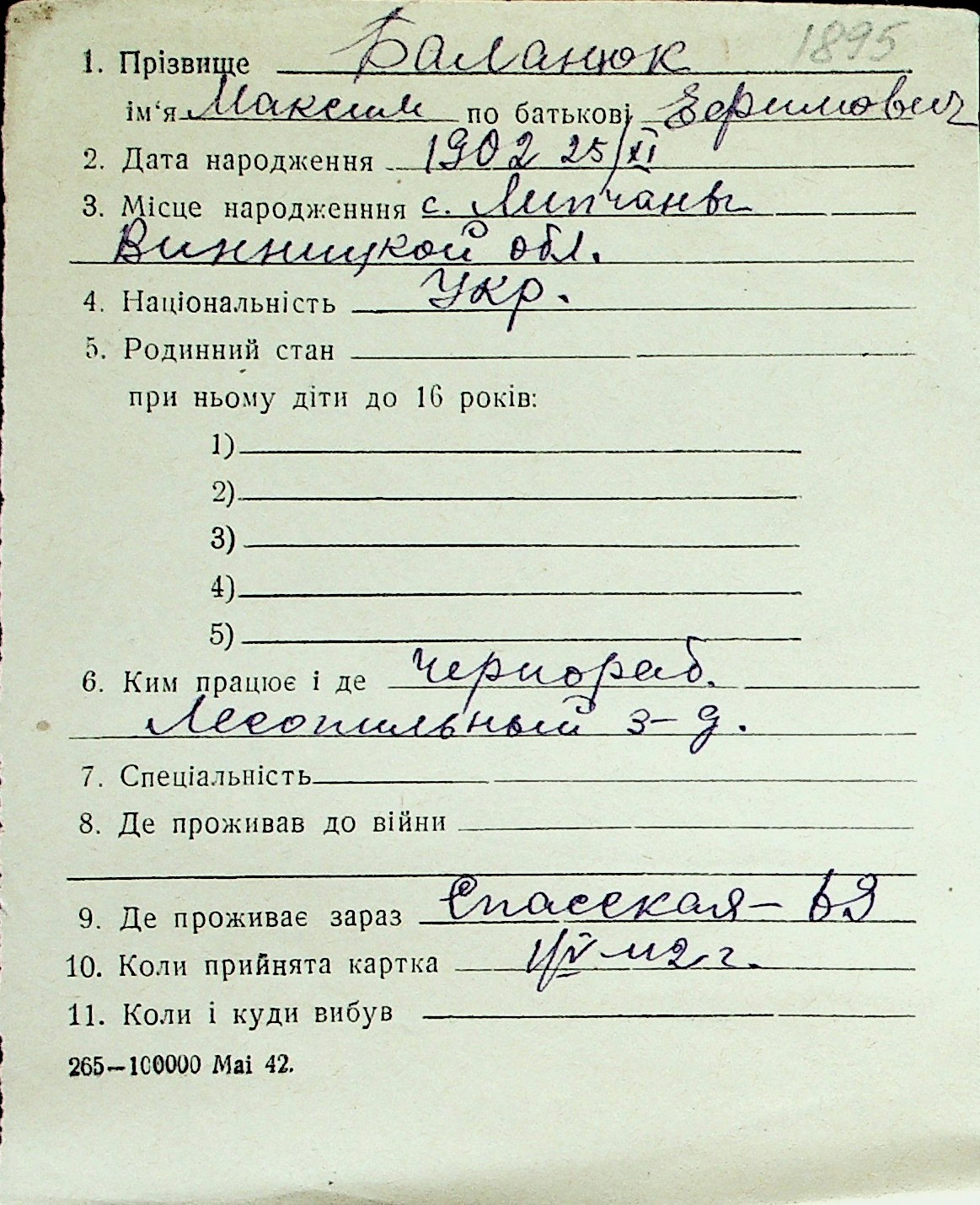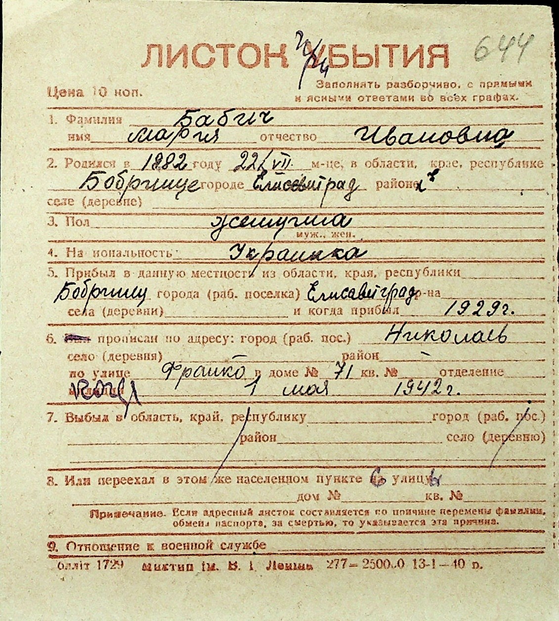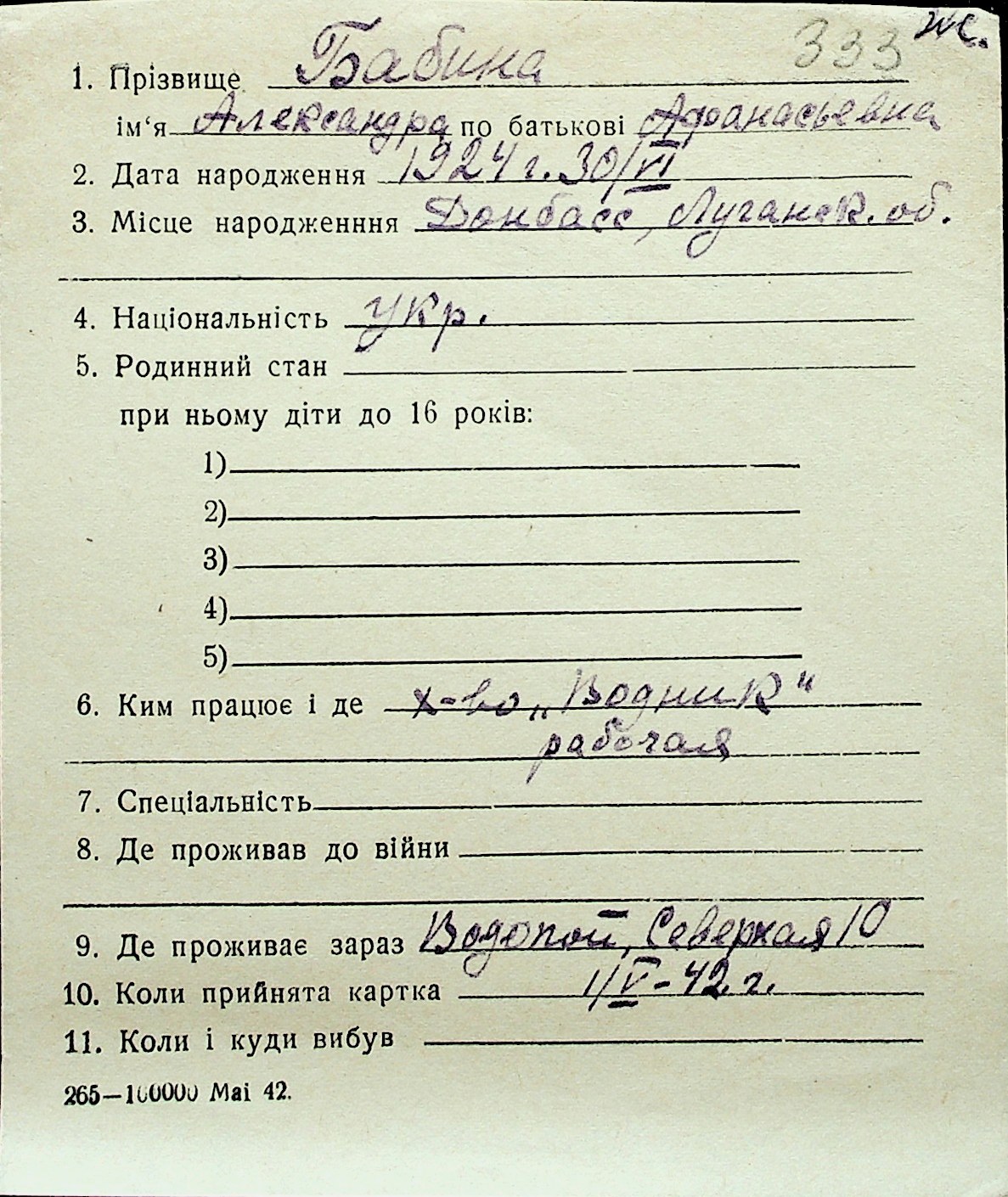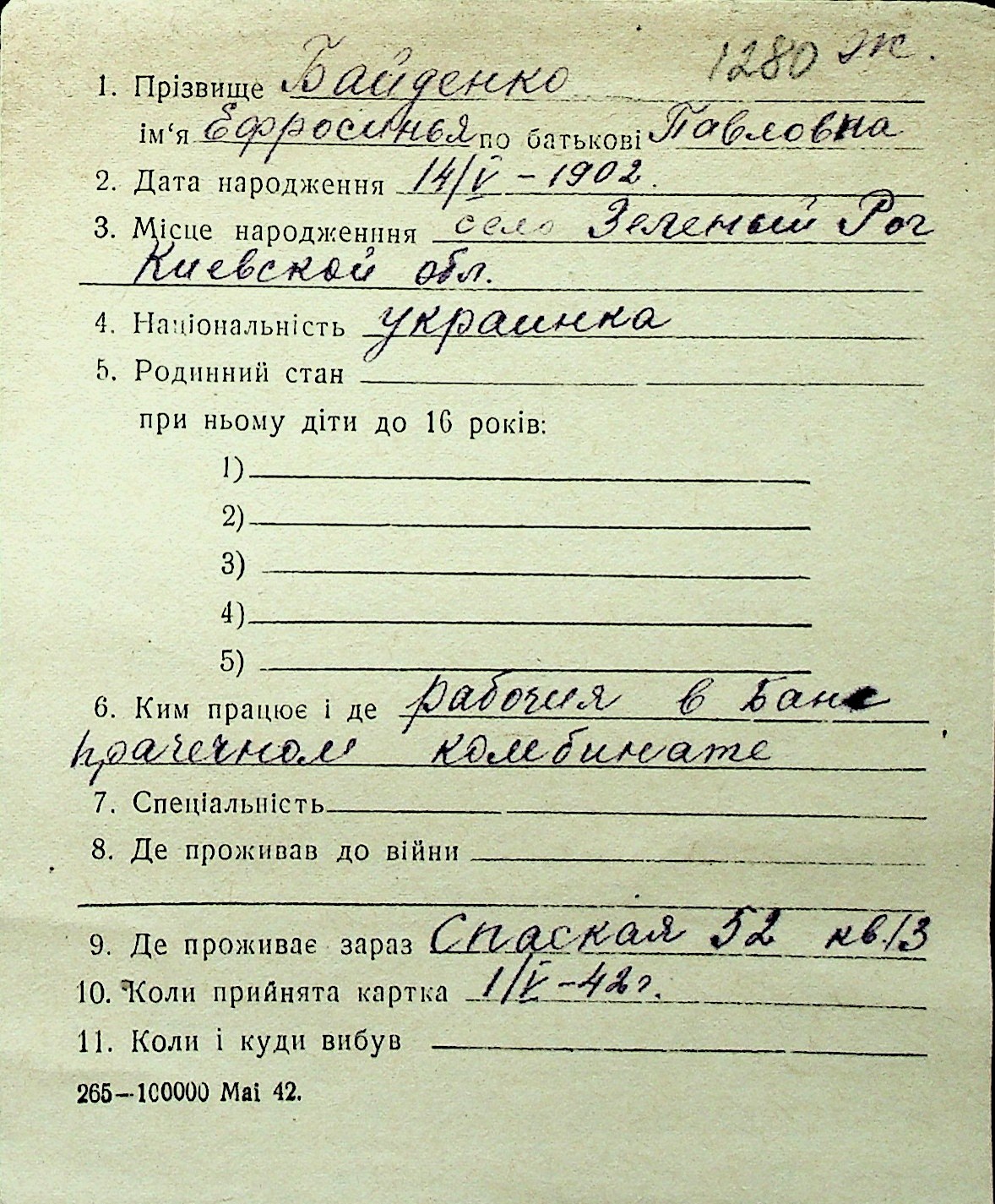 ◦ ◦ Перелік карток на осіб, які мешкали у м. Миколаїв у період окупації 1941–1944 років