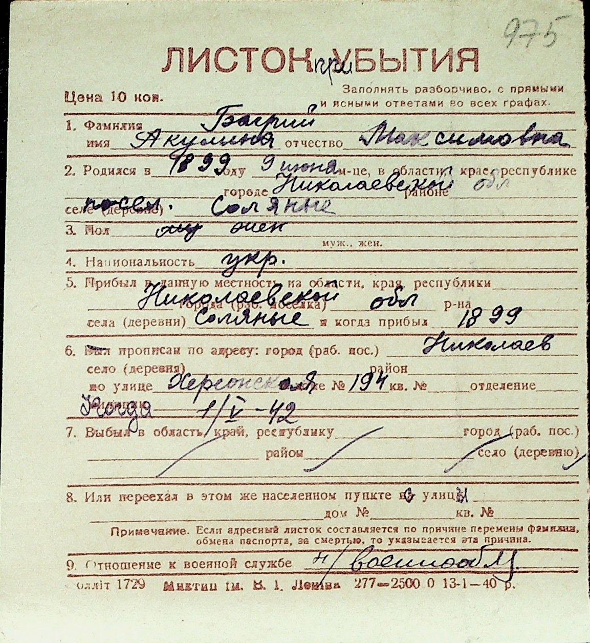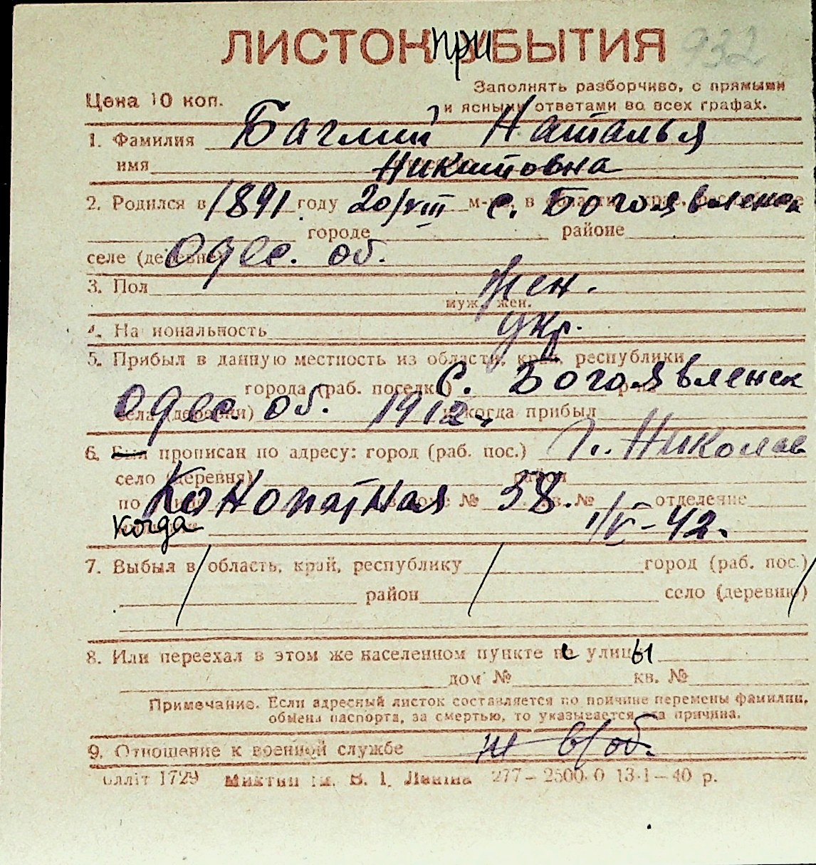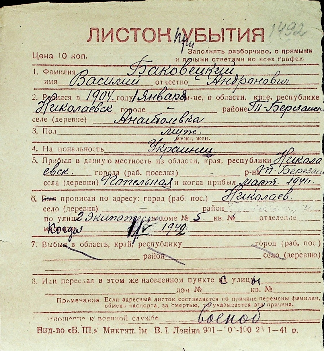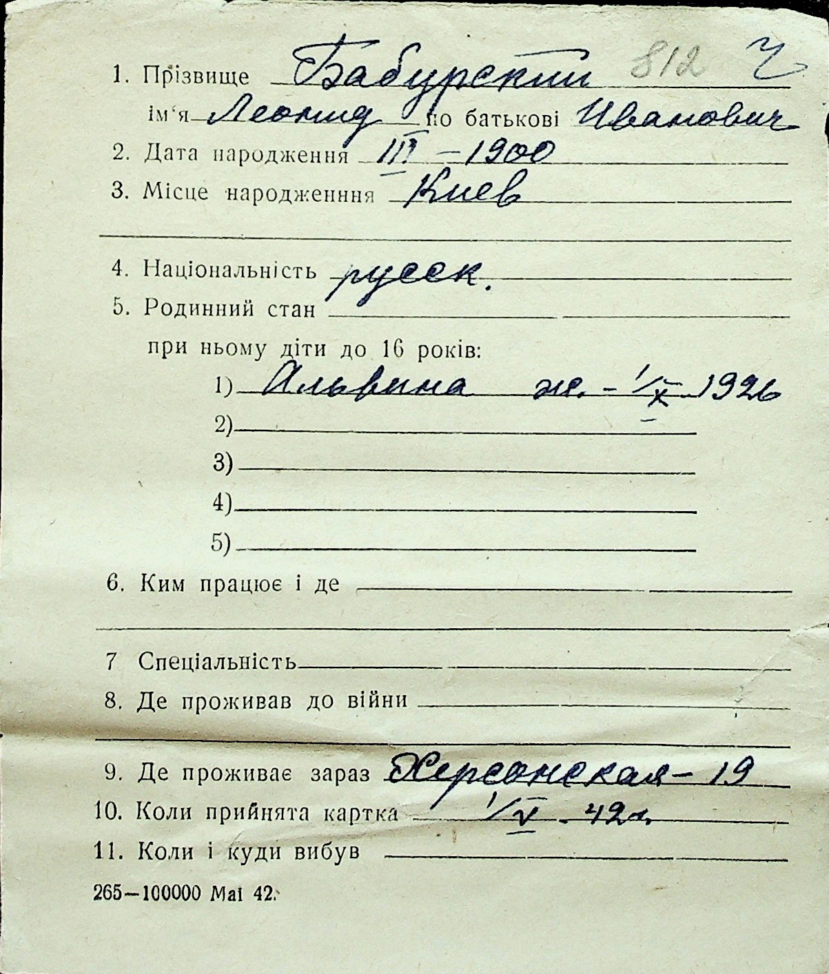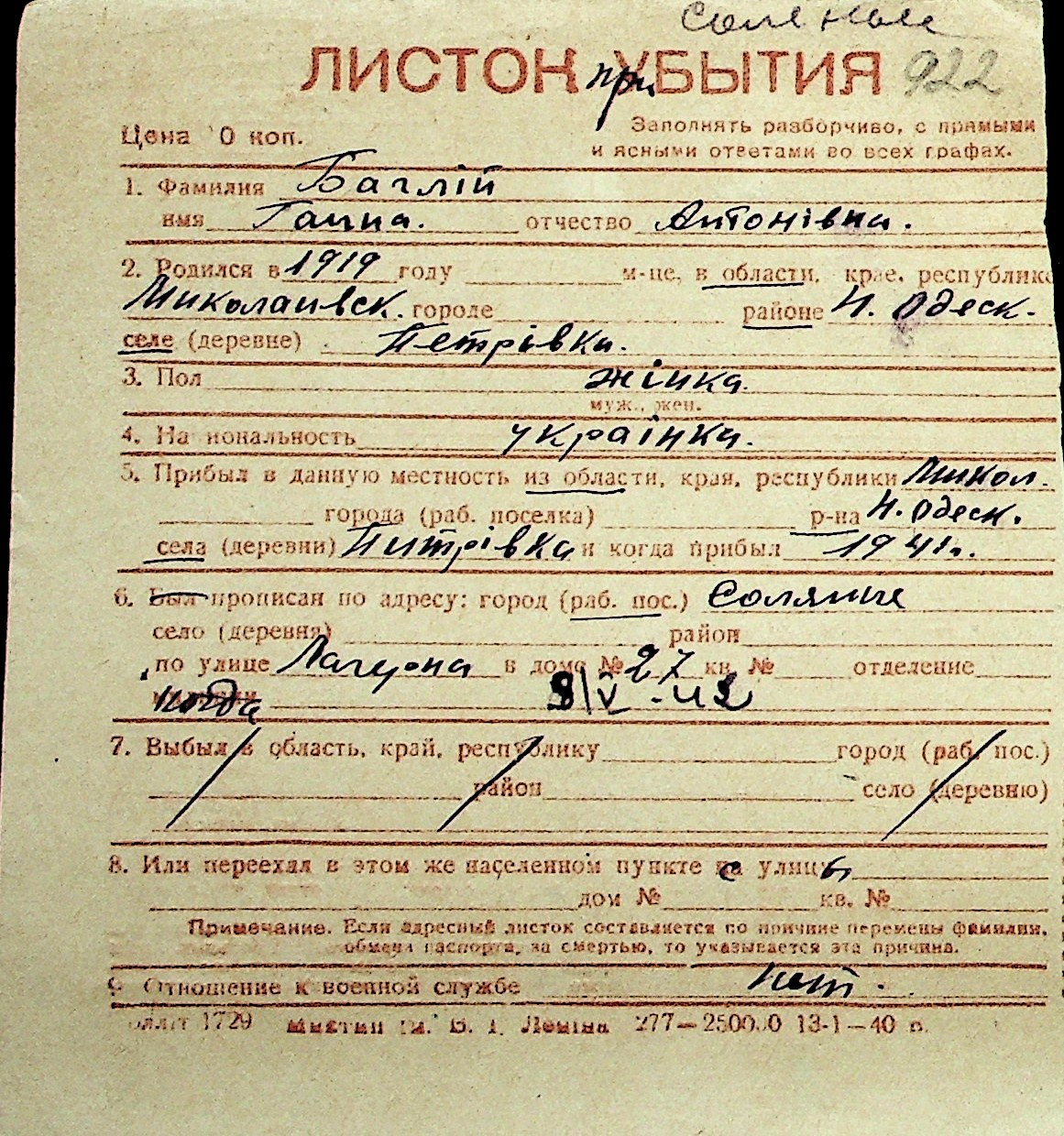 ◦ ◦ Перелік карток на осіб, які мешкали у м. Миколаїв у період окупації 1941–1944 років