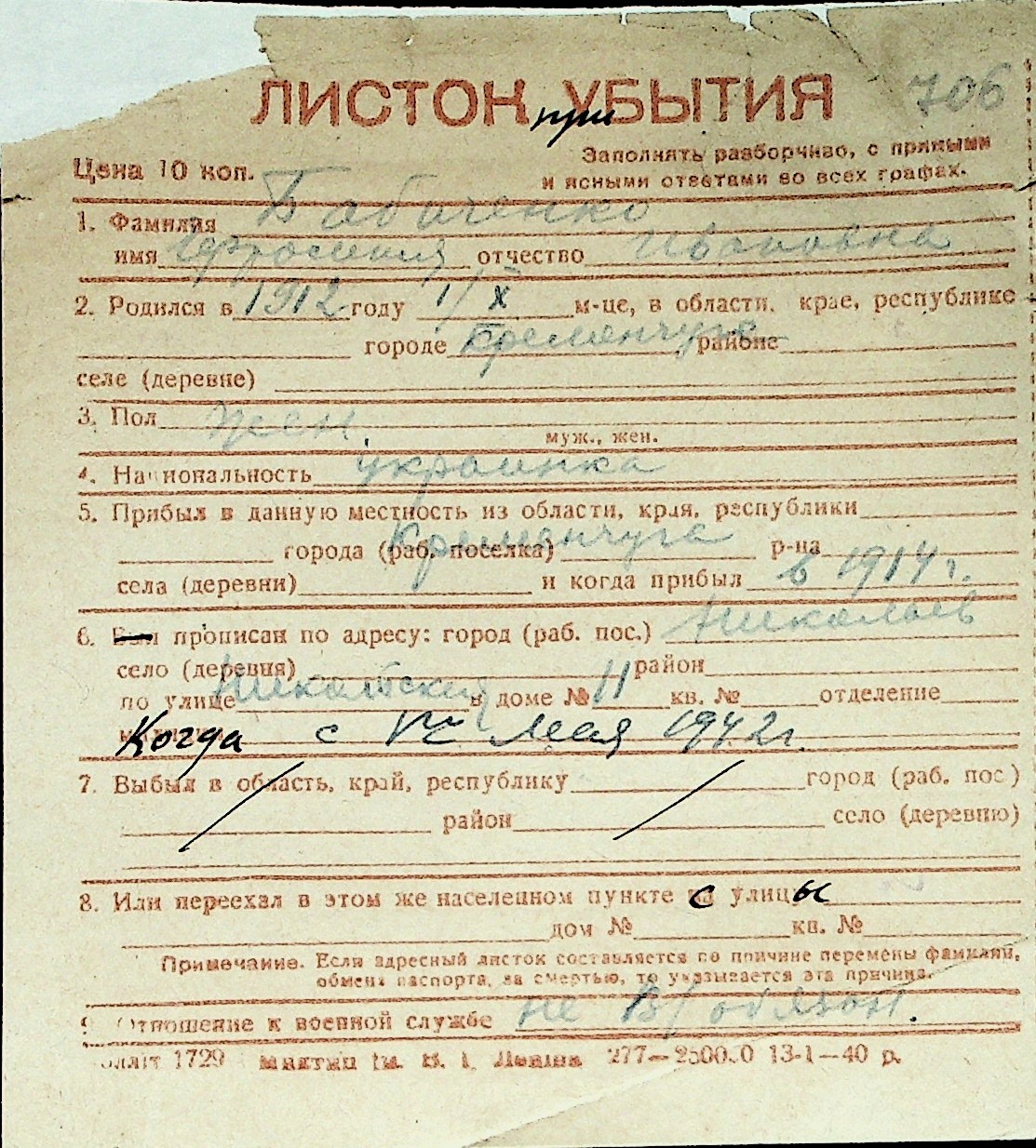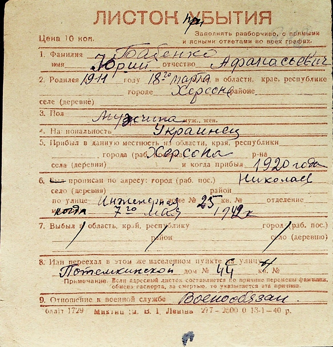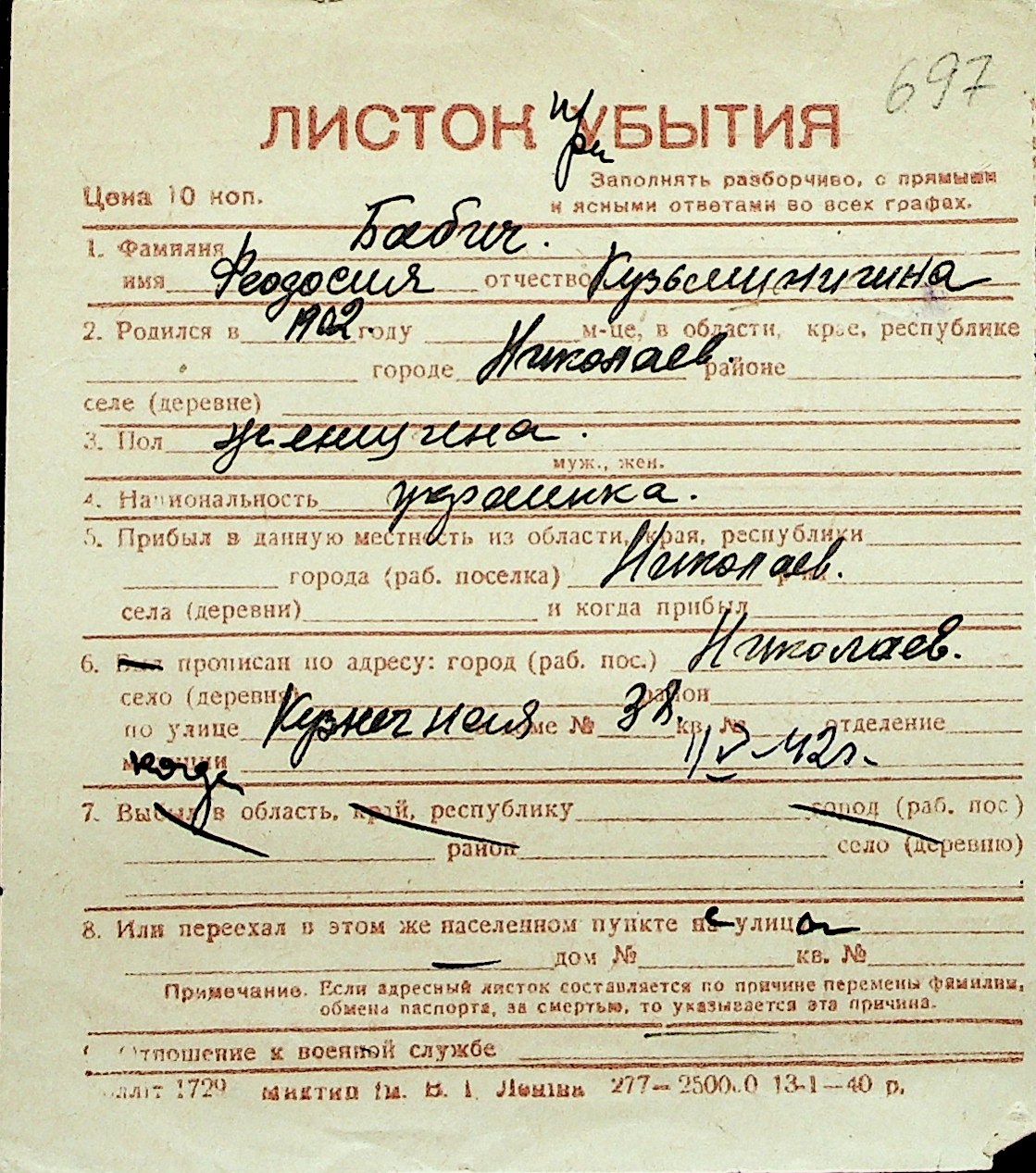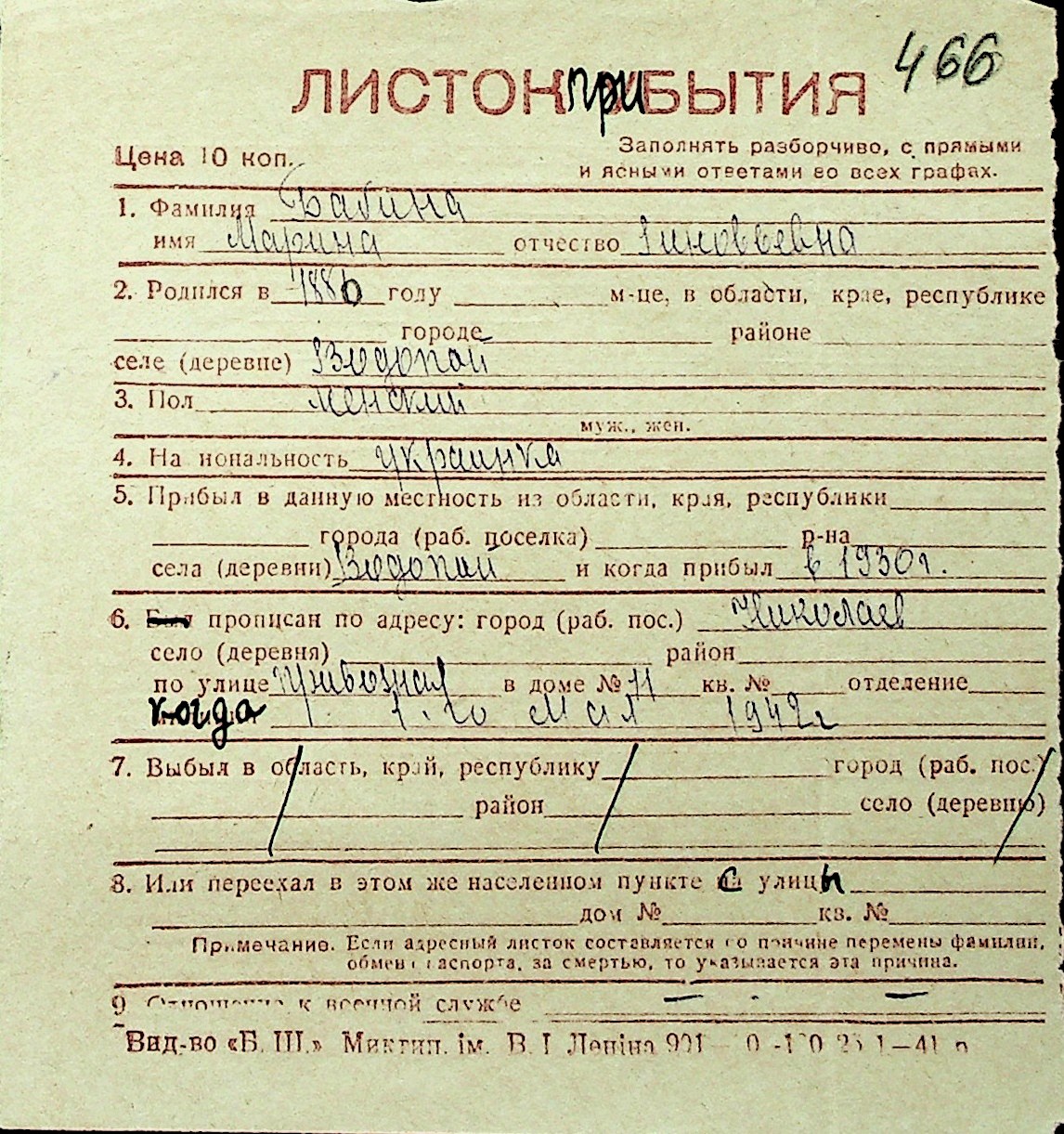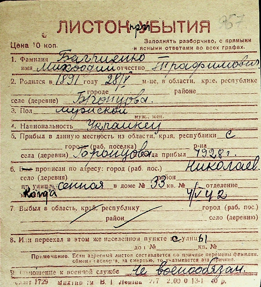◦ ◦ Перелік карток на осіб, які мешкали у м. Миколаїв у період окупації 1941–1944 років