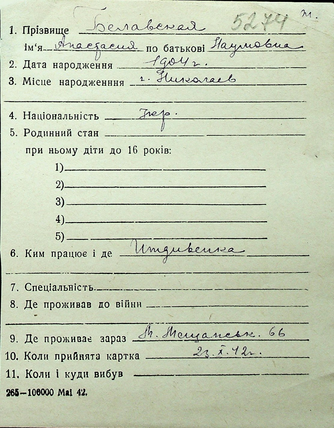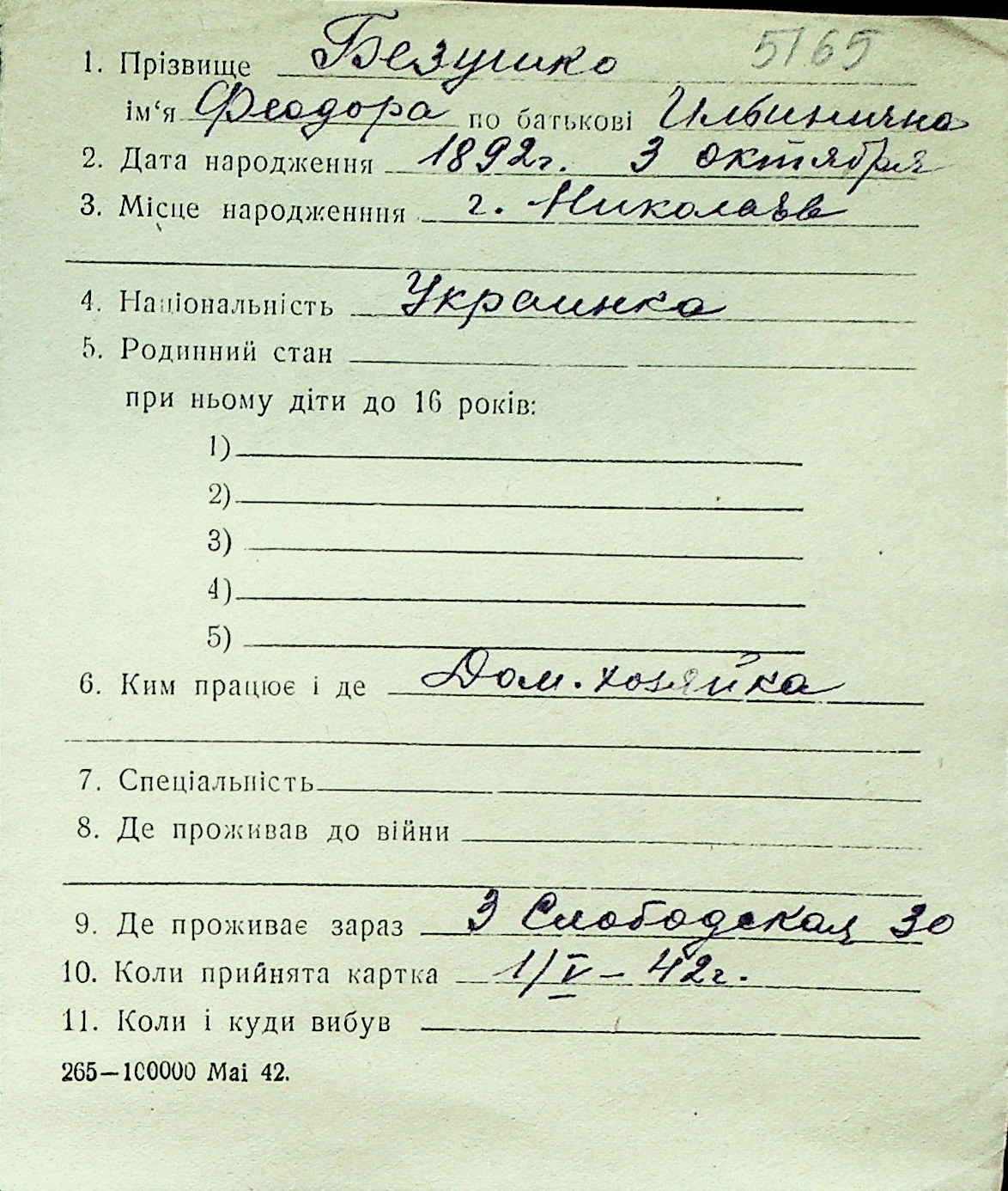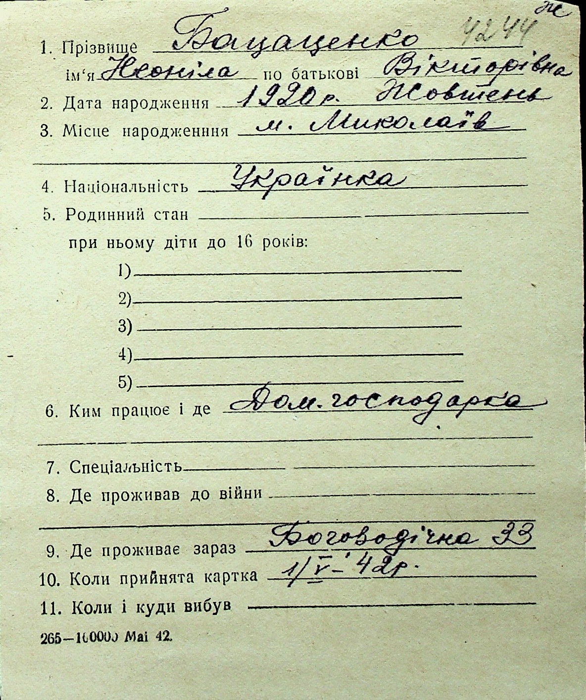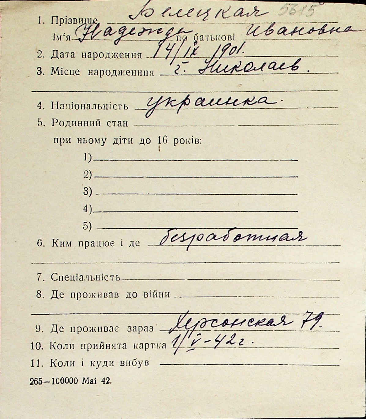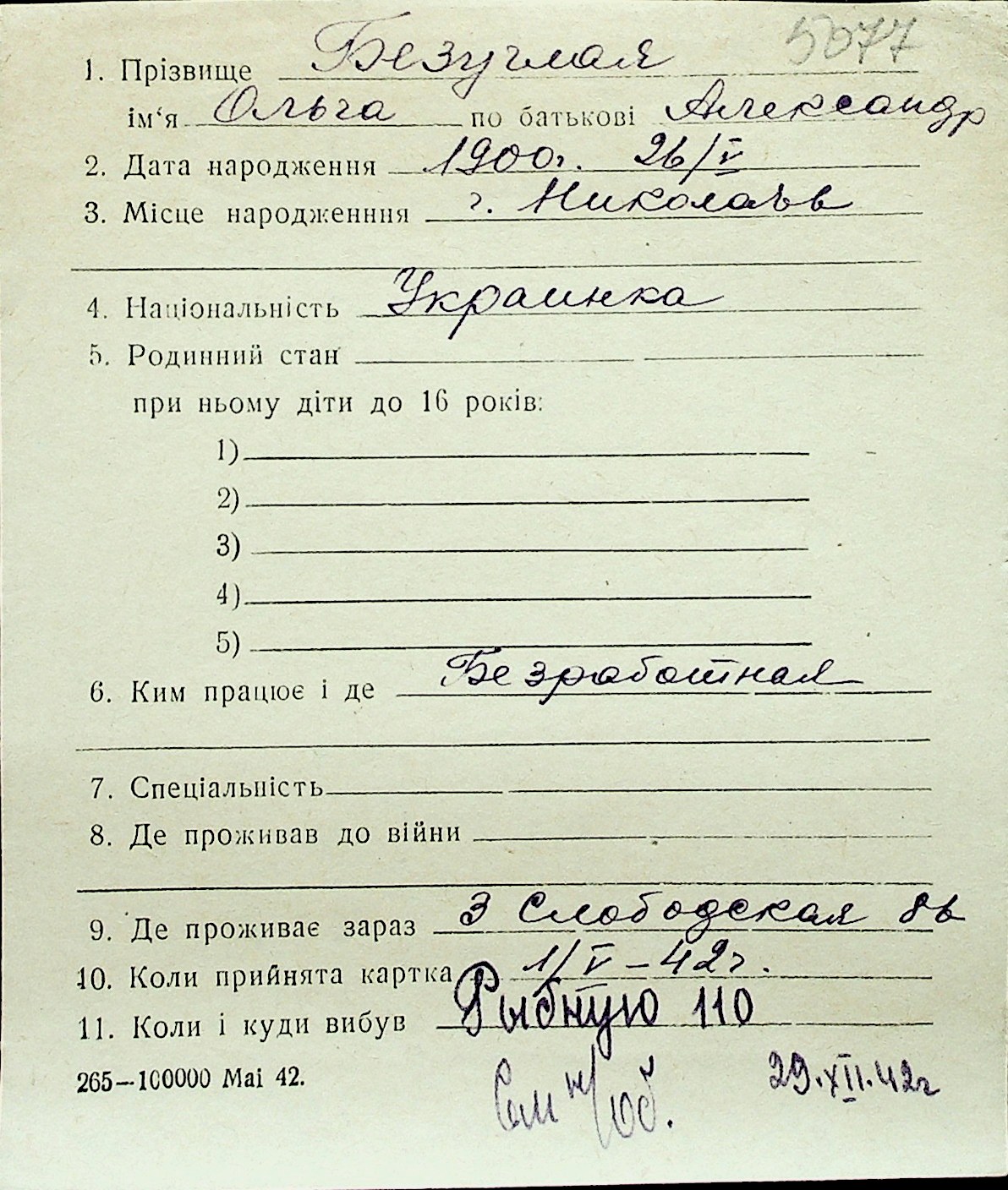 ◦ ◦ Перелік карток на осіб, які мешкали у м. Миколаїв у період окупації 1941–1944 років