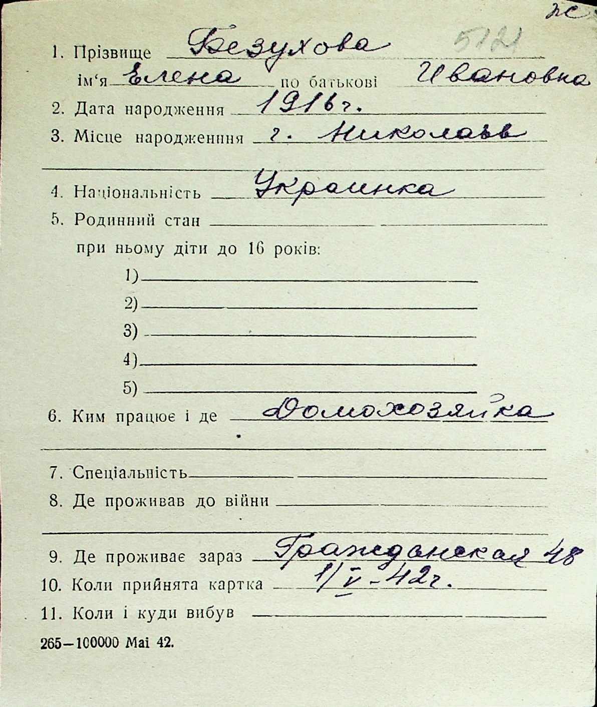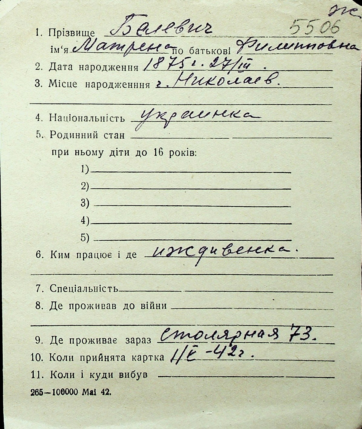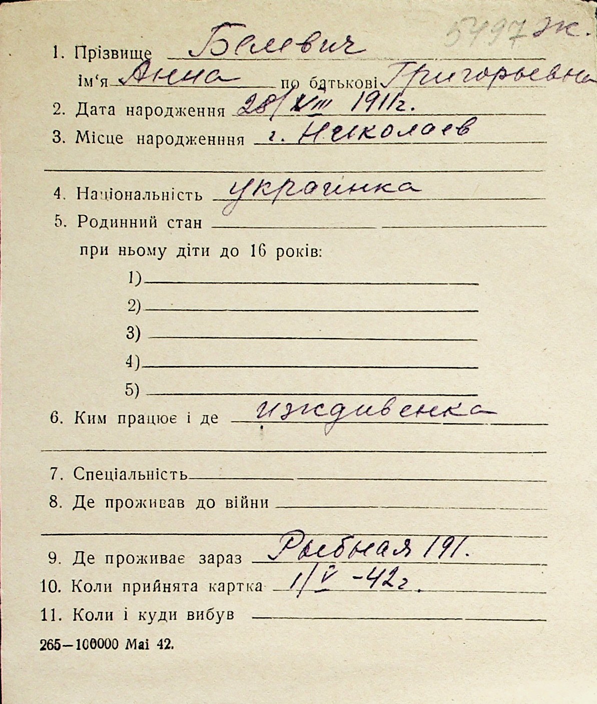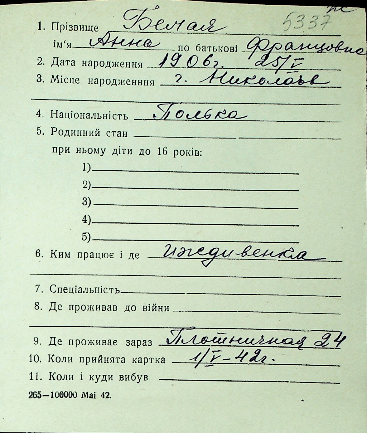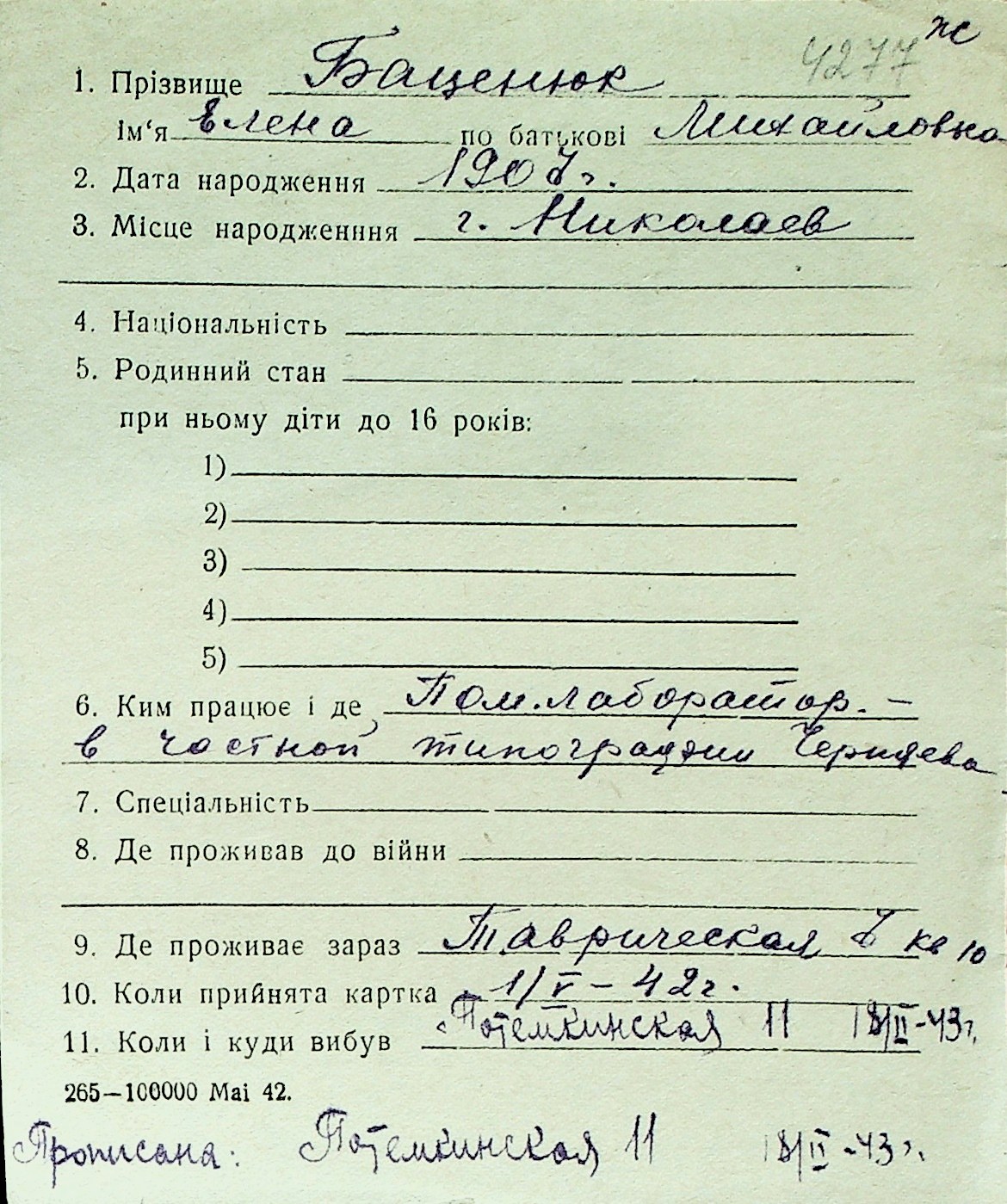 ◦ ◦ Перелік карток на осіб, які мешкали у м. Миколаїв у період окупації 1941–1944 років
