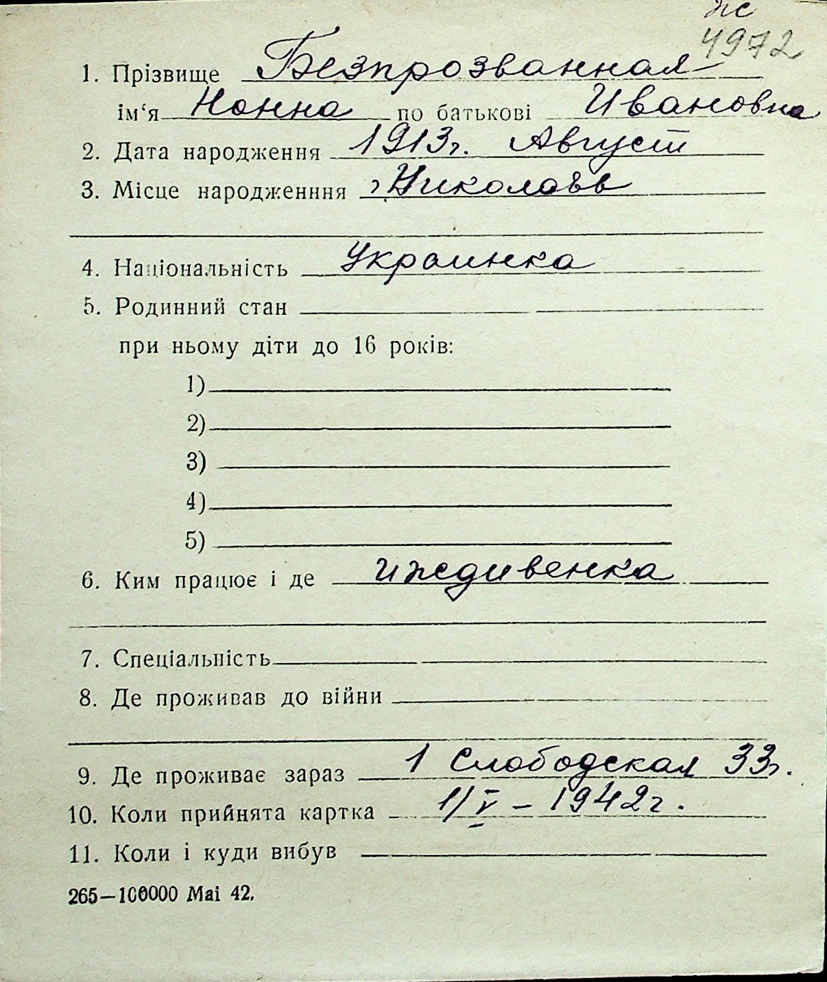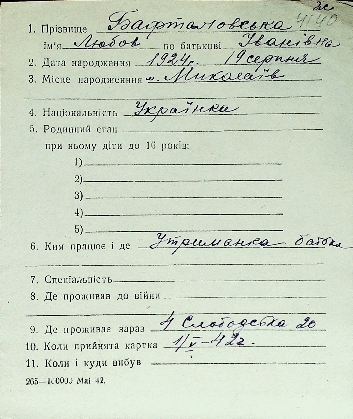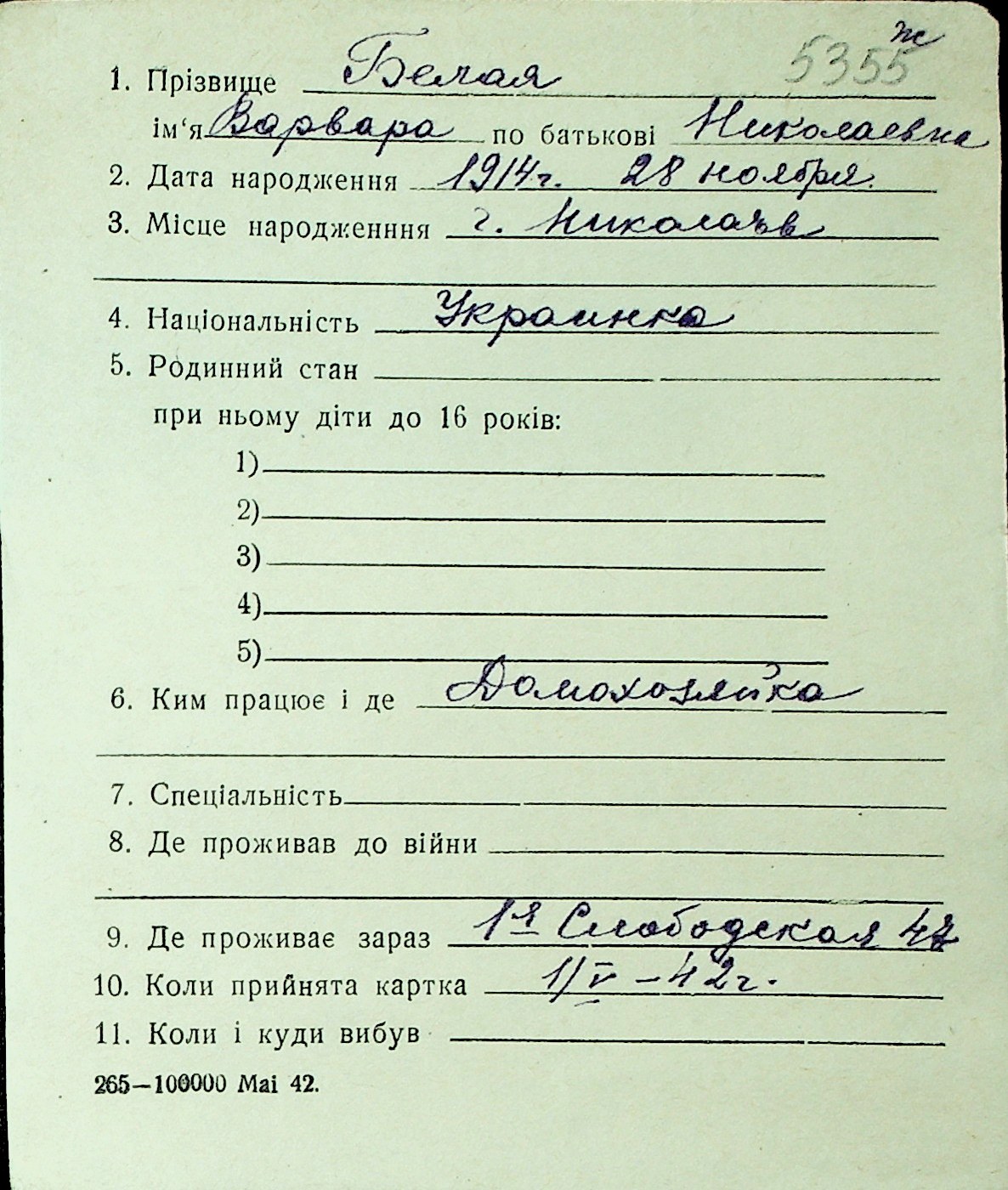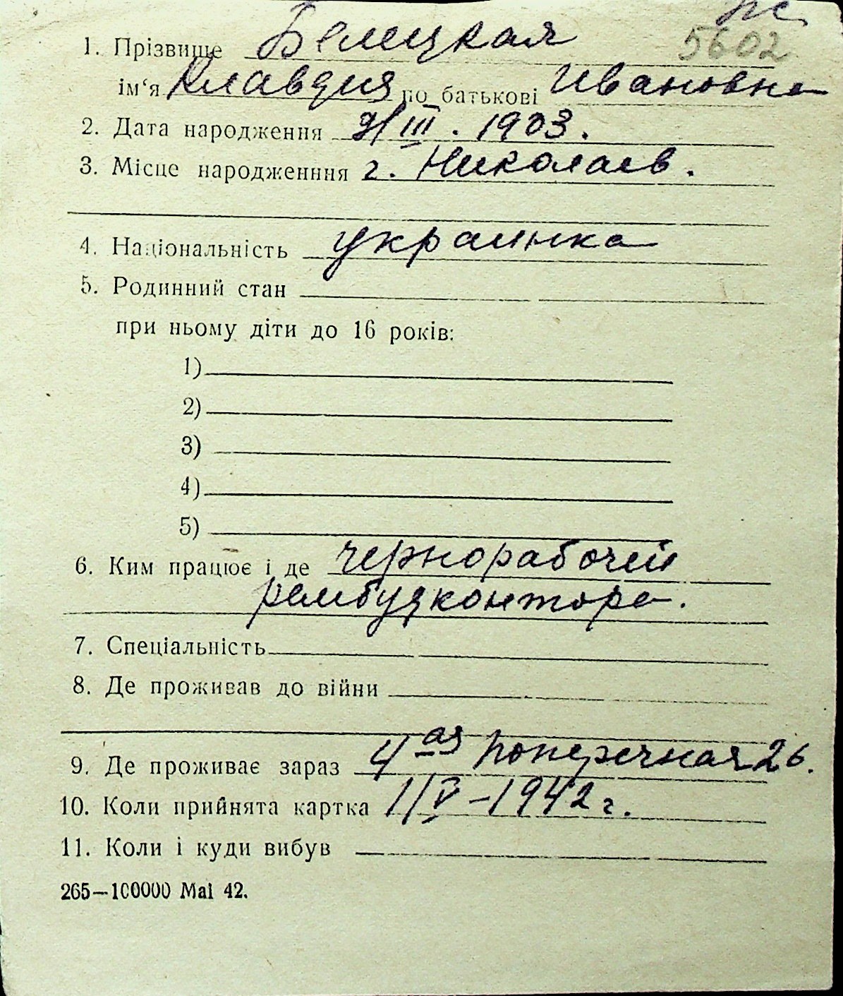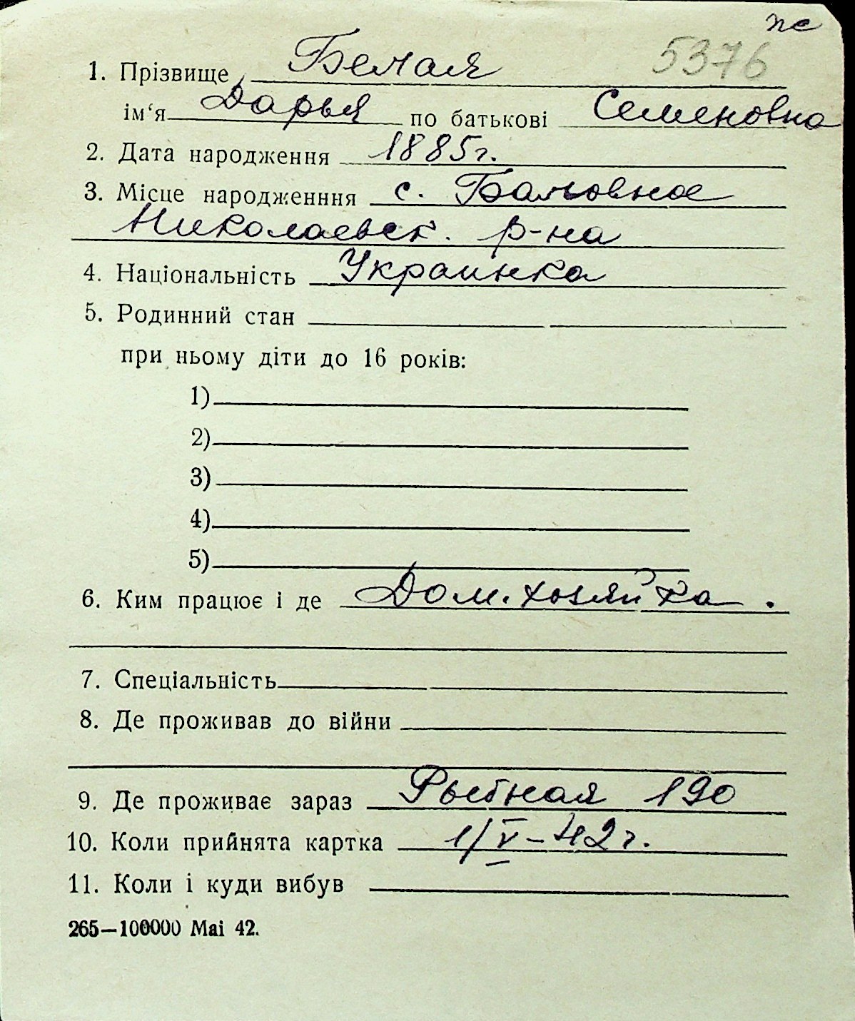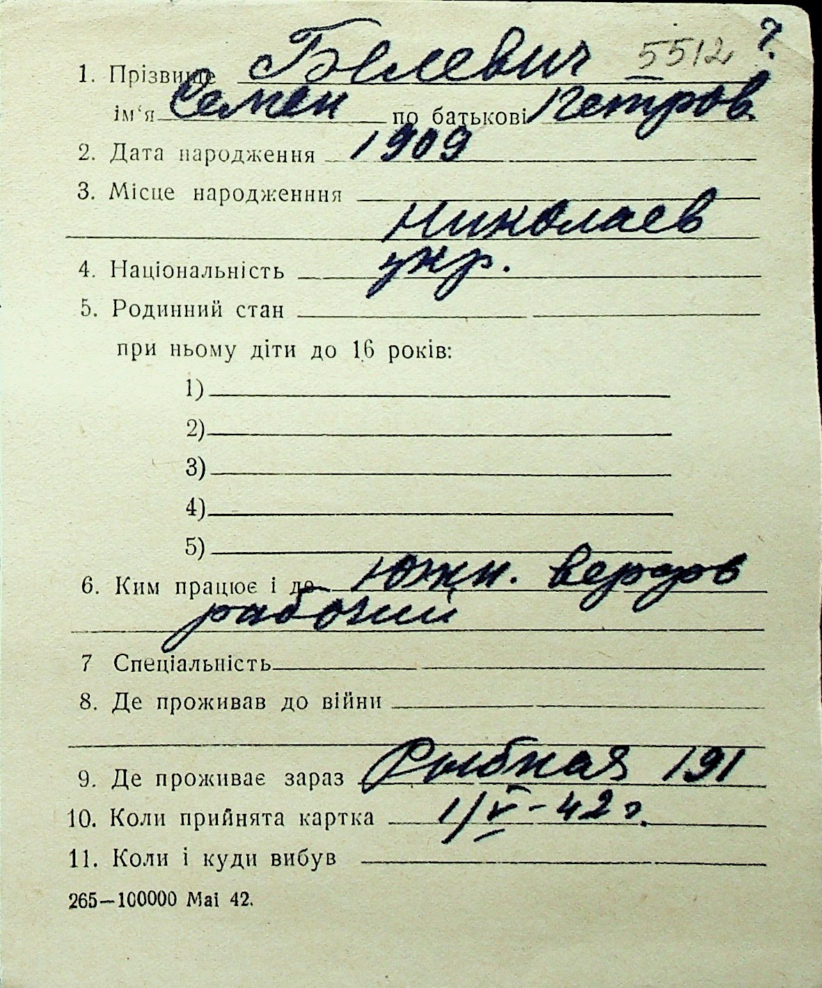 ◦ ◦ Перелік карток на осіб, які мешкали у м. Миколаїв у період окупації 1941–1944 років