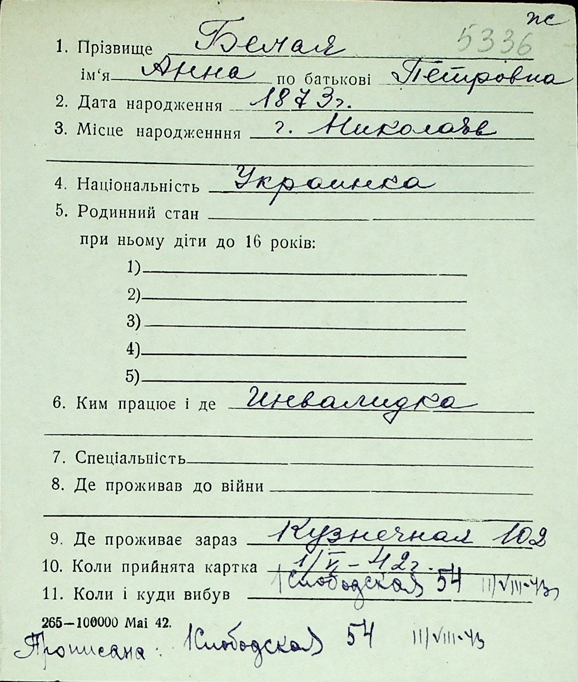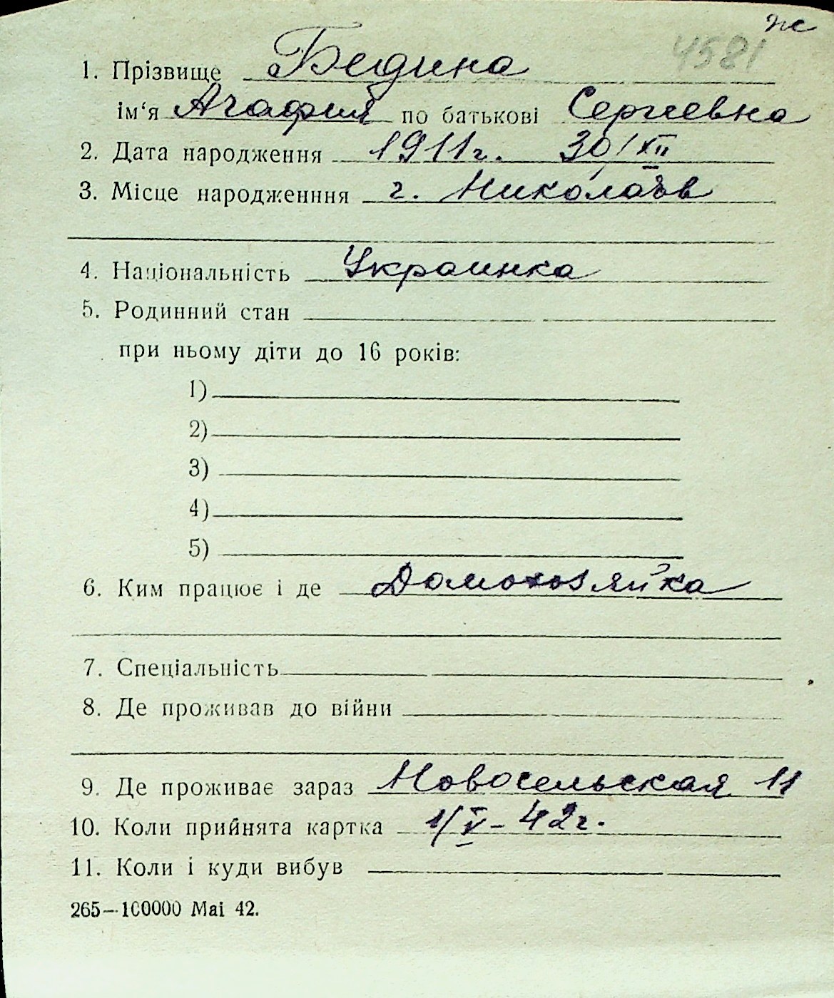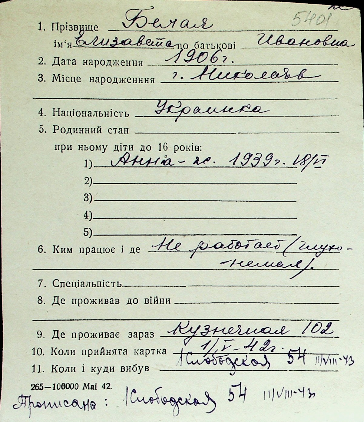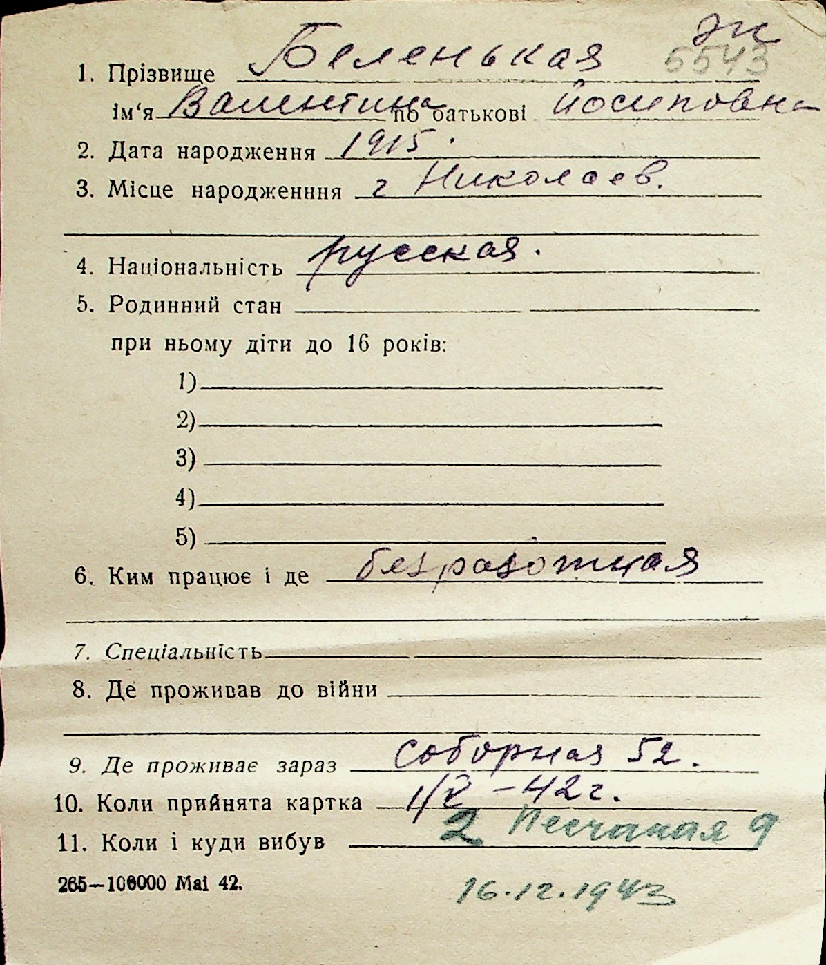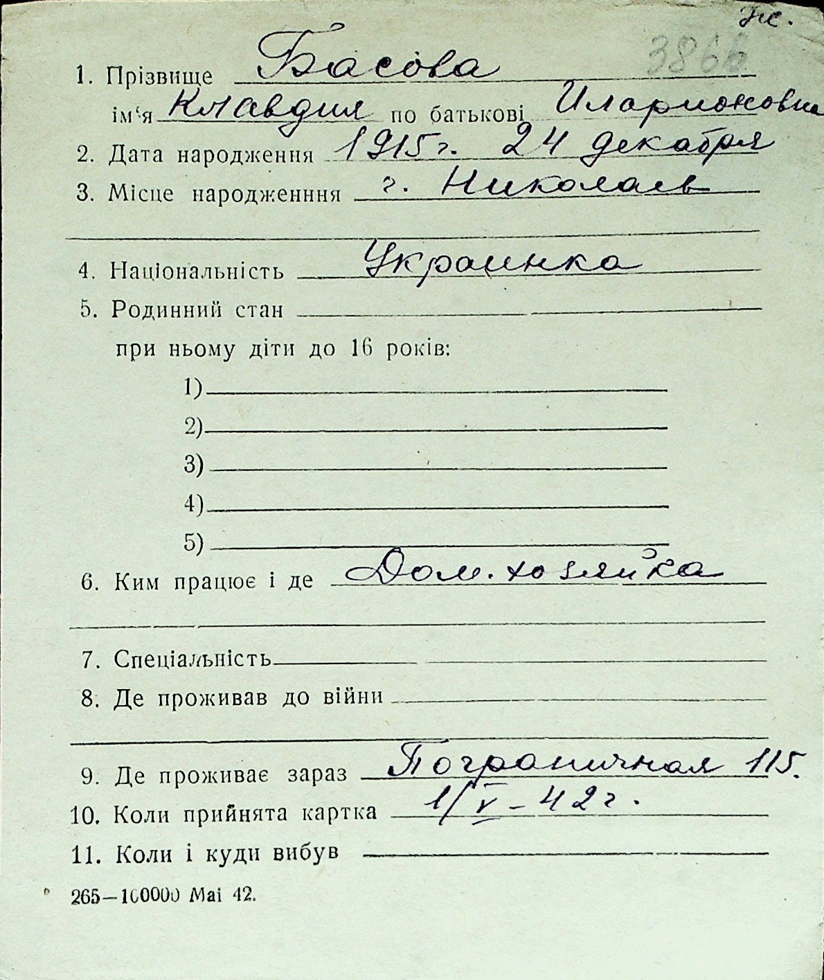 ◦ ◦ Перелік карток на осіб, які мешкали у м. Миколаїв у період окупації 1941–1944 років