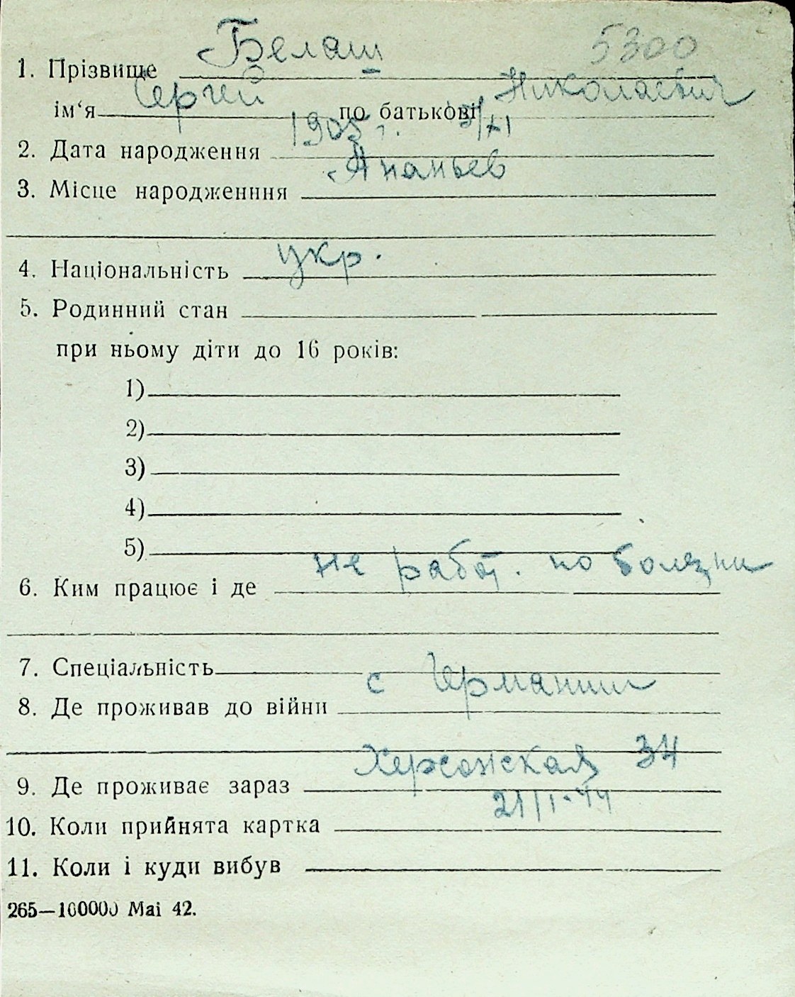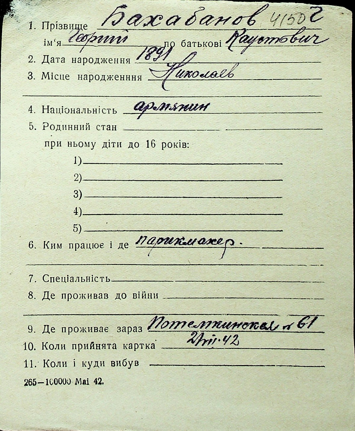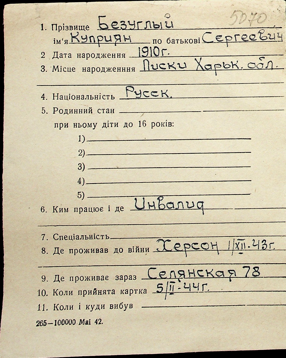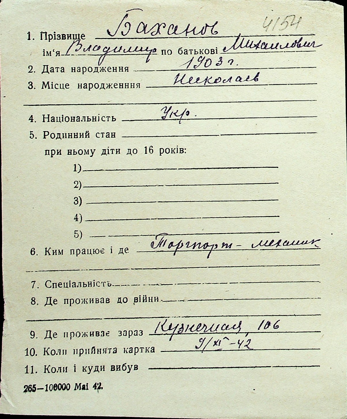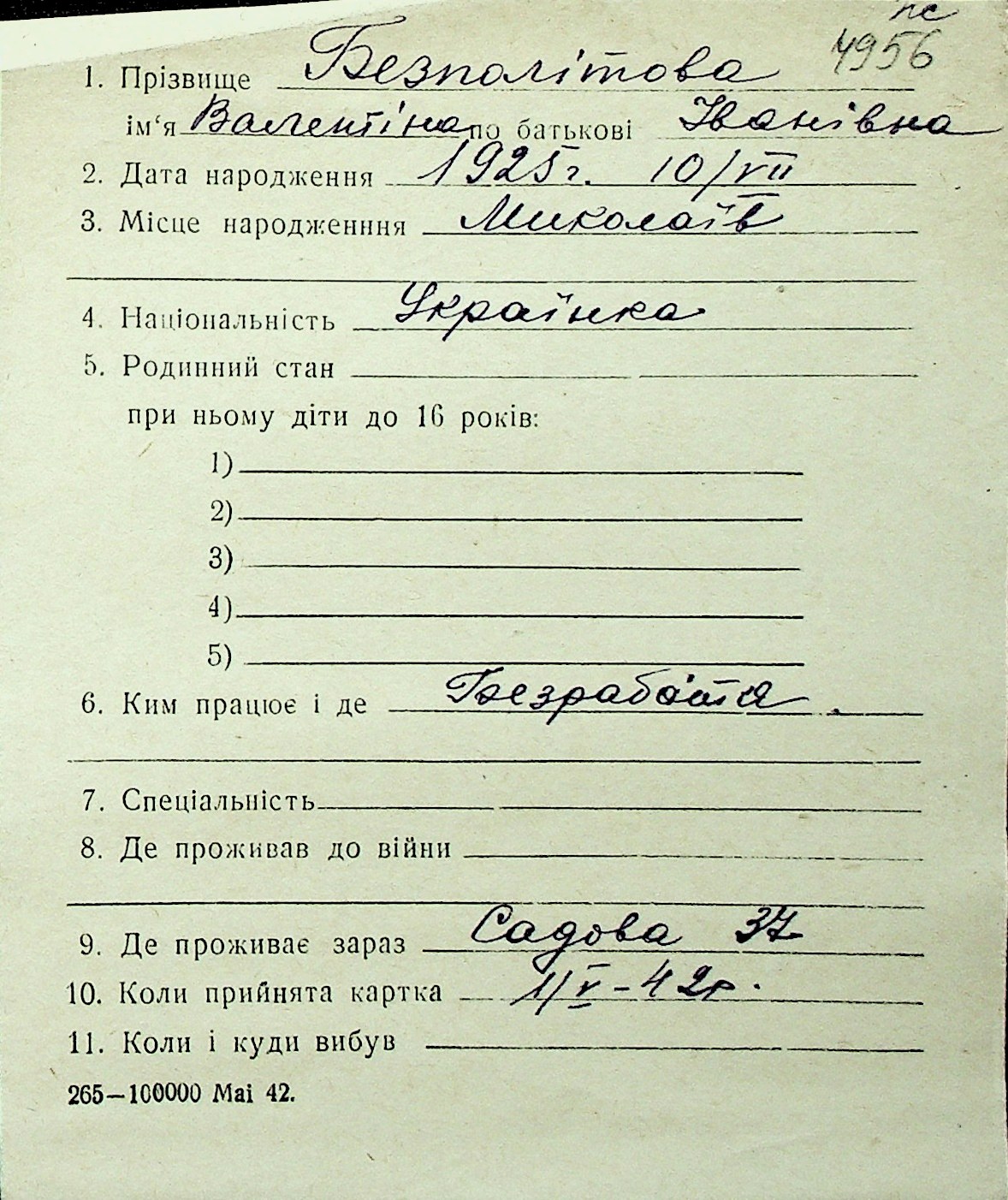 ◦ ◦ Перелік карток на осіб, які мешкали у м. Миколаїв у період окупації 1941–1944 років