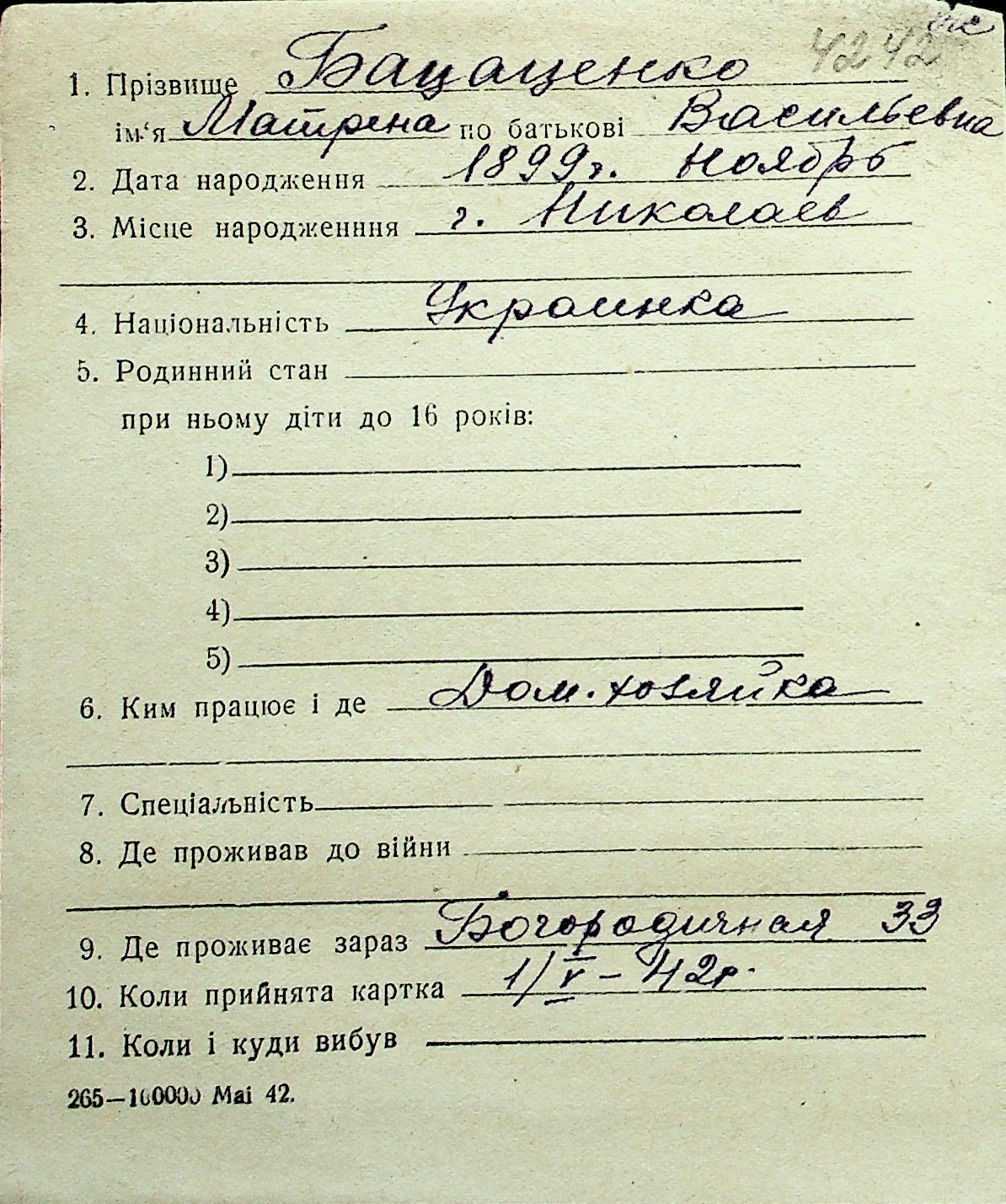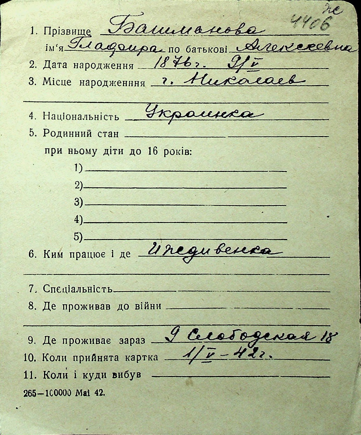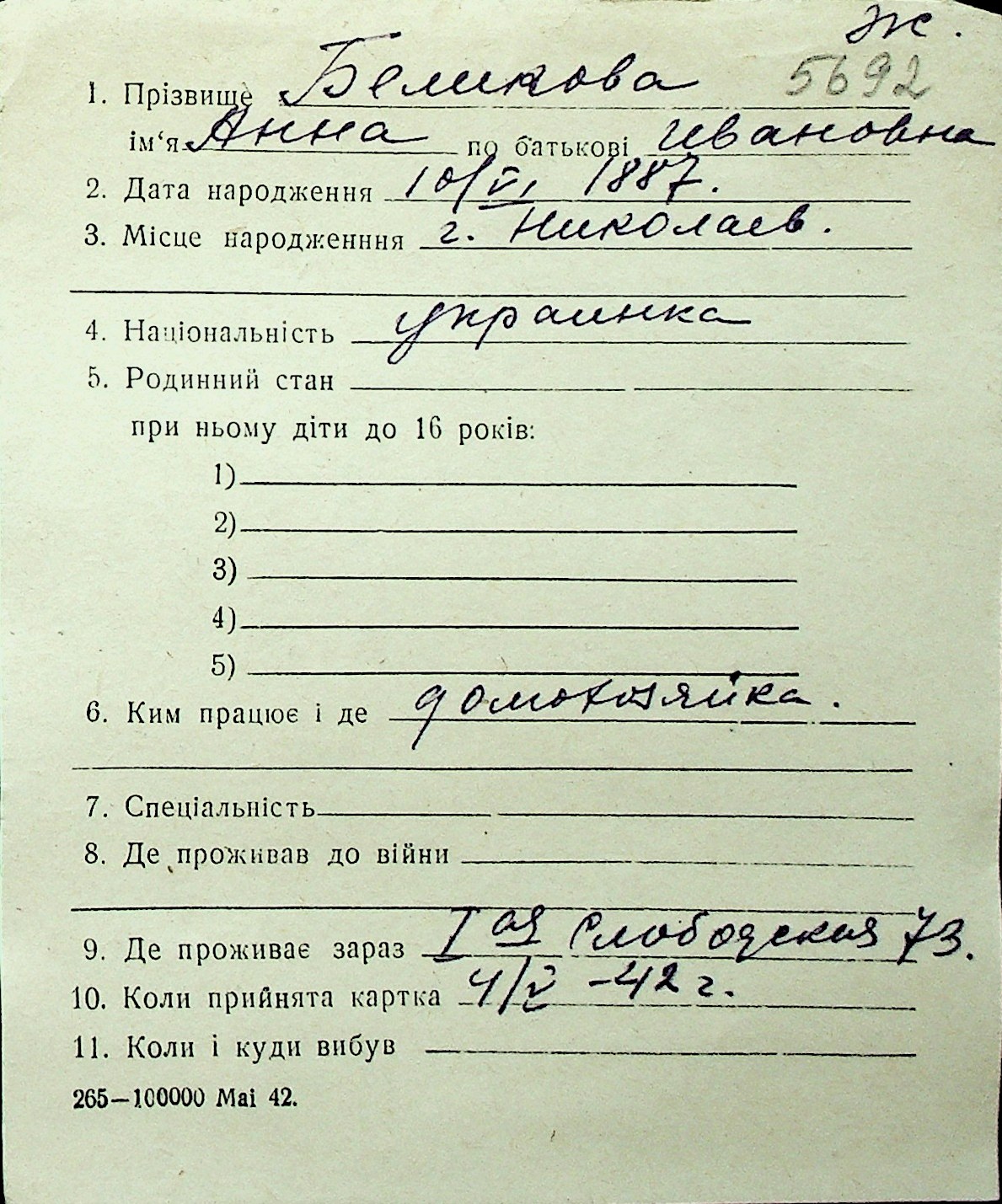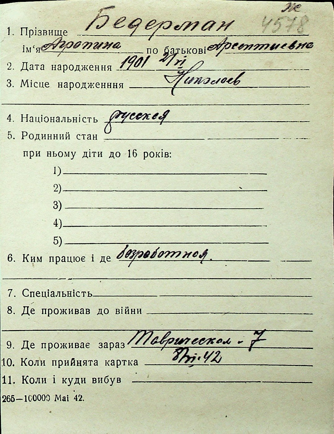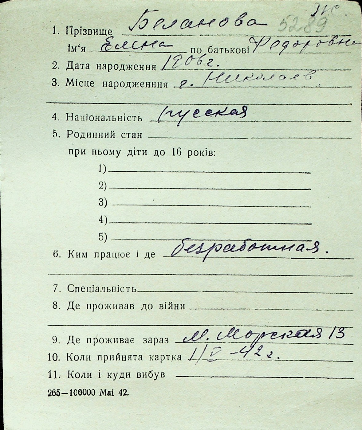 ◦ ◦ Перелік карток на осіб, які мешкали у м. Миколаїв у період окупації 1941–1944 років
