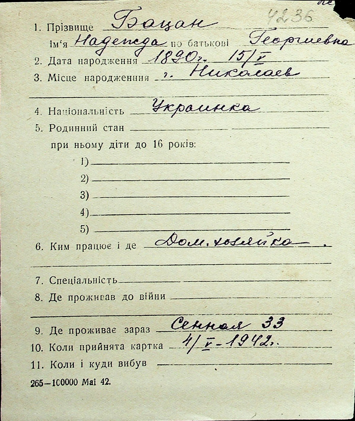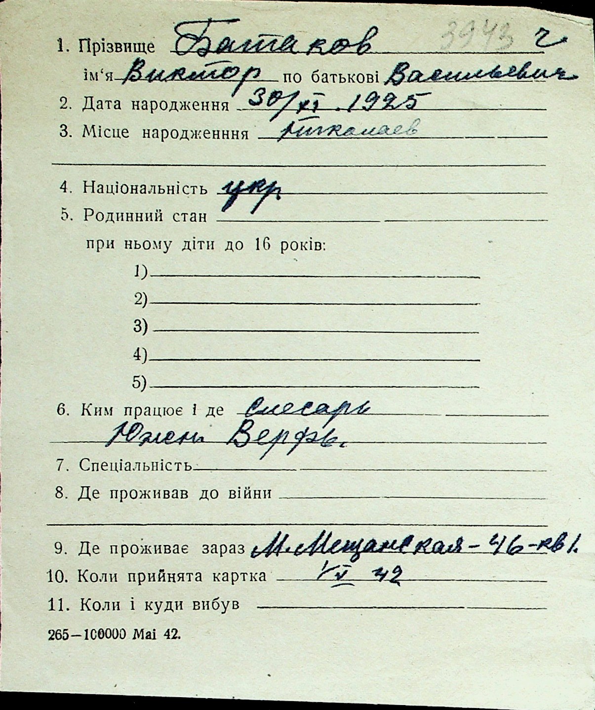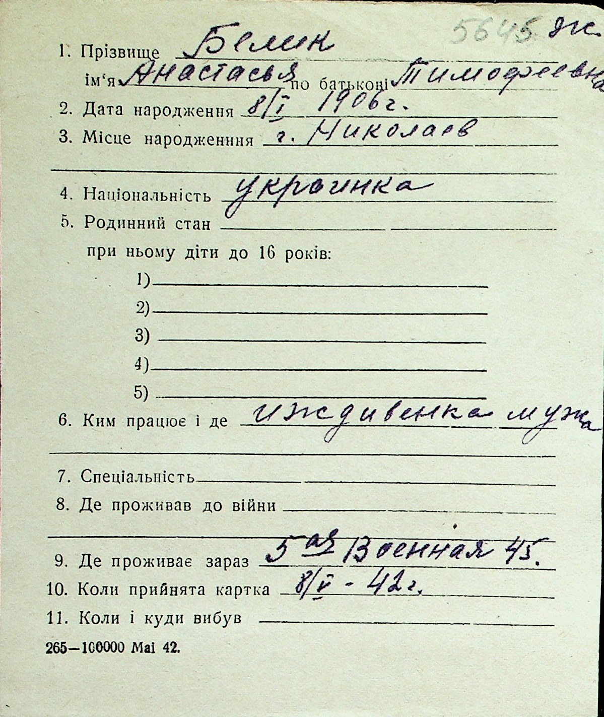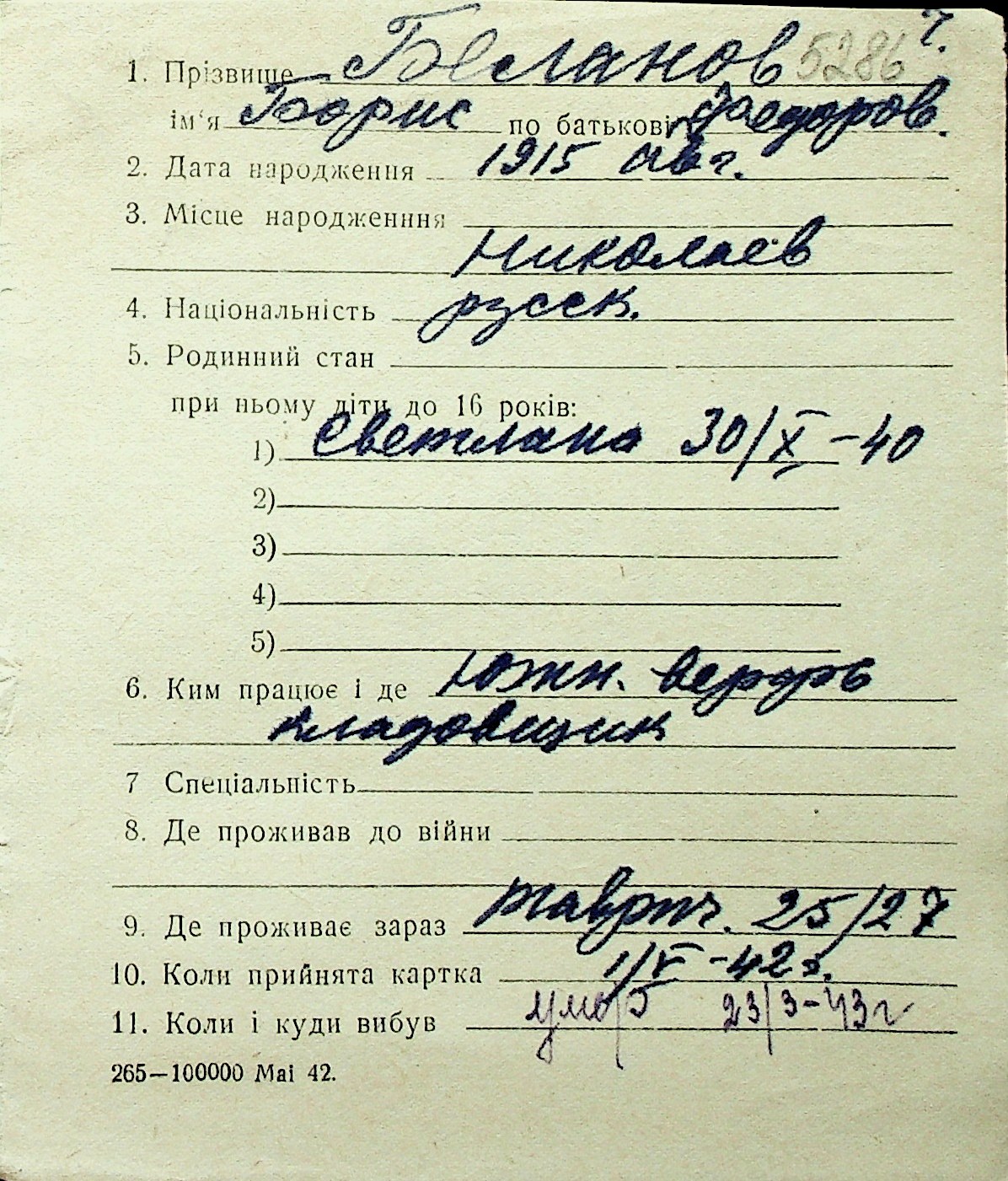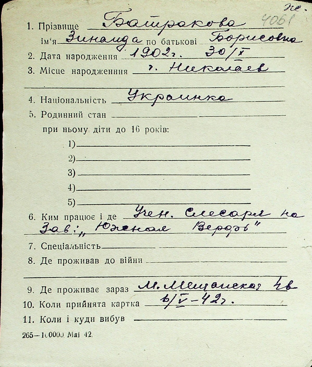 ◦ ◦ Перелік карток на осіб, які мешкали у м. Миколаїв у період окупації 1941–1944 років