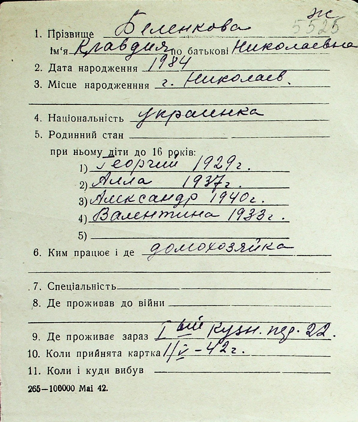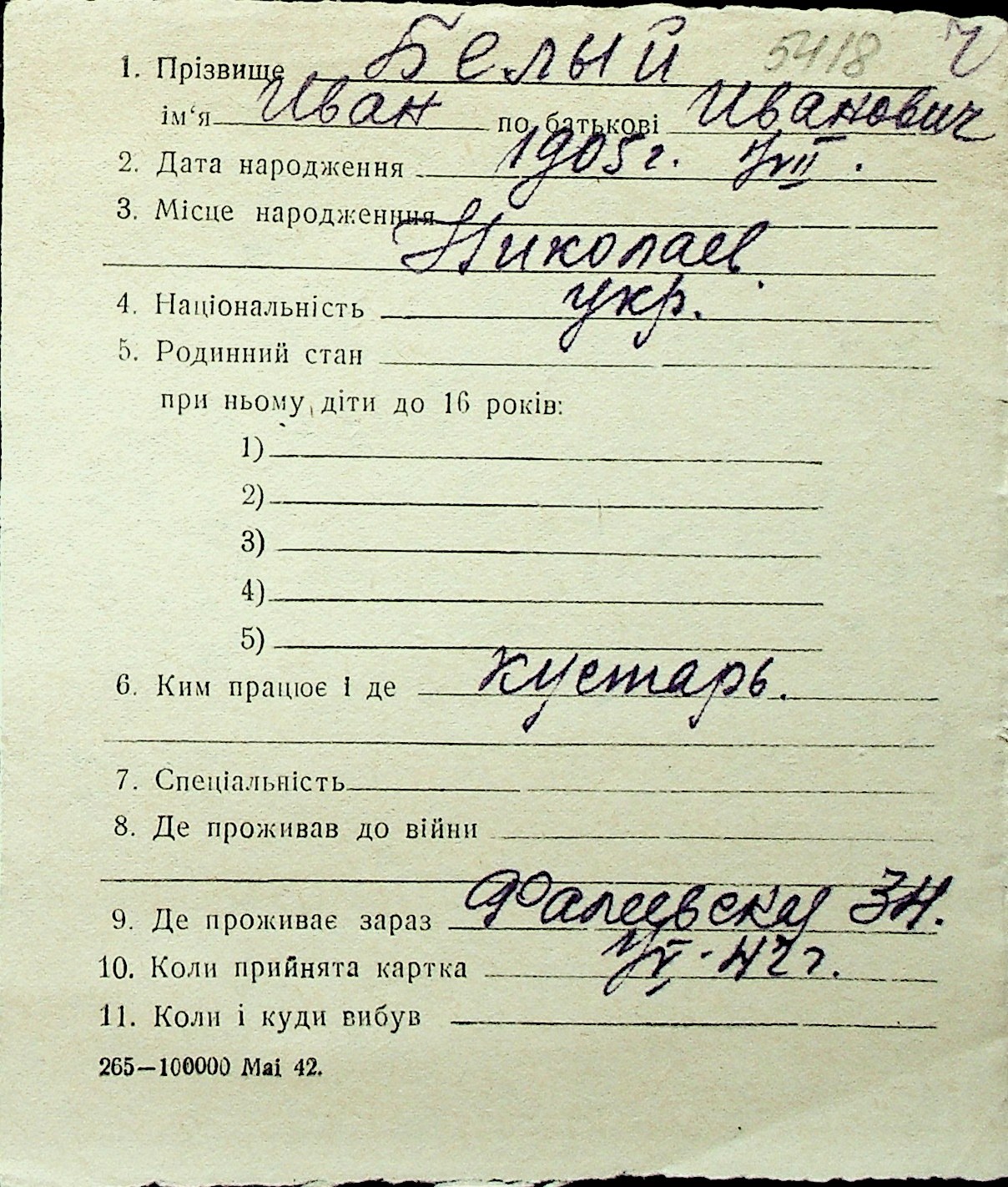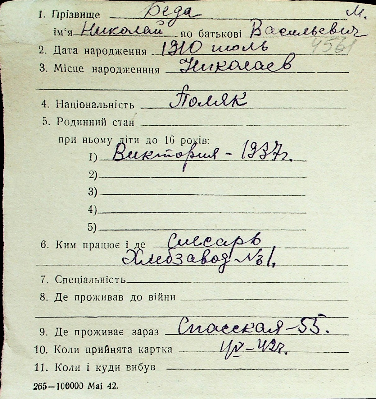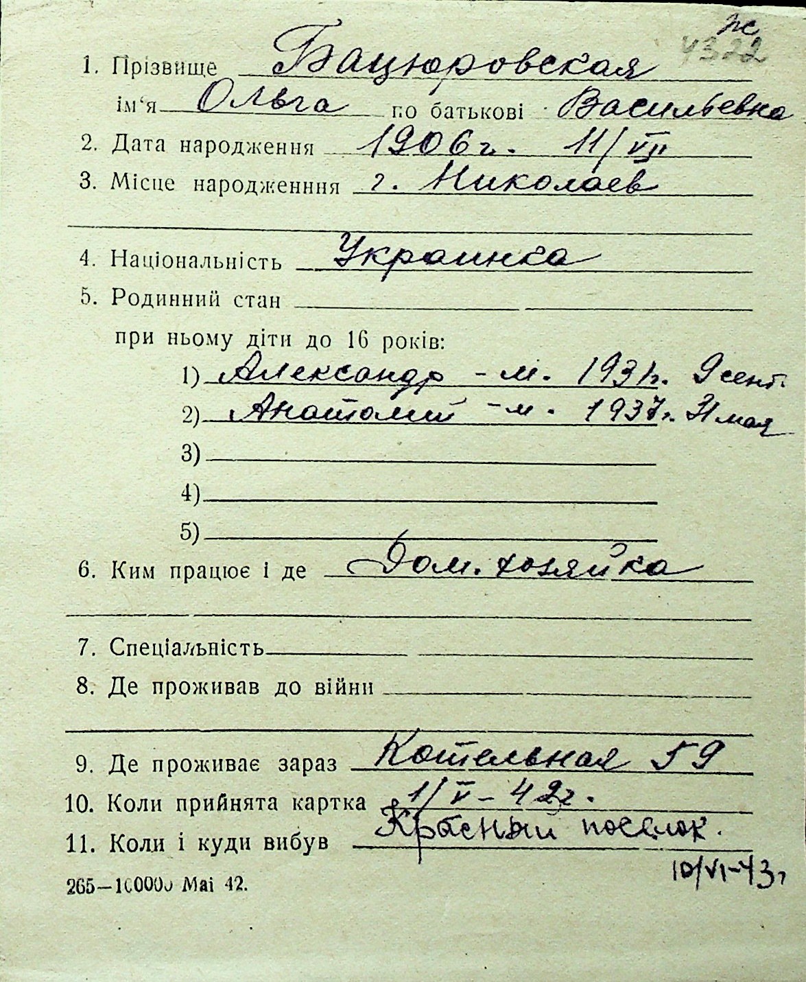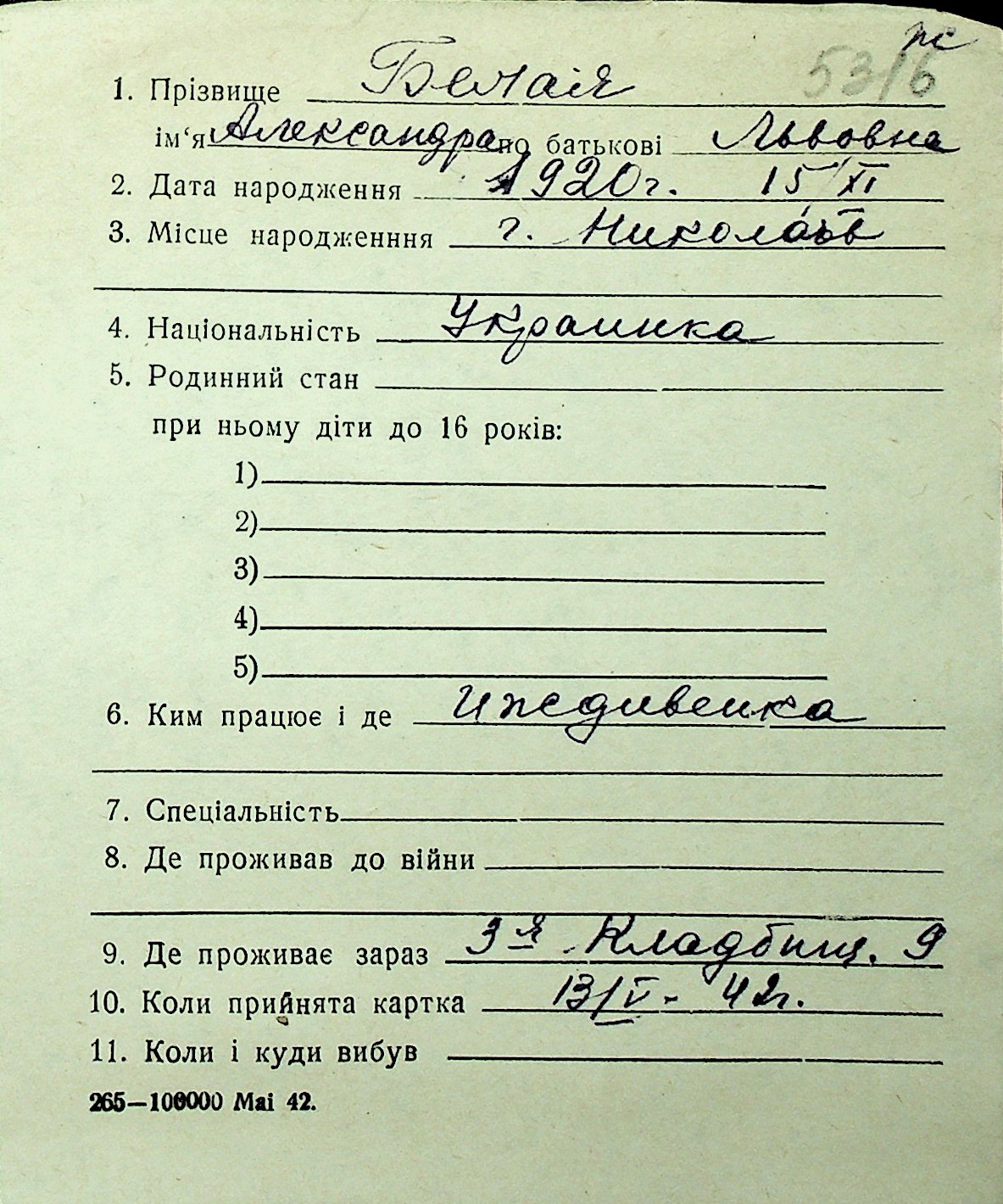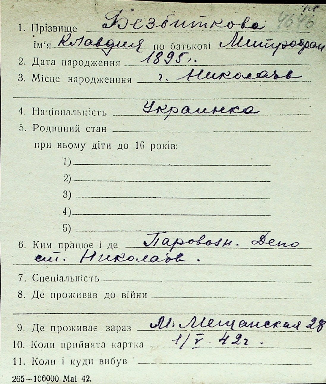 ◦ ◦ Перелік карток на осіб, які мешкали у м. Миколаїв у період окупації 1941–1944 років