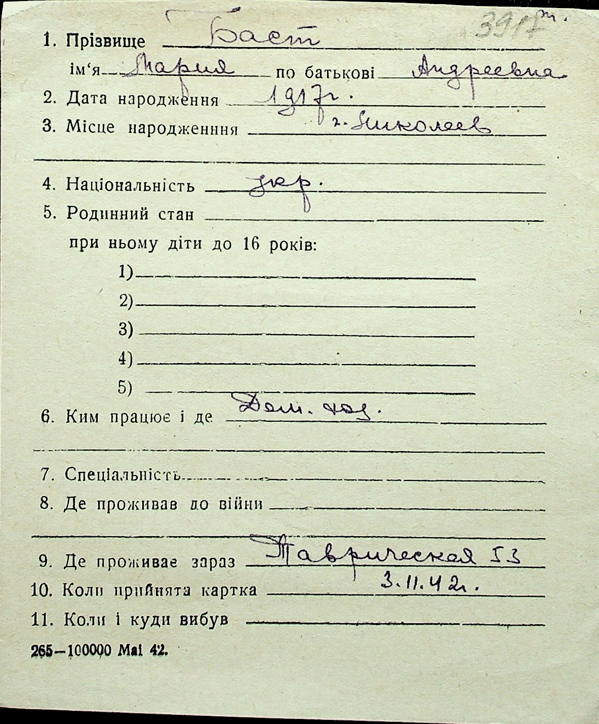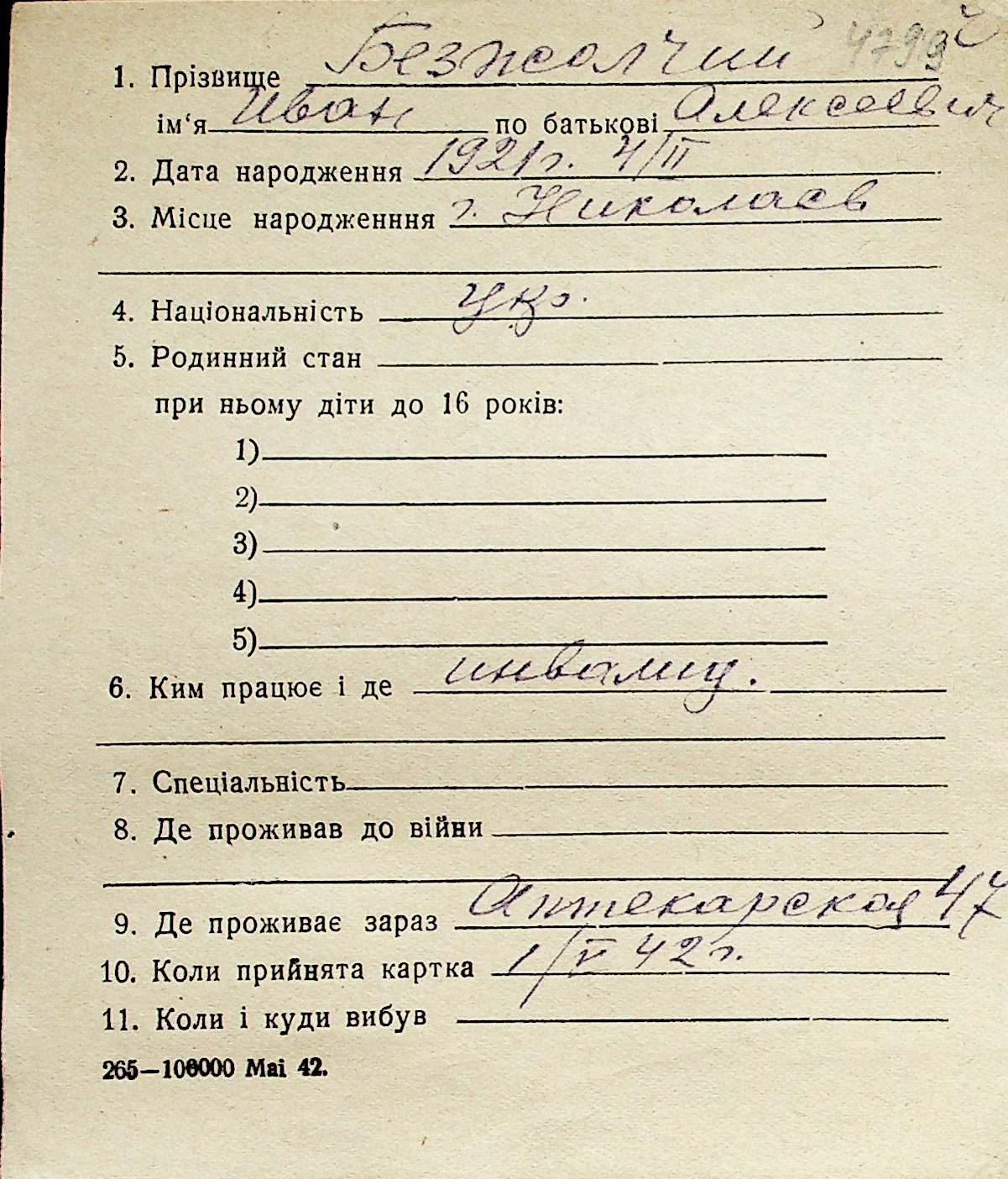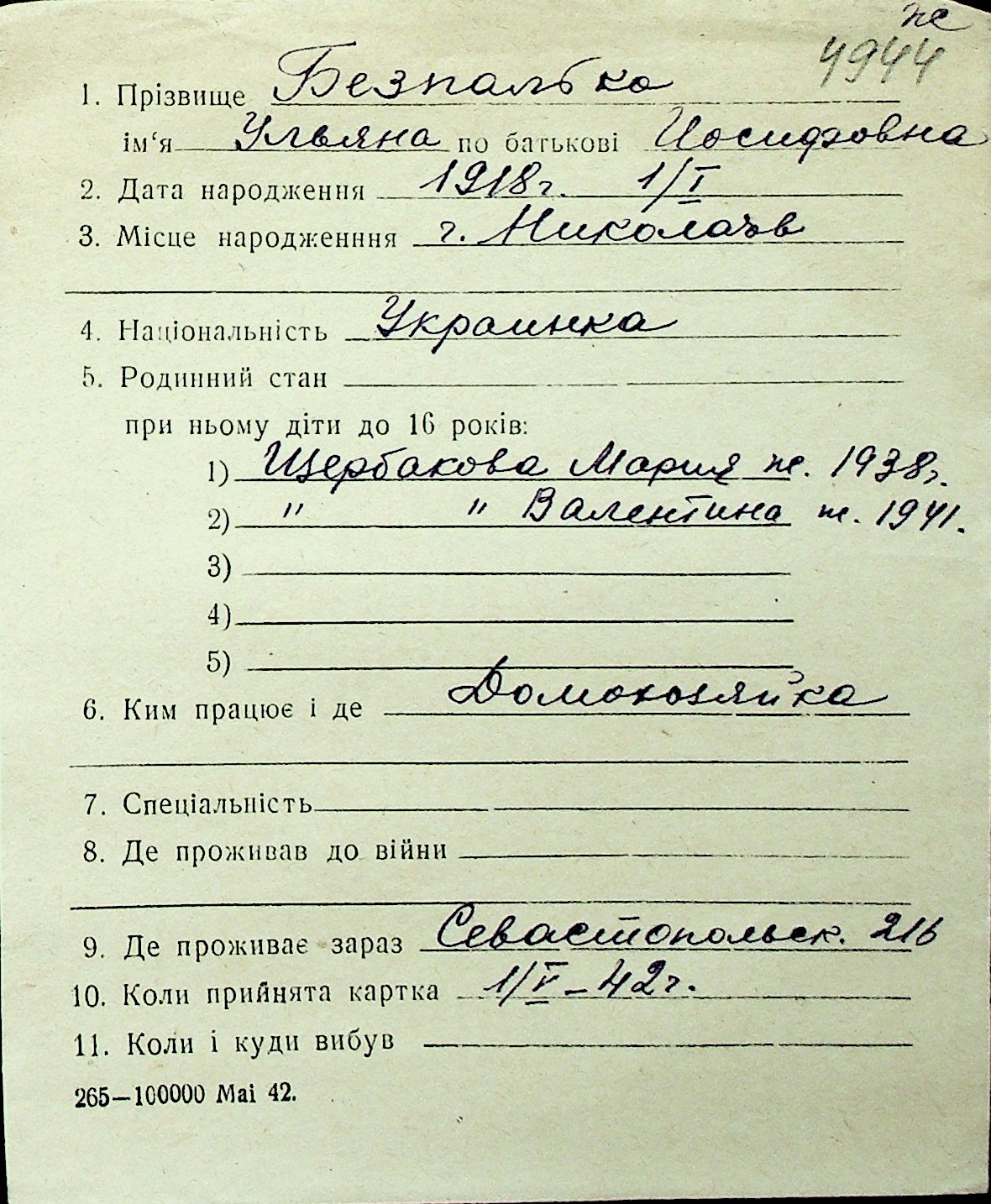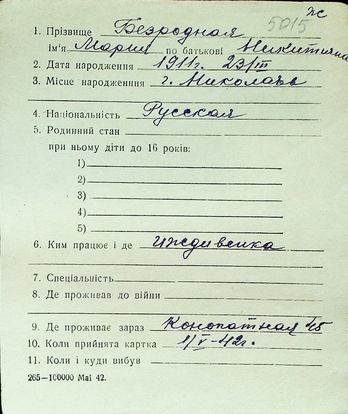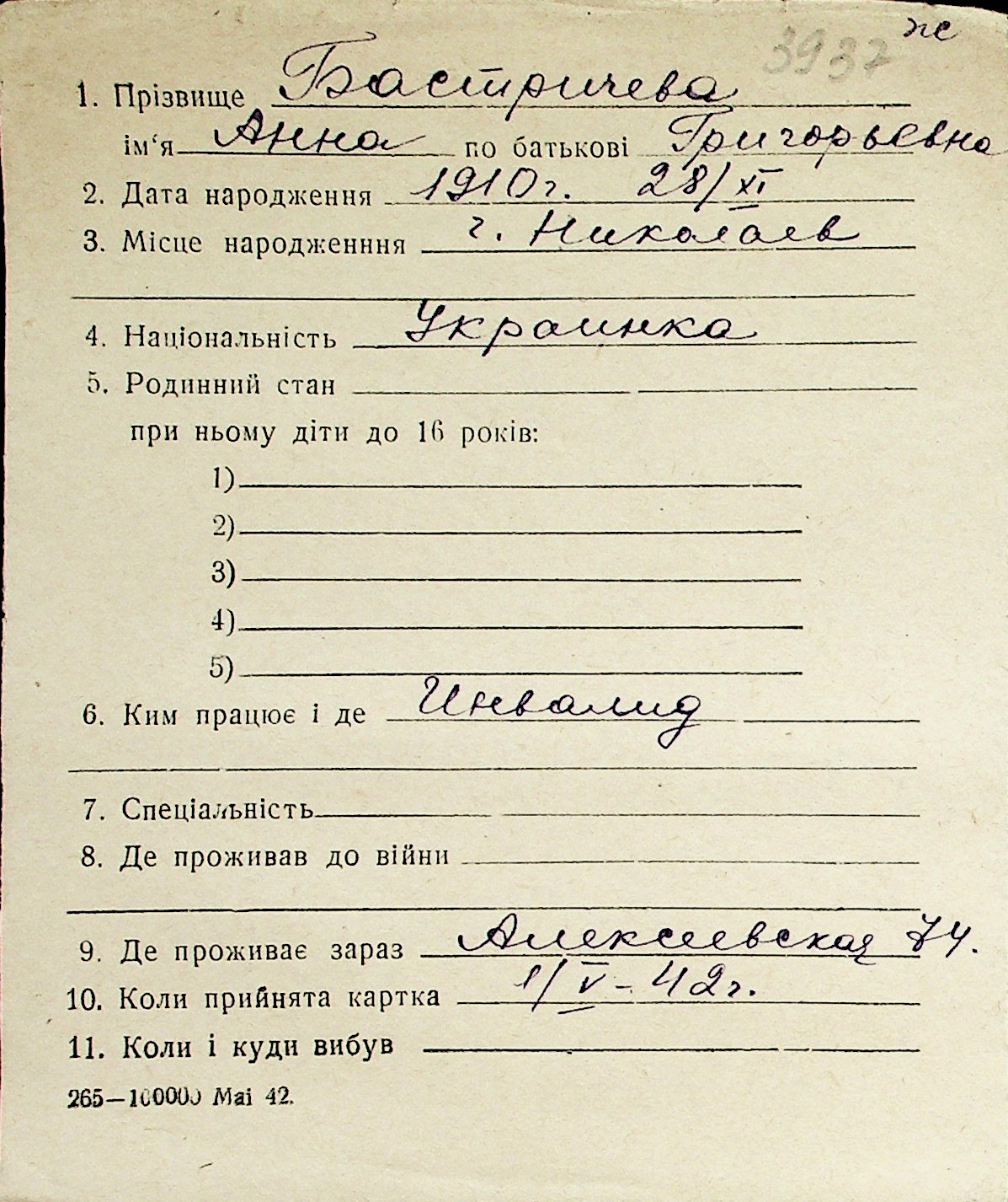 ◦ ◦ Перелік карток на осіб, які мешкали у м. Миколаїв у період окупації 1941–1944 років